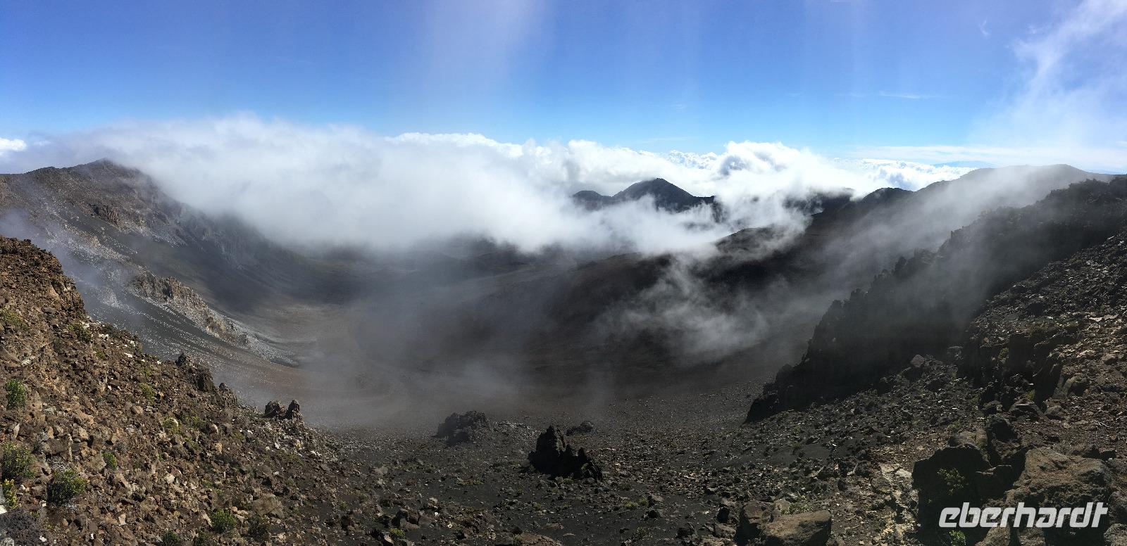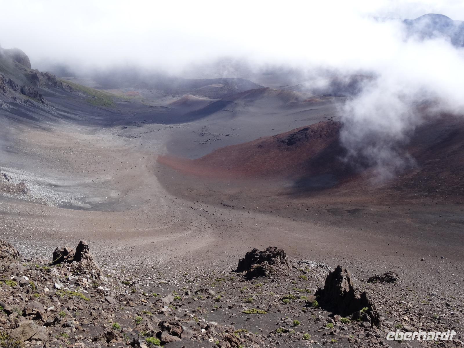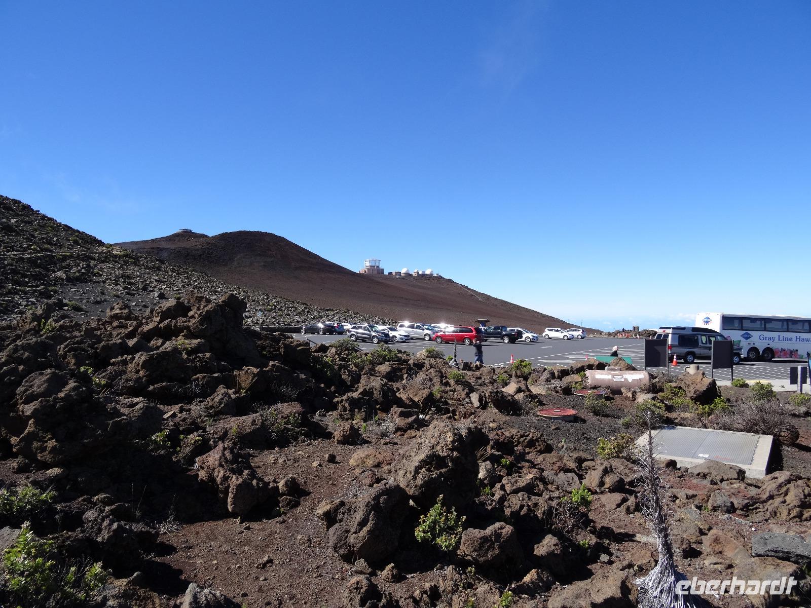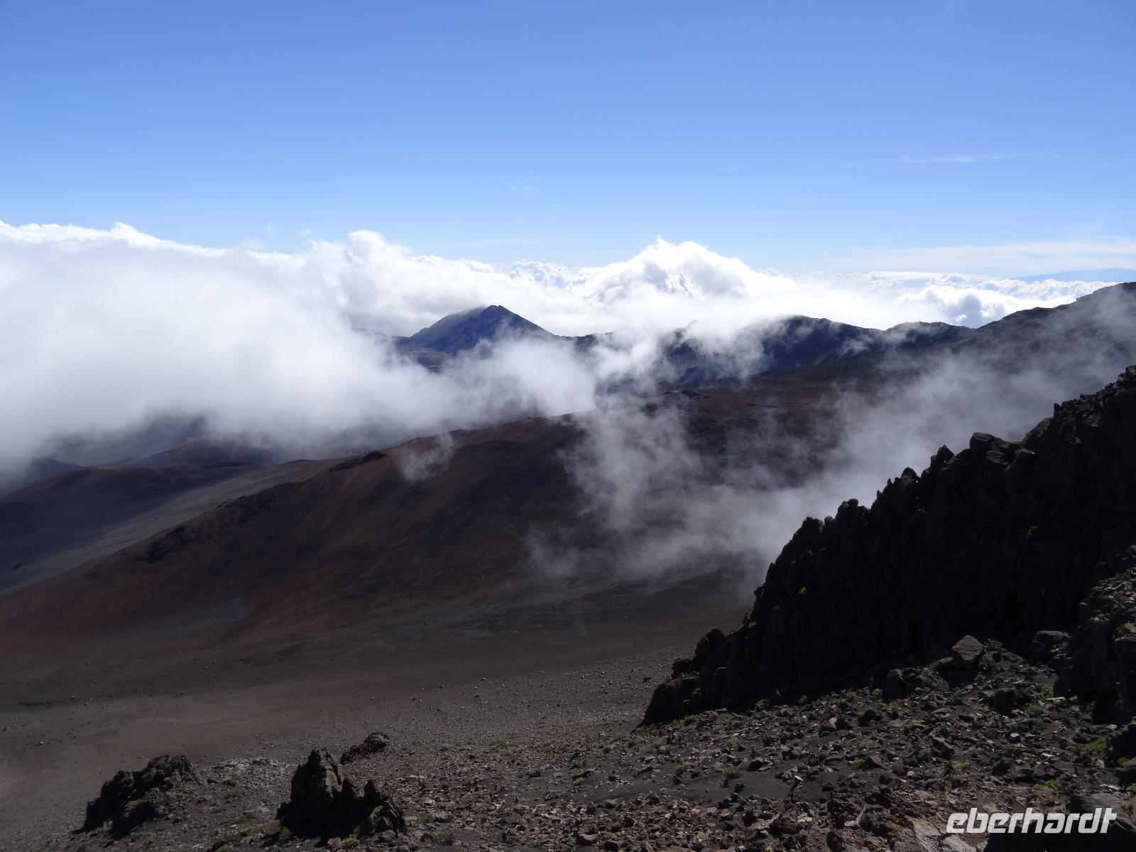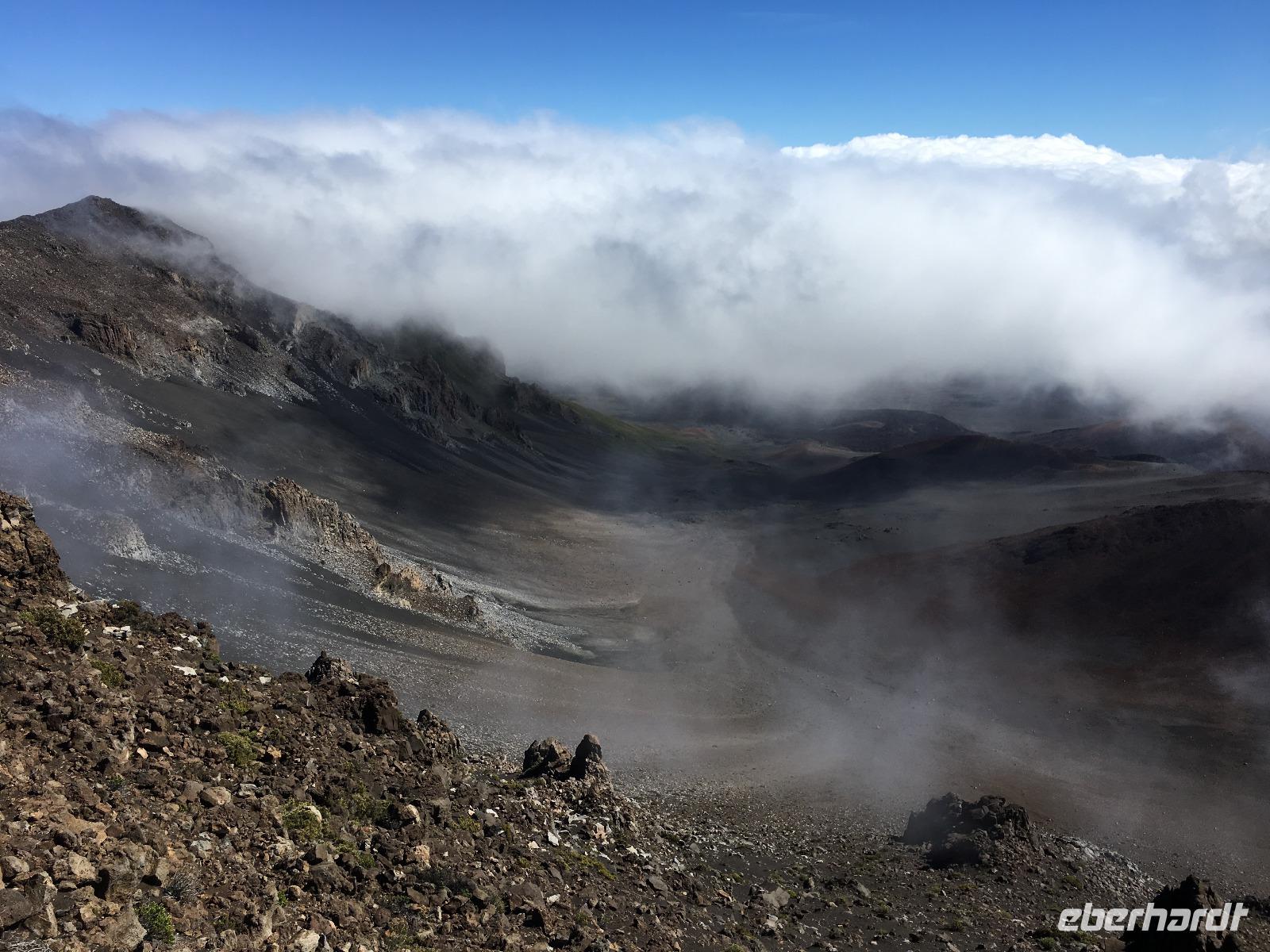 Seitdem wir auf Maui waren, schien uns der Regen zu verfolgen. Als wir an diesem Morgen unsere Augen aufschlugen und aus dem Fenster schauten, war ringsumher alles nass. Was generell nichts Schlechtes bedeuten muss, da das Wetter hier auch relativ schnell umschlägt. Aber von ewiger Sonneninsel kann auch keine Rede sein. So bestiegen wir nach dem Frühstück unseren Bus und starteten zu einer Fahrt, die uns auf knapp dreitausend Meter Höhe bringen sollte. Kleidungstechnisch waren wir sowohl für kalte Temperaturen als auch für Regen gerüstet. Wir fuhren an Lahaina vorbei die schöne Küstenstraße in Richtung Kahului entlang, passierten dabei die engste Stelle der Insel, die in der Nord-Südausdehnung nur knapp 15 Kilometer breit ist und der Insel ihren Beinamen Talinsel gegeben hat. Betrachtet man diese Stelle nämlich von den beiden Bergen Haleakala und Mauna Kahalawai aus, blickt man (zwangsläufig) in ein sich so ergebendes Tal. Wir bogen vor Kahului auf die Straße zum Nationalpark Haleakala ab und konnten zu unserer Freude feststellen, dass sich das Wetter im Trockenmodus befand. Wenn wir jetzt noch gute Sicht am Krater hätten... Doch soweit war es noch nicht. Vorher galt es, die serpentinenreiche Straße bergaufwärts zu meistern. Unterwegs sahen wir ein paar wenige Proteen und die seltene, nur hier wachsende Pflanze Ahinahina, das Silberschwert. Nach dem Erreichen des Haleakala-Besucherzentrums stiegen wir aus und - fröstelten. Es schien zwar glücklicherweise die Sonne, dafür blies der kalte Wind umso heftiger. Nichtsdestotrotz genossen wir hier in dreitausend Meter Höhe einen tollen Ausblick auf den riesigen Krater, der sich uns zu Füßen in verschiedenen Farben darbot. Stetige Wolkenbewegungen sorgten für immer andere Sichtfelder und am Ende unseres Aufenthalts zog urplötzlich so viel Nebel auf, dass der Krater und das nahegelegene Observatorium quasi im Nichts verschwanden. Vorher war uns aber noch der Blick auf die Nachbarinsel Big Island vergönnt, wo wir die beiden beherrschenden Vulkane Mauna Kea und Mauna Loa gut sehen konnten. Wir verließen den Haleakala-Gipfel wieder und begaben uns zurück auf Meeresspiegelniveau. Über Hali'imaile und Pa'ia fuhren wir weiter zur Maui Tropical Plantation bei Waikapua. Diese wunderschöne tropische Anlage bot einen guten Überblick über die Flora Hawaiis. Teile von alten Industrieanlagen waren dabei architektonisch eindrucksvoll in die Landschaft integriert worden und gingen mit den sie umgebenden Pflanzen eine wunderbare Symbiose ein. Bei einer kleinen Plantagenrundfahrt mit einer Elektrobahn sahen wir viele der hier wachsenden Pflanzen und Früchte aus der Nähe und konnten einer Schauvorführung beiwohnen, die das fachmännische Öffnen einer Kokosnuss zeigte. Zu guter Letzt führte uns unsere Tour nach Lahaina, in die ehemalige Inselhauptstadt unter Kamehameha I. und spätere Walfängerhochburg im Pazifik. Davon zeugen heute nur noch wenige Memorabilien, hat sich das Städtchen doch mittlerweile dem Tourismus an den Hals geworfen und dementsprechend viele Restaurants, Shops, Museen und vor allem Galerien entstehen lassen, die um die Gunst der Besucher buhlen. Einige wenige Häuser aus der Zeit des Walfangs waren noch zu besichtigen. Ein botanisches Highlight war sicher der mehr als 140 Jahre alte indische Banyasbaum, der mit einer Kronenfläche von knapp einem Hektar der drittgrößte Baum seiner Art weltweit ist. Wir verließen Lahaina, was auf Deutsch "Gnadenlose Sonne" bedeutet und während unseres Aufenthaltes spürbar war, am späten Nachmittag und kehrten in unser Hotel am Ka'anapali Beach zurück. Bevor wir uns jedoch mit dem Packen der Koffer beschäftigen wollten, nutzten einige die verbleibende Zeit noch zum Baden, Schnorcheln oder um einfach noch ein paar Andenken shoppen zu gehen.