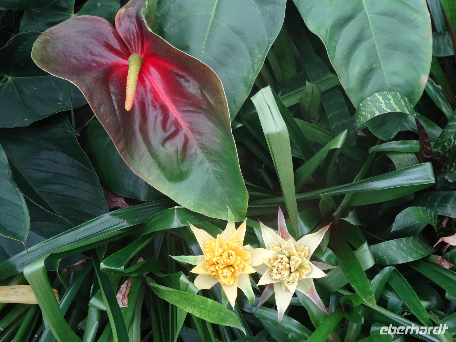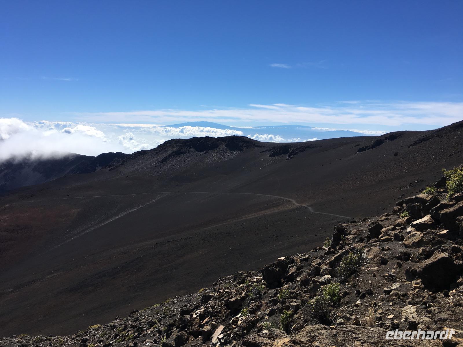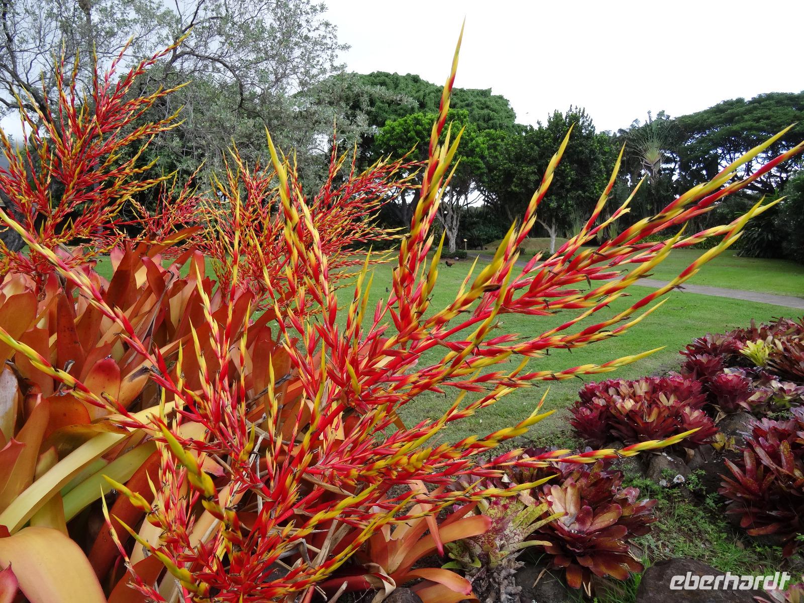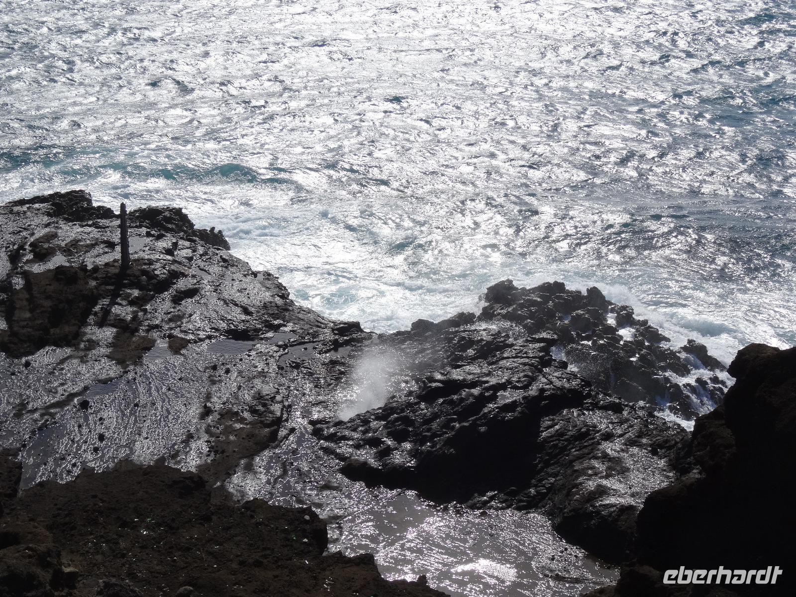 Seitdem wir auf Maui waren, schien uns der Regen zu verfolgen. Als wir an diesem Morgen unsere Augen aufschlugen und aus dem Fenster schauten, war ringsumher alles nass. Was generell nichts Schlechtes bedeuten muss, da das Wetter hier auch relativ schnell umschlägt. Aber von ewiger Sonneninsel kann auch keine Rede sein. So bestiegen wir nach dem Frühstück unseren Bus und starteten zu einer Fahrt, die uns auf knapp dreitausend Meter Höhe bringen sollte. Kleidungstechnisch waren wir sowohl für kalte Temperaturen als auch für Regen gerüstet. Wir fuhren an Lahaina vorbei die schöne Küstenstraße in Richtung Kahului entlang, passierten dabei die engste Stelle der Insel, die in der Nord-Südausdehnung nur knapp 15 Kilometer breit ist und der Insel ihren Beinamen Talinsel gegeben hat. Betrachtet man diese Stelle nämlich von den beiden Bergen Haleakala und Mauna Kahalawai aus, blickt man (zwangsläufig) in ein sich so ergebendes Tal. Wir bogen vor Kahului auf die Straße zum Nationalpark Haleakala ab und konnten zu unserer Freude feststellen, dass sich das Wetter im Trockenmodus befand. Wenn wir jetzt noch gute Sicht am Krater hätten... Doch soweit war es noch nicht. Vorher galt es, die serpentinenreiche Straße bergaufwärts zu meistern. Unterwegs sahen wir ein paar wenige Proteen und die seltene, nur hier wachsende Pflanze Ahinahina, das Silberschwert. Nach dem Erreichen des Haleakala-Besucherzentrums stiegen wir aus und - fröstelten. Es schien zwar glücklicherweise die Sonne, dafür blies der kalte Wind umso heftiger. Nichtsdestotrotz genossen wir hier in dreitausend Meter Höhe einen tollen Ausblick auf den riesigen Krater, der sich uns zu Füßen in verschiedenen Farben darbot. Stetige Wolkenbewegungen sorgten für immer andere Sichtfelder und am Ende unseres Aufenthalts zog urplötzlich so viel Nebel auf, dass der Krater und das nahegelegene Observatorium quasi im Nichts verschwanden. Vorher war uns aber noch der Blick auf die Nachbarinsel Big Island vergönnt, wo wir die beiden beherrschenden Vulkane Mauna Kea und Mauna Loa gut sehen konnten. Wir verließen den Haleakala-Gipfel wieder und begaben uns zurück auf Meeresspiegelniveau. Über Hali'imaile und Pa'ia fuhren wir weiter zur Maui Tropical Plantation bei Waikapua. Diese wunderschöne tropische Anlage bot einen guten Überblick über die Flora Hawaiis. Teile von alten Industrieanlagen waren dabei architektonisch eindrucksvoll in die Landschaft integriert worden und gingen mit den sie umgebenden Pflanzen eine wunderbare Symbiose ein. Bei einer kleinen Plantagenrundfahrt mit einer Elektrobahn sahen wir viele der hier wachsenden Pflanzen und Früchte aus der Nähe und konnten einer Schauvorführung beiwohnen, die das fachmännische Öffnen einer Kokosnuss zeigte. Zu guter Letzt führte uns unsere Tour nach Lahaina, in die ehemalige Inselhauptstadt unter Kamehameha I. und spätere Walfängerhochburg im Pazifik. Davon zeugen heute nur noch wenige Memorabilien, hat sich das Städtchen doch mittlerweile dem Tourismus an den Hals geworfen und dementsprechend viele Restaurants, Shops, Museen und vor allem Galerien entstehen lassen, die um die Gunst der Besucher buhlen. Einige wenige Häuser aus der Zeit des Walfangs waren noch zu besichtigen. Ein botanisches Highlight war sicher der mehr als 140 Jahre alte indische Banyasbaum, der mit einer Kronenfläche von knapp einem Hektar der drittgrößte Baum seiner Art weltweit ist. Wir verließen Lahaina, was auf Deutsch "Gnadenlose Sonne" bedeutet und während unseres Aufenthaltes spürbar war, am späten Nachmittag und kehrten in unser Hotel am Ka'anapali Beach zurück. Bevor wir uns jedoch mit dem Packen der Koffer beschäftigen wollten, nutzten einige die verbleibende Zeit noch zum Baden, Schnorcheln oder um einfach noch ein paar Andenken shoppen zu gehen.