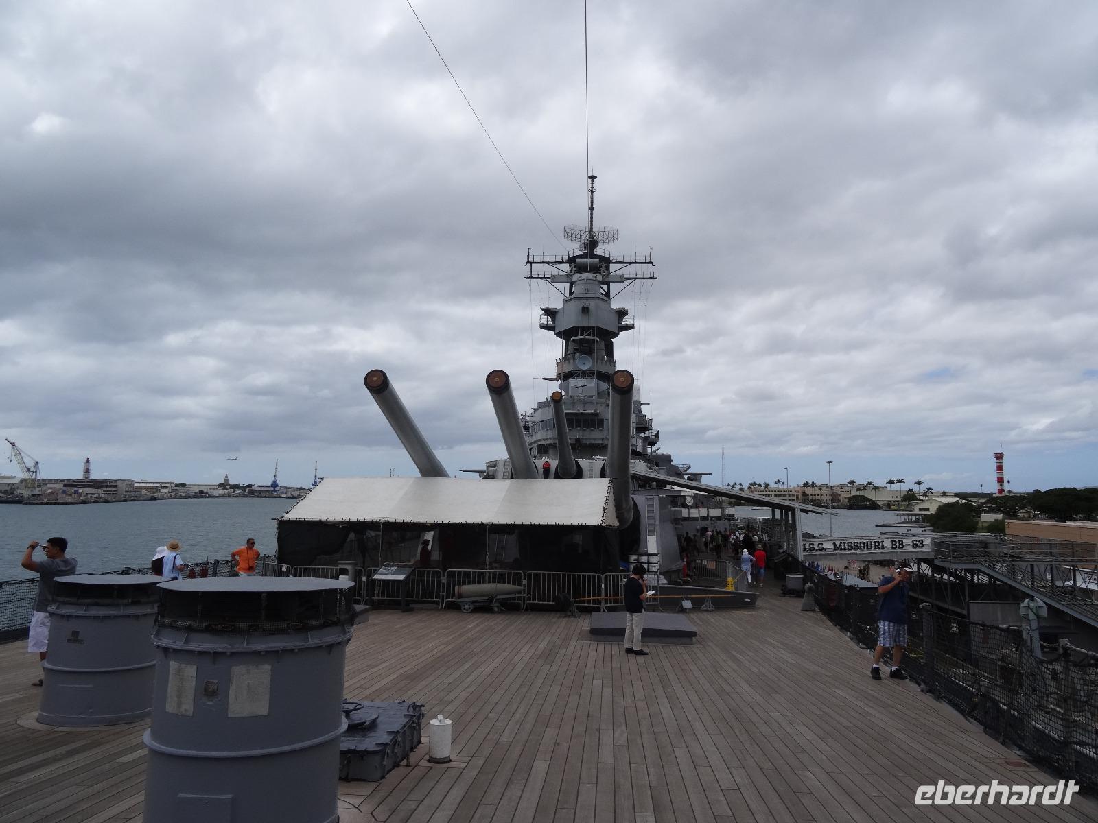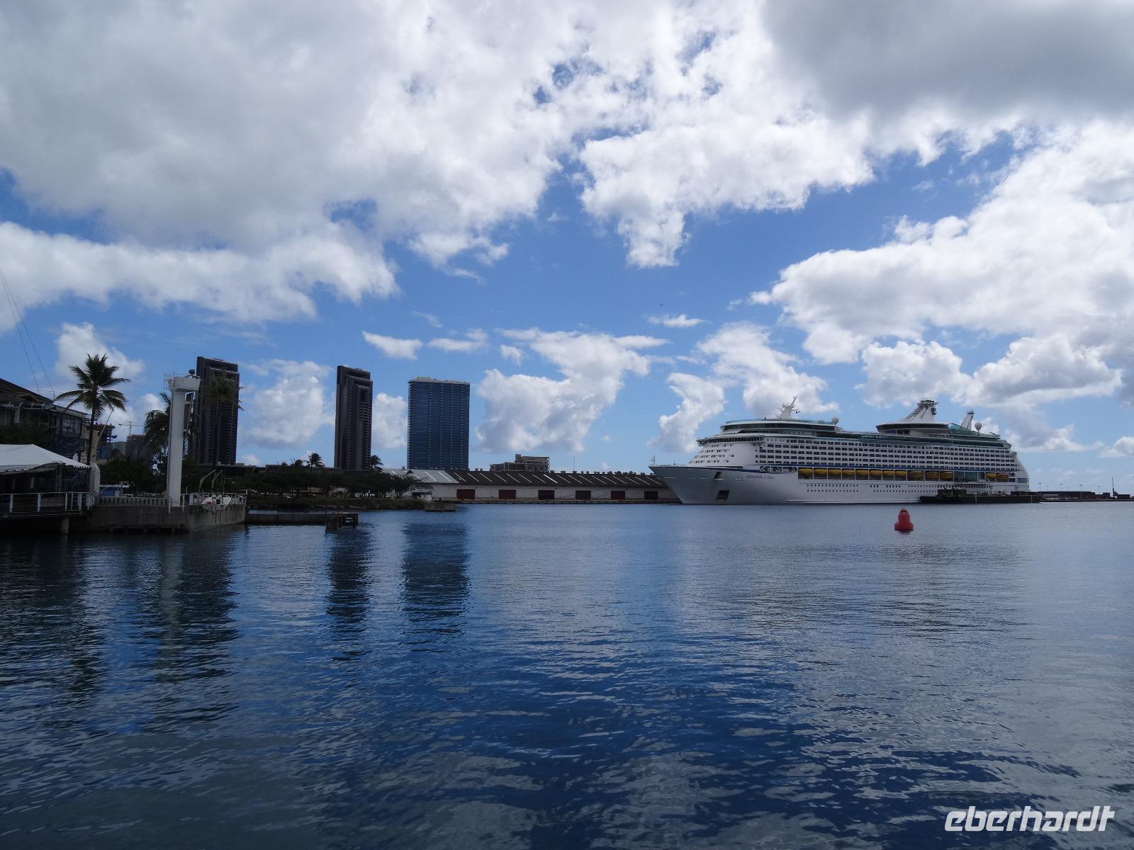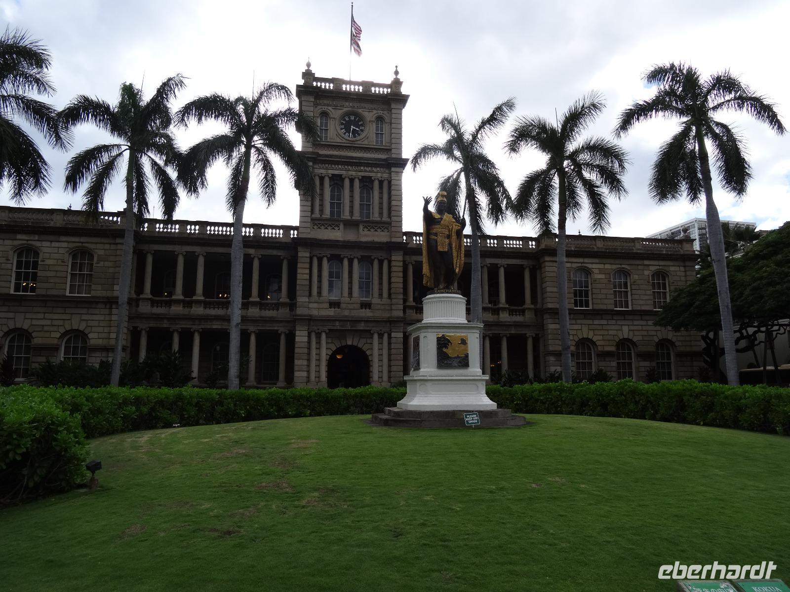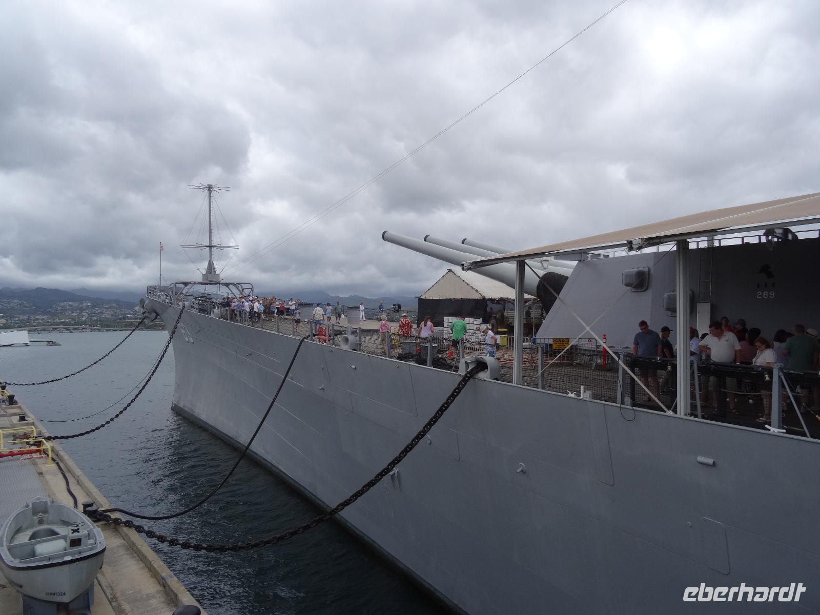 Wer an Hawaii denkt, hat in erster Linie die landschaftlichen Schönheiten vor Augen, wird bestenfalls aber auch die weltpolitisch bedeutenden Ereignisse des Jahres 1941 kennen, die auf der Insel Oahu stattgefunden haben. Die Rede ist von dem japanischen Luftangriff auf den Marinestützpunkt Pearl Harbor sowie die Air Force Bases Hickham, Wheeler und andere. Die Ereignisse von damals bedeuteten den Eintritt der USA in den 2. Weltkrieg sowie die Kriegserklärung an Japan. Mit derlei historischen Vorkenntnissen gerüstet, wollten wir heute die nationale Gedenkstätte Pearl Habor besichtigten. In knapp dreißig Minuten gelangten wir zum Ausstellungsgelände, welches wir nach einem kurzen Sicherheitscheck betraten. Bevor wir einen etwa halbstündigen Film über die damaligen Geschehnisse im pazifischen Raum sahen, konnten wir uns noch mit den ausgestellten Exponaten und ergänzenden Erklärungen im Freigelände befassen. Anschließend gelangten wir mit einem Tender zum USS Arizona Memorial, welches über der Stelle errichtet wurde, wo das Schlachtschiff am 07. Dezember 1941 im Hafenbecken vernichtet wurde und 1177 Seeleute den Tod fanden. Reste des Schiffes sind immer noch sichtbar, da das Wrack zwar teilweise demontiert, aber nie gehoben wurde. Es dient als Ruhestätte für die überwiegende Mehrheit der gefallenen Besatzungsmitglieder. Wir verließen die Gedenkstätte und überquerten die Brücke nach Ford Island, wo wir das Battleship USS Missouri besichtigten. Das heutige Museumsschiff wurde neben dem Wrack der USS Arizona festgemacht, hatte es doch wie dieses eine ähnliche historische Bedeutung. Am 02. September 1945 unterschrieben die Vertreter Japans auf diesem Schiff die Kapitulationserklärung und sorgten damit für das Ende des 2. Weltkrieges. Mehrfach modernisiert diente es noch bis in die 90er Jahre des letzten Jahrhunderts als Kriegsschiff der Navy. Viele Bereiche des Schiffes waren zugänglich, konnten selbst erkundet werden oder wurden uns bei einer Führung näher erläutert. Es war schon früher Nachmittag, als wir uns mit dem Bus auf den Rückweg nach Honolulu machten. Nach einer kleinen Mittagspause bei Gordon Biersch, direkt am Hafen gelegen, wo man auch Spätzle, Bratwurst, Sauerkraut und Bier nach deutschem Reinheitsgebot bekam, unternahmen wir eine kleine Stadtrundfahrt durch Honolulu. Vorbei an den Wohn- und Bürotürmen Downtown's fuhren wir zum Parlament, wo wir kurz stoppten, bevor wir durch Chinatown zum Iolani-Palace, dem Königspalast gelangten, welcher 1881 fertiggestellt wurde. Wir besichtigten ihn von außen, währenddessen uns Brigitte weitere Informationen zu seiner Geschichte und seinen königlichen Bewohnern zuteilwerden ließ. Anschließend überquerten wir die Straße und gelangten zur gegenüberliegenden Statue von König Kamehameha I., dem ersten König von Hawaii, der die Inseln 1810 zu einem Königreich vereinte. Die Statue steht vor dem Aliiolani Hale, einem Gebäude, in dem der oberste Gerichtshof von Hawaii untergebracht ist. Ein letzter kurzer Abstecher zum Aloha-Tower, dem Wahrzeichen der pazifischen Metropole, der seit 1926 die ankommenden Schiffe aus aller Welt begrüßt und danach ging es zurück zu unserem Hotel.