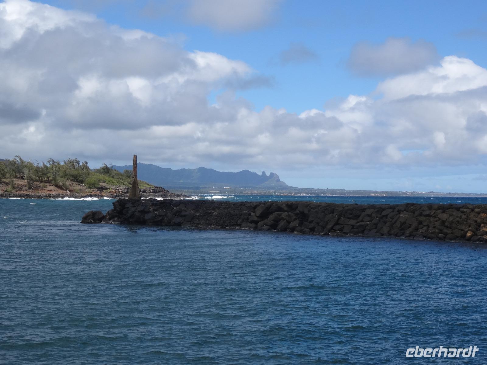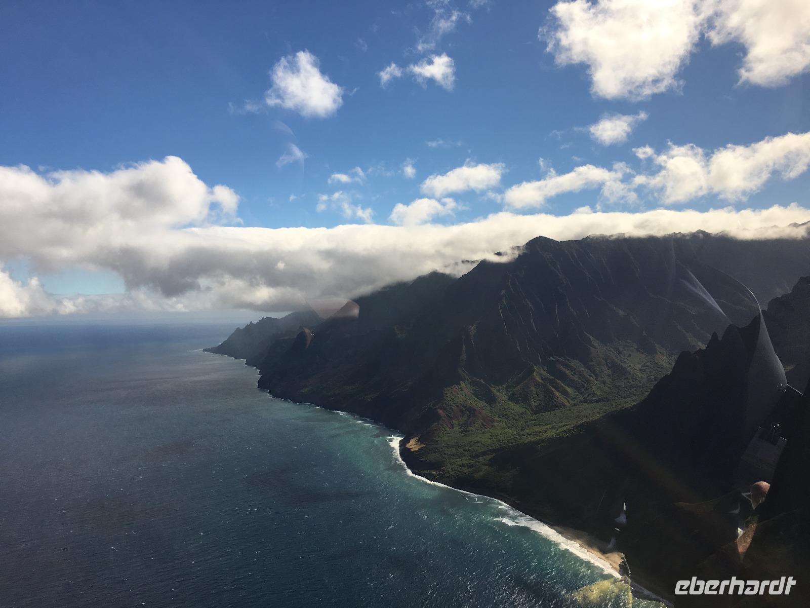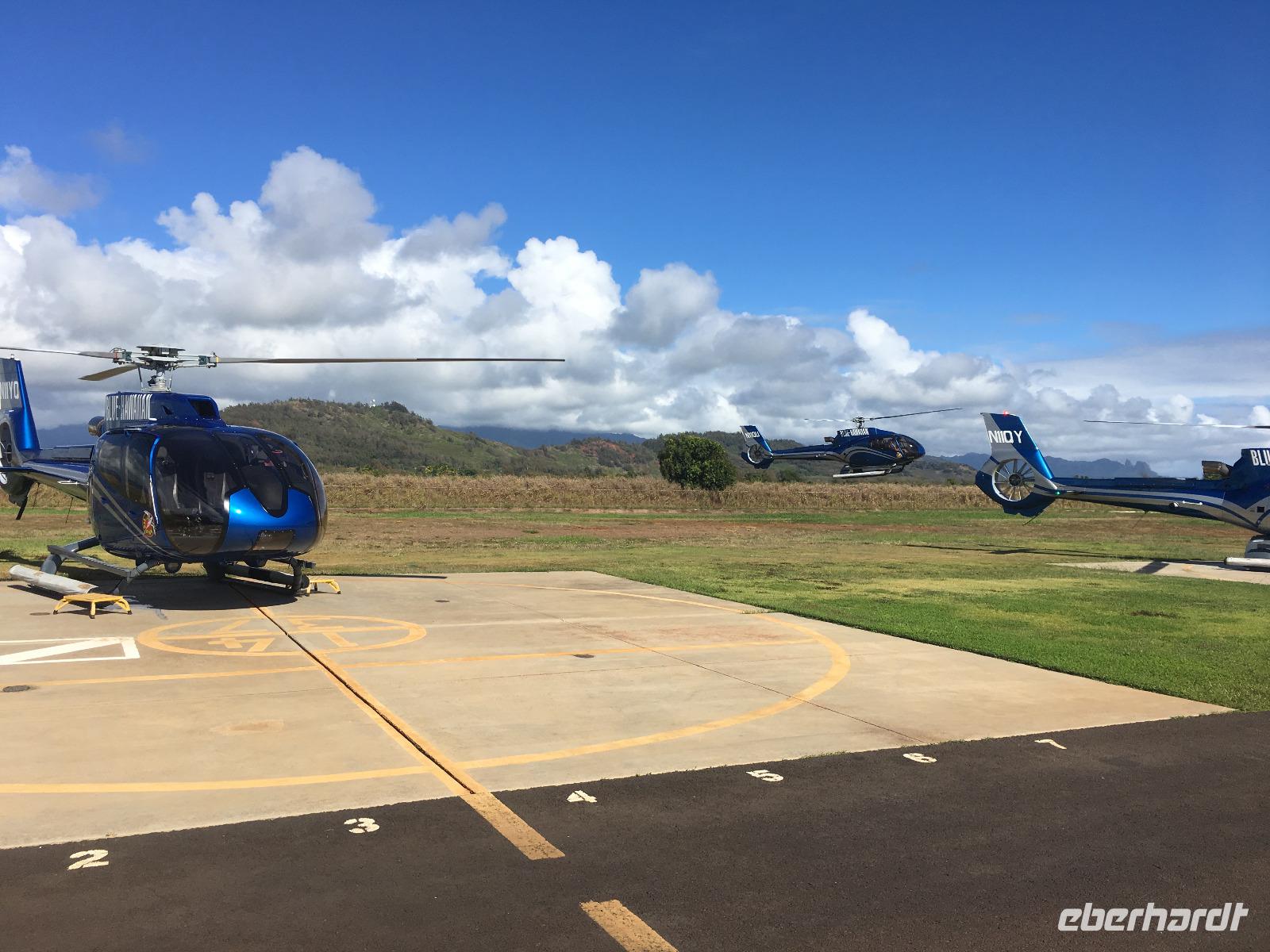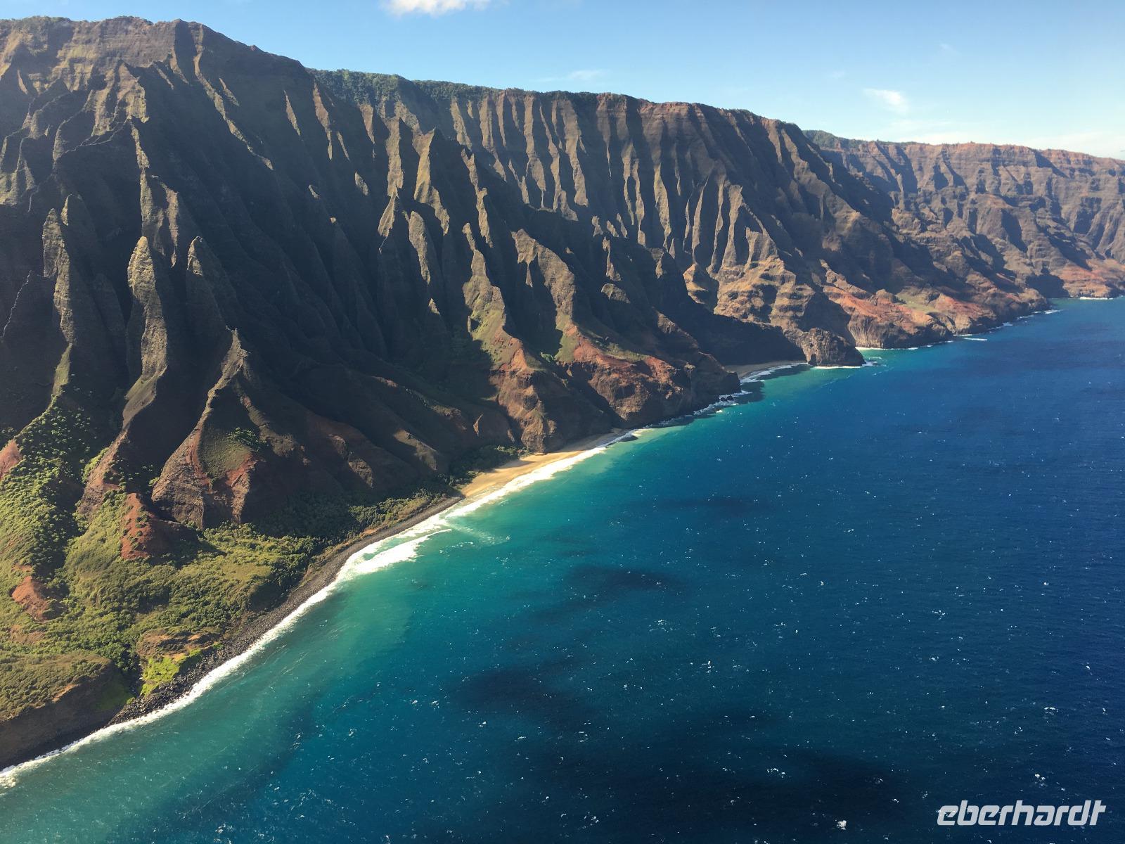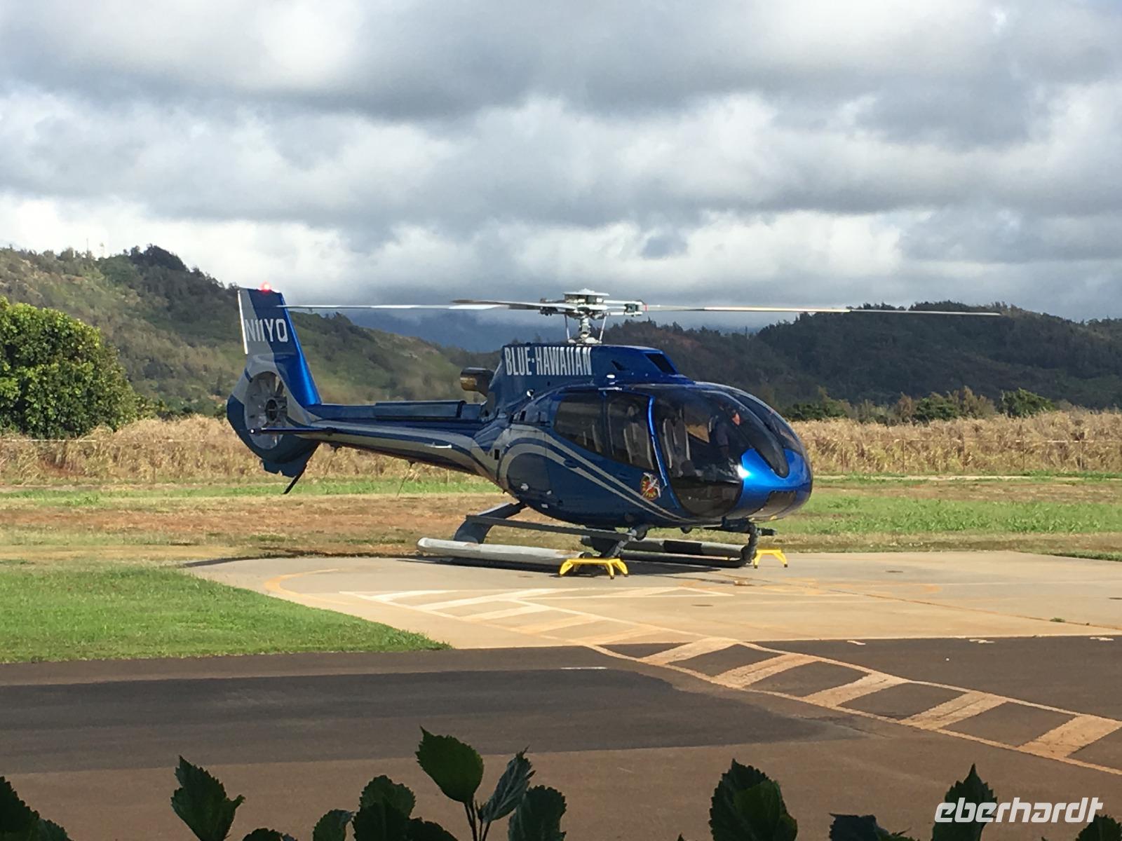 Das Aufstehen fiel uns heute überhaupt nicht schwer, stand doch ein absolutes Highlight und der beste Grund, Kauai zu besuchen, auf dem Programm. Es ging mit dem Helikopter über die Insel und das Wetter versprach seinen Teil zum Gelingen beitragen zu wollen. Nach einem stärkenden Frühstück wurden wir mit einem Transfer zur Heli-Base nach Lihue gebracht. Nach dem obligatorischen Wiegen (die Ergebnisse waren glücklicherweise nicht für jedermann einsehbar, puuh...) wurden wir vom Team der Blue Hawaiian Helicopters in den Ablauf und die Sicherheitsbestimmungen eingewiesen. Nach der gewichtsbestimmenden Gruppenbildung bestiegen wir nacheinander die bereitstehenden American Europter ECO Star Helicopter und erhoben uns in die Lüfte. Ein Flugteam bestand jeweils aus einem Piloten und sechs Passagieren. Es war im wahrsten Sinne des Wortes ein erhebendes Gefühl, den Flugplatz unter sich immer kleiner werden zu sehen und in die grüne Wildnis Kauai's hinauszufliegen. Unter uns sahen wir das beeindruckende Hanapepe Valley, bevor wir die Mana Waiapuna, besser bekannt als die "Jurassic Park Falls" auftauchen sahen. Unser Pilot gab dazu immer die entsprechenden Erklärungen und nicht selten wurde das Ganze auch durch die passende Filmmusik untermalt, da in dieser üppig grünen Dschungellandschaft schon viele Hollywood-Blockbuster gedreht wurden. Avatar, Pirates of the Caribian oder Jurassic Park waren nur einige davon. Über den Olokele Canyon hinaus erreichten wir den spektakulären Waimea Canyon, den man Aufgrund seiner Ähnlichkeit mit seinem großen Bruder auch den "Grand Canyon of the Pacific" nennt. Wir genossen das Farbenspiel der Felsformationen, welche sich bizarr in die Tiefe ausbreiteten, bevor wir die fantastische Na Pali Coast erreichten und auf einen Parallelkurs einschwenkten. Uns bot sich von hoch oben ein traumhafter, unvergesslicher Anblick. Dann drehten wir zur Hanalei Bay und dem Princeville Resort ab, paradiesische Kleinode inmitten der schroffen Küstenlinie, bevor wir die Wailua Falls überflogen. Da das Wetter an diesem Tag sehr gut war, konnten wir auch zum Mt. Waialeale, ins Herz des ehemaligen Vulkans, quasi der Geburtsstätte der Insel, fliegen. Hier befindet man sich am nassesten Ort auf Erden, wo durchschnittlich 12000 mm Regen pro Jahr gemessen werden. Damit konkurriert man zwar mit zwei Orten in Indien und Kolumbien um den Titel, aber Rekorde sind ja manchmal auch subjektiv in der Messung und Bewertung. Nach diesem unglaublichen Flug über die älteste Insel des Archipels landeten wir wohlbehalten wieder in Lihue. Nach kurzer Fahrt zum Hotel waren etwas Entspannung und eine kleine Mittagspause angesagt. Am frühen Nachmittag setzten wir dann die Erkundung von Kauai fort, dieses Mal nicht mit dem Hubschrauber, sondern mit dem Bus. "Tante Berni", unsere Busfahrerin, nach eigener Aussage eine Mischung aus englischen (Vater)Genen und Vielvölkergenen mütterlicherseits, brachte uns zuerst zu den Opaekaa Falls und zum Wailua River, wo wir einen kurzen Fotostopp einlegten. Anschließend ging es direkt an die Küste, zum einstmals wichtigen, heute längst den Elementen überlassenen Warenumschlagplatz Ahukini Pier & Landing. Nur noch Zementgerippe zeugten von dem einstigen Sinn der Anlage. Danach fuhren wir weiter nach Lihue, wo wir etwas Freizeit zum Baden, Bummeln oder Shoppen hatten. Auf dem Rückweg zu unserem Hotel machten wir einen Abstecher zum Wailua River, ganz in der Nähe von Smith's tropischen Garten, von wo aus man einen schönen Blick auf eine Felsformation hat, die man "Schlafender Titan" nennt. Dessen nicht genug, gönnten wir uns noch eine Durchfahrt durch den Lydgate Park, wo viele Familien mit Freunden und Angehörigen ihren Tag bei Barbecue, Spiel und Spaß verbrachten. Rechtzeitig zum Abendessen waren wir wieder in unserem Hotel, wo wir uns ein Schweinekotelett mit Reis und Gemüse sowie eine leckere Papaya-Creme-Brulee schmecken ließen. Ein Tag voller wunderbarer Eindrücke ging damit zu Ende.