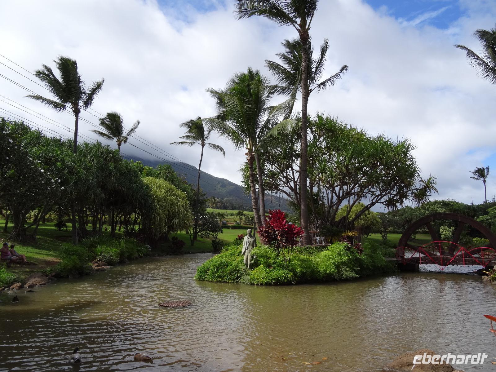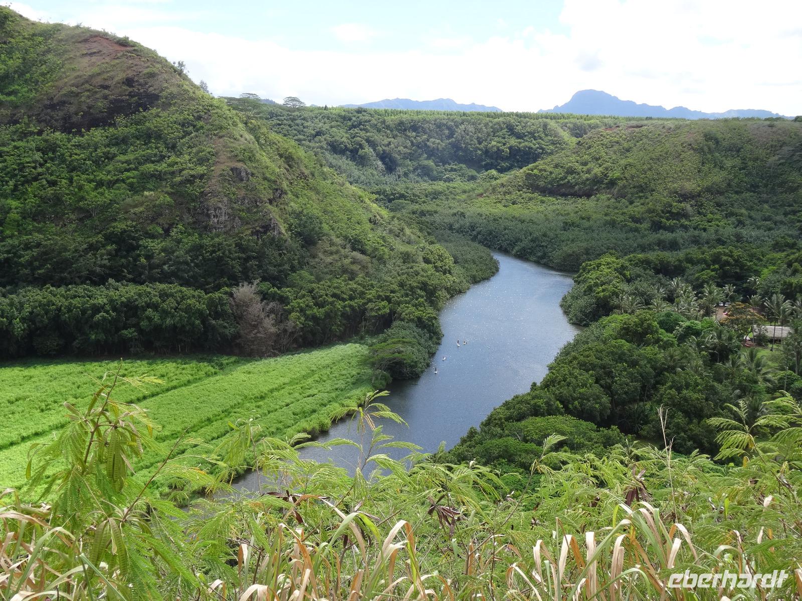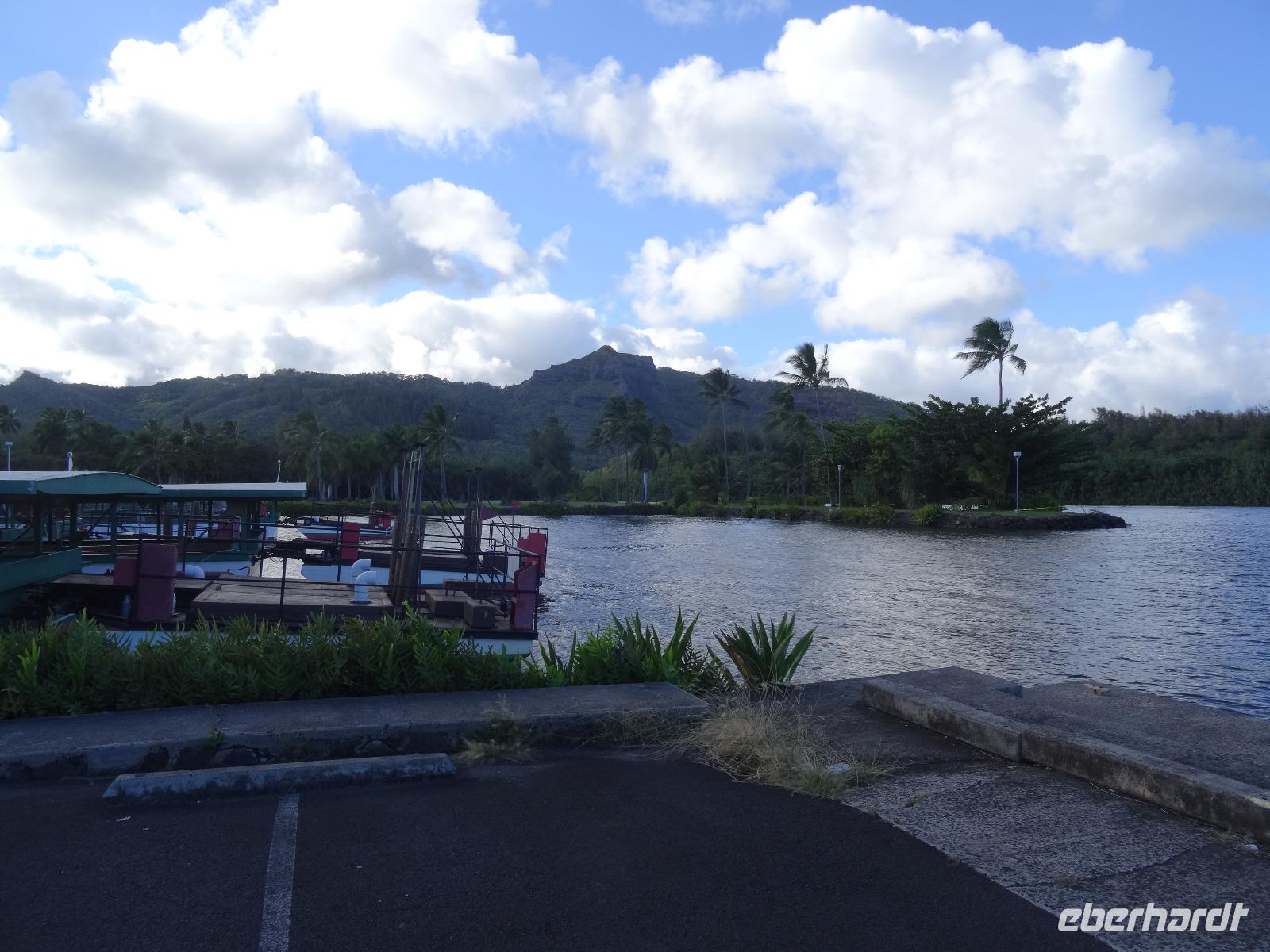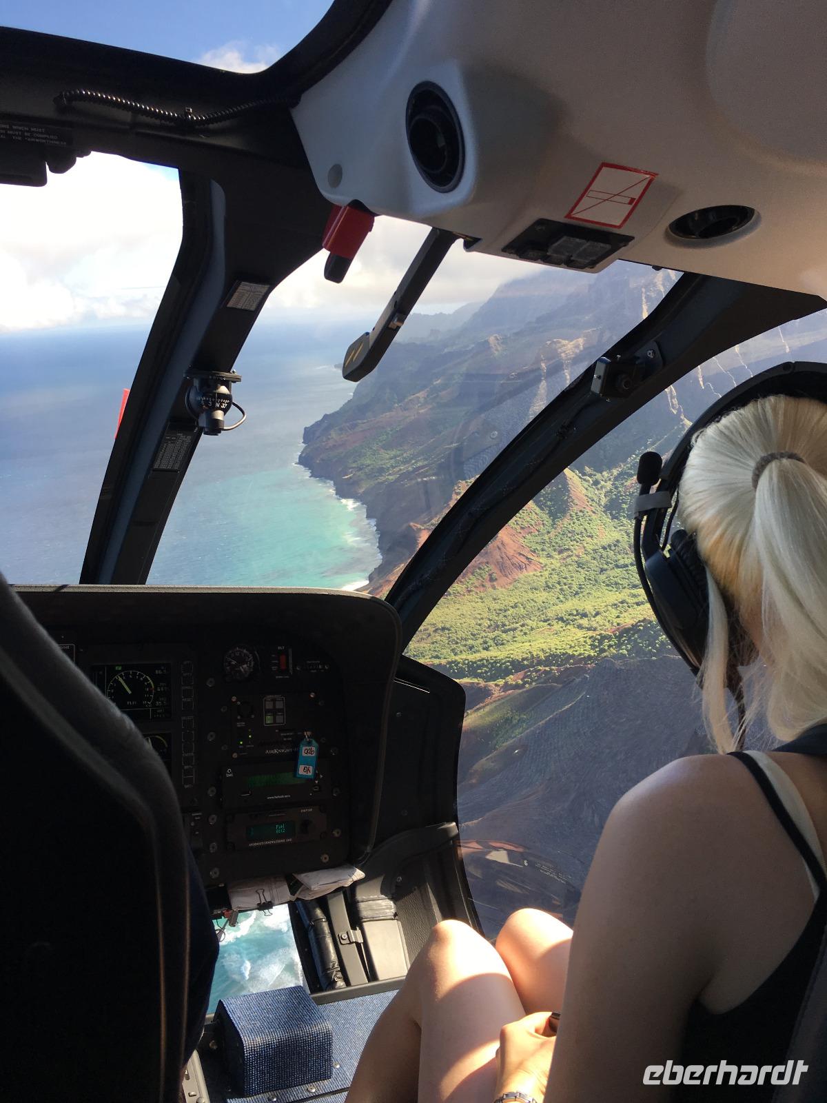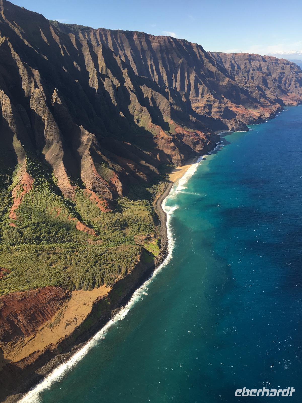 Das Aufstehen fiel uns heute überhaupt nicht schwer, stand doch ein absolutes Highlight und der beste Grund, Kauai zu besuchen, auf dem Programm. Es ging mit dem Helikopter über die Insel und das Wetter versprach seinen Teil zum Gelingen beitragen zu wollen. Nach einem stärkenden Frühstück wurden wir mit einem Transfer zur Heli-Base nach Lihue gebracht. Nach dem obligatorischen Wiegen (die Ergebnisse waren glücklicherweise nicht für jedermann einsehbar, puuh...) wurden wir vom Team der Blue Hawaiian Helicopters in den Ablauf und die Sicherheitsbestimmungen eingewiesen. Nach der gewichtsbestimmenden Gruppenbildung bestiegen wir nacheinander die bereitstehenden American Europter ECO Star Helicopter und erhoben uns in die Lüfte. Ein Flugteam bestand jeweils aus einem Piloten und sechs Passagieren. Es war im wahrsten Sinne des Wortes ein erhebendes Gefühl, den Flugplatz unter sich immer kleiner werden zu sehen und in die grüne Wildnis Kauai's hinauszufliegen. Unter uns sahen wir das beeindruckende Hanapepe Valley, bevor wir die Mana Waiapuna, besser bekannt als die "Jurassic Park Falls" auftauchen sahen. Unser Pilot gab dazu immer die entsprechenden Erklärungen und nicht selten wurde das Ganze auch durch die passende Filmmusik untermalt, da in dieser üppig grünen Dschungellandschaft schon viele Hollywood-Blockbuster gedreht wurden. Avatar, Pirates of the Caribian oder Jurassic Park waren nur einige davon. Über den Olokele Canyon hinaus erreichten wir den spektakulären Waimea Canyon, den man Aufgrund seiner Ähnlichkeit mit seinem großen Bruder auch den "Grand Canyon of the Pacific" nennt. Wir genossen das Farbenspiel der Felsformationen, welche sich bizarr in die Tiefe ausbreiteten, bevor wir die fantastische Na Pali Coast erreichten und auf einen Parallelkurs einschwenkten. Uns bot sich von hoch oben ein traumhafter, unvergesslicher Anblick. Dann drehten wir zur Hanalei Bay und dem Princeville Resort ab, paradiesische Kleinode inmitten der schroffen Küstenlinie, bevor wir die Wailua Falls überflogen. Da das Wetter an diesem Tag sehr gut war, konnten wir auch zum Mt. Waialeale, ins Herz des ehemaligen Vulkans, quasi der Geburtsstätte der Insel, fliegen. Hier befindet man sich am nassesten Ort auf Erden, wo durchschnittlich 12000 mm Regen pro Jahr gemessen werden. Damit konkurriert man zwar mit zwei Orten in Indien und Kolumbien um den Titel, aber Rekorde sind ja manchmal auch subjektiv in der Messung und Bewertung. Nach diesem unglaublichen Flug über die älteste Insel des Archipels landeten wir wohlbehalten wieder in Lihue. Nach kurzer Fahrt zum Hotel waren etwas Entspannung und eine kleine Mittagspause angesagt. Am frühen Nachmittag setzten wir dann die Erkundung von Kauai fort, dieses Mal nicht mit dem Hubschrauber, sondern mit dem Bus. "Tante Berni", unsere Busfahrerin, nach eigener Aussage eine Mischung aus englischen (Vater)Genen und Vielvölkergenen mütterlicherseits, brachte uns zuerst zu den Opaekaa Falls und zum Wailua River, wo wir einen kurzen Fotostopp einlegten. Anschließend ging es direkt an die Küste, zum einstmals wichtigen, heute längst den Elementen überlassenen Warenumschlagplatz Ahukini Pier & Landing. Nur noch Zementgerippe zeugten von dem einstigen Sinn der Anlage. Danach fuhren wir weiter nach Lihue, wo wir etwas Freizeit zum Baden, Bummeln oder Shoppen hatten. Auf dem Rückweg zu unserem Hotel machten wir einen Abstecher zum Wailua River, ganz in der Nähe von Smith's tropischen Garten, von wo aus man einen schönen Blick auf eine Felsformation hat, die man "Schlafender Titan" nennt. Dessen nicht genug, gönnten wir uns noch eine Durchfahrt durch den Lydgate Park, wo viele Familien mit Freunden und Angehörigen ihren Tag bei Barbecue, Spiel und Spaß verbrachten. Rechtzeitig zum Abendessen waren wir wieder in unserem Hotel, wo wir uns ein Schweinekotelett mit Reis und Gemüse sowie eine leckere Papaya-Creme-Brulee schmecken ließen. Ein Tag voller wunderbarer Eindrücke ging damit zu Ende.