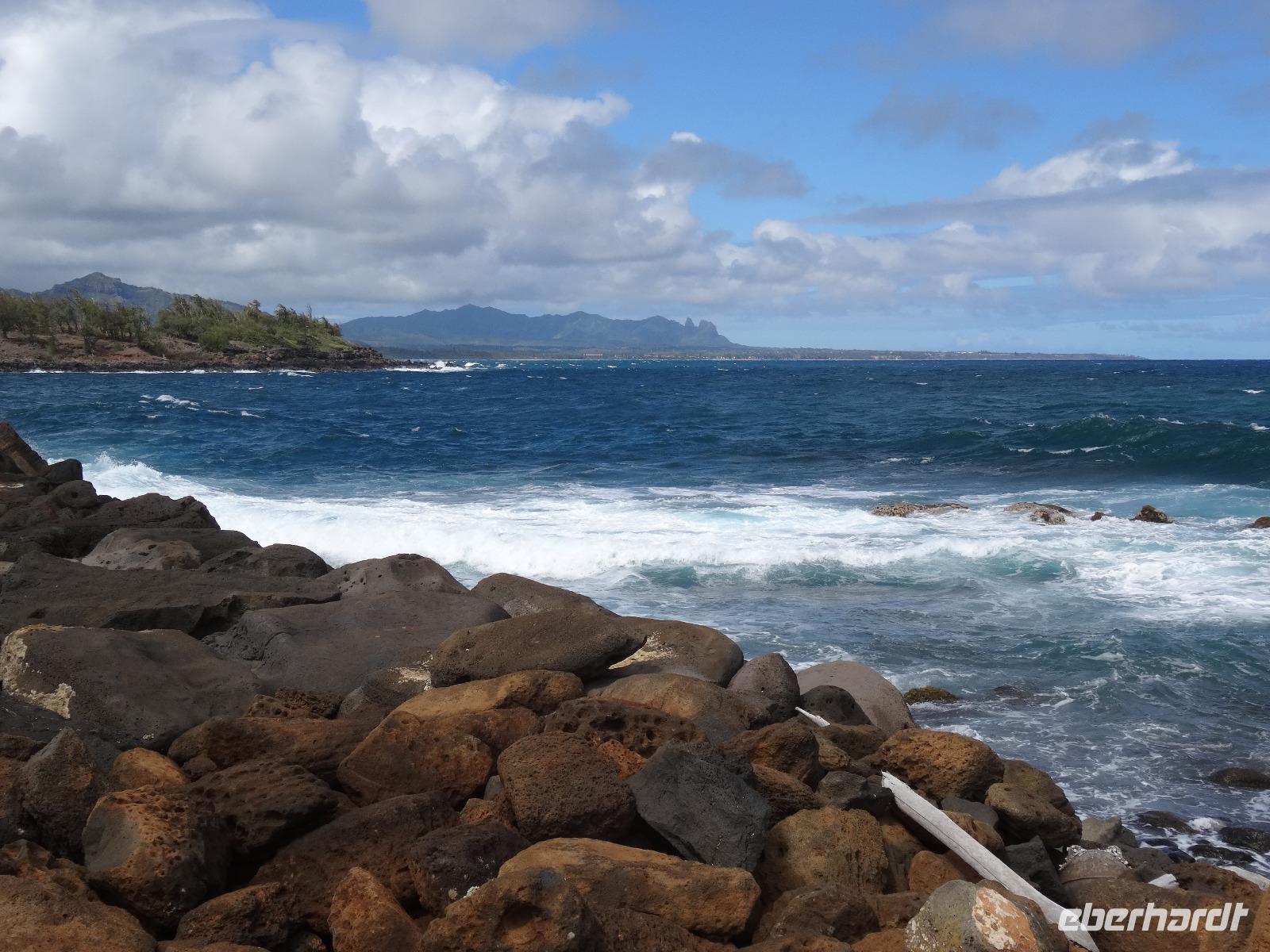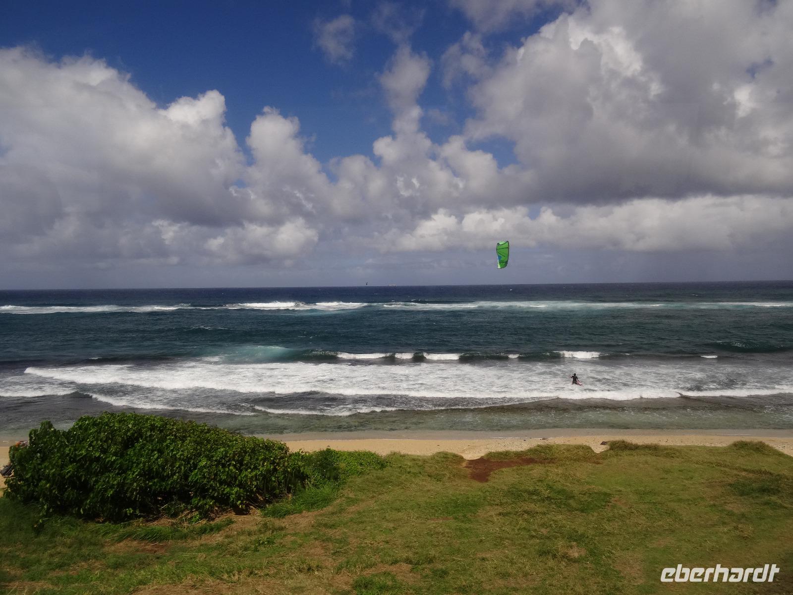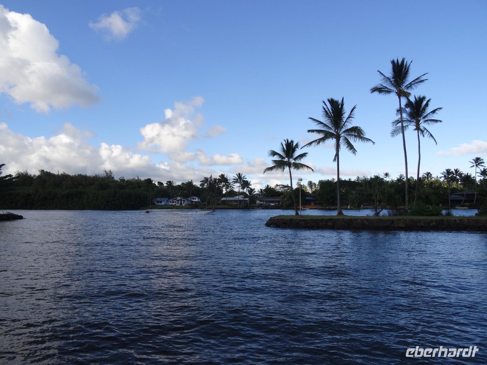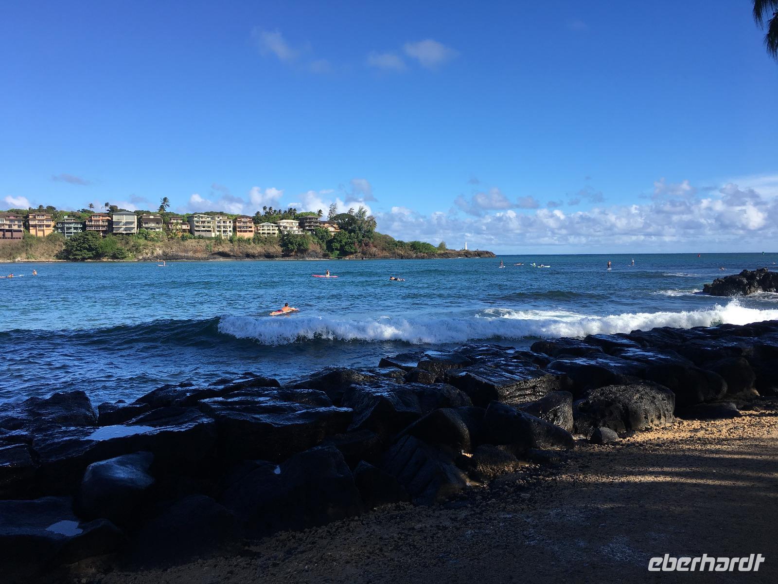 Heute verabschiedeten wir uns von Oahu und flogen mit Hawaiian Airlines zur Nachbarinsel Kauai, welche auch die Garteninsel genannt wird. Dies kommt nicht von ungefähr, sind doch beinahe vier Fünftel der Insel durch üppige Vegetation und scheinbar unberührte Landstriche geprägt. Zumal auch kein Gebäude höher als eine Palme gebaut werden darf, was dem Antlitz der Insel ebenfalls sehr gut tut. Sieht man von langwierigen Sicherheitskontrollen am Flughafen in Honolulu ab, erfolgte das Islandhopping ziemlich ereignislos. Man war kaum 25 Minuten in der Luft, da setzten wir auch schon wieder zur Landung am Flughafen in Lihue an. Unser Busfahrer erwartete uns schon und brachte uns in reichlichen 20 Minuten zu unserem Hotel am Strand von Kapaa. Hier wurden wir freundlich empfangen und mit Informationen zur Anlage versorgt. Nach dem Zimmerbezug erkundeten wir erst einmal die Umgebung, bummelten am wunderschönen Strand entlang oder verbrachten die Zeit im Poolbereich des Hotels. Aufgrund der vorgelagerten Korallenbänke konnte man leider nicht direkt am Hotelstrand ins Wasser gehen, da hier eine starke Strömung herrschte und der Untergrund scharfkantig und uneben war. Aber davon ließen wir uns nicht beeindrucken, wir genossen stattdessen die schäumende Brandung und die Urgewalt des Elementes. Am zeitigen Abend nahmen wir dann ein schmackhaftes dreigängiges Abendessen im Hotelrestaurant ein, bevor wir uns einen Schlummertrunk an der Bar genehmigten oder dem Rauschen der Wellen am mondbeschienenen Kapaa-Beach lauschten.