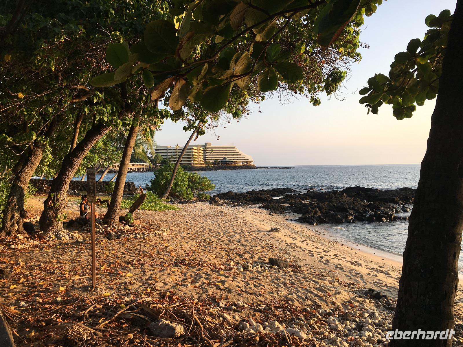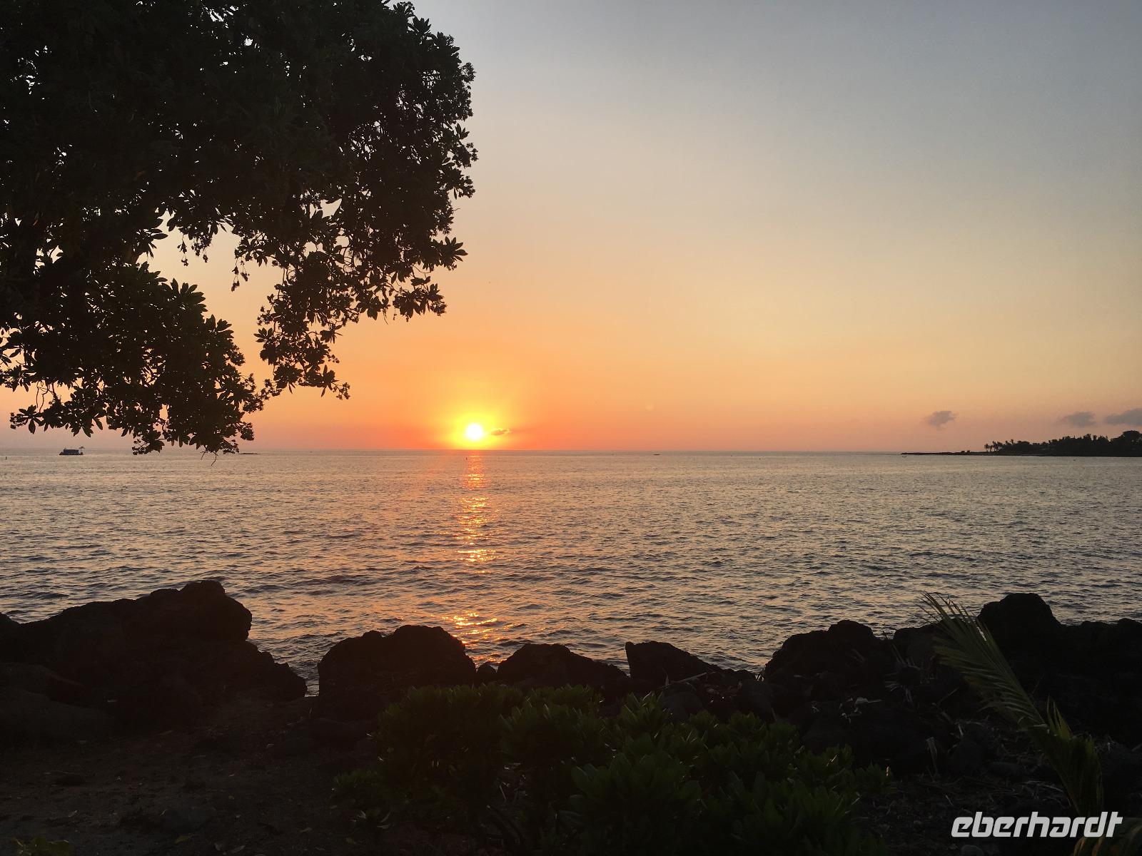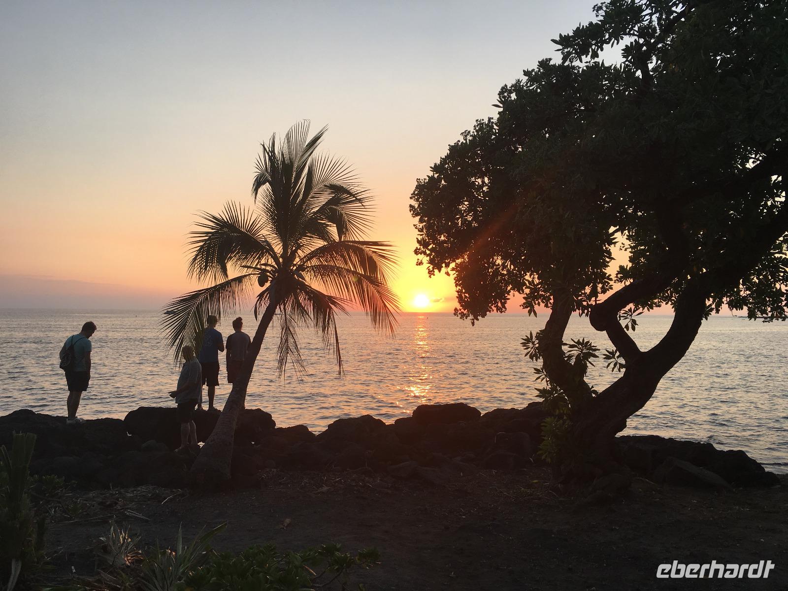 Wie schnell die Tage vergingen, merkten wir immer daran, dass ein weiterer Flug auf dem Programm stand. Nach zwei erlebnisreichen Tagen auf Kauai verließen wir die Insel schon wieder und machten uns via Honolulu gen Big Island auf den Weg. Die nunmehr dritte Insel unseres Hawaii-Abenteuers war gleichzeitig die größte und jüngste und sie wächst noch heute. Fünf mehr oder weniger große Vulkane bestimmten und bestimmen noch die vulkanischen Aktivitäten, die immer wieder Scharen von Schaulustigen aus aller Welt auf die Insel führen. Hier machten nun auch wir Station. Nach zwei wiederum sehr kurzen Flügen gelangten wir mit dem Bus zu unserem Hotel nach Kona. Vor etwas mehr als einer Woche hatten sich hier noch tausende Athleten und Athletinnen beim legendären Ironman Triathlon von Hawaii über die drei Disziplinen gequält. Heute gehörte das Städtchen wieder den Touristen aus aller Welt. Nach dem Einchecken im Hotel, welches direkt am Wasser stand und einen schönen Blick auf die angrenzende Bucht gewährte, unternahmen wir einen ersten Erkundungsrundgang durch Kona oder entspannten am Hotelpool. In einer der vielen kleinen Restaurants aßen wir später zu Abend und beobachteten dabei den fantastischen Sonnenuntergang.