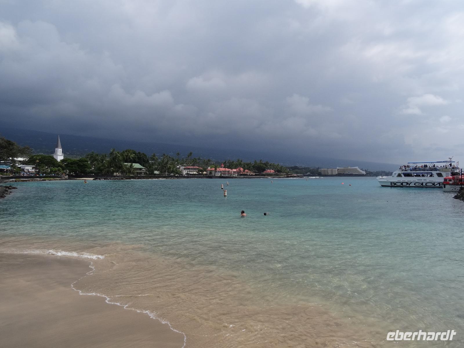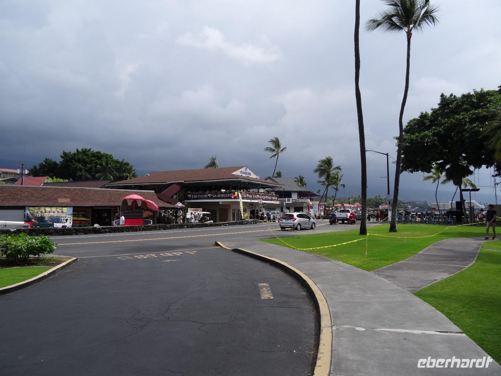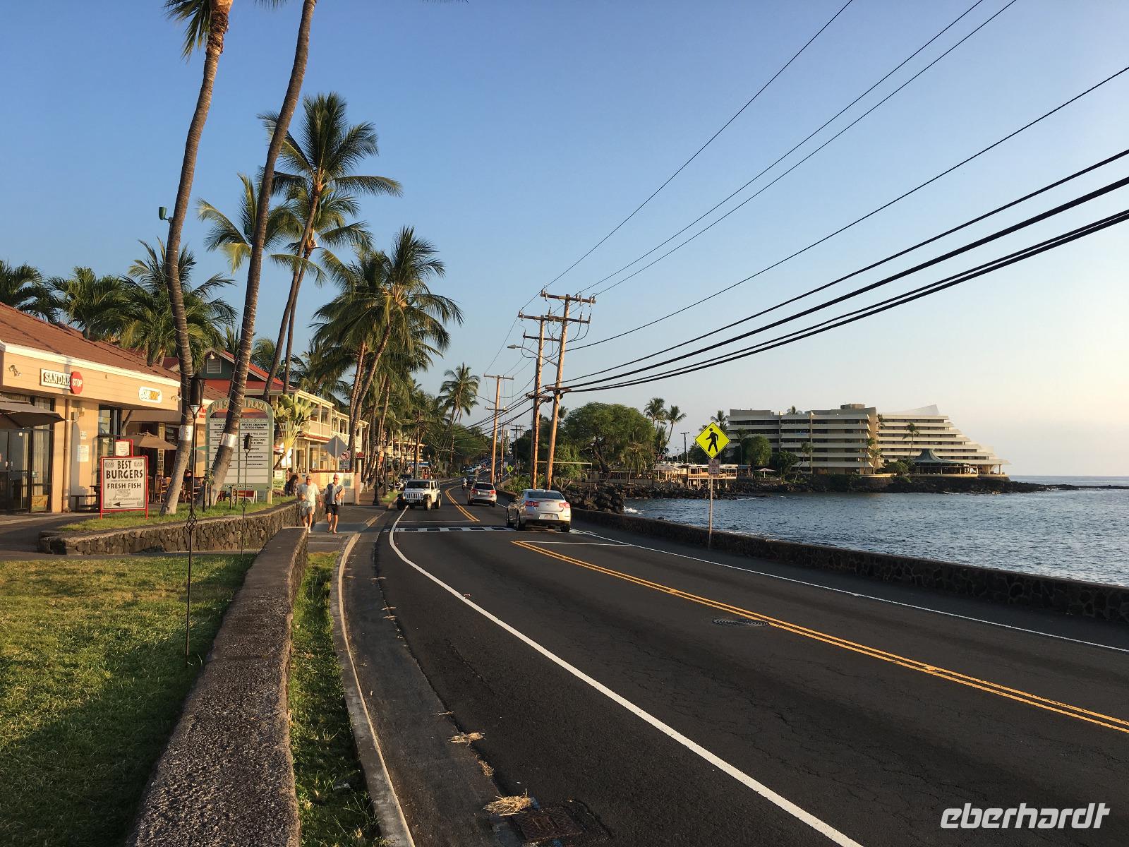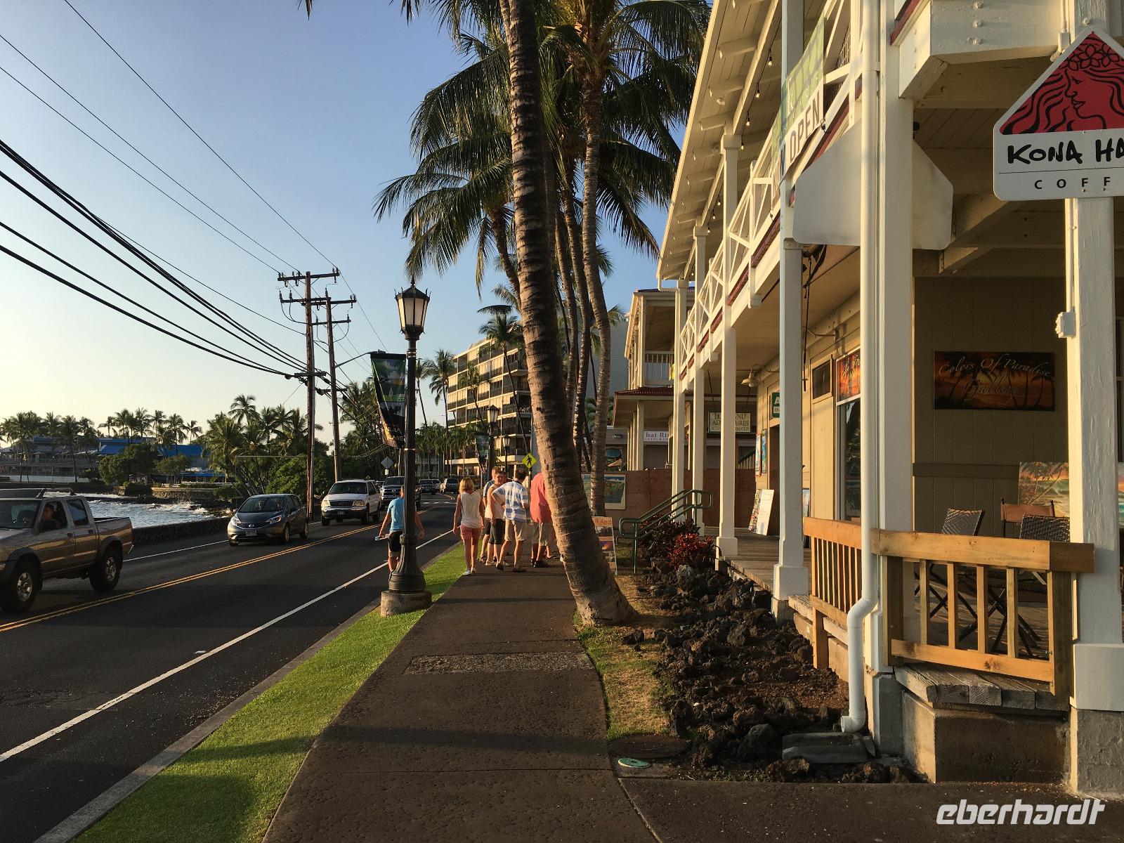 Wie schnell die Tage vergingen, merkten wir immer daran, dass ein weiterer Flug auf dem Programm stand. Nach zwei erlebnisreichen Tagen auf Kauai verließen wir die Insel schon wieder und machten uns via Honolulu gen Big Island auf den Weg. Die nunmehr dritte Insel unseres Hawaii-Abenteuers war gleichzeitig die größte und jüngste und sie wächst noch heute. Fünf mehr oder weniger große Vulkane bestimmten und bestimmen noch die vulkanischen Aktivitäten, die immer wieder Scharen von Schaulustigen aus aller Welt auf die Insel führen. Hier machten nun auch wir Station. Nach zwei wiederum sehr kurzen Flügen gelangten wir mit dem Bus zu unserem Hotel nach Kona. Vor etwas mehr als einer Woche hatten sich hier noch tausende Athleten und Athletinnen beim legendären Ironman Triathlon von Hawaii über die drei Disziplinen gequält. Heute gehörte das Städtchen wieder den Touristen aus aller Welt. Nach dem Einchecken im Hotel, welches direkt am Wasser stand und einen schönen Blick auf die angrenzende Bucht gewährte, unternahmen wir einen ersten Erkundungsrundgang durch Kona oder entspannten am Hotelpool. In einer der vielen kleinen Restaurants aßen wir später zu Abend und beobachteten dabei den fantastischen Sonnenuntergang.
