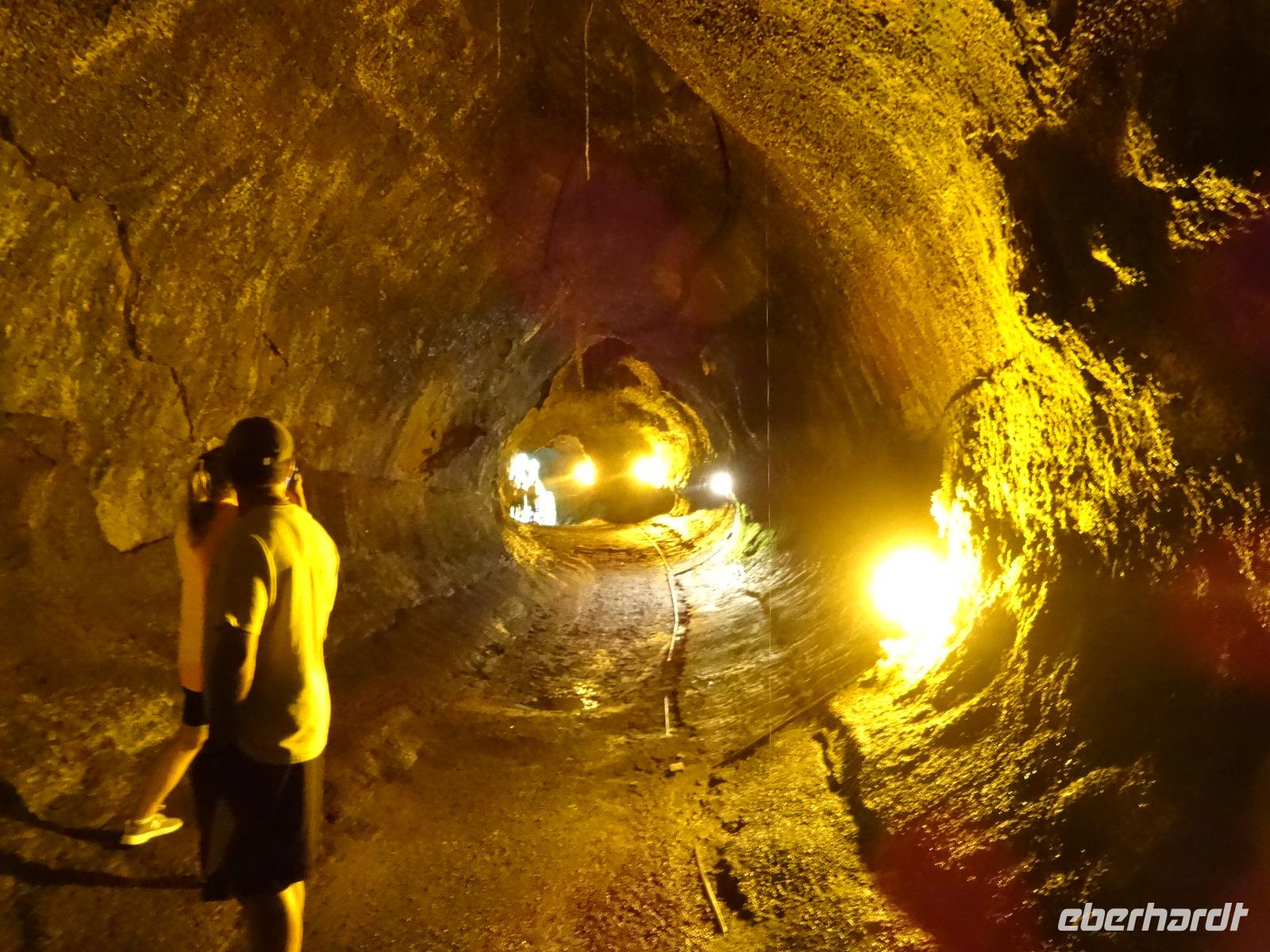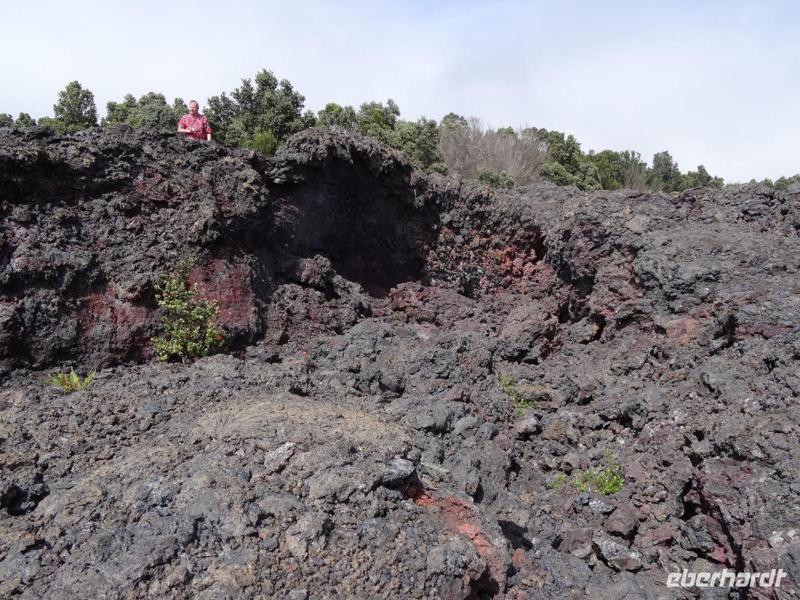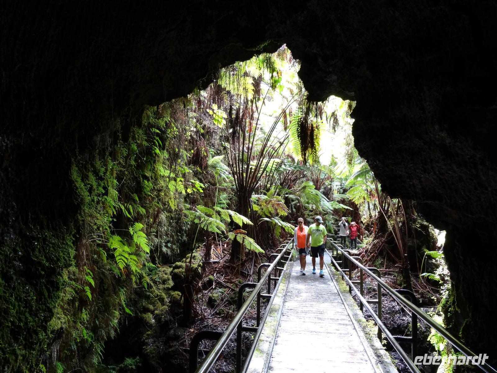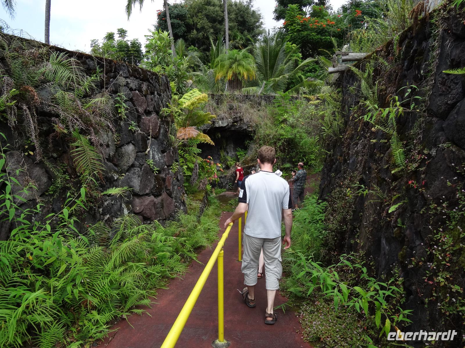 Nach einem sehr reichhaltigen Frühstück mit tollem Blick auf das azurblaue Wasser ging es heute auf Big-Island-Erkundungstour. Wir verließen Kona in nordwestlicher Richtung und fuhren an kleinen Lavafeldern vorbei, die meist gefährlich nahe an den wenigen Siedlungen gelegen waren. Obwohl wir uns auf der Insel mit den aktivsten Vulkanen der Welt befanden, schien das den hier lebenden knapp 180.000 Einwohnern keine Angst zu machen; im Gegenteil, Bewohner solcherart gefährlicher Hotspots haben ein jahrhundertealtes Urvertrauen in die natürliche "Rechtschaffenheit der Elemente". Leider hatte das Element Wasser am heutigen Morgen die Oberhand, so dass wir uns auf unserer Fahrt von tiefen Wolken, Nebel und leichtem Sprühregen begleitet sahen. Das sollte sich zwar im Laufe des Tages immer mal wieder ändern, verwehrte uns aber größtenteils die Blicke auf die beiden beherrschenden Vulkane Mauna Loa und Mauna Kea. Während wir ersteren während unserer gesamten Inselumkreisung nie richtig zu Gesicht bekamen, konnten wir doch wenigstens den Mauna Kea, den 4241 Meter hohen erloschenen Vulkan, von der einen oder anderen Stelle aus aufs Foto bannen. Je nördlicher wie kamen, desto spärlicher wurden die Lavazungen, dafür nahm das nutzbare Ranchland zu. Auf unserem Weg nach Waimea durchquerten wir die riesige Parker Ranch, eine der größten Viehzuchtbetriebe in den USA und seit 1847 Heimat der Paniolos, der hawaiianischen Cowboys. Zwischendurch machten wir eine kleine Pause im Parker-Ranch-Center, wo es neben diversen Restaurationen vor allem Cowboy-Utensilien und Merchandising-Artikel zu kaufen gab. Der Highway 19 führte uns dann weiter über Honoka'a die Hamakua Küste entlang. Obwohl sich jetzt auch ab und an die Sonne zeigte, lag der Mauna Kea von Nordosten betrachtet größtenteils im Nebel oder war durch tiefhängende Wolken nicht zu sehen. Ungeachtet dessen durchfuhren wir am späten Vormittag die nach Inselmaßstäben größere Stadt Hilo, bevor wir um die Mittagszeit in der Nähe des Volcanoes National Park im Lava Rock Café unsere Lunchpause bei typisch amerikanischem, aber durchaus schmackhaften Essen einlegten. Solcherart gestärkt konnten wir uns nun auf die nachfolgenden Besichtigungen im Nationalpark freuen. Zuvor hielten wir aber noch kurz an der Akatsuka Orchideen Farm, wo eine Vielzahl wunderbarer Orchideen im sogenannten Orchid Maze ausstellt wurden, der gegen ein kleines Entgelt betreten werden konnte und dem interessierten Besucher eine große Artenvielfalt offerierte. Nach der Einfahrt in den Vulcanoes National Park passierten wir die Steam Vents, wo heißer Dampf aus Löchern im Boden emporsteigt und hielten anschließend am Observatorium und Jagger Museum, von wo aus man einen fantastischen Blick auf den Kilauea Krater hatte, dem derzeit aktivsten Vulkan der Welt. Dampfschwaden stiegen aus dem flachen Krater empor und mit bloßem Auge war die brodelnde Lava zu erkennen, so dass allenthalben die Hobbyfotografen ihrem Handwerk nachgingen. Auch wenn es sich nur um kleine, nicht sehr hohe Eruptionen handelte, war es doch ein unvergessliches Schauspiel, was sich unseren Augen bot. Zumal diese "Eruptiönchens" am Kilauea bereits seit 1983 andauerten. Die nächsten Stopps am erkalteten Lavasee und an einem Lavafeld aus den neunzehnhundertsiebziger Jahren führten uns den Nachlass der alles verschlingenden Gewalt von fließender Lava eindrucksvoll vor Augen. Zurück im Bus, erreichten wir ein paar Meilen weiter die Lava Thurston Tube, einen etwa dreihundert Meter langen Lavatunnel. Um zum Tunnel zu gelangen, muss man durch einen dichten, urzeitlichen Farnwald spazieren, der an einigen Stellen von Feuchtigkeit und diffusem Zwielicht geprägt ist. Ein bisschen wie Jurassic Park, nur ohne Raptoren. Hofften wir zumindest... Lavatunnel entstehen durch das erkalten der äußeren Lavaschicht, während sich die darunter liegende Lava weiterbewegt. Die äußere, bereits verfestigte Lavaschicht kann dabei große Flächen bedecken und durch das Ausbleiben von neuem, fließendem Lavamaterial zur Bildung von solchen Hohlräumen beitragen. Beim Durchschreiten des Lavatunnels musste man trotzdem unwillkürlich an menschliche Einflussnahme denken, denn die Röhre sah ziemlich "geformt" aus, so wie man das auch aus Bergwerksschächten kennt. Aber wir wollen Mutter Natur in diesem Fall keine menschliche Hilfe unterstellen, sondern glaubten an die natürliche Genesis. Anschließend verließen wir den Nationalpark wieder und begaben uns zum Punalu'u Black Sand Beach, einem, wie der Name schon sagt, schwarzsandigen Strandabschnitt im Süden der Insel. Hier befand sich auch ein Refugium der hawaiianischen grünen Seeschildkröte, von welchen wir zwei stattliche Exemplare am Strand in der Sonne liegend sahen. Auf unserem nachfolgenden Heimweg entlang der Südküste hielten wir noch in dem kleinen Örtchen Na'alehu, um im Punalu'u Bake Shop, der südlichsten Bäckerei der USA, Sweetbread, die Spezialität des Hauses zu kosten. Sweetbread, unserem Milchbrötchen ähnlich, gab es in verschiedenen Geschmacksrichtungen. Ich kaufte zwei Brote und wir kosteten uns durch die Geschmacksrichtungen Apfel-Zimt (gefüllt) und Mango-Taro-Guave (farbenfroh). Lecker und Kalorienreich. Auf unserer Rückfahrt nach Kona hielten wir noch an einem alten Lavafeld von 1907 und Brigitte erklärte uns die Unterschiede zwischen Aa-Lava, welche spitz und scharfkantig ist und Pahoehoe-Lava, die glasige Oberflächen ausbildet. Mit viel neuem Wissen und tollen Bildern im Kopf erreichten wir am Abend unser Hotel und ließen den Tag bei einem Mai Tai, einer Pina Colada oder einfach einem kalten Bier zufrieden ausklingen.