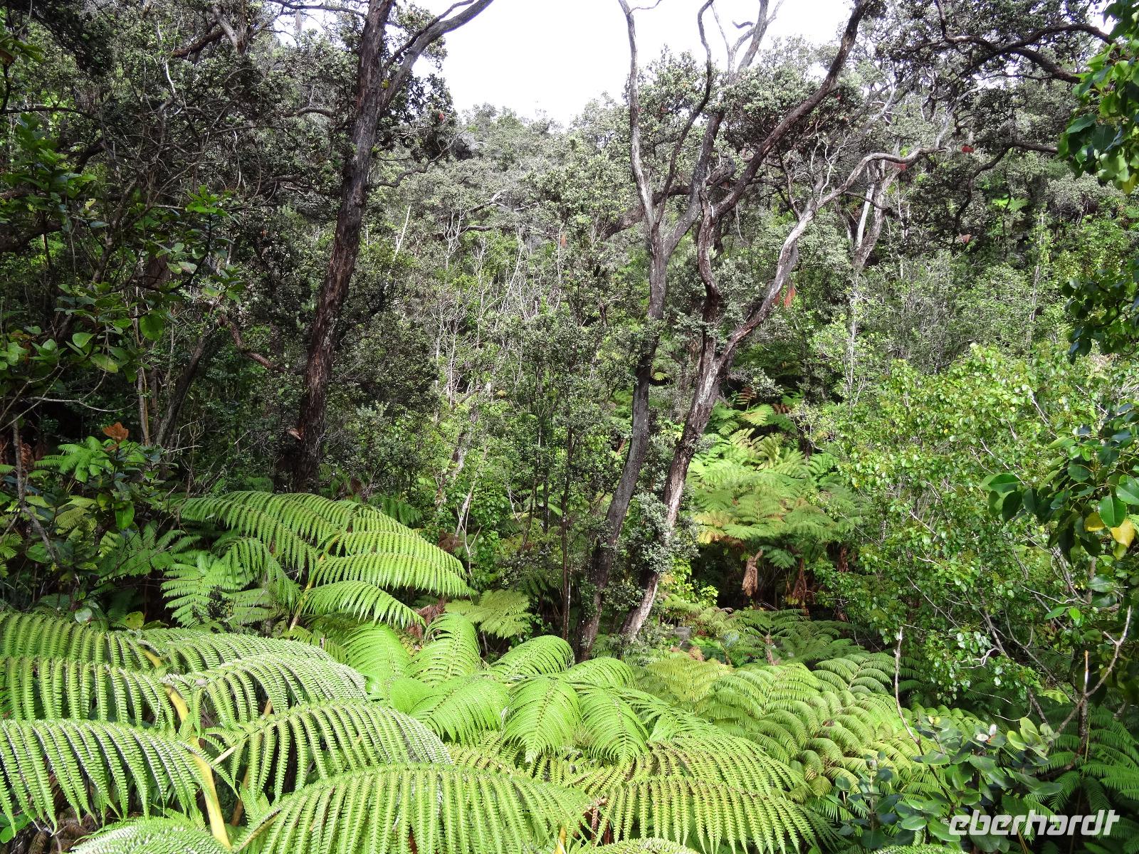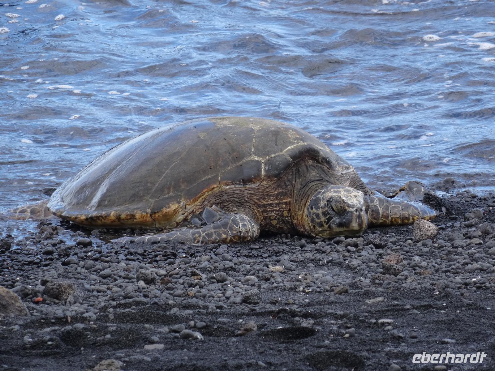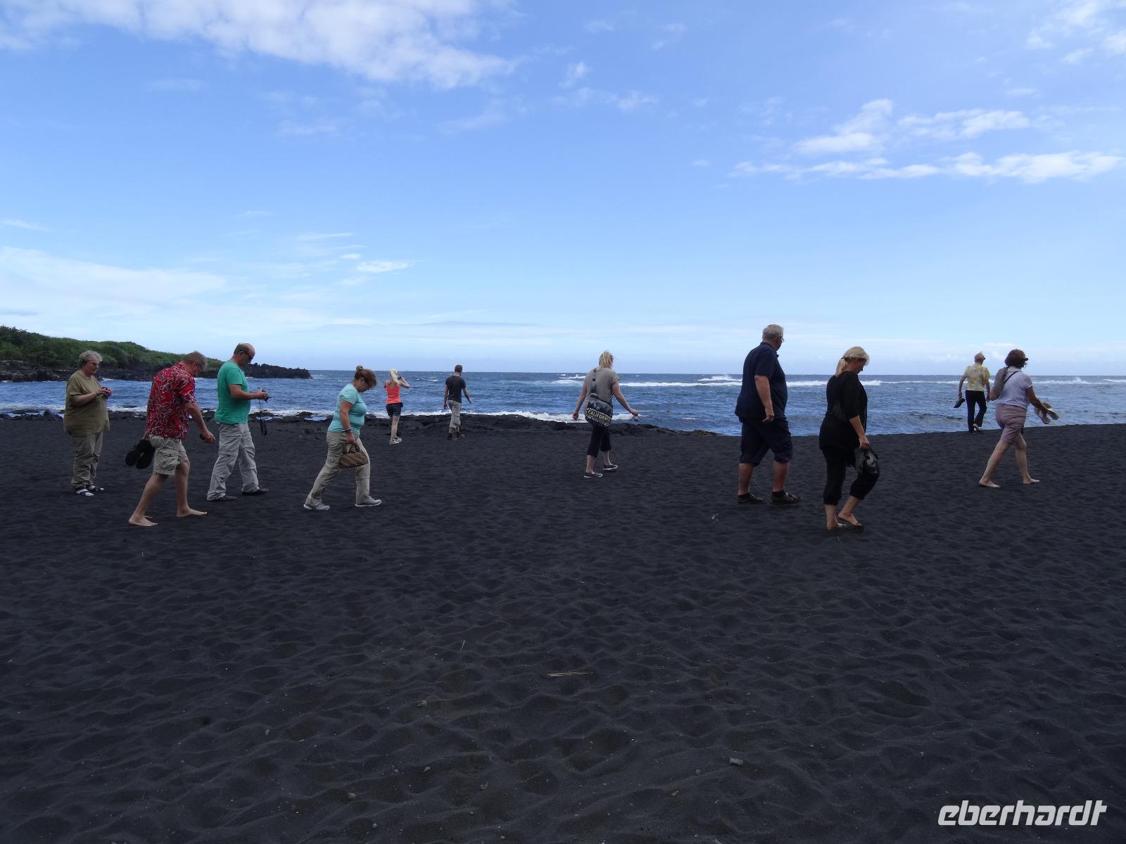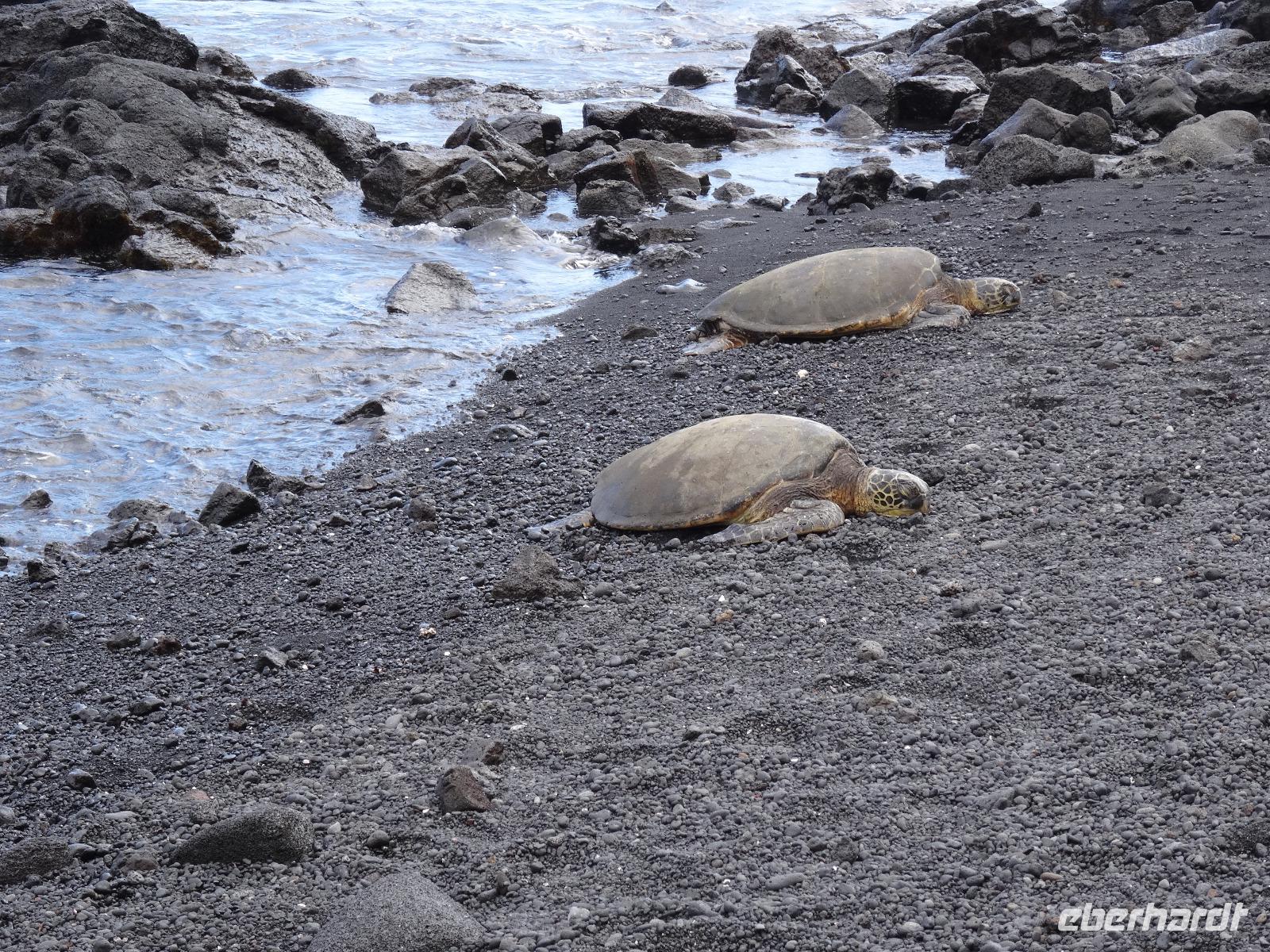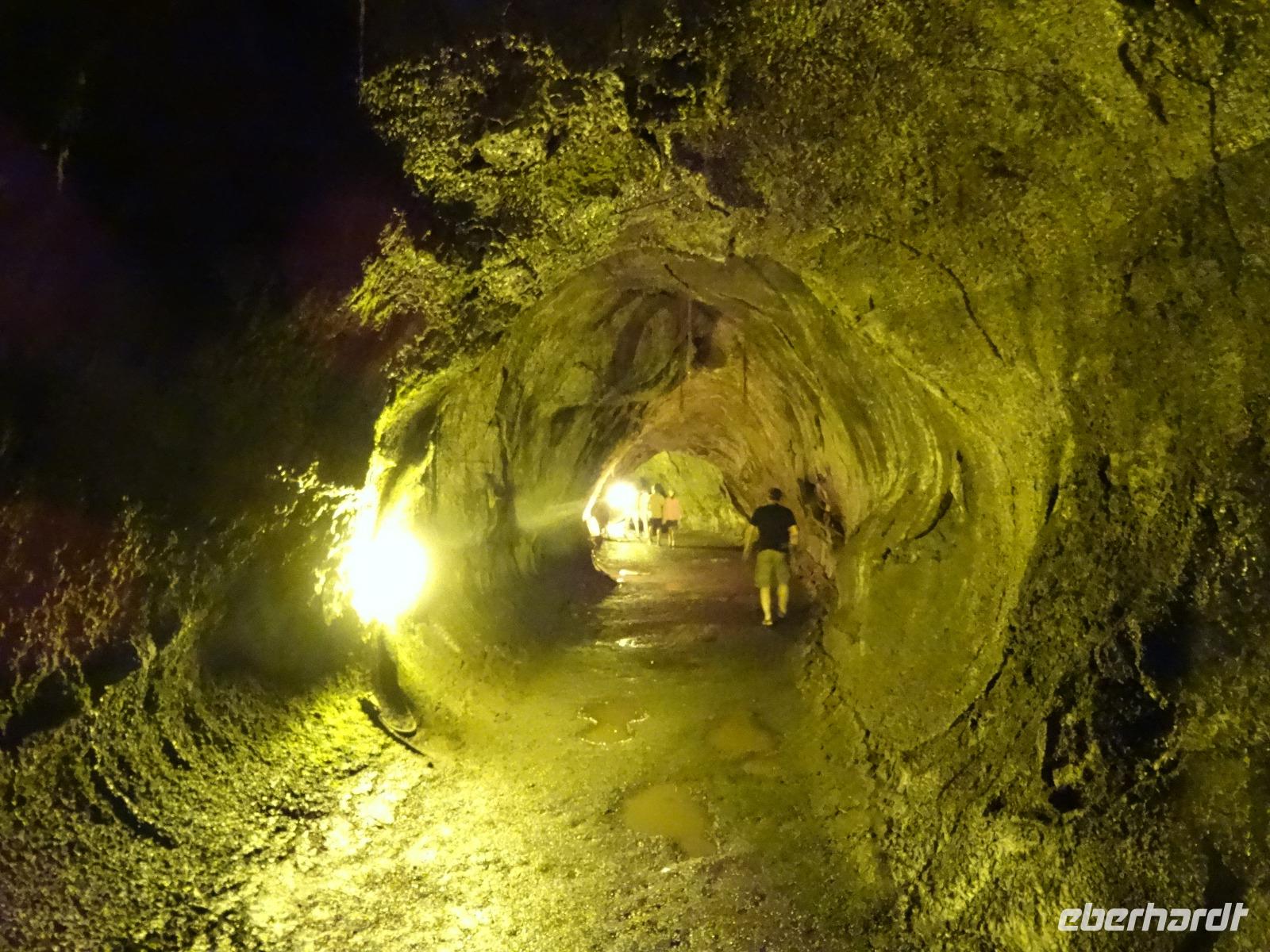 Nach einem sehr reichhaltigen Frühstück mit tollem Blick auf das azurblaue Wasser ging es heute auf Big-Island-Erkundungstour. Wir verließen Kona in nordwestlicher Richtung und fuhren an kleinen Lavafeldern vorbei, die meist gefährlich nahe an den wenigen Siedlungen gelegen waren. Obwohl wir uns auf der Insel mit den aktivsten Vulkanen der Welt befanden, schien das den hier lebenden knapp 180.000 Einwohnern keine Angst zu machen; im Gegenteil, Bewohner solcherart gefährlicher Hotspots haben ein jahrhundertealtes Urvertrauen in die natürliche "Rechtschaffenheit der Elemente". Leider hatte das Element Wasser am heutigen Morgen die Oberhand, so dass wir uns auf unserer Fahrt von tiefen Wolken, Nebel und leichtem Sprühregen begleitet sahen. Das sollte sich zwar im Laufe des Tages immer mal wieder ändern, verwehrte uns aber größtenteils die Blicke auf die beiden beherrschenden Vulkane Mauna Loa und Mauna Kea. Während wir ersteren während unserer gesamten Inselumkreisung nie richtig zu Gesicht bekamen, konnten wir doch wenigstens den Mauna Kea, den 4241 Meter hohen erloschenen Vulkan, von der einen oder anderen Stelle aus aufs Foto bannen. Je nördlicher wie kamen, desto spärlicher wurden die Lavazungen, dafür nahm das nutzbare Ranchland zu. Auf unserem Weg nach Waimea durchquerten wir die riesige Parker Ranch, eine der größten Viehzuchtbetriebe in den USA und seit 1847 Heimat der Paniolos, der hawaiianischen Cowboys. Zwischendurch machten wir eine kleine Pause im Parker-Ranch-Center, wo es neben diversen Restaurationen vor allem Cowboy-Utensilien und Merchandising-Artikel zu kaufen gab. Der Highway 19 führte uns dann weiter über Honoka'a die Hamakua Küste entlang. Obwohl sich jetzt auch ab und an die Sonne zeigte, lag der Mauna Kea von Nordosten betrachtet größtenteils im Nebel oder war durch tiefhängende Wolken nicht zu sehen. Ungeachtet dessen durchfuhren wir am späten Vormittag die nach Inselmaßstäben größere Stadt Hilo, bevor wir um die Mittagszeit in der Nähe des Volcanoes National Park im Lava Rock Café unsere Lunchpause bei typisch amerikanischem, aber durchaus schmackhaften Essen einlegten. Solcherart gestärkt konnten wir uns nun auf die nachfolgenden Besichtigungen im Nationalpark freuen. Zuvor hielten wir aber noch kurz an der Akatsuka Orchideen Farm, wo eine Vielzahl wunderbarer Orchideen im sogenannten Orchid Maze ausstellt wurden, der gegen ein kleines Entgelt betreten werden konnte und dem interessierten Besucher eine große Artenvielfalt offerierte. Nach der Einfahrt in den Vulcanoes National Park passierten wir die Steam Vents, wo heißer Dampf aus Löchern im Boden emporsteigt und hielten anschließend am Observatorium und Jagger Museum, von wo aus man einen fantastischen Blick auf den Kilauea Krater hatte, dem derzeit aktivsten Vulkan der Welt. Dampfschwaden stiegen aus dem flachen Krater empor und mit bloßem Auge war die brodelnde Lava zu erkennen, so dass allenthalben die Hobbyfotografen ihrem Handwerk nachgingen. Auch wenn es sich nur um kleine, nicht sehr hohe Eruptionen handelte, war es doch ein unvergessliches Schauspiel, was sich unseren Augen bot. Zumal diese "Eruptiönchens" am Kilauea bereits seit 1983 andauerten. Die nächsten Stopps am erkalteten Lavasee und an einem Lavafeld aus den neunzehnhundertsiebziger Jahren führten uns den Nachlass der alles verschlingenden Gewalt von fließender Lava eindrucksvoll vor Augen. Zurück im Bus, erreichten wir ein paar Meilen weiter die Lava Thurston Tube, einen etwa dreihundert Meter langen Lavatunnel. Um zum Tunnel zu gelangen, muss man durch einen dichten, urzeitlichen Farnwald spazieren, der an einigen Stellen von Feuchtigkeit und diffusem Zwielicht geprägt ist. Ein bisschen wie Jurassic Park, nur ohne Raptoren. Hofften wir zumindest... Lavatunnel entstehen durch das erkalten der äußeren Lavaschicht, während sich die darunter liegende Lava weiterbewegt. Die äußere, bereits verfestigte Lavaschicht kann dabei große Flächen bedecken und durch das Ausbleiben von neuem, fließendem Lavamaterial zur Bildung von solchen Hohlräumen beitragen. Beim Durchschreiten des Lavatunnels musste man trotzdem unwillkürlich an menschliche Einflussnahme denken, denn die Röhre sah ziemlich "geformt" aus, so wie man das auch aus Bergwerksschächten kennt. Aber wir wollen Mutter Natur in diesem Fall keine menschliche Hilfe unterstellen, sondern glaubten an die natürliche Genesis. Anschließend verließen wir den Nationalpark wieder und begaben uns zum Punalu'u Black Sand Beach, einem, wie der Name schon sagt, schwarzsandigen Strandabschnitt im Süden der Insel. Hier befand sich auch ein Refugium der hawaiianischen grünen Seeschildkröte, von welchen wir zwei stattliche Exemplare am Strand in der Sonne liegend sahen. Auf unserem nachfolgenden Heimweg entlang der Südküste hielten wir noch in dem kleinen Örtchen Na'alehu, um im Punalu'u Bake Shop, der südlichsten Bäckerei der USA, Sweetbread, die Spezialität des Hauses zu kosten. Sweetbread, unserem Milchbrötchen ähnlich, gab es in verschiedenen Geschmacksrichtungen. Ich kaufte zwei Brote und wir kosteten uns durch die Geschmacksrichtungen Apfel-Zimt (gefüllt) und Mango-Taro-Guave (farbenfroh). Lecker und Kalorienreich. Auf unserer Rückfahrt nach Kona hielten wir noch an einem alten Lavafeld von 1907 und Brigitte erklärte uns die Unterschiede zwischen Aa-Lava, welche spitz und scharfkantig ist und Pahoehoe-Lava, die glasige Oberflächen ausbildet. Mit viel neuem Wissen und tollen Bildern im Kopf erreichten wir am Abend unser Hotel und ließen den Tag bei einem Mai Tai, einer Pina Colada oder einfach einem kalten Bier zufrieden ausklingen.