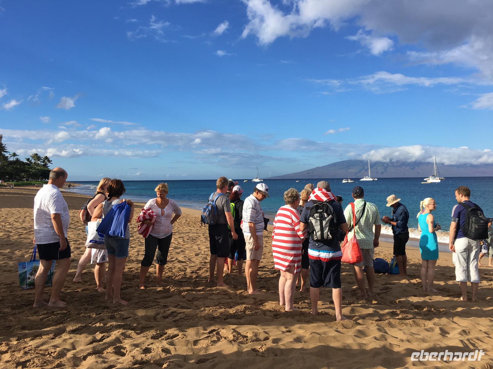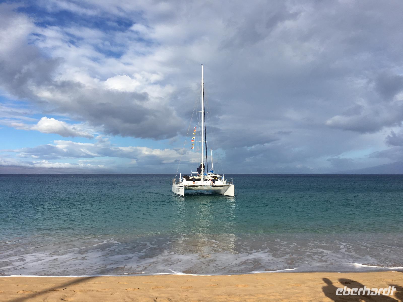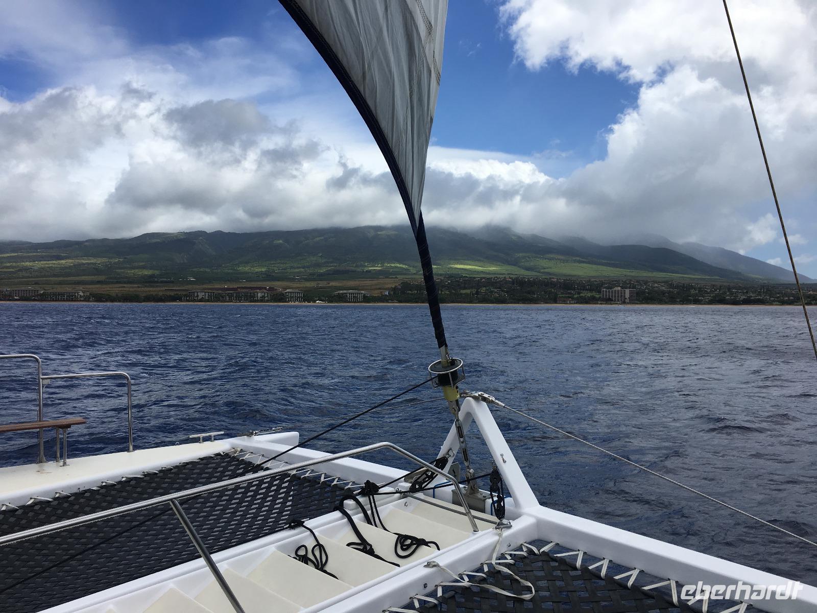 Der heutige Tag versprach jede Menge Spaß, Abenteuer und Unterhaltung. Los ging es mit einem zeitigen Spaziergang zur Katamaran-Basis, wo wir herzlich begrüßt und mit den Regularien an Bord vertraut gemacht wurden. Nach dieser Einweisung ging es einzeln an Bord der "Trilogy IV", einem Segelkatamaran, der für etwa 30 Personen Platz bot. Wir legten ab und fuhren zuerst mit Motorkraft die Küste entlang nach Norden. Das Wetter war noch ganz gut, allerdings zogen die ersten Regenwolken über den Bergen herauf. Wir genossen ein kleines zweites Frühstück an Bord und ließen uns den Wind um die Nase wehen. Welch ein herrliches Gefühl, mit einem Katamaran über die See zu gleiten und die wunderbare Küstenlinie vorbeieilen zu sehen ! Dazu schien (noch) die Sonne und wir waren voller Vorfreude auf die kommenden Schnorchelerlebnisse. Die ersten Regentropfen fielen vom Himmel, als wir wenig später in einer kleinen Bucht vor Anker gingen und uns auf den Schnorchelgang vorbereiteten. Wir streiften uns Neoprenoberteile über, zogen Flossen, Schnorchel und Brille an und ab ging es ins Wasser. Wir schwammen über ein kleines Riff und sahen einzelne bunte Fische unter uns durchschwimmen. Später kamen einzelne Korallenbänke in Sicht und damit nahm auch die Fischvielfalt zu. Einige aus unserer Gruppe hatten eine Begegnung mit einer grünen Seeschildkröte, die in Reichweite ihre ruhigen Bahnen zog. Auch wenn unser hawaiianischer "Unterwasserabenteuerplatz" nicht mit den Schnorchelparadisen im Roten Meer oder am Great Barrier Riff verglichen werden konnte, hatten wir trotzdem großen Spaß beim Erkunden der Unterwasserfauna und -flora. Zurück an Bord ließen wir uns ein kräftiges Mittagessen schmecken, bevor wir es uns mit kühlen Getränken am Bug des Katamarans gemütlich machten. Für die Rückfahrt wurden die Segel gesetzt und wir bewegten uns mit der Kraft des Windes die Küste entlang nach Süden. Leider ließ uns der jetzt immer wieder einsetzende Regen permanent zwischen Ober- und Unterdeck pendeln, der guten Stimmung tat das aber keinen Abbruch, zumal wir immer noch warme Temperaturen hatten. Zurück in Ka'anapali nutzten wir den zeitigen Nachmittag zum ausgiebigen Baden, Sonnen oder Relaxen, soweit es das wechselhafte Wetter zuließ. Am Abend bereiteten wir uns auf ein folkloristisches Luau vor, ein hawaiianisches Fest mit Hulatänzen und traditionellem Essen. Dabei wird bereits am Morgen ein geschlachtetes Schwein in Bananen und Ti-Blätter eingewickelt und in einem sogenannten Erdofen gebacken. Das ist eine ausgehobene Vertiefung mit heißen Steinen, auf welche man dann das Schwein legt und mit Erde bedeckt. Nach reichlich neun Stunden ist das Schwein dann fertig und kann verzehrt werden. Das Fleisch wird dabei zerkleinert und als eine Art Ragout serviert. Nachdem sich der Luau-Bereich mit den Gästen gefüllt hatte, wurde das Essen als Buffet serviert. Dabei kamen wir mit typischen hawaiianischen Speisen in Berührung, die man sonst als Tourist nicht kredenzt bekommt. Alles war sehr schmackhaft und abwechslungsreich. Kurze Zeit später begann dann das eigentliche Programm und wir wurden mit polynesischen Tänzen und hawaiianischer Musik bestens unterhalten. Leider ließ uns das Wetter zum Schluss der Veranstaltung im Stich, denn es fing wieder an zu regnen. Obwohl wir uns mit kurzfristig ausgeteilten Regencapes notdürftig schützen konnten, beeinträchtigte es doch die bis dato schöne Atmosphäre. So verwunderte es nicht, dass sich mit dem Schlussakkord der Festplatz in Windeseile leerte. Alles suchte Unterschlupf vor dem Regen. Trotz dieses etwas misslichen Ausgangs war es eine schöne Veranstaltung und ein ereignisreicher und lustiger Tag.