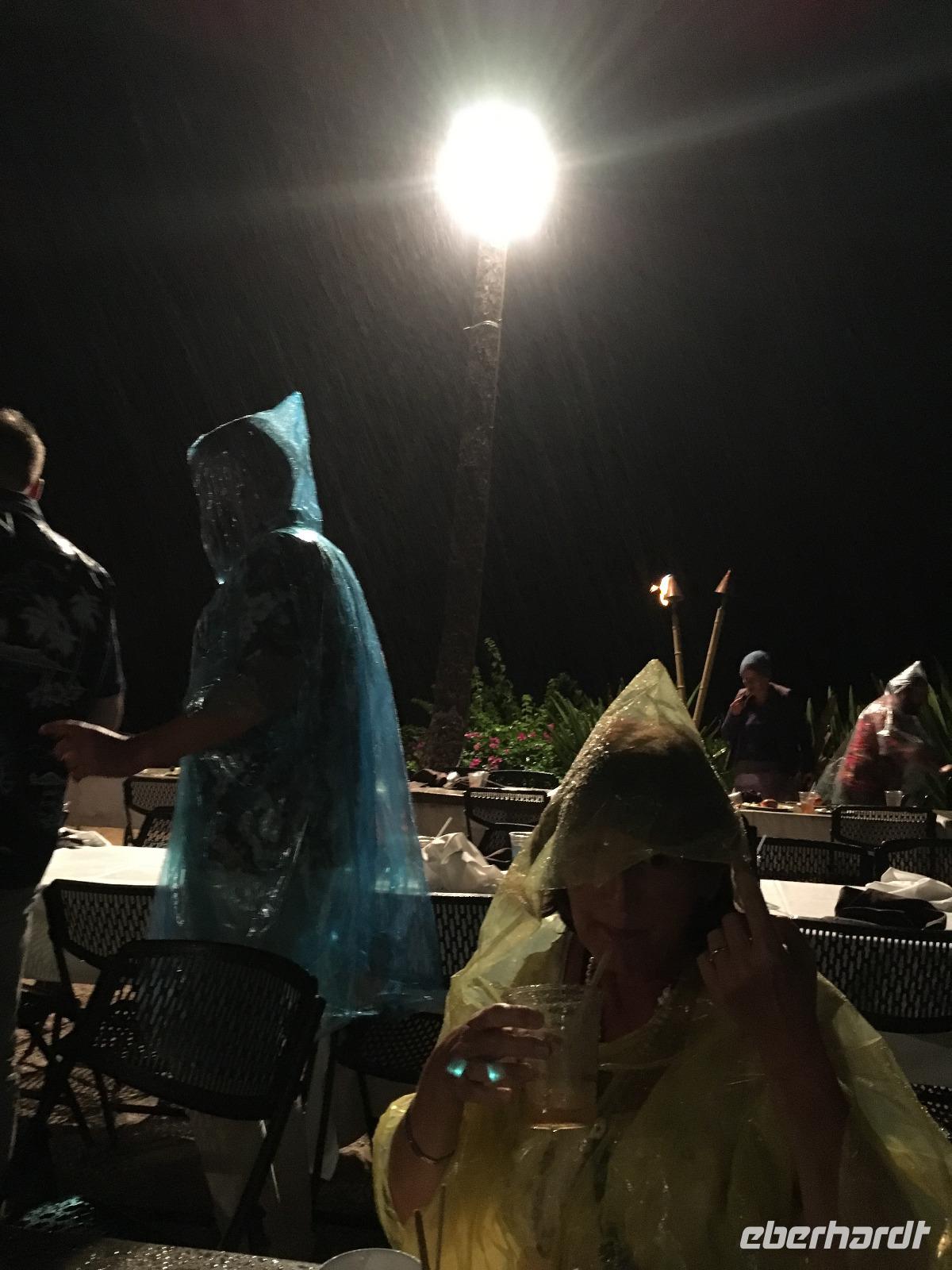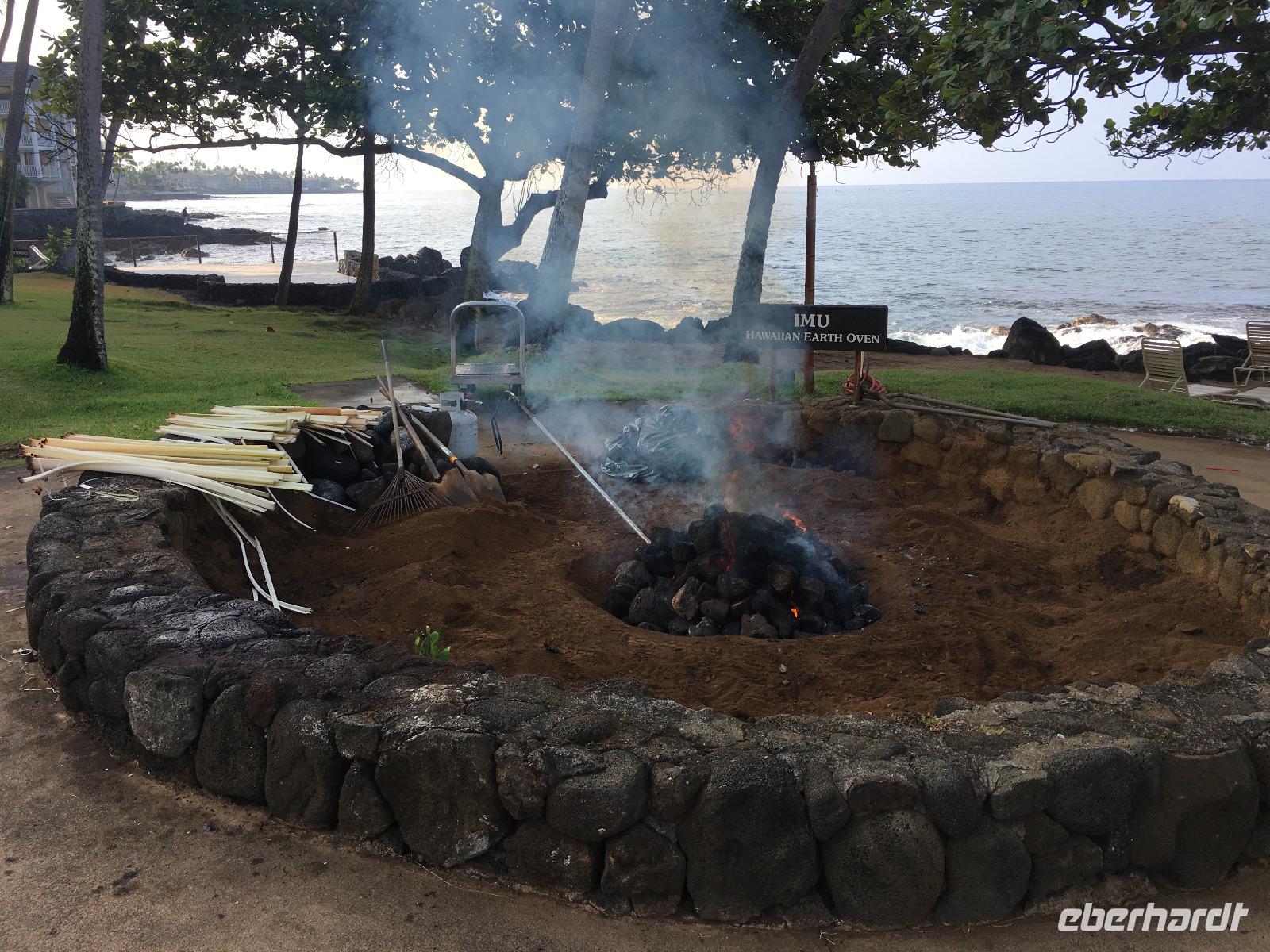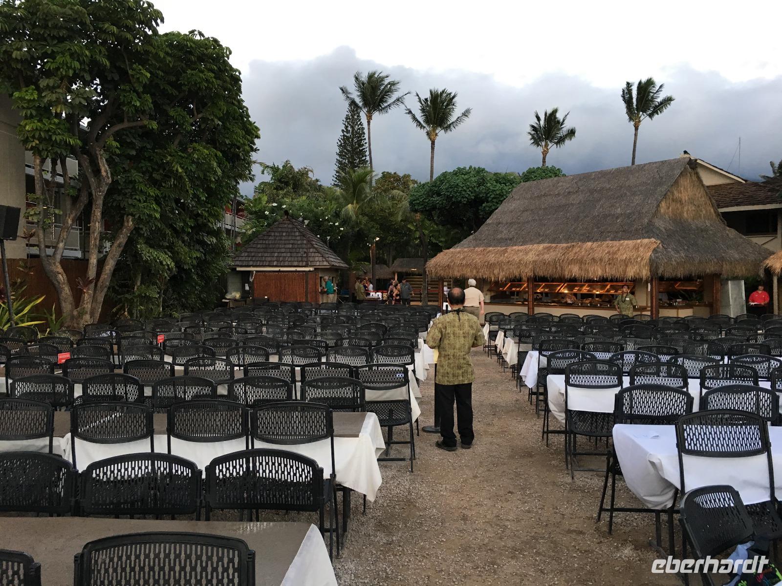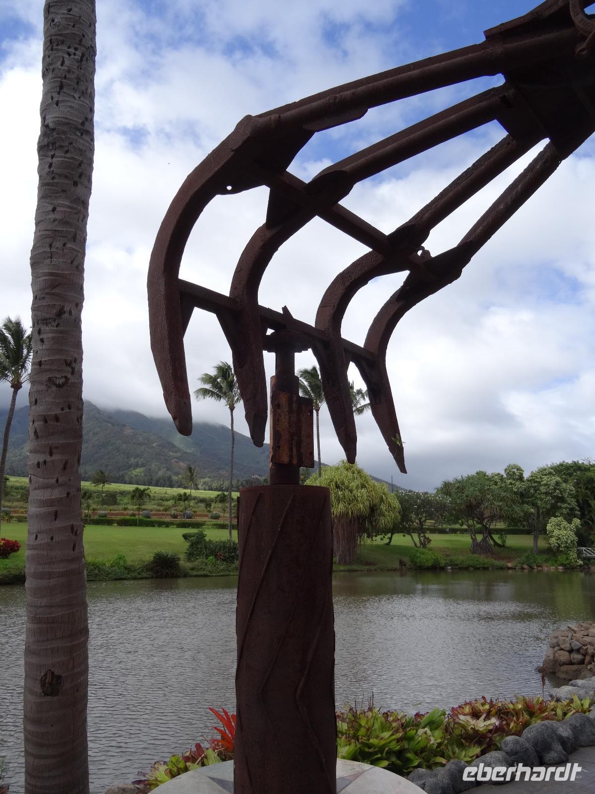 Der heutige Tag versprach jede Menge Spaß, Abenteuer und Unterhaltung. Los ging es mit einem zeitigen Spaziergang zur Katamaran-Basis, wo wir herzlich begrüßt und mit den Regularien an Bord vertraut gemacht wurden. Nach dieser Einweisung ging es einzeln an Bord der "Trilogy IV", einem Segelkatamaran, der für etwa 30 Personen Platz bot. Wir legten ab und fuhren zuerst mit Motorkraft die Küste entlang nach Norden. Das Wetter war noch ganz gut, allerdings zogen die ersten Regenwolken über den Bergen herauf. Wir genossen ein kleines zweites Frühstück an Bord und ließen uns den Wind um die Nase wehen. Welch ein herrliches Gefühl, mit einem Katamaran über die See zu gleiten und die wunderbare Küstenlinie vorbeieilen zu sehen ! Dazu schien (noch) die Sonne und wir waren voller Vorfreude auf die kommenden Schnorchelerlebnisse. Die ersten Regentropfen fielen vom Himmel, als wir wenig später in einer kleinen Bucht vor Anker gingen und uns auf den Schnorchelgang vorbereiteten. Wir streiften uns Neoprenoberteile über, zogen Flossen, Schnorchel und Brille an und ab ging es ins Wasser. Wir schwammen über ein kleines Riff und sahen einzelne bunte Fische unter uns durchschwimmen. Später kamen einzelne Korallenbänke in Sicht und damit nahm auch die Fischvielfalt zu. Einige aus unserer Gruppe hatten eine Begegnung mit einer grünen Seeschildkröte, die in Reichweite ihre ruhigen Bahnen zog. Auch wenn unser hawaiianischer "Unterwasserabenteuerplatz" nicht mit den Schnorchelparadisen im Roten Meer oder am Great Barrier Riff verglichen werden konnte, hatten wir trotzdem großen Spaß beim Erkunden der Unterwasserfauna und -flora. Zurück an Bord ließen wir uns ein kräftiges Mittagessen schmecken, bevor wir es uns mit kühlen Getränken am Bug des Katamarans gemütlich machten. Für die Rückfahrt wurden die Segel gesetzt und wir bewegten uns mit der Kraft des Windes die Küste entlang nach Süden. Leider ließ uns der jetzt immer wieder einsetzende Regen permanent zwischen Ober- und Unterdeck pendeln, der guten Stimmung tat das aber keinen Abbruch, zumal wir immer noch warme Temperaturen hatten. Zurück in Ka'anapali nutzten wir den zeitigen Nachmittag zum ausgiebigen Baden, Sonnen oder Relaxen, soweit es das wechselhafte Wetter zuließ. Am Abend bereiteten wir uns auf ein folkloristisches Luau vor, ein hawaiianisches Fest mit Hulatänzen und traditionellem Essen. Dabei wird bereits am Morgen ein geschlachtetes Schwein in Bananen und Ti-Blätter eingewickelt und in einem sogenannten Erdofen gebacken. Das ist eine ausgehobene Vertiefung mit heißen Steinen, auf welche man dann das Schwein legt und mit Erde bedeckt. Nach reichlich neun Stunden ist das Schwein dann fertig und kann verzehrt werden. Das Fleisch wird dabei zerkleinert und als eine Art Ragout serviert. Nachdem sich der Luau-Bereich mit den Gästen gefüllt hatte, wurde das Essen als Buffet serviert. Dabei kamen wir mit typischen hawaiianischen Speisen in Berührung, die man sonst als Tourist nicht kredenzt bekommt. Alles war sehr schmackhaft und abwechslungsreich. Kurze Zeit später begann dann das eigentliche Programm und wir wurden mit polynesischen Tänzen und hawaiianischer Musik bestens unterhalten. Leider ließ uns das Wetter zum Schluss der Veranstaltung im Stich, denn es fing wieder an zu regnen. Obwohl wir uns mit kurzfristig ausgeteilten Regencapes notdürftig schützen konnten, beeinträchtigte es doch die bis dato schöne Atmosphäre. So verwunderte es nicht, dass sich mit dem Schlussakkord der Festplatz in Windeseile leerte. Alles suchte Unterschlupf vor dem Regen. Trotz dieses etwas misslichen Ausgangs war es eine schöne Veranstaltung und ein ereignisreicher und lustiger Tag.