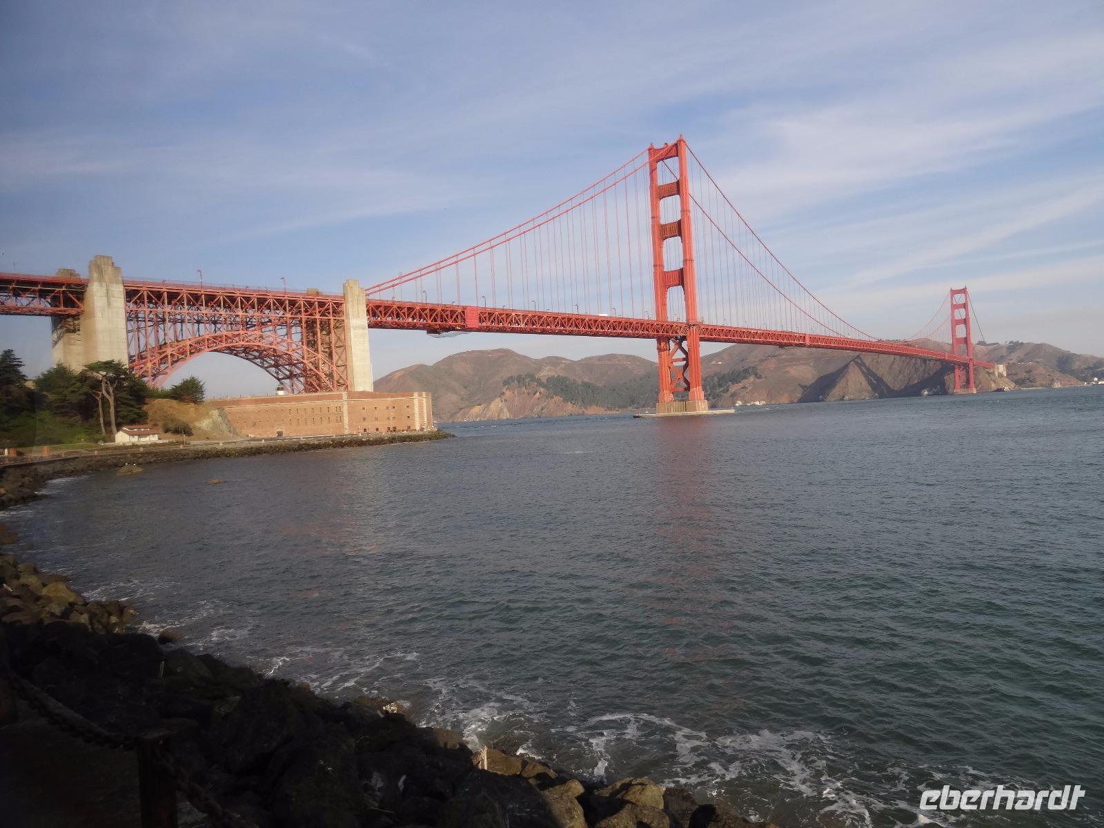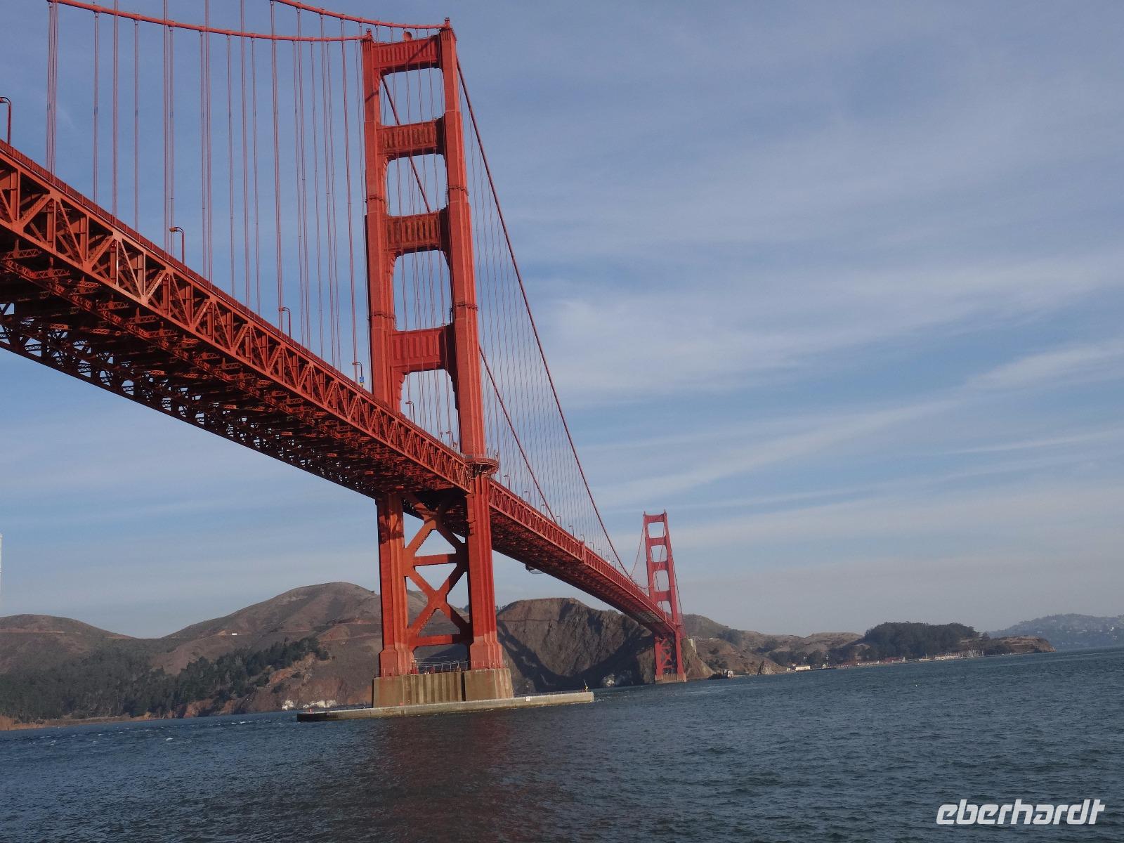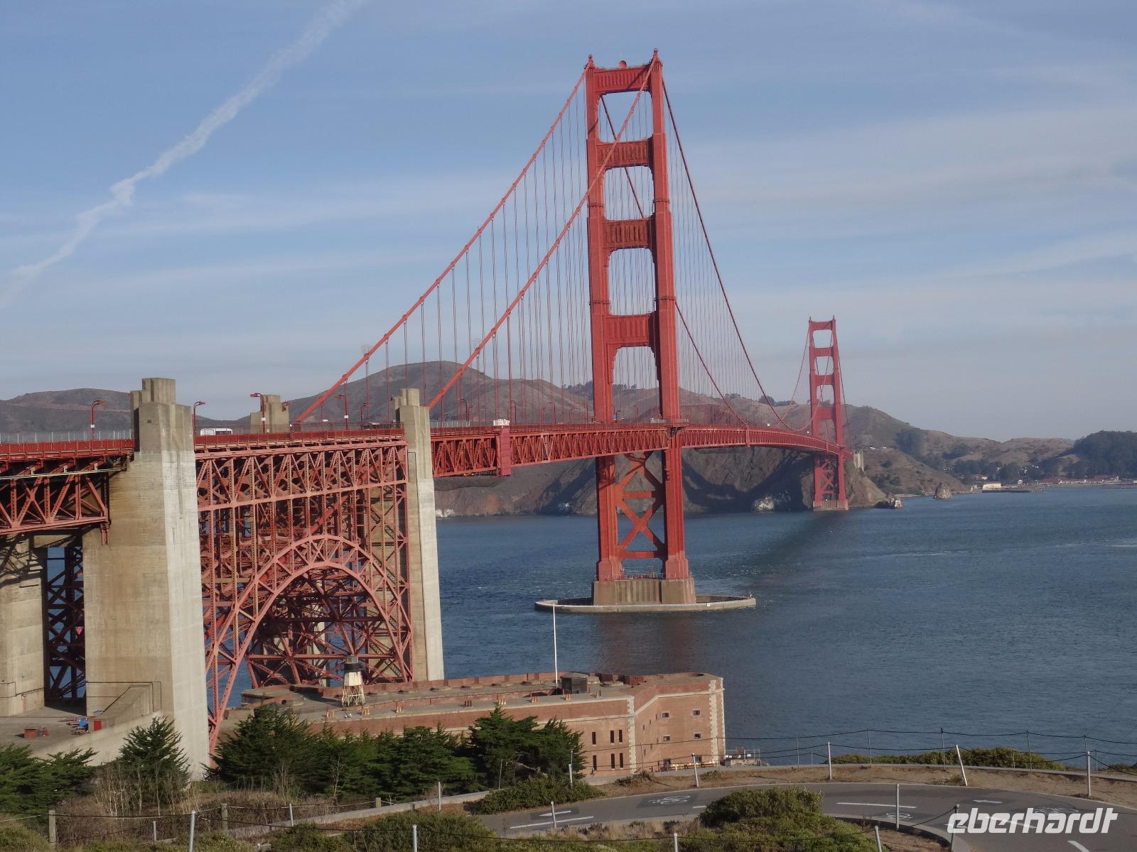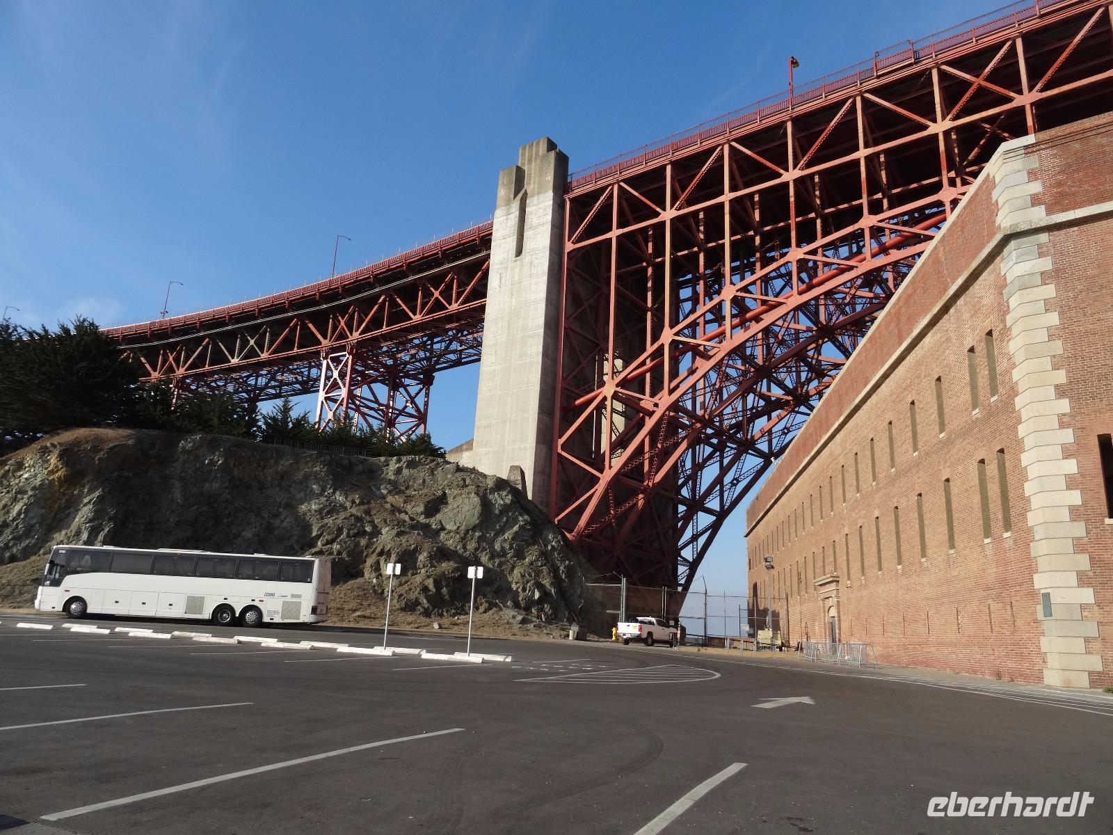 Alles begann gleich mit der sehnsüchtig erwarteten Golden Gate Bridge. Unser Busfahrer Dan brachte uns zunächst zum Fort Point Aussichtspunkt, welcher sonst Gäste in Bussen vorenthalten wird. Es folgten weitere Stopps mit immer wieder neuen Sichten und Fotomotiven auf das Wahrzeichen der Stadt. Natürlich war es ein Muss, einmal selbst die Füsse auf diese berühmte Brücke zu setzten und zu gehen. Einige Reisegäste taten dies sogar "in zerissenen Jeans" - der erste Traum wurde wahr...