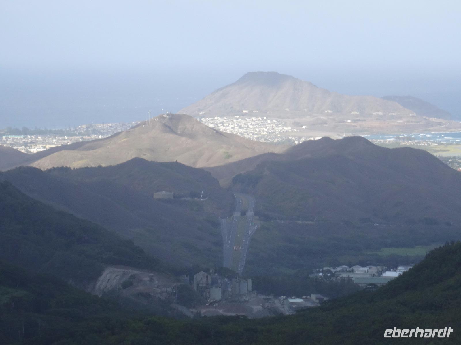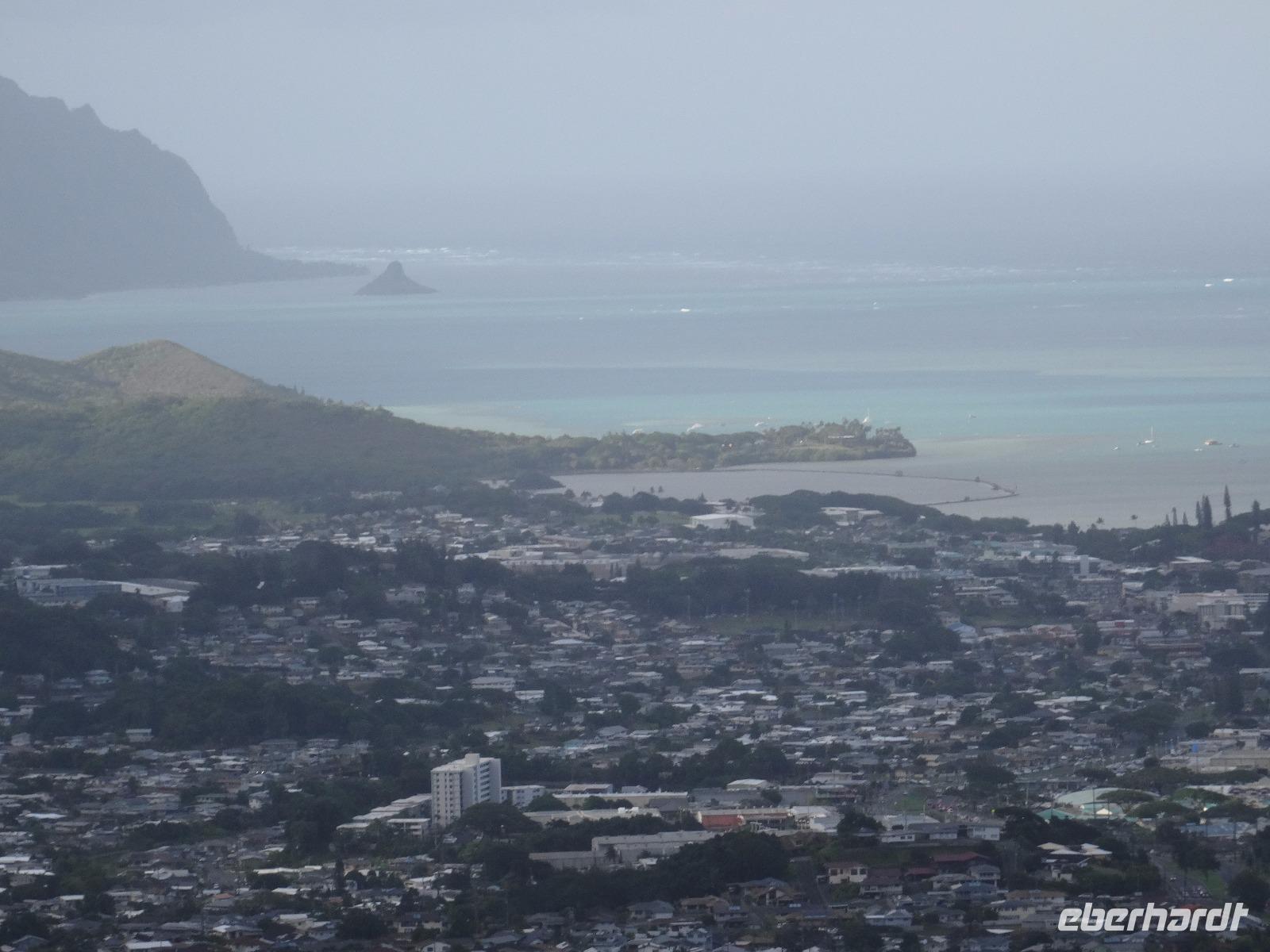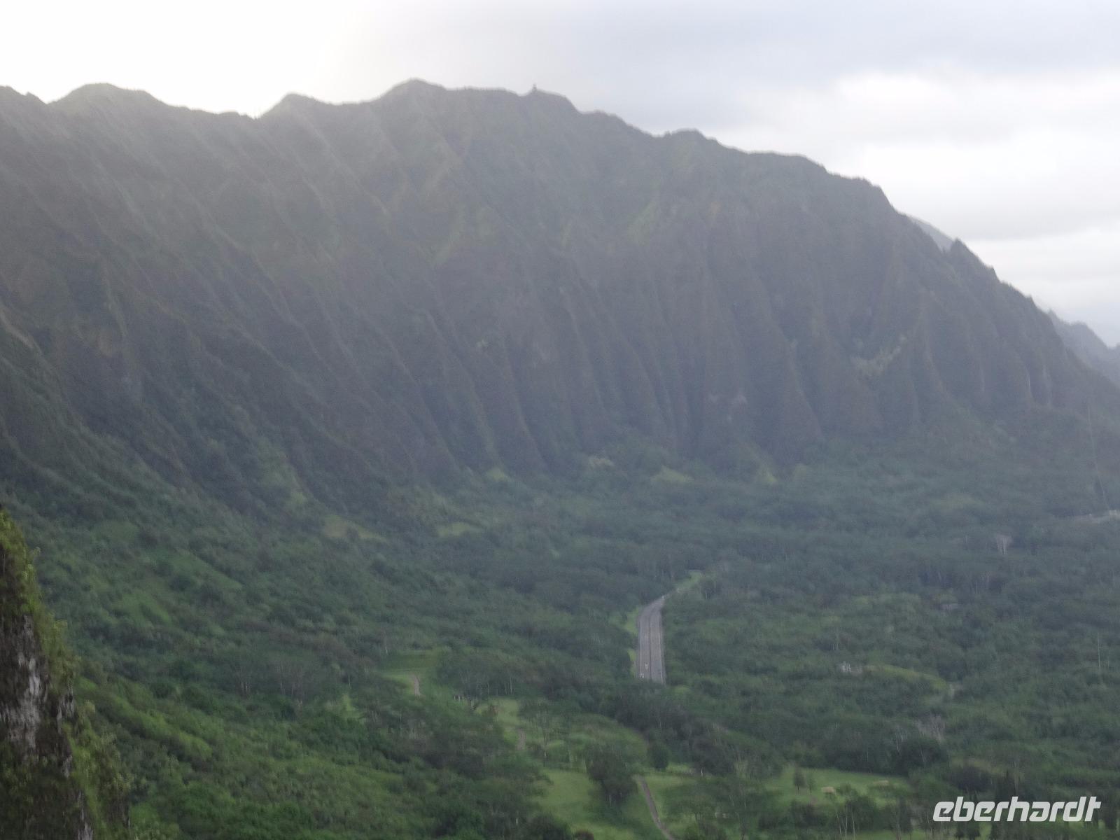 Zum Abschluß unserer Rundfahrt fuhren wir zum geschichtsträchtigen Nu'uanu Pali - Aussichtspunkt hinauf. Hier fand im Jahre 1795 die Schlacht von Nu'uanu statt. Diese gewann König Kamehameha I, nahm Ohau unter seinen Besitz und vereinte das Inselreich.