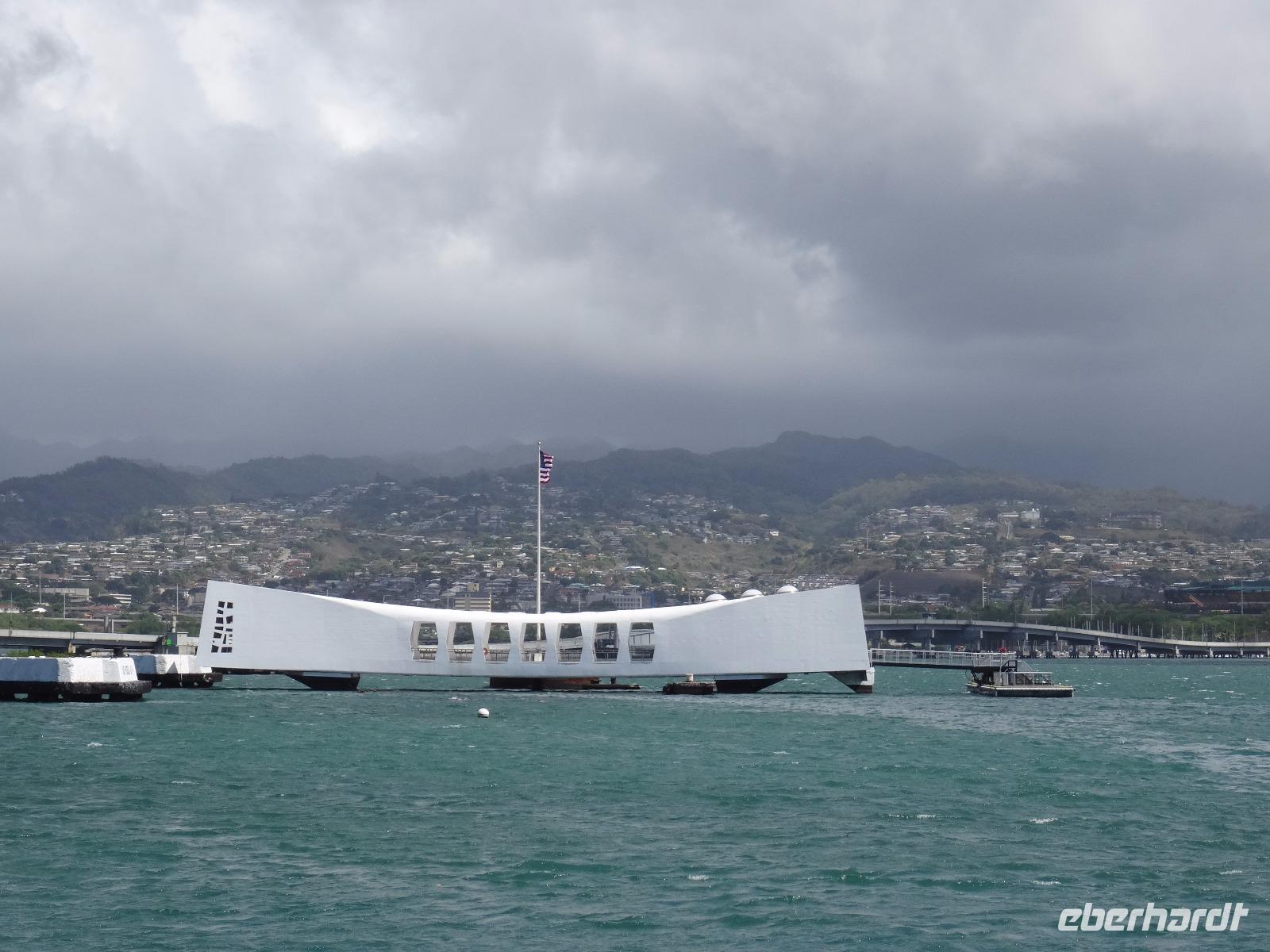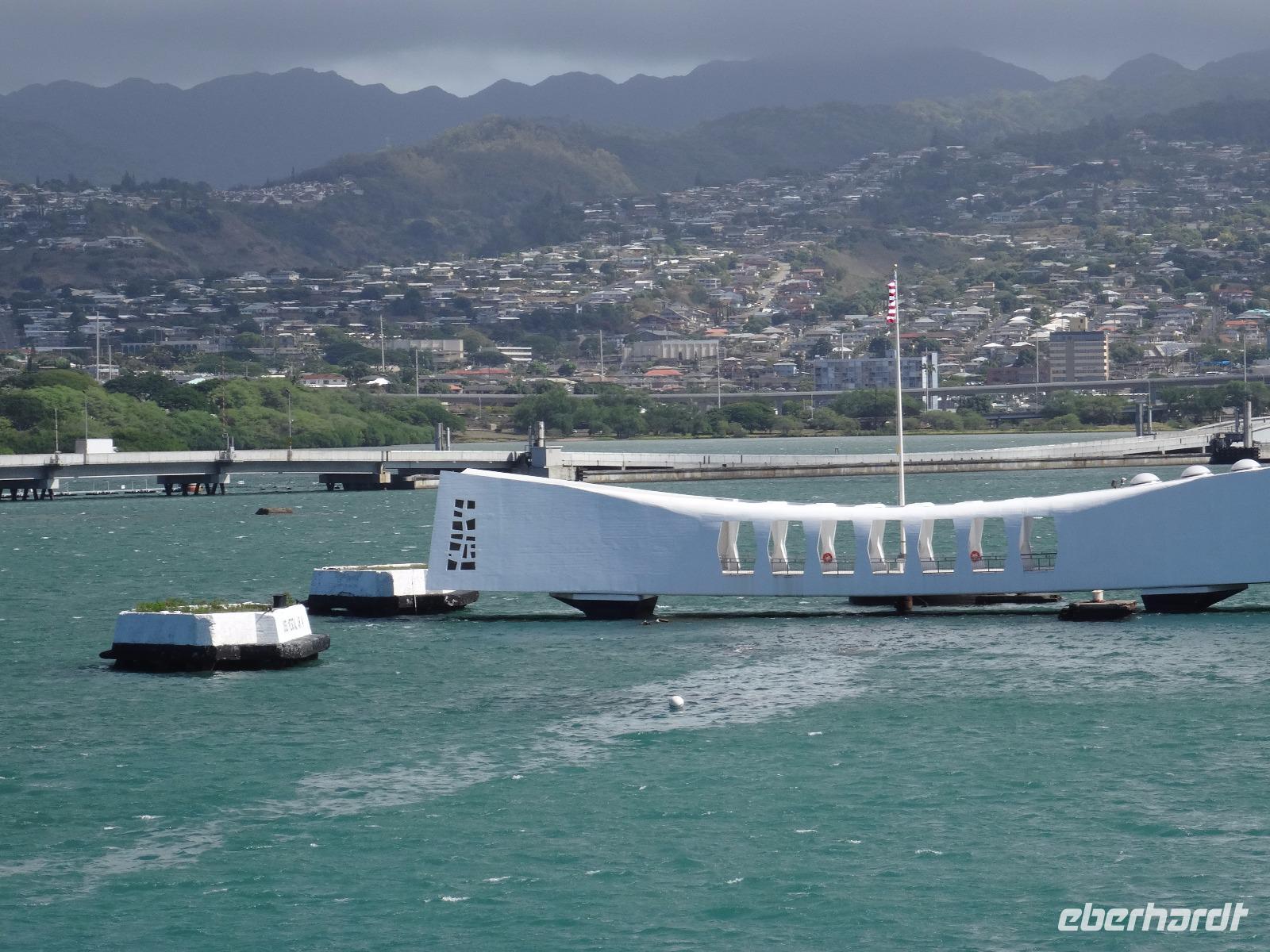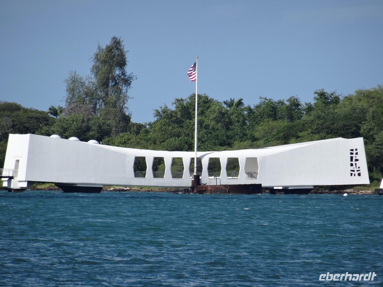 Dieses Denkmal überspannt den Rumpf des gesunkenen Schlachtschiffes. Noch heute kommen ständig Öltropfen an die Wasserüberfläche - die "Tränen der Arizona". Ein Ölfilm auf dem Wasser zeigt dies sehr deutlich.