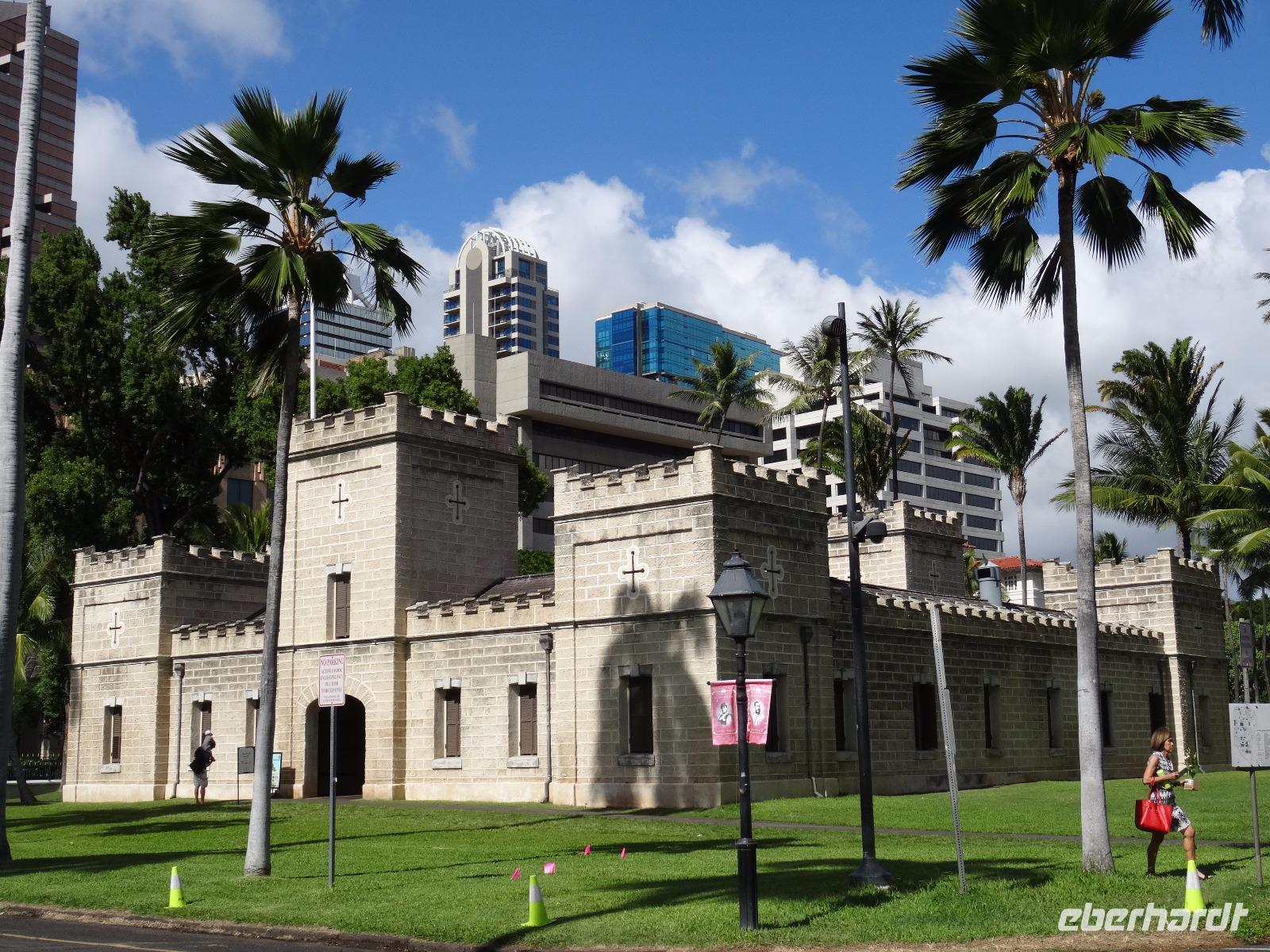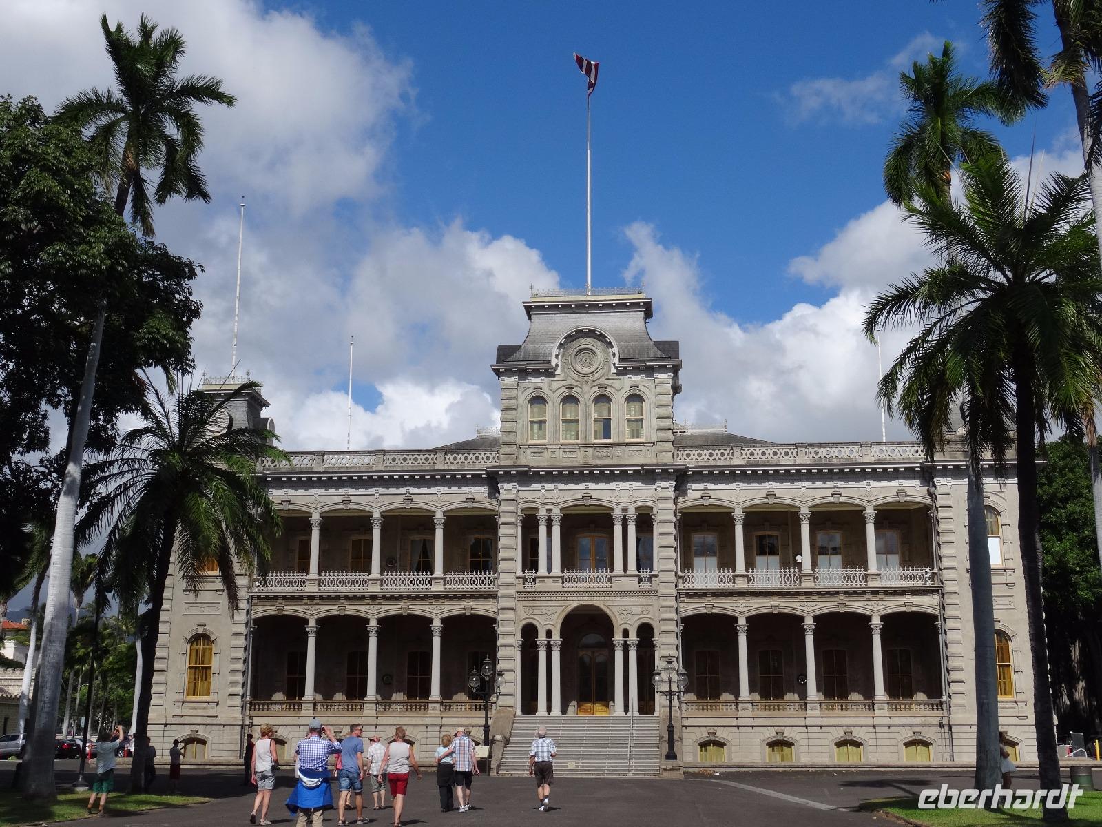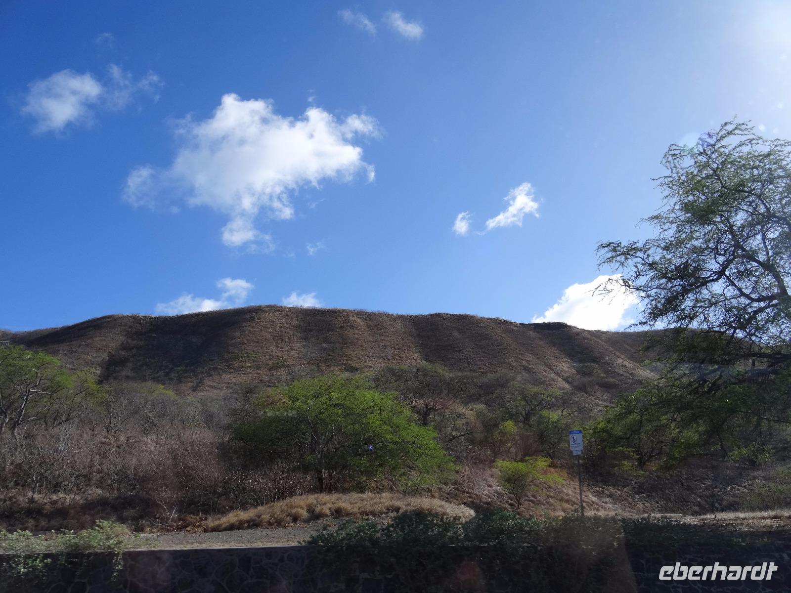 Mit dem Geschichtsunterricht ging es am Nachmittag weiter. Brigitte zeigte uns ein kleines Stück des alten Honululus- wobei alt nur ca. 100 Jahre bedeutet - mit dem Parlament, dem Iolani Palast -der ehemaligen Residenz der hawaiianischen Könige- sowie dem Denkmal König Kamehameha I. Vorbei an der ältesten Kirche Hawaii's, die aus Korallenblöcken erbaut wurde, fuhren wir nun zum Aussichtspunkt am Diamond Head. Hier bekamen wir einen malerischen Blick auf den Pazifik geschenkt.