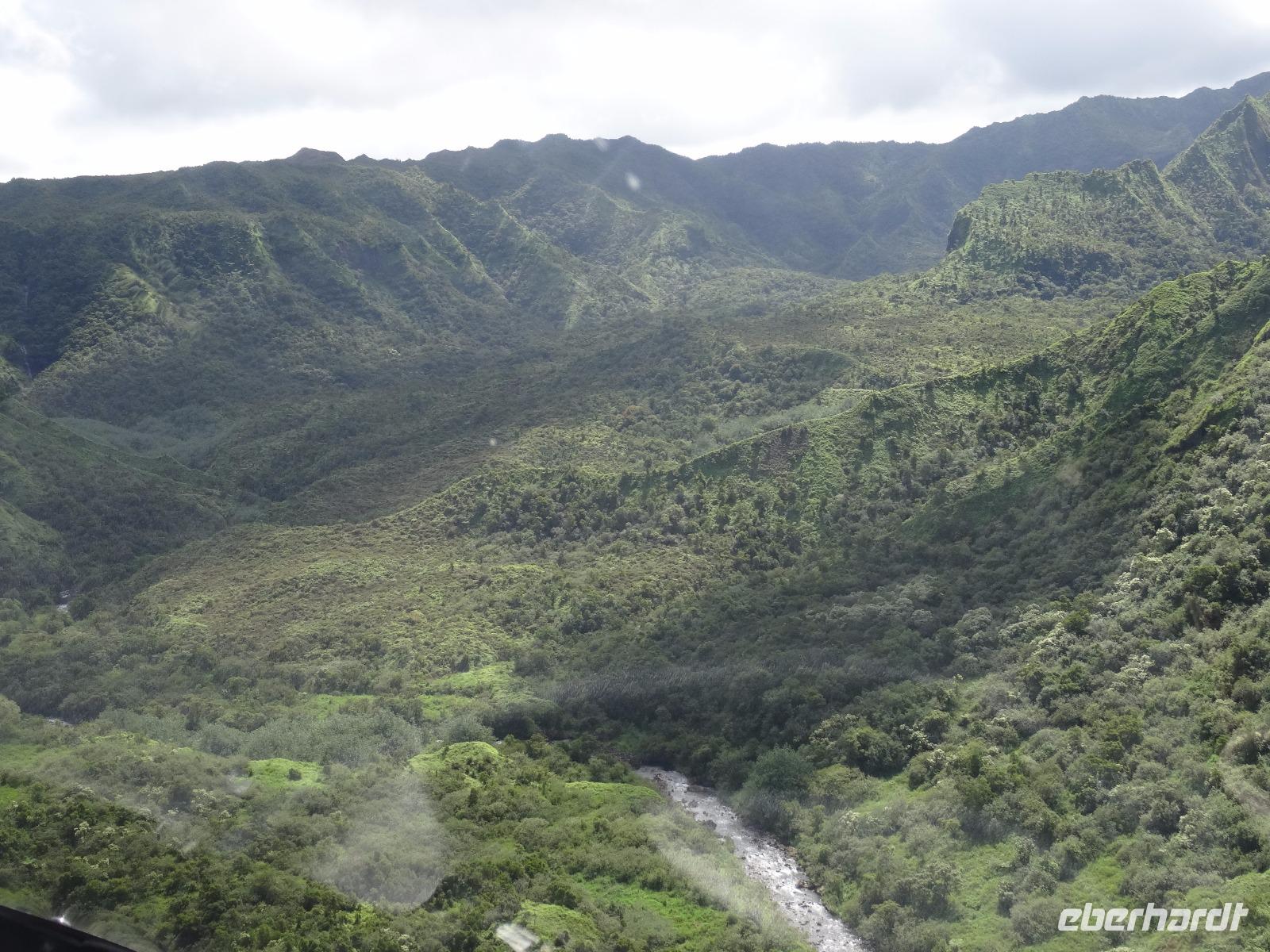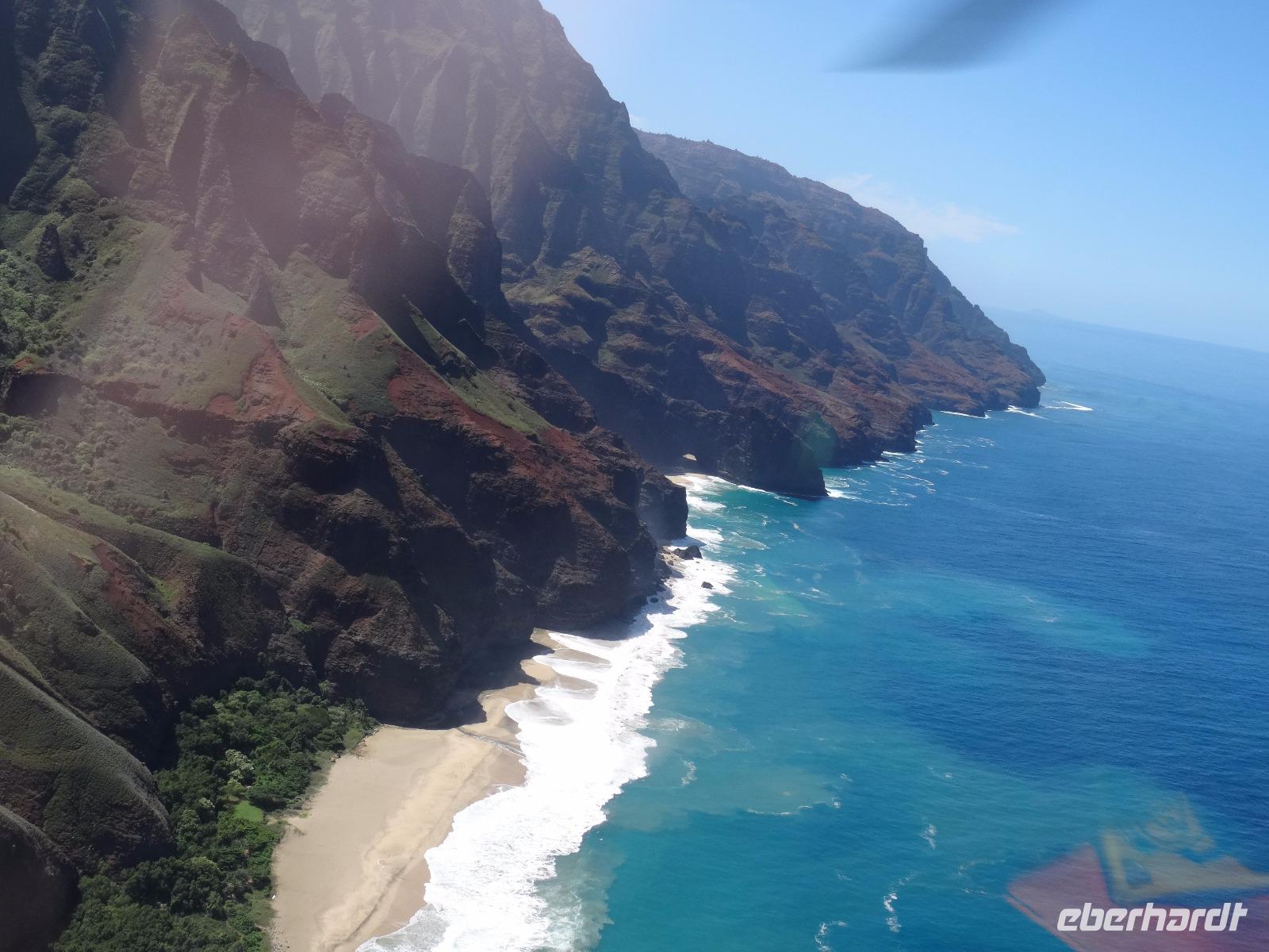 Der ca. einstündige Flug führte an die mystische Na Pali Küste, am Waialeade vorbei, durch den bizaren Waimea Canyon und das saftig- grüne Hanulei Valley, begleitet von passenden Filmmusiken aus Jurassic Park, King Kong und South Pazifik.