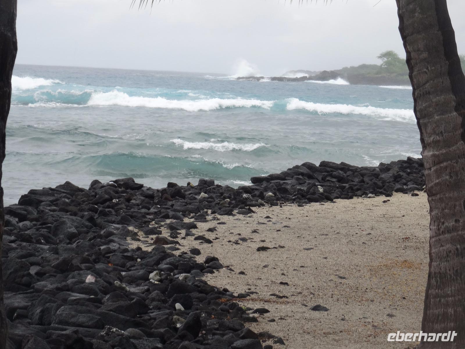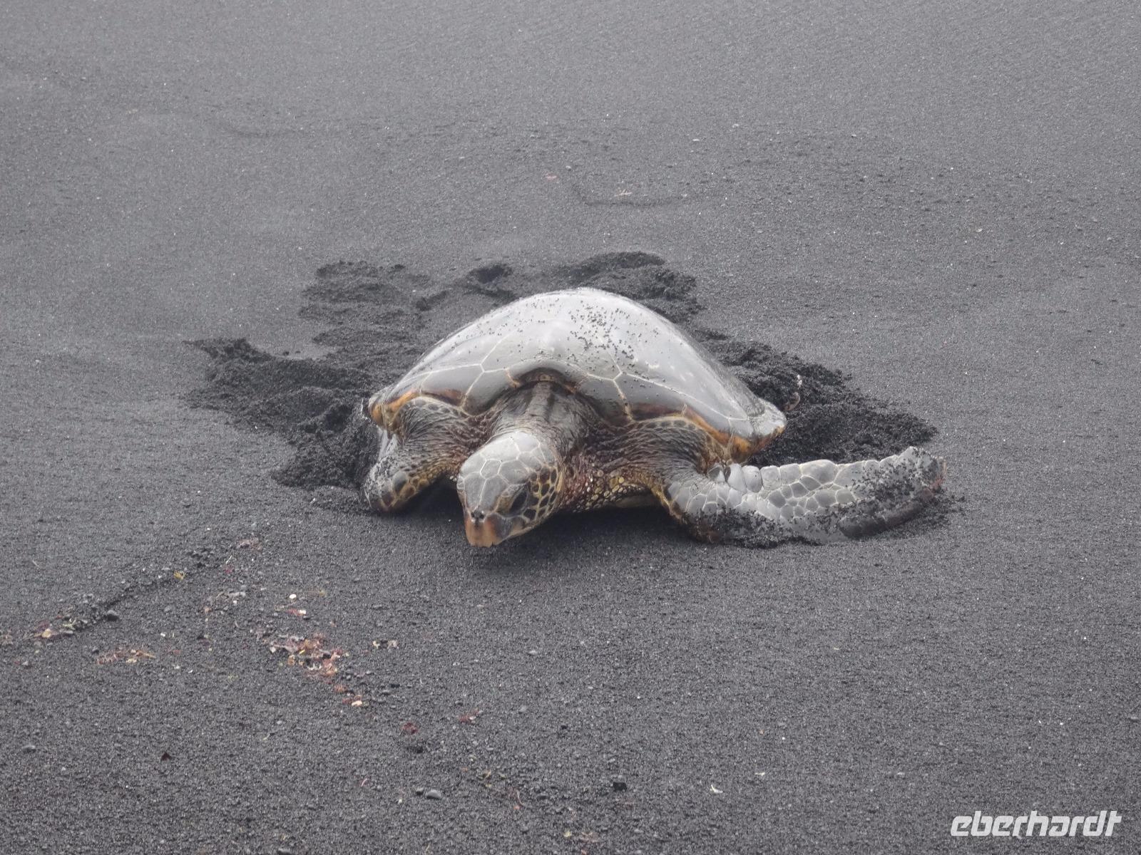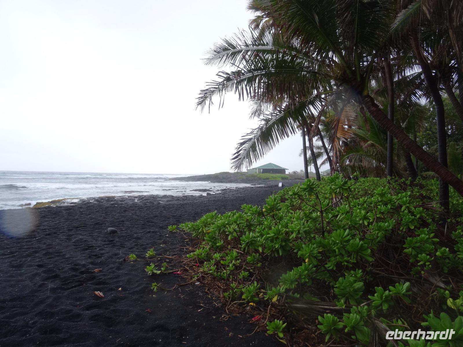 Danach suchten wir am schwarzen Strand bei Punalu'u nach Wasserschildkröten und wurden nur vereinzelt fündig. Denn die meisten zogen es wohl vor, bei diesem Wetter nicht " ihr Haus" zu verlassen. Wir konnten es ihnen nachvollziehen.