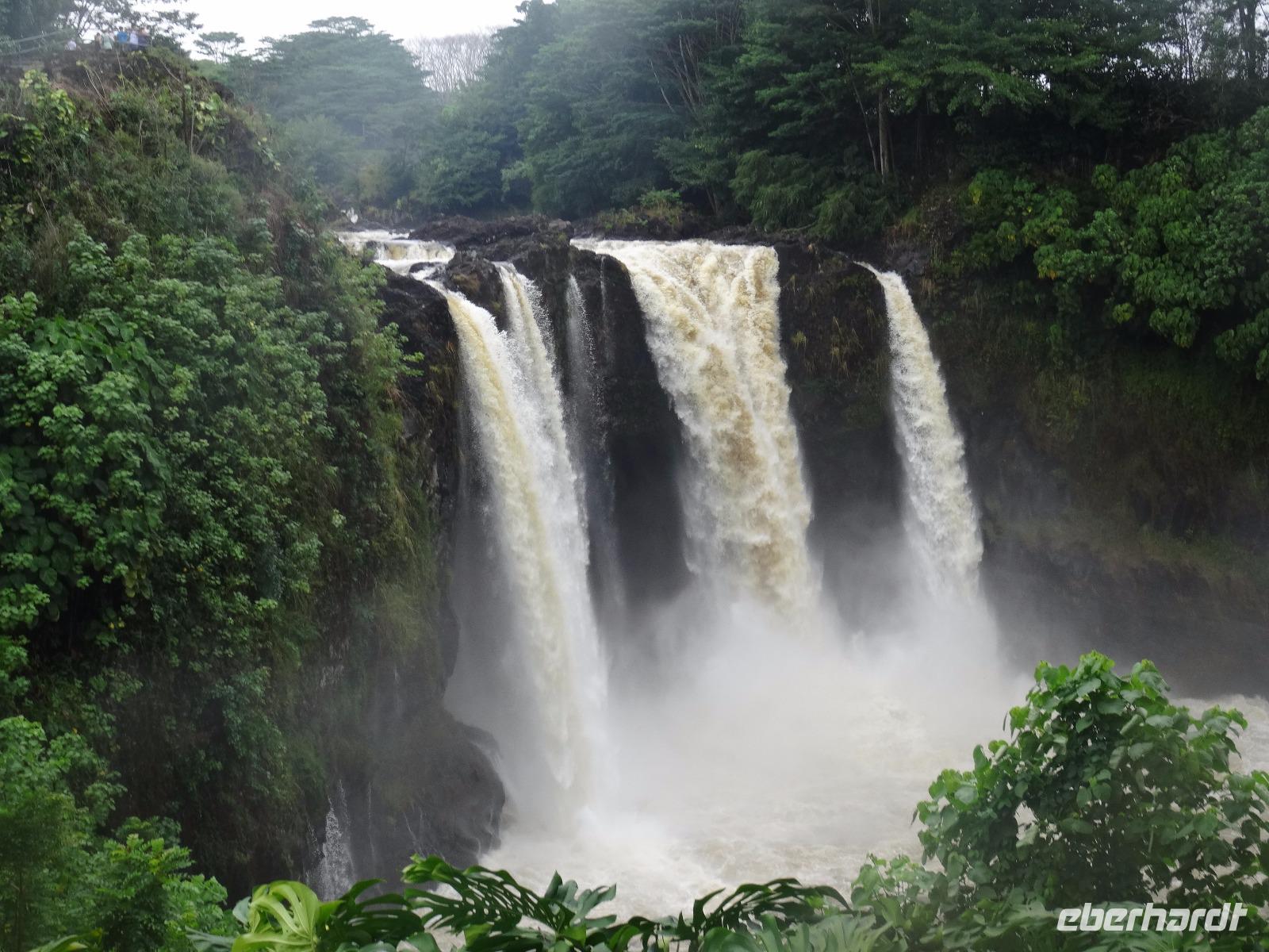 In der Nähe von Hilo machten wir dann Stopp an den "Rainbow Falls". Beeindruckend welche Wassermassen - bedingt auch durch den starken Regen- mit tosender Gewalt sich hier in die Tiefe stürzten.