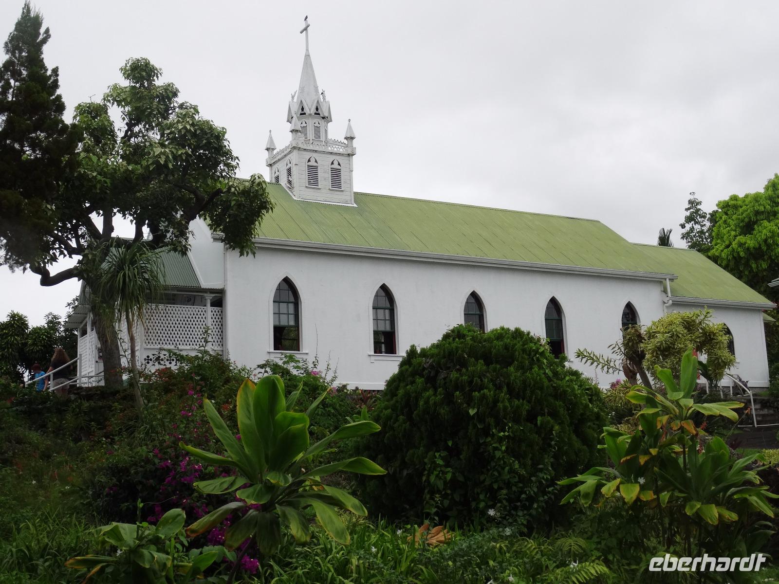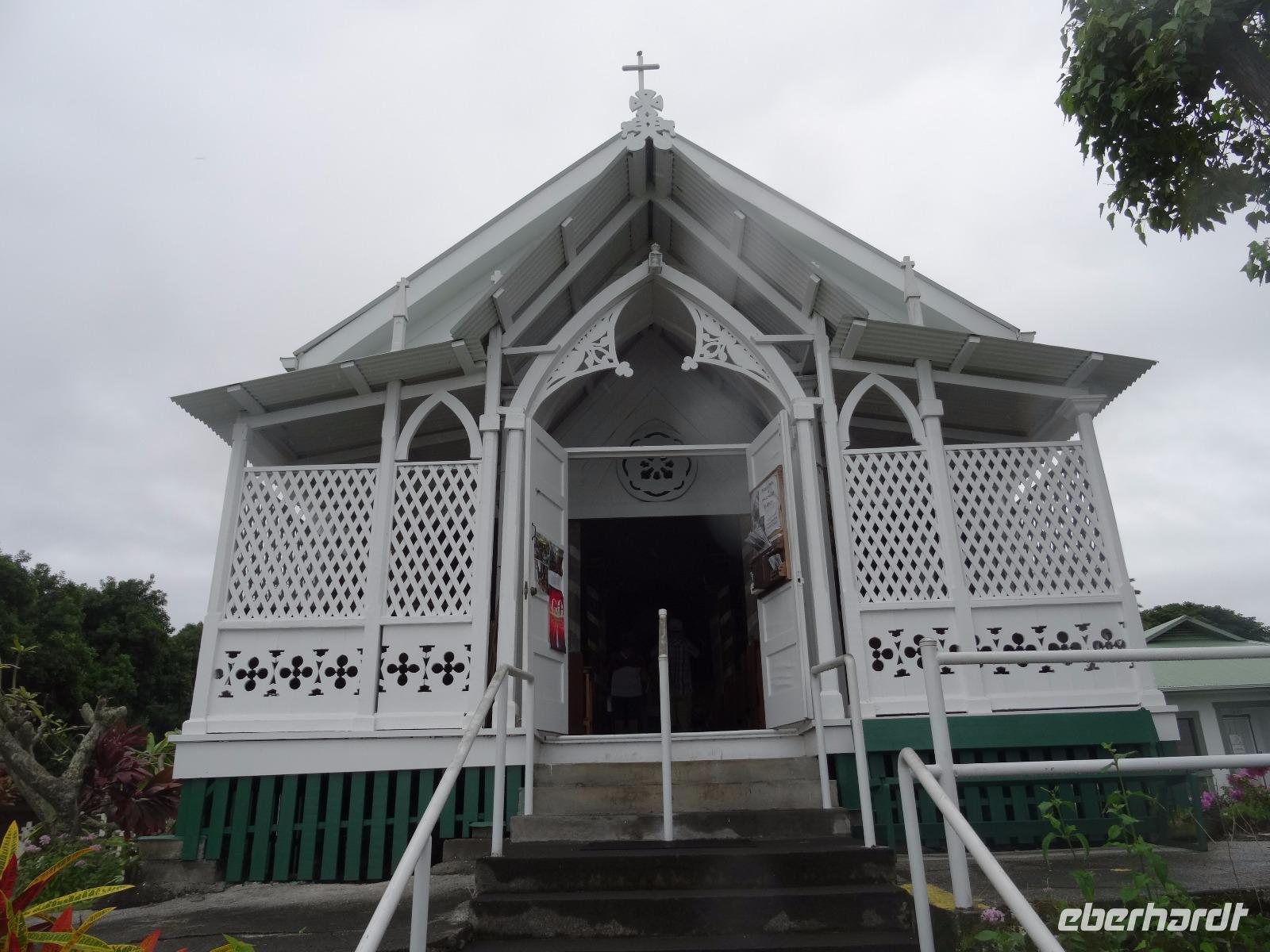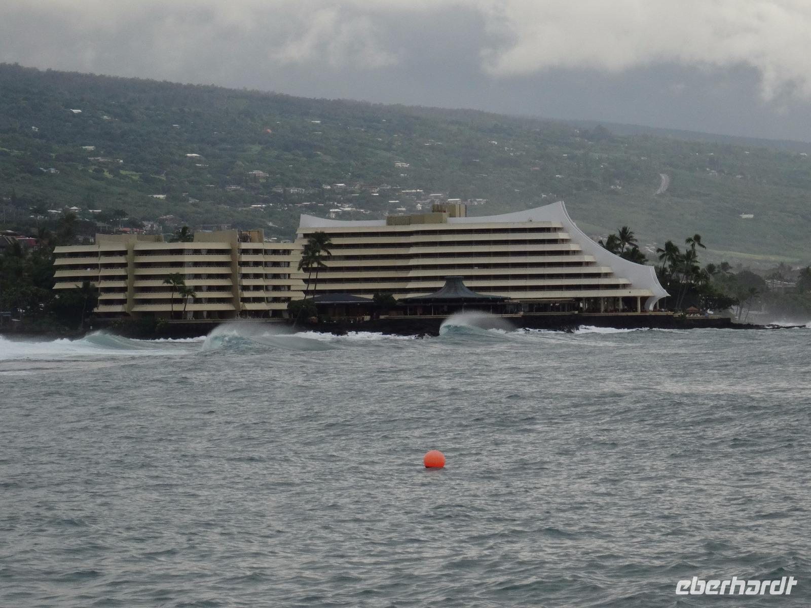 Wie schade, denn das Wetter hinderte uns an daran, einen ausführlichen Spaziergang über das Gelände zu machen. Einerseits waren die strandnahen Bereiche wegen des starken Wellenganges gesperrt und anderseits führte infolge des Starkregens ein Laufen buchstäblich "ins Wasser". Deshalb informierte uns Brigitte unter einer "trockenen Zufluchtsstätte" ausführlich über die damalige Lebensweise und den Gottesglauben. Daran anknüpfend besuchten wir noch zusätzlich die Ausstellung zur Historie der Polynesier im "King Kamehameha" - Hotel in Kona.