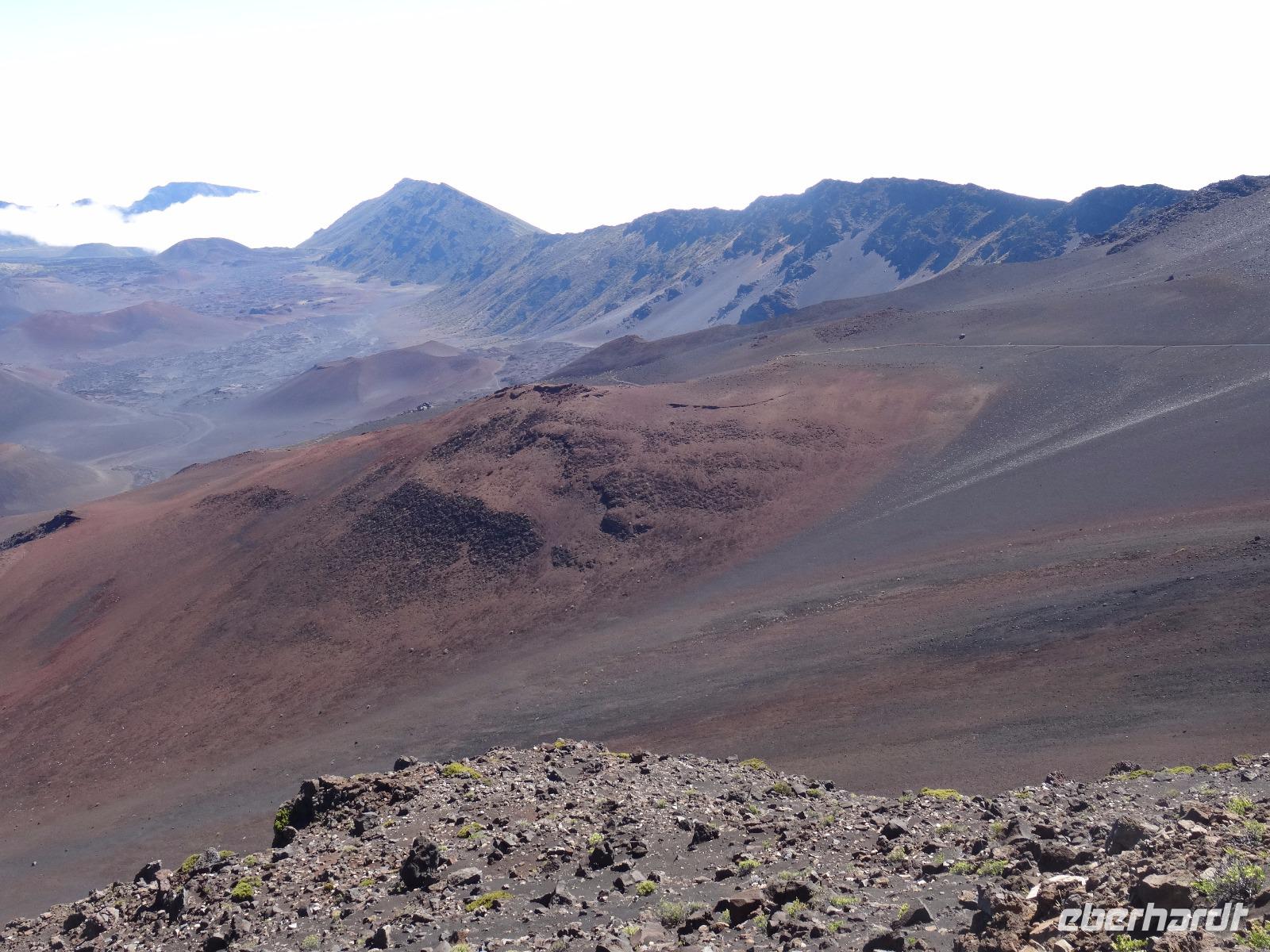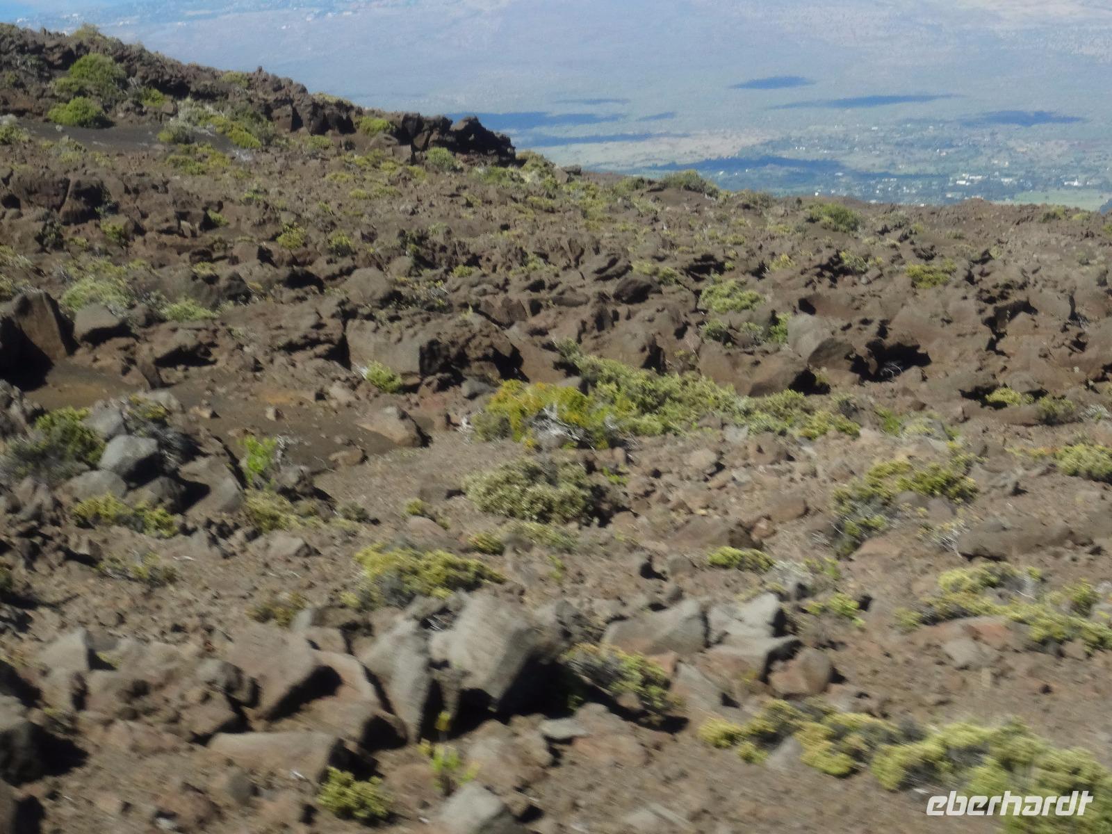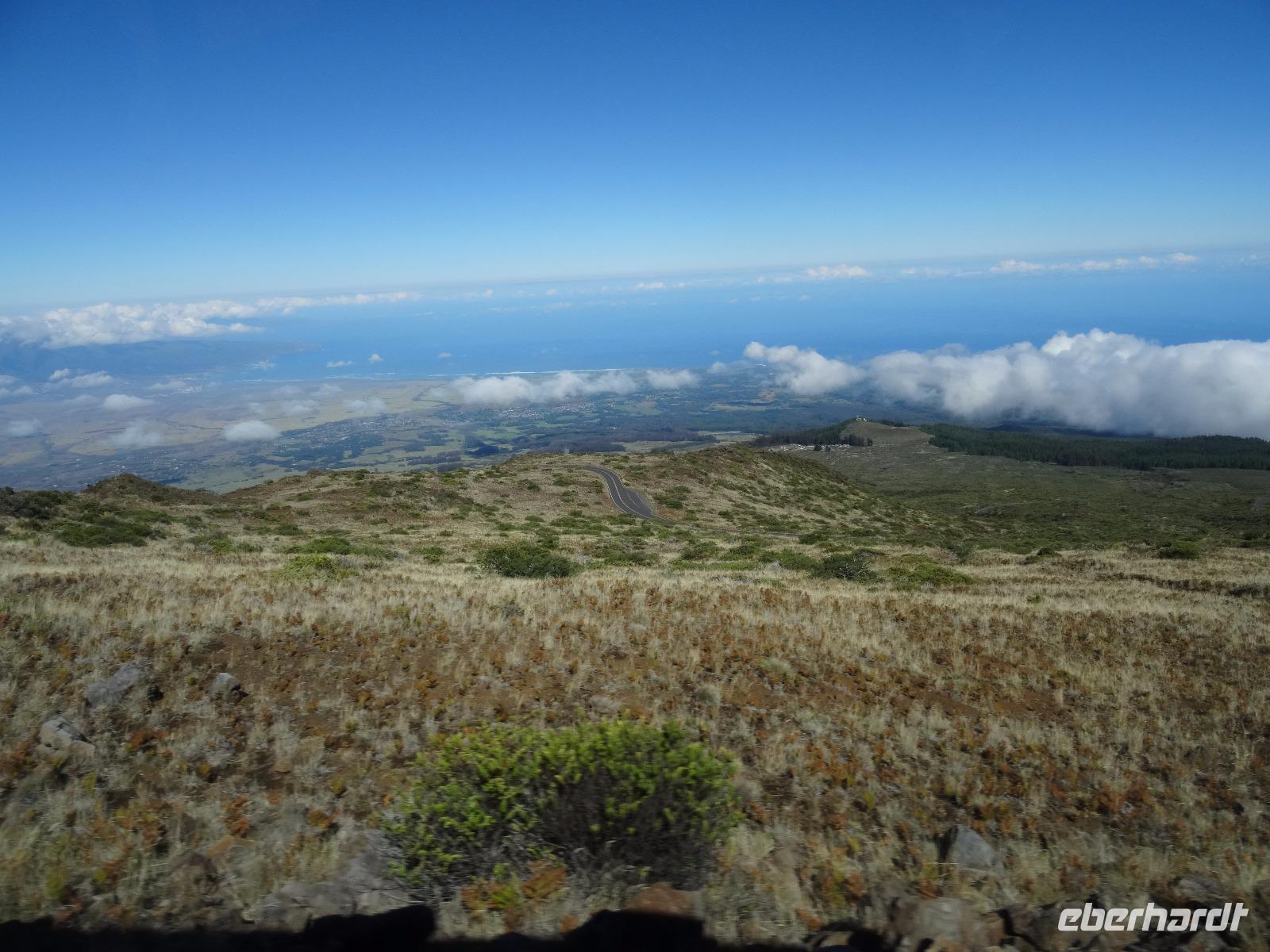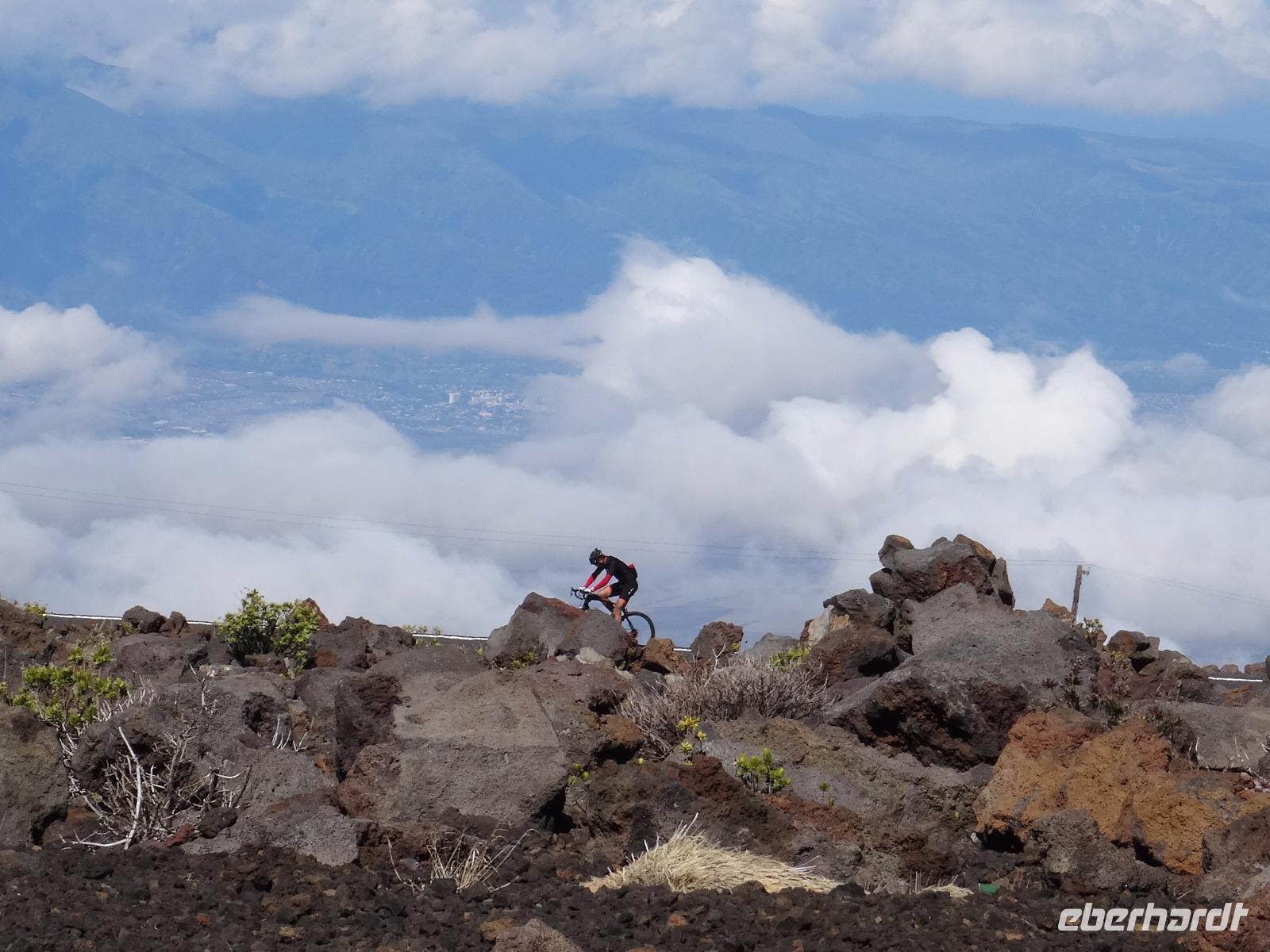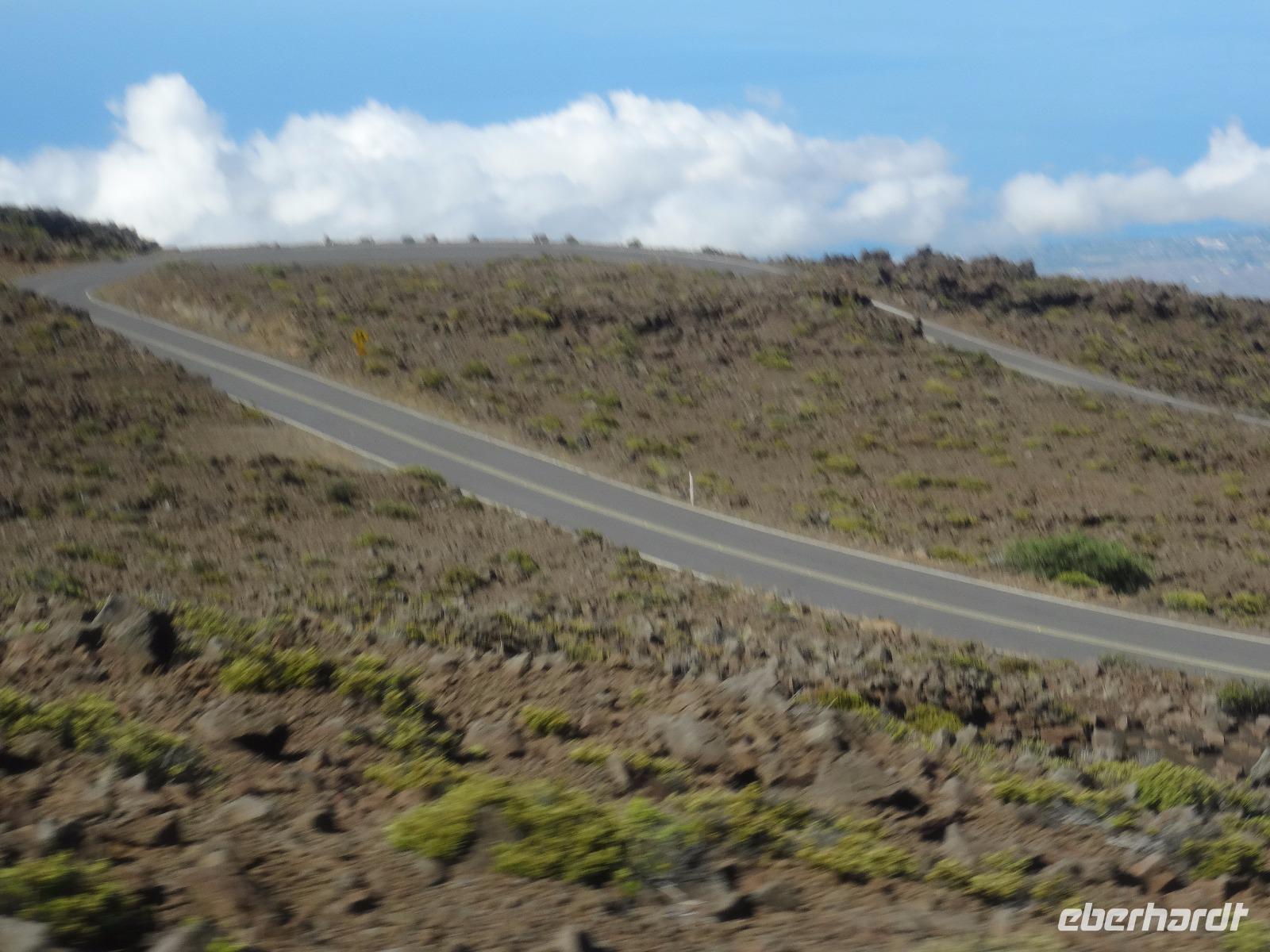 Unser Bus schlängelte sich die Serpentinenstraße fast 50 Kilometer hinauf, während Radfahrer die Straße hinab raste. Der neuste Sport auf Maui. Ich glaube kaum, dass die Biker einen Blick für die Einzigartigkeit dieses Flecken Erde übrig hatten. Die Vegetation änderte sich Meter für Meter, vom suptropischen Regenwald bis hin zu einer fast vegetationslosen Mondlandschaft.