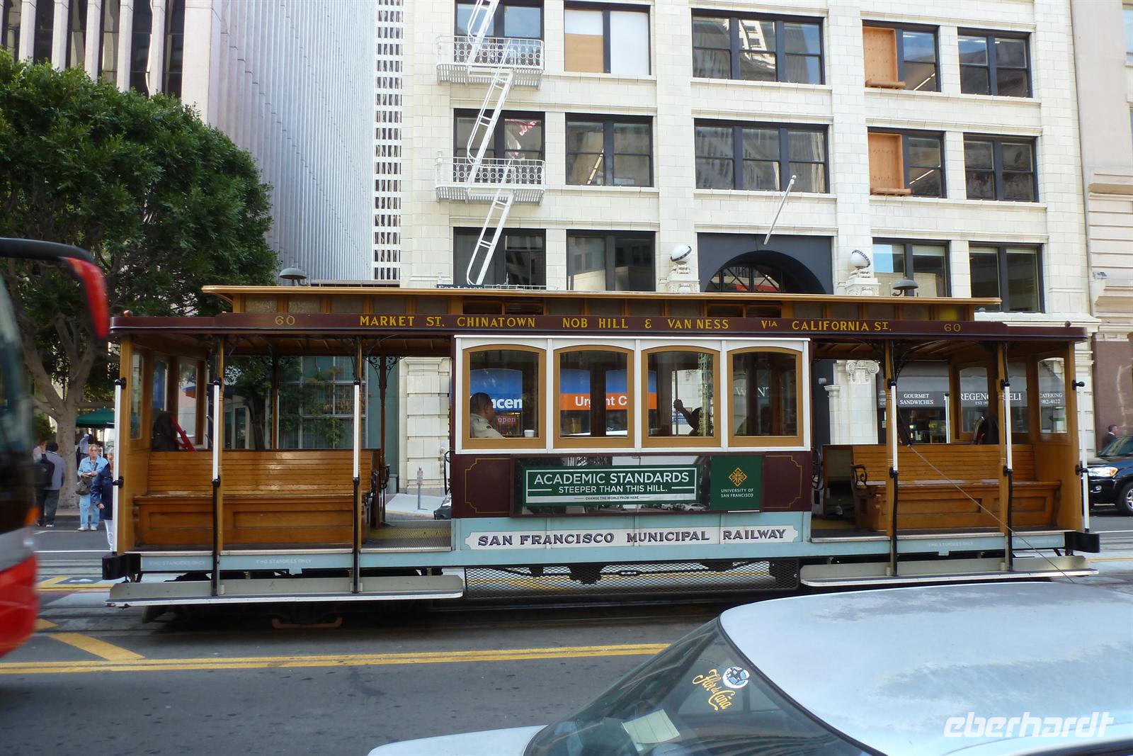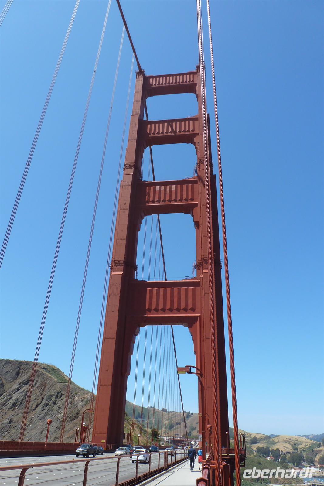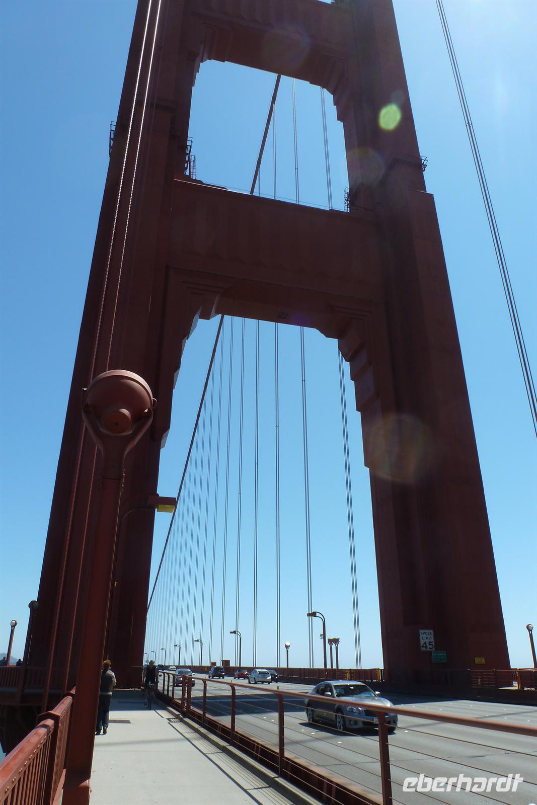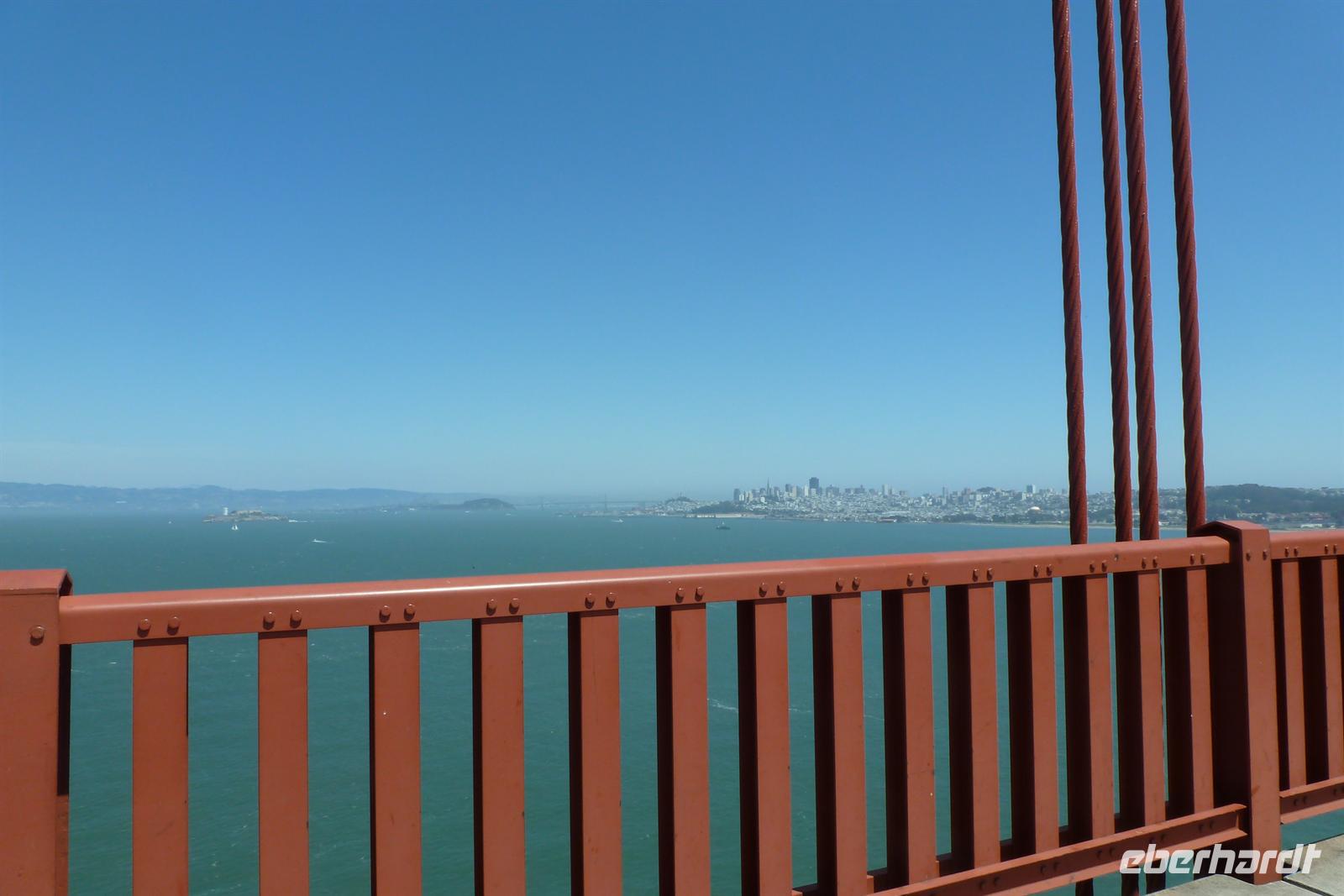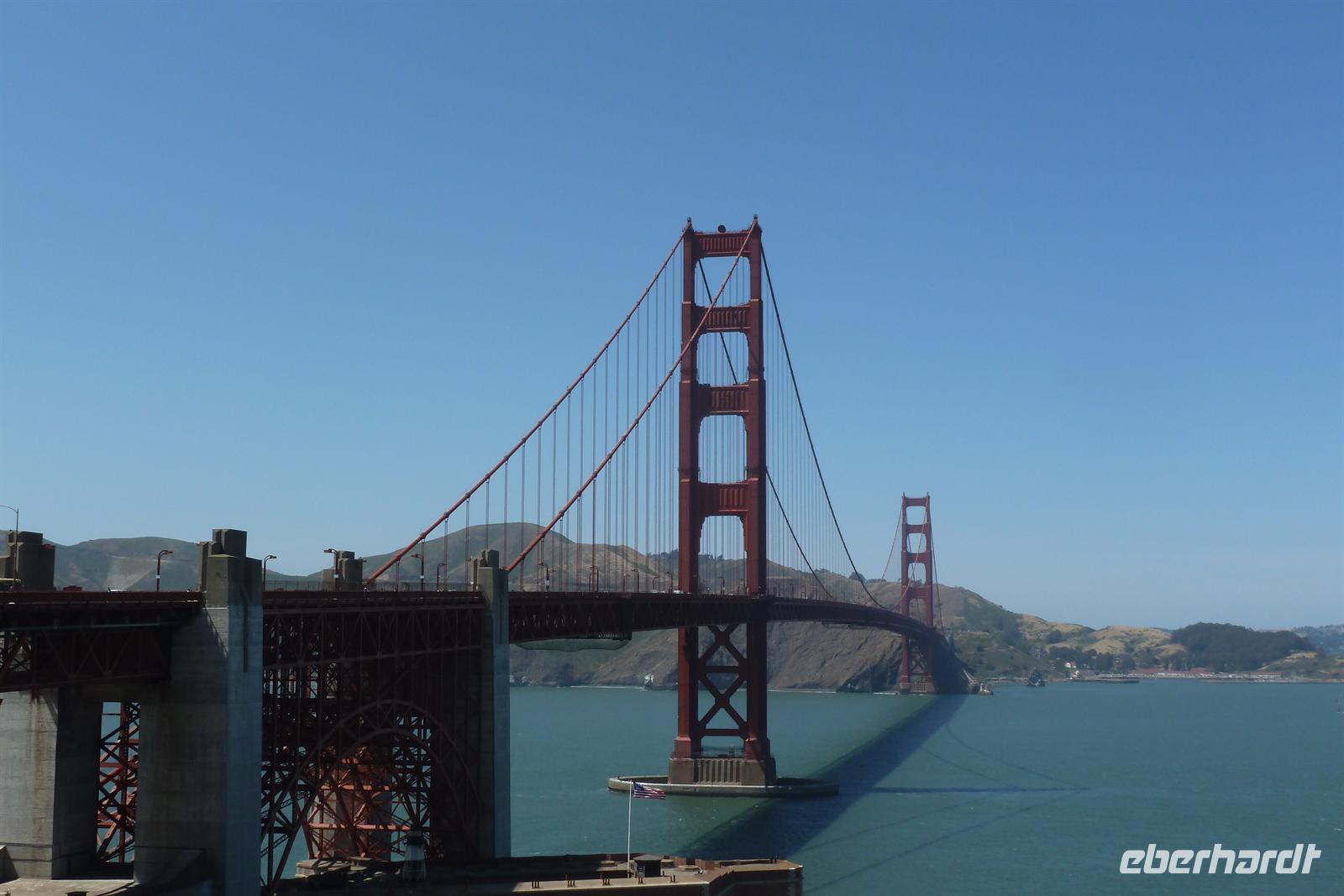 gestrichene Holzhäuser, welche auch gern als Cover für San Francisco gebraucht werden, hin zur Golden Gate Bridge, dem eigentlichen Höhepunkt einer jeden Tour durch diese schöne Stadt. Das Wetter war uns gewogen, die Sonne schien und Nebel war nicht in Sicht, so dass wir einen tollen Blick auf und von der Brücke werfen konnten. In einer knappen Stunde überquerten wir dieses weltbekannte Bauwerk von der Marin County Seite aus zu Fuß und konnten dabei die Schiffe in der Bucht von San Francisco beobachten. Ein wunderbares Erlebnis. Wie so vieles auf dieser Reise quer durch die Vereinigten Staaten gehörte ein Spaziergang über die Golden Gate Bridge zur Erfüllung langgehegter Träume. Den vorläufigen Abschluss unserer Citytour bildete eine Fahrt mit den ehrwürdigen Cable Cars, den Kabelstraßenbahnen, welche in ihrer Art mittlerweile einzigartig auf der Welt sind und eine weiteres Wahrzeichen San Franciscos darstellen. Wer Lust hatte, konnte anschließend am Fisherman`s Wharf die Zeit mit bummeln oder shoppen bis zum Abendessen verbringen, welches wir am Pier 39 im Neptune`s mit wunderbarem Blick auf Alcatraz und die Bay Area zu uns nahmen. Den stilvollen Abschluss eines erlebnisreichen Tages bildete eine Night-Tour durch San Francisco an Bord zweier Stretch-Limousinen, welche uns über die Bay Bridge nach Treasure Island brachten, wo wir bei einem Glas Champagner einen fantastischen Blick auf die beleuchtete Skyline genießen konnten.