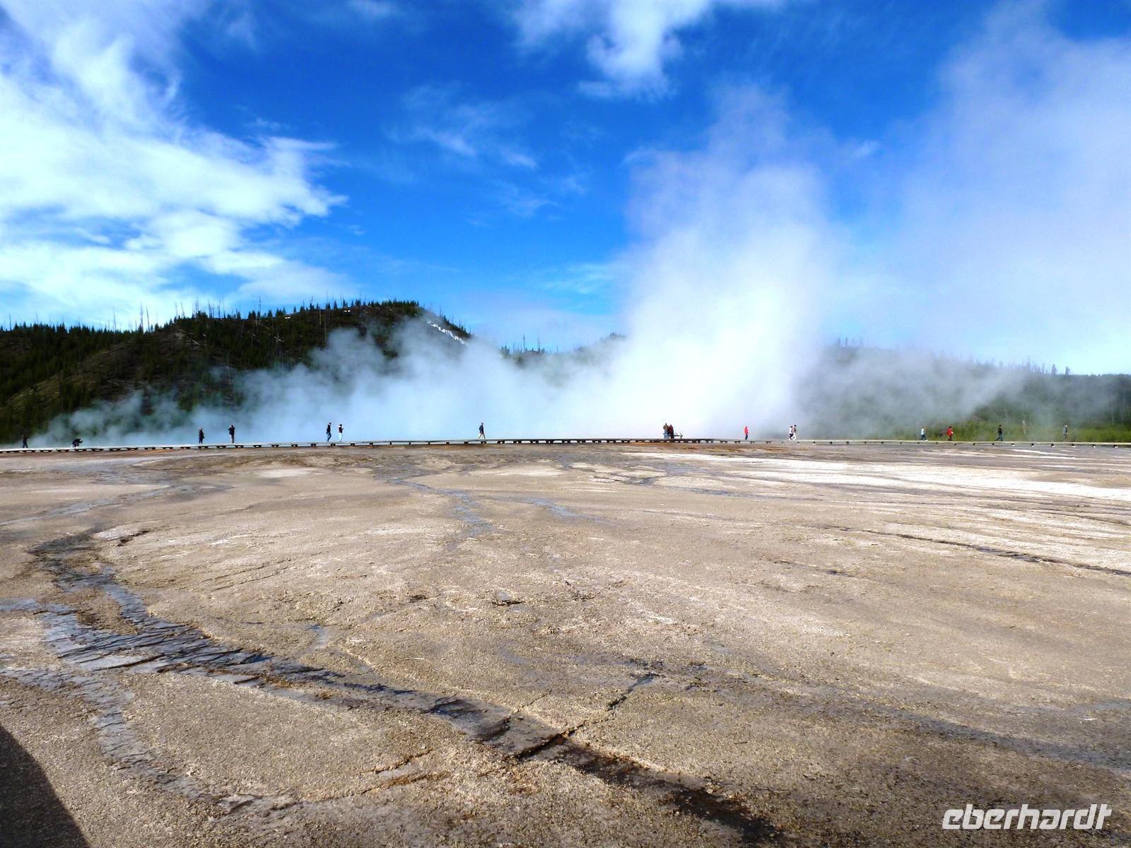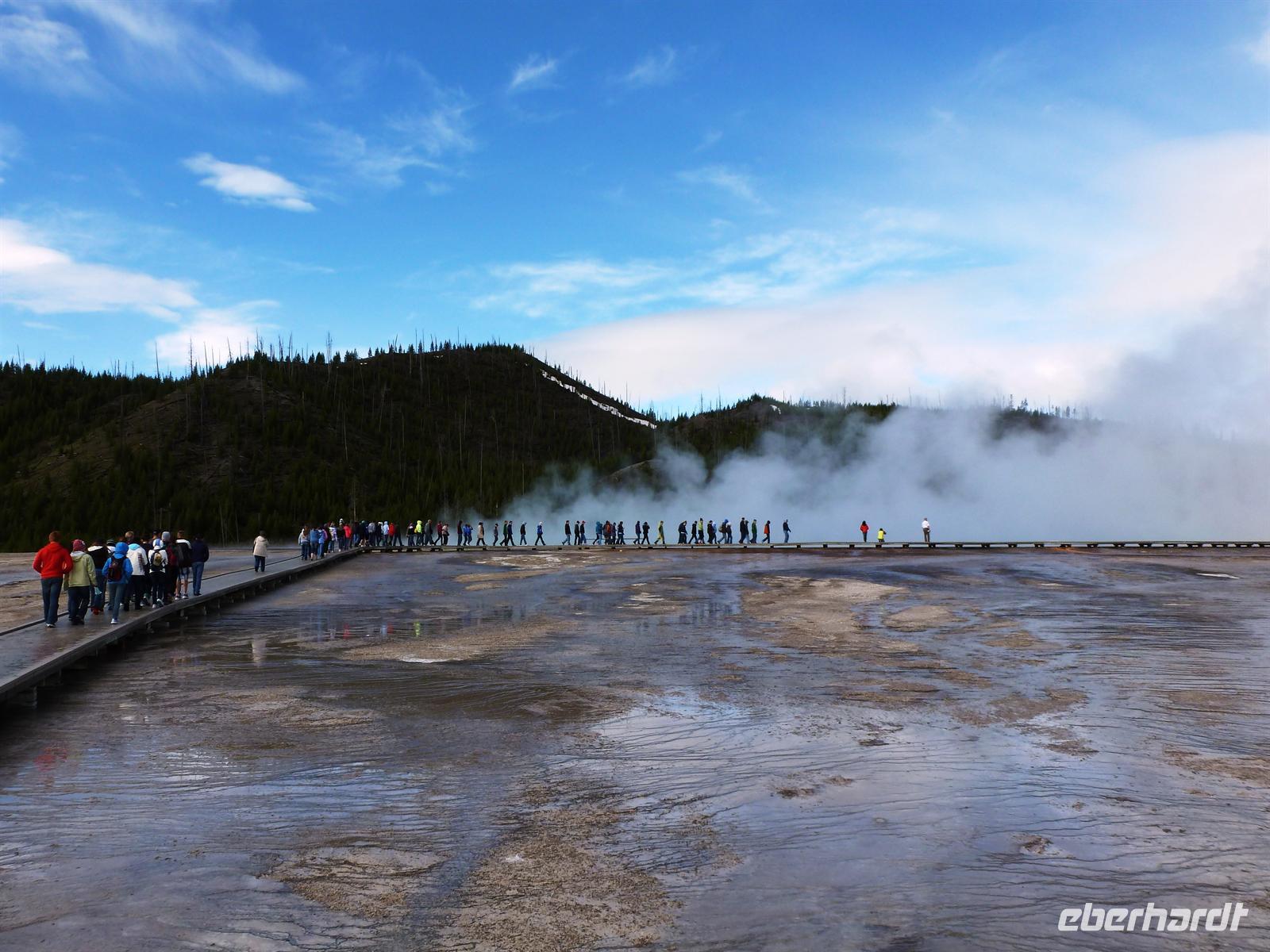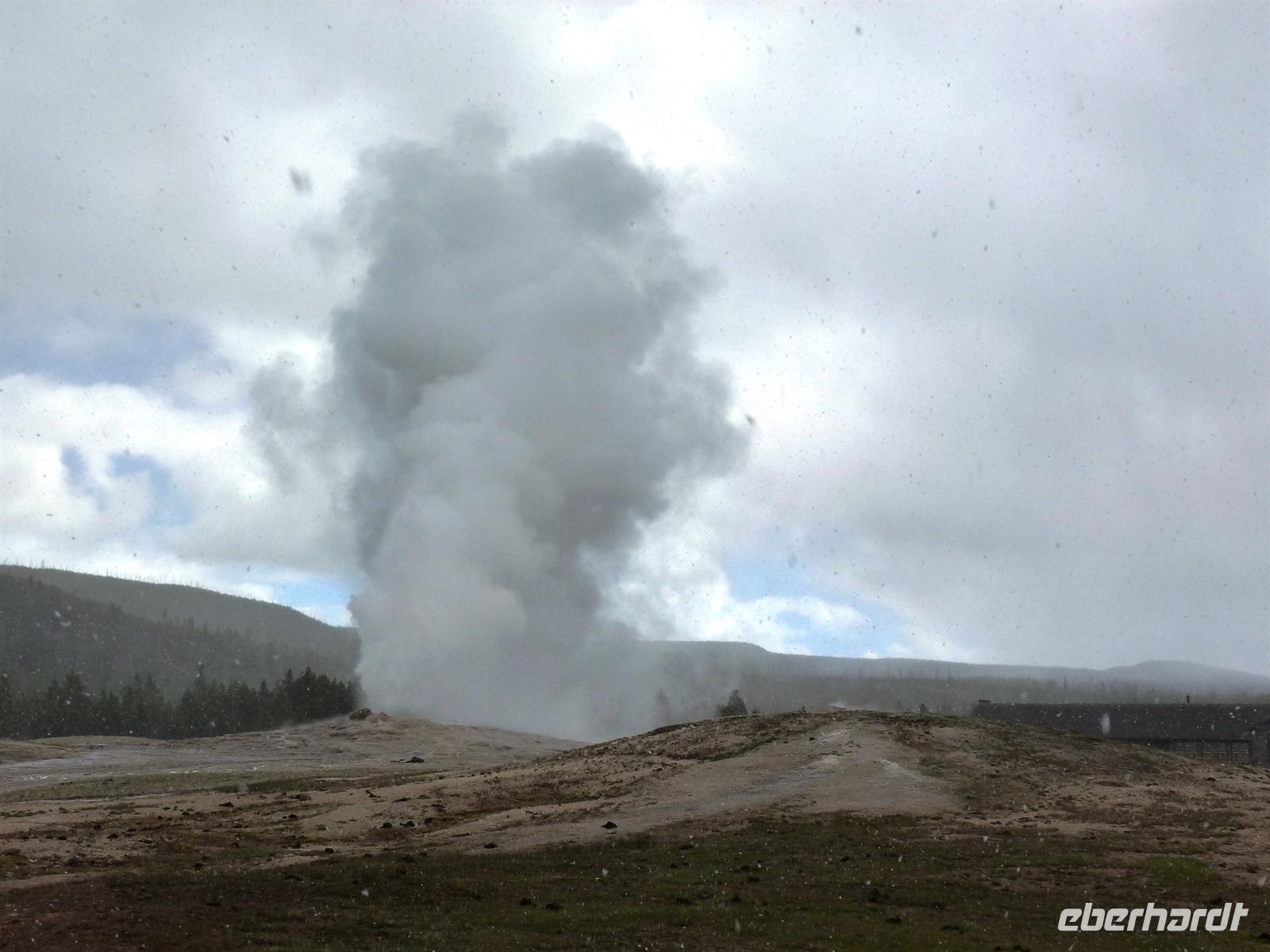 Heute führte uns unsere Tour weiter in Richtung Süden. Wir kehrten in den Yellowstone Nationalpark zurück und stoppten am Grand Prismatic Spring, der größten Thermalquelle der Vereinigten Staaten. Bei optimalen Verhältnissen lassen sich hier wunderbare Farbspiele fotografieren, leider war uns das Wetter auch an diesem Tag nicht zu jeder Zeit hold und wir mussten mit eingeschränkten Sichtverhältnissen zurechtkommen. Anschließend fuhren wir weiter in südliche Richtung und kamen gegen 09:15 Uhr am Old Faithful an, einem der bekanntesten Geysire des Yellowstone Parks. Seine Eruptionsabstände werden mit ca. 70-90 Minuten angegeben und wir wollten eine Eruption unbedingt miterleben. Wie wir erfuhren, war der nächste