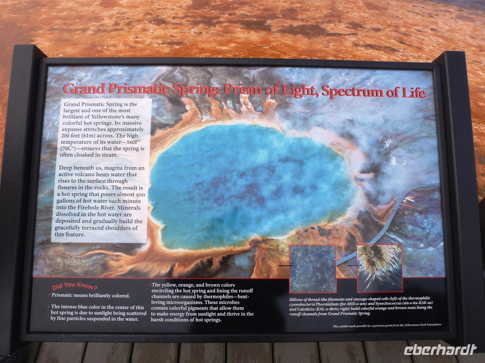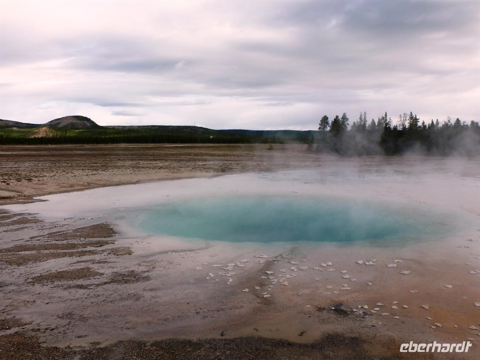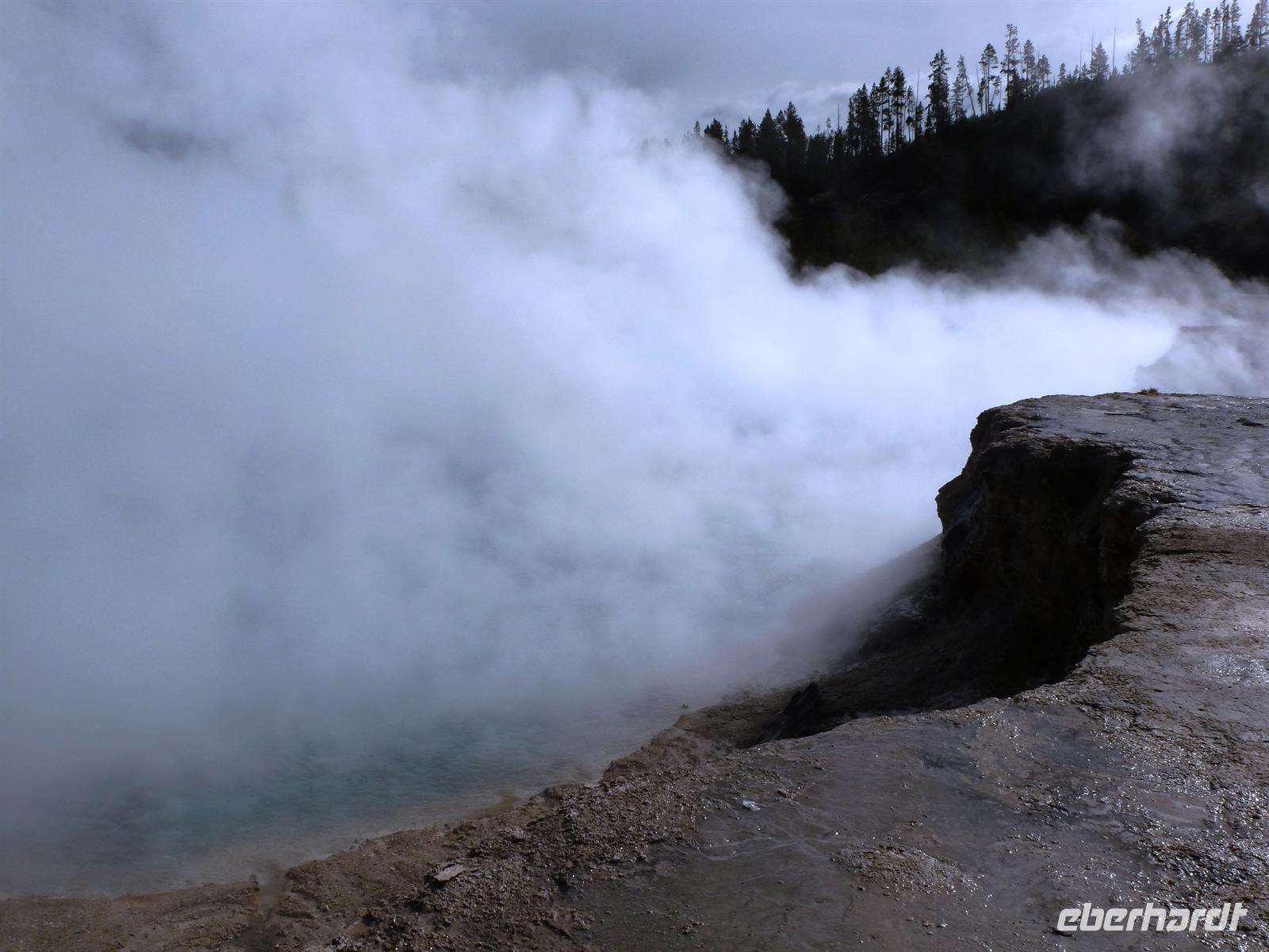 Heute führte uns unsere Tour weiter in Richtung Süden. Wir kehrten in den Yellowstone Nationalpark zurück und stoppten am Grand Prismatic Spring, der größten Thermalquelle der Vereinigten Staaten. Bei optimalen Verhältnissen lassen sich hier wunderbare Farbspiele fotografieren, leider war uns das Wetter auch an diesem Tag nicht zu jeder Zeit hold und wir mussten mit eingeschränkten Sichtverhältnissen zurechtkommen. Anschließend fuhren wir weiter in südliche Richtung und kamen gegen 09:15 Uhr am Old Faithful an, einem der bekanntesten Geysire des Yellowstone Parks. Seine Eruptionsabstände werden mit ca. 70-90 Minuten angegeben und wir wollten eine Eruption unbedingt miterleben. Wie wir erfuhren, war der nächste
