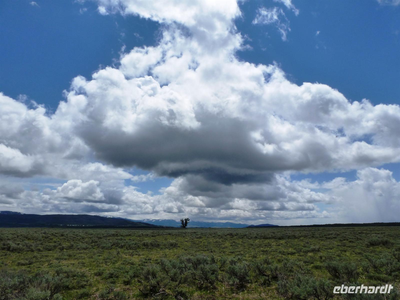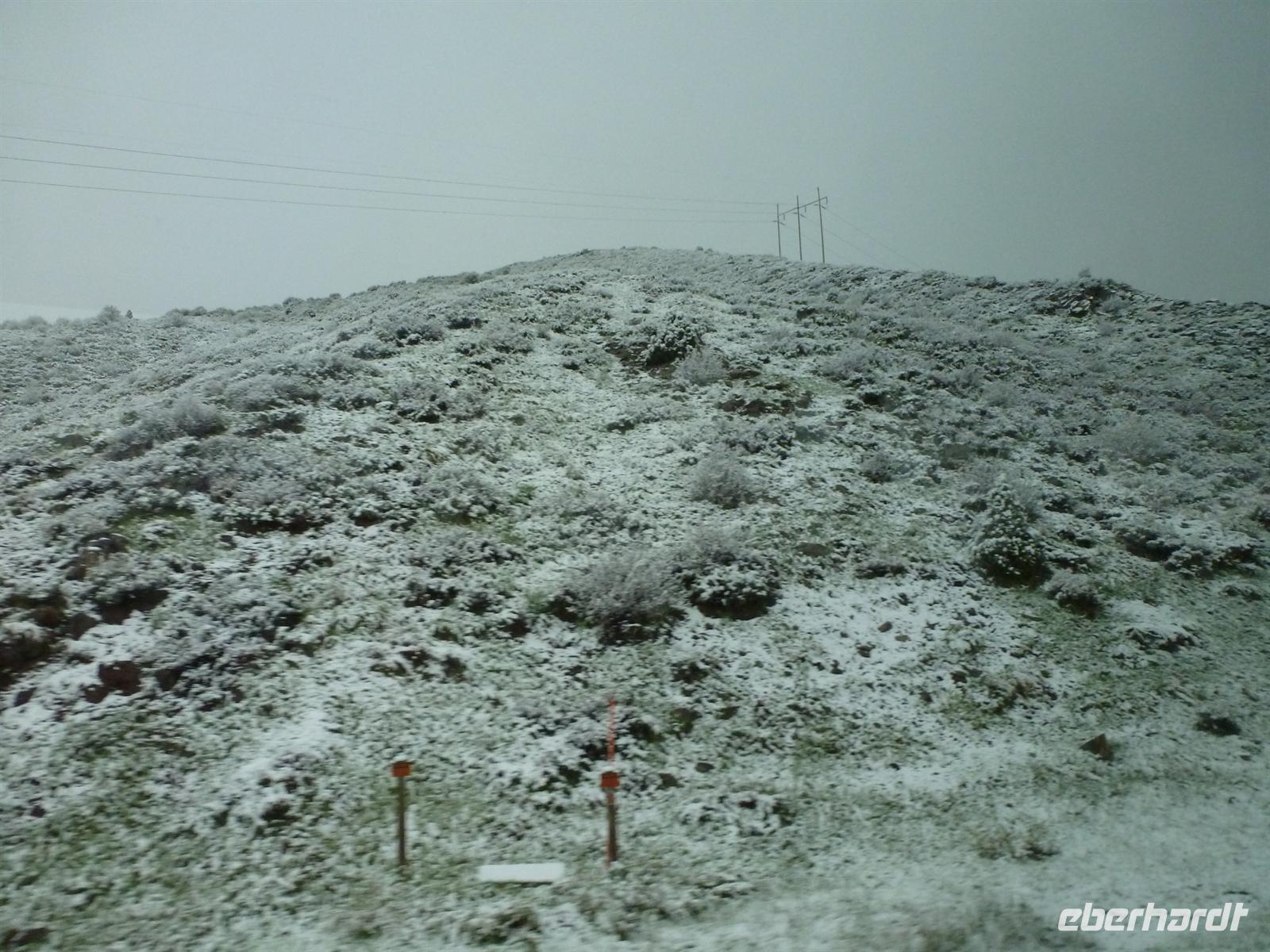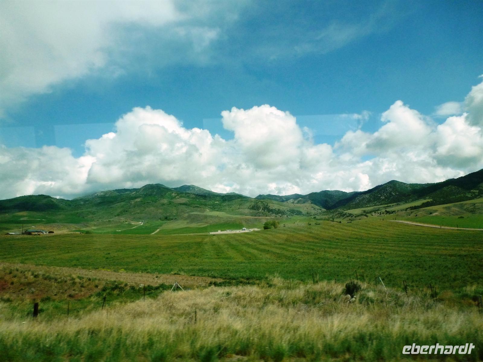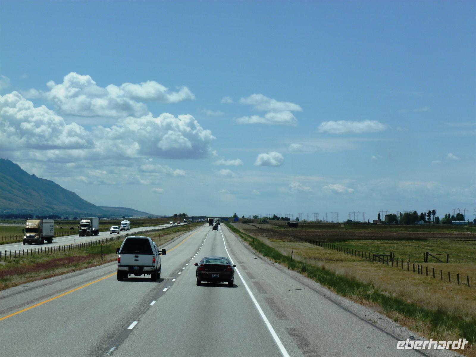 Nach dem Frühstück sagten wir dem beschaulichen Westernstädtchen Jackson Lebewohl und fuhren bei hoffnungsvollem Wetter immer weiter gen Süden durch die karge Berglandschaft von Idaho. Große Ranches und noch größere Farmen wechselten sich untereinander ab und leider wechselte auch das verheißungsvolle Wetter in einen nicht für möglich geglaubten Schneeregen bei 0 Grad Celsius. Zwischenzeitlich bekamen wir sogar liegengebliebenen Schnee vom letzten Winter zu Gesicht, so dass wir uns ernsthafte Sorgen um den gebuchten Sommerurlaub machten.