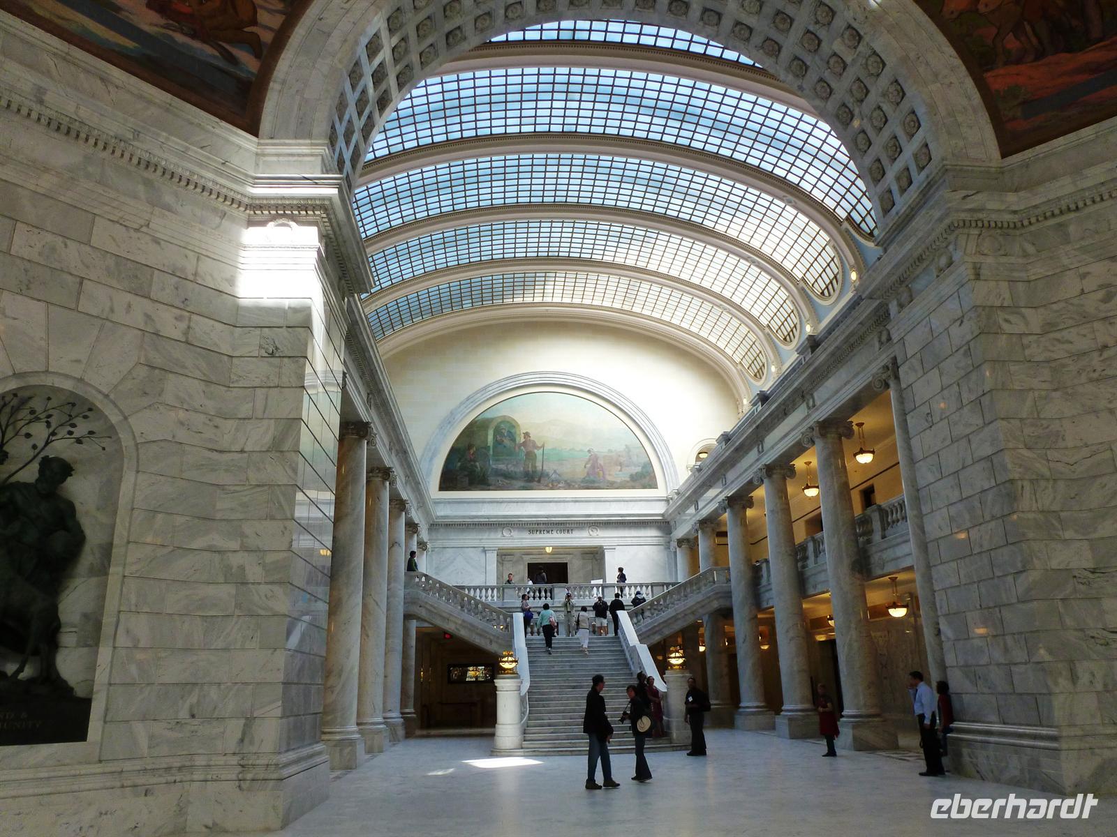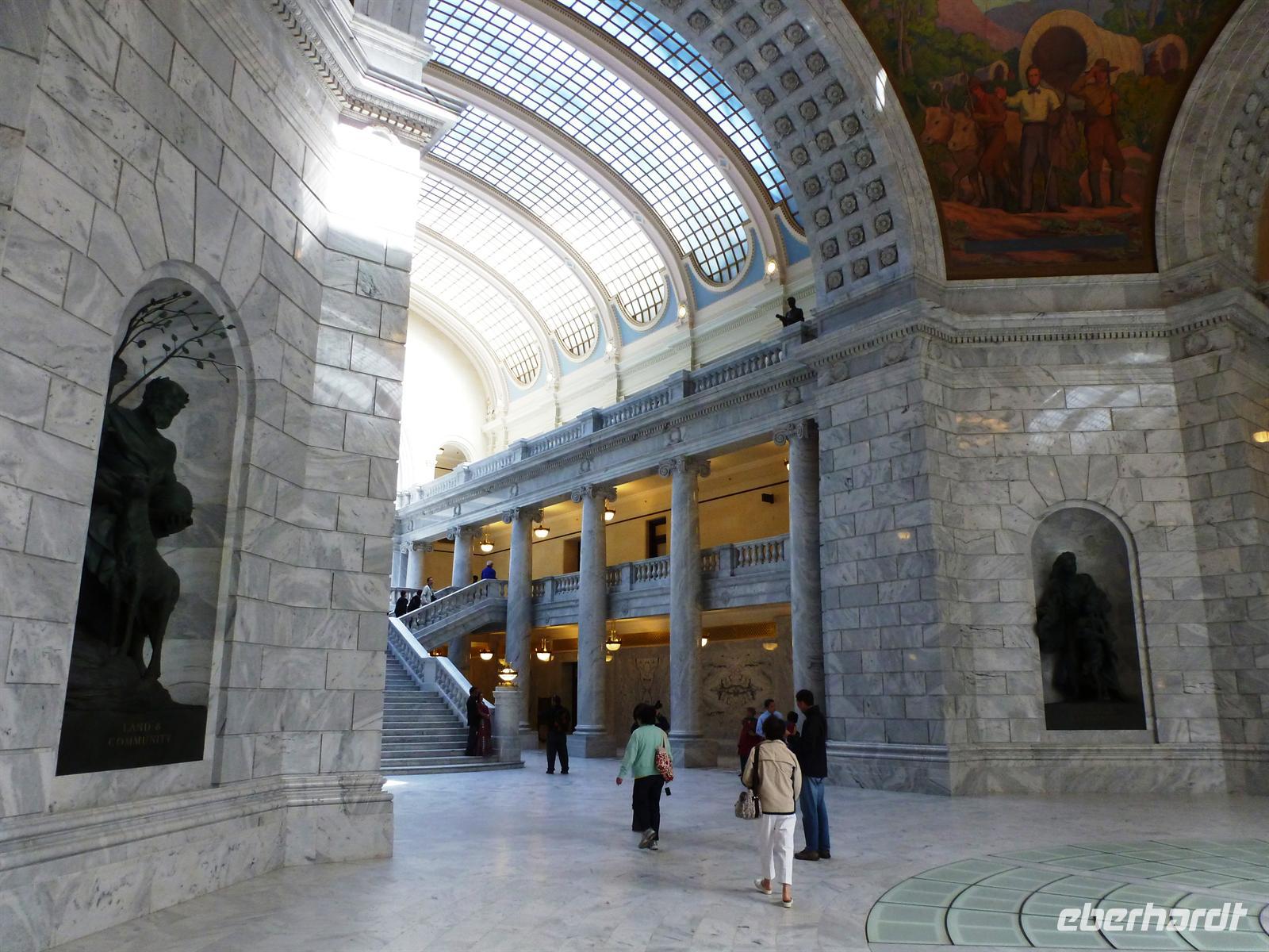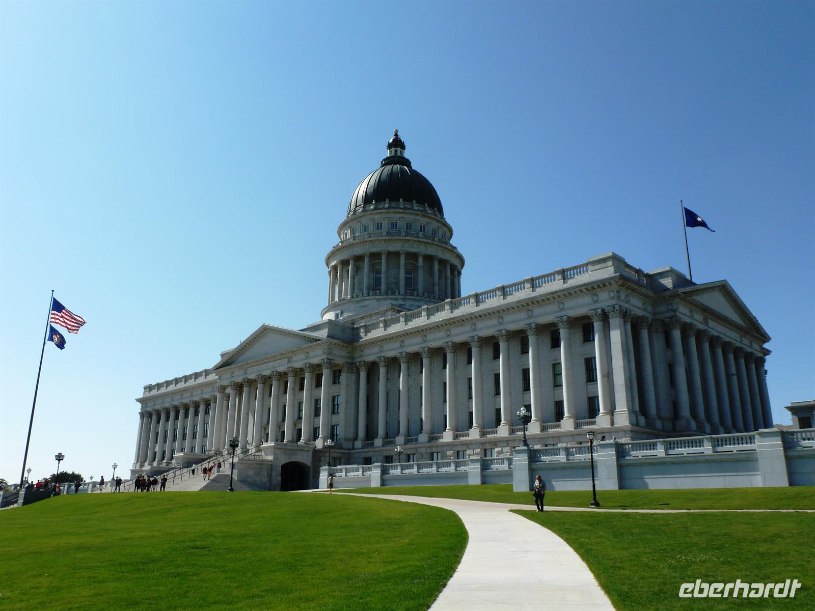 Indes, nach vielen Stunden Fahrt durch die letzten Ausläufer der Rocky Mountains begann das Wetter wieder besser zu werden und wir badeten schon fast wieder im Sonnenschein, als wir uns langsam der Hauptstadt des Bundesstaates Utah näherten. Doch bevor wir der Salzseestadt unsere Aufwartung machten, ging es noch kurz an die salzigen Gestade des gleichnamigen Sees. Viel zu sehen gab es nicht, aber allein die Bedeutung aufgrund seines Salzgehaltes von 9% bis 25% machte ihn für einen 15-Minuten-Stopp tauglich. Im Anschluss ging es zu einer kurzen Stadtrundfahrt durch Salt Lake City, welche sich als eine kleine, aber feine und überaus saubere Stadt präsentierte. Wir stoppten zuerst am Capitol Hill, wo sich das Utah State Capitol befindet, welches dem Capitol in Washington ziemlich ähnlich sieht. Wir besichtigten das Renaissance-Gebäude, welches in den Jahren 1912 bis 1916 aus Utah-Granit errichtet wurde. Danach fuhren wir zum Temple Square, dem Zentrum und politischem Mittelpunkt der Mormonenstadt Salt Lake City. Bei einer knapp vierzigminütigen Führung durch den Temple Square erfuhren wir mehr über die Geschichte der Stadt und seiner Bewohner. Wir sahen den Mormonen Tempel, den man allerdings als Nicht-Mormone nicht betreten darf, die Assembly Hall und den Tabernakel, ursprünglich ein Versammlungshaus für 5000 Zuhörer und heute Bühne für den Mormon Tabernacle Chor. Nach unserer kleinen Besichtigungstour ging es ins Hotel und anschließend zum Abendessen in ein Steakhouse, wo wir ein exquisites Dinner genießen konnten.