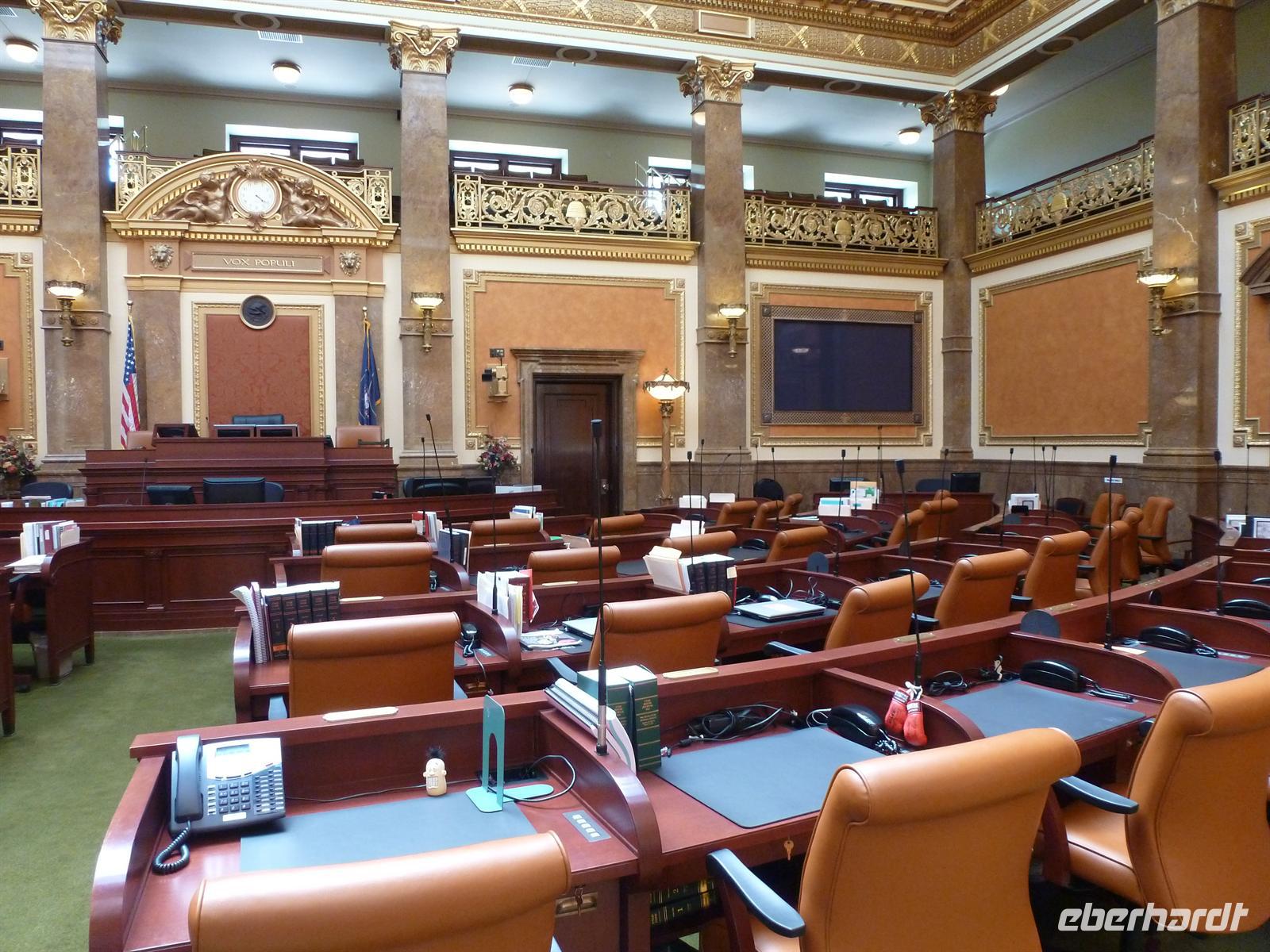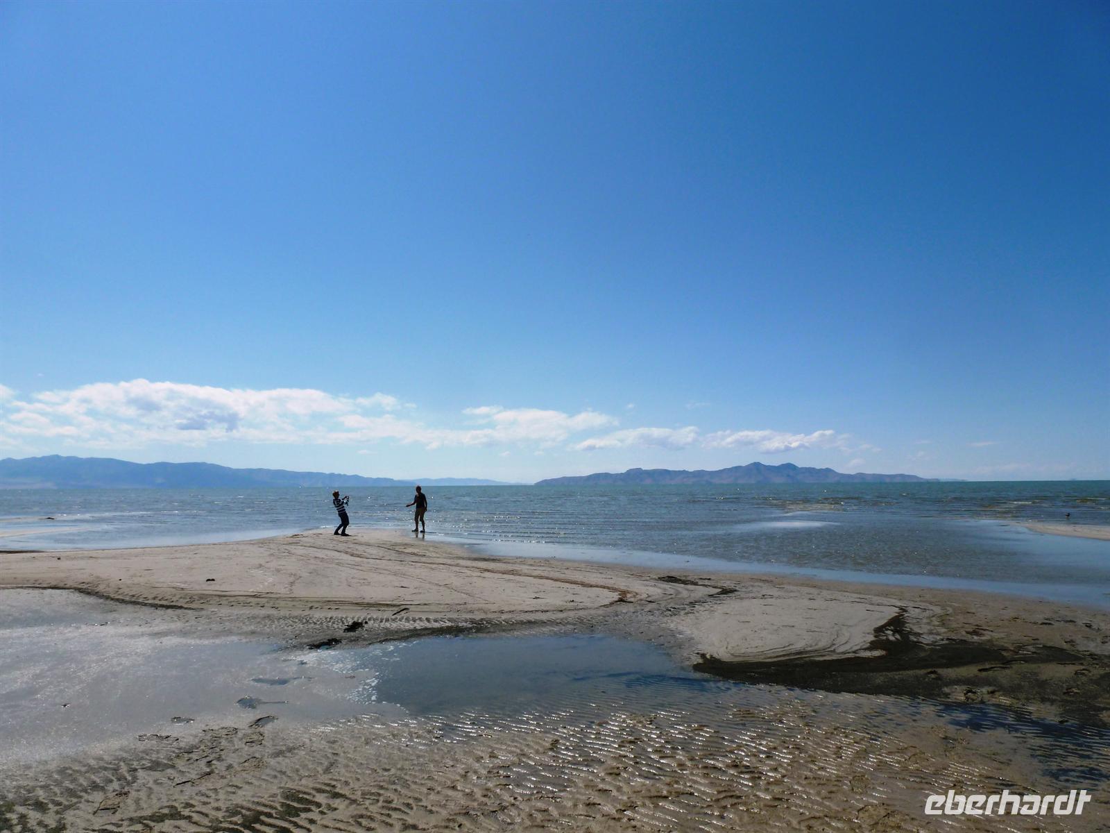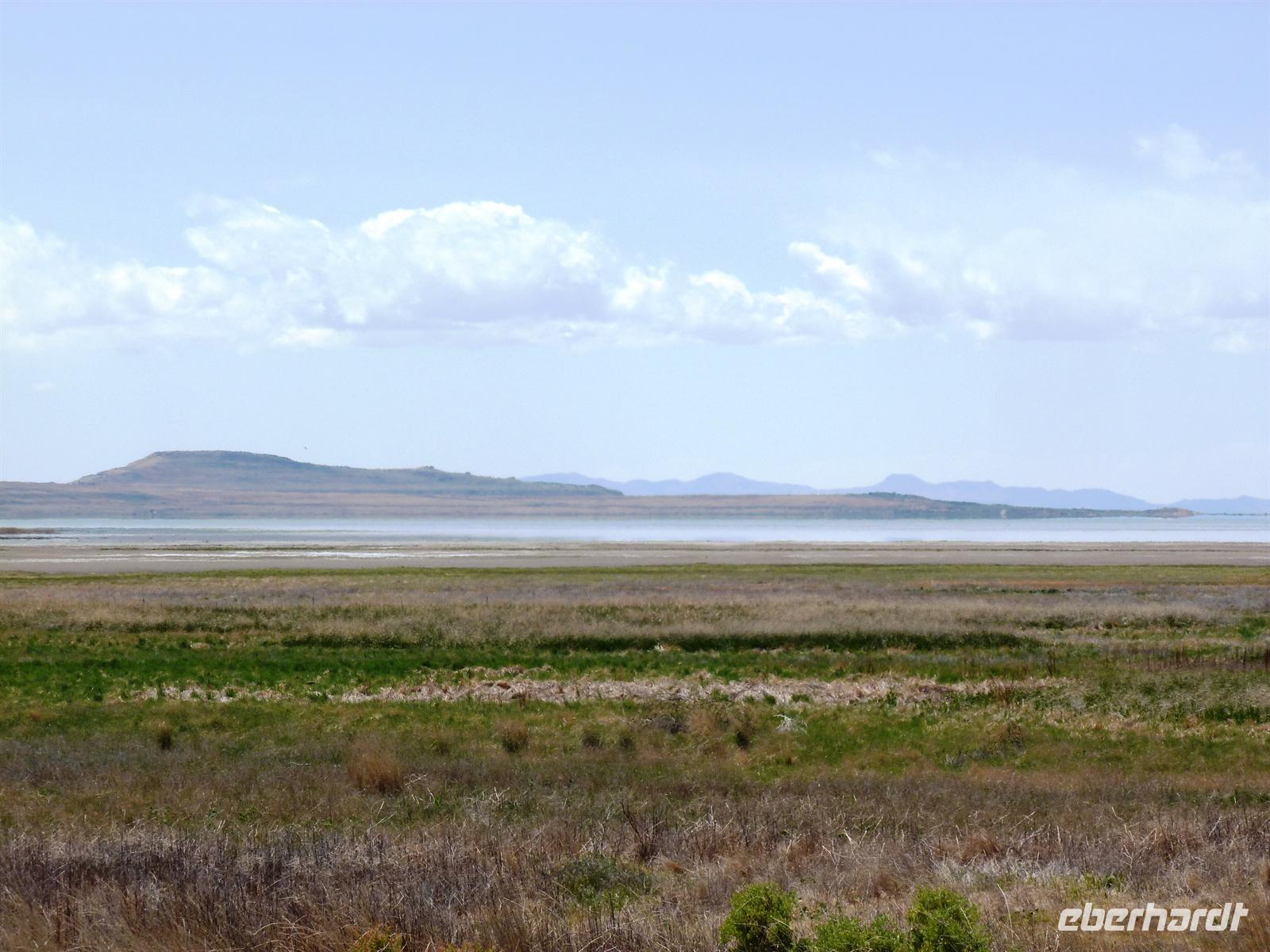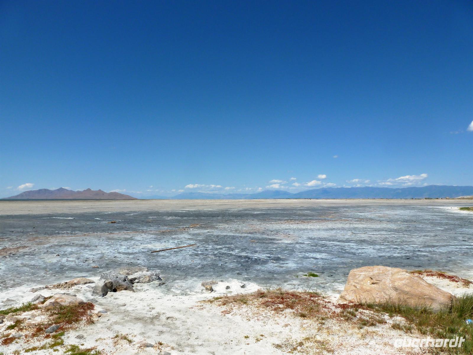 Indes, nach vielen Stunden Fahrt durch die letzten Ausläufer der Rocky Mountains begann das Wetter wieder besser zu werden und wir badeten schon fast wieder im Sonnenschein, als wir uns langsam der Hauptstadt des Bundesstaates Utah näherten. Doch bevor wir der Salzseestadt unsere Aufwartung machten, ging es noch kurz an die salzigen Gestade des gleichnamigen Sees. Viel zu sehen gab es nicht, aber allein die Bedeutung aufgrund seines Salzgehaltes von 9% bis 25% machte ihn für einen 15-Minuten-Stopp tauglich. Im Anschluss ging es zu einer kurzen Stadtrundfahrt durch Salt Lake City, welche sich als eine kleine, aber feine und überaus saubere Stadt präsentierte. Wir stoppten zuerst am Capitol Hill, wo sich das Utah State Capitol befindet, welches dem Capitol in Washington ziemlich ähnlich sieht. Wir besichtigten das Renaissance-Gebäude, welches in den Jahren 1912 bis 1916 aus Utah-Granit errichtet wurde. Danach fuhren wir zum Temple Square, dem Zentrum und politischem Mittelpunkt der Mormonenstadt Salt Lake City. Bei einer knapp vierzigminütigen Führung durch den Temple Square erfuhren wir mehr über die Geschichte der Stadt und seiner Bewohner. Wir sahen den Mormonen Tempel, den man allerdings als Nicht-Mormone nicht betreten darf, die Assembly Hall und den Tabernakel, ursprünglich ein Versammlungshaus für 5000 Zuhörer und heute Bühne für den Mormon Tabernacle Chor. Nach unserer kleinen Besichtigungstour ging es ins Hotel und anschließend zum Abendessen in ein Steakhouse, wo wir ein exquisites Dinner genießen konnten.