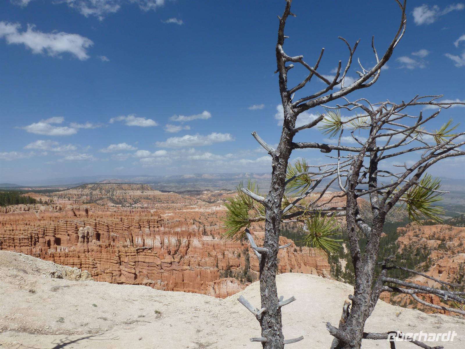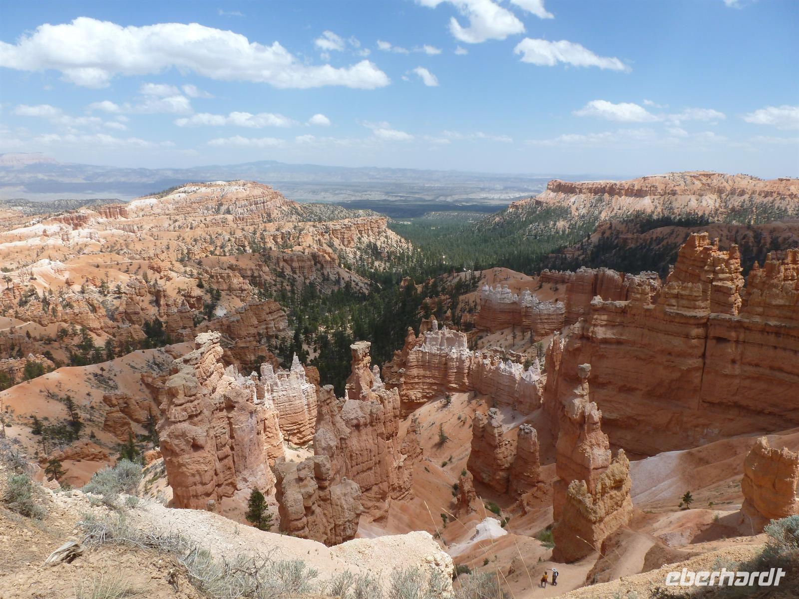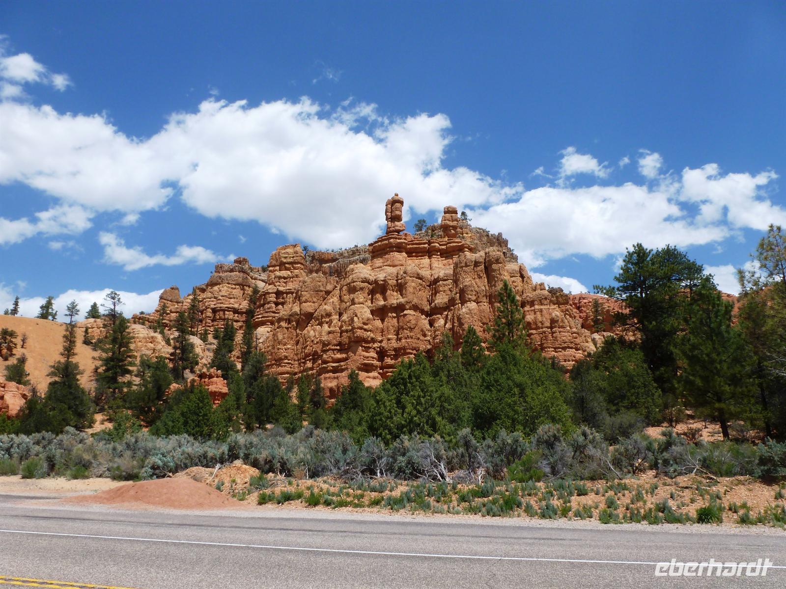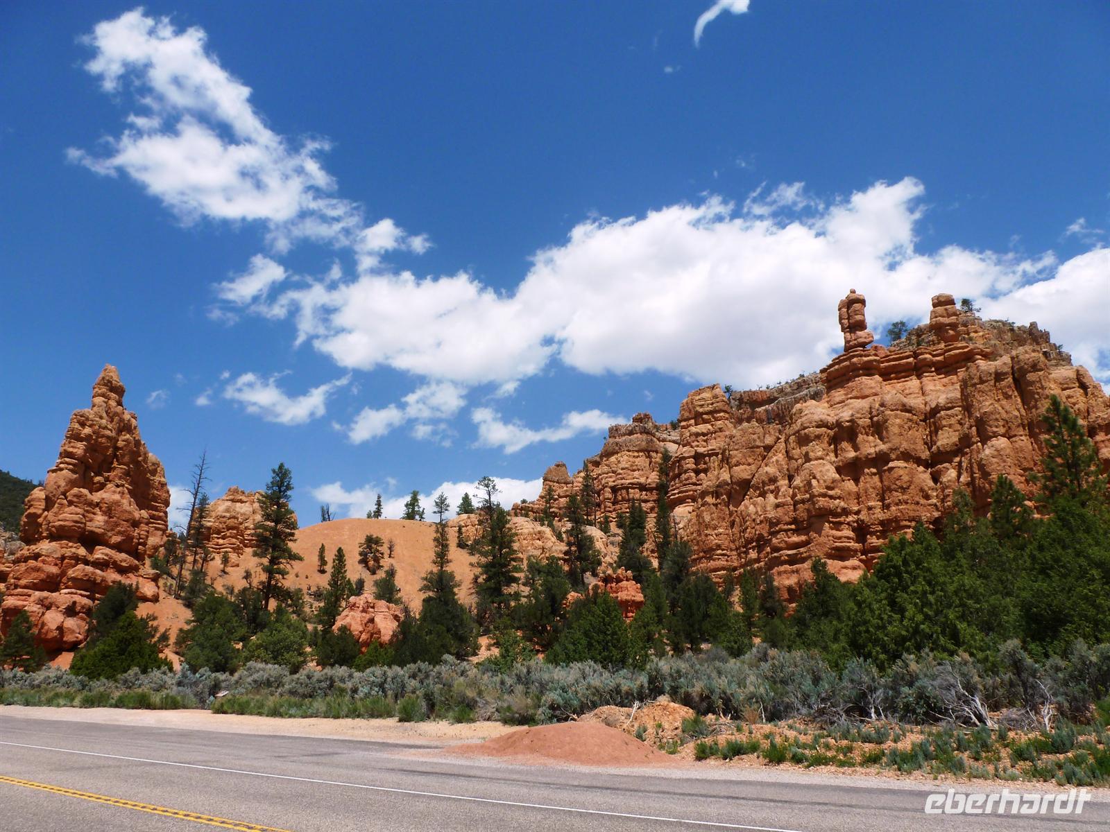 Das Wetter verhieß Stabilität, je weiter südlich wir uns blicken ließen und so dröhnten wir gespannt unserem heutigem Ziel, dem faszinierenden und einzigartigen Bryce Canyon entgegen. Bei schönstem Sonnenschein und strahlend-blauem Himmel hielten wir für tolle Fotos am Red Canyon im Dixie National Forrest, bevor wir dann schlussendlich den Bryce Canyon erreichten. Welch atemberaubende Farben, Formen- und Formationen uns da erwarteten, ist kaum zu beschreiben. Die Landschaft tief zerklüftet, zerfurcht, durchschnitten, erodiert und trotzdem unendlich weitläufig, gewaltig und ehrfurchtgebietend - wir kamen nur langsam und nach und nach aus dem Staunen heraus. Über zwei Stunden wanderten wir fotografierend und ob der sich uns darbietenden Herrlichkeit philosophierend an den Canyonwänden entlang, immer wieder neue Formen, Farben und Schattenspiele ausmachend. Nicht weit vom Canyon entfernt schlugen wir unser heutiges Nachtlager auf, im altehrwürdigen Ruby`s Inn, wo wir das Gesehene beim Abendessen vom leckeren Western-Buffet nochmals Revue passieren lassen konnten.