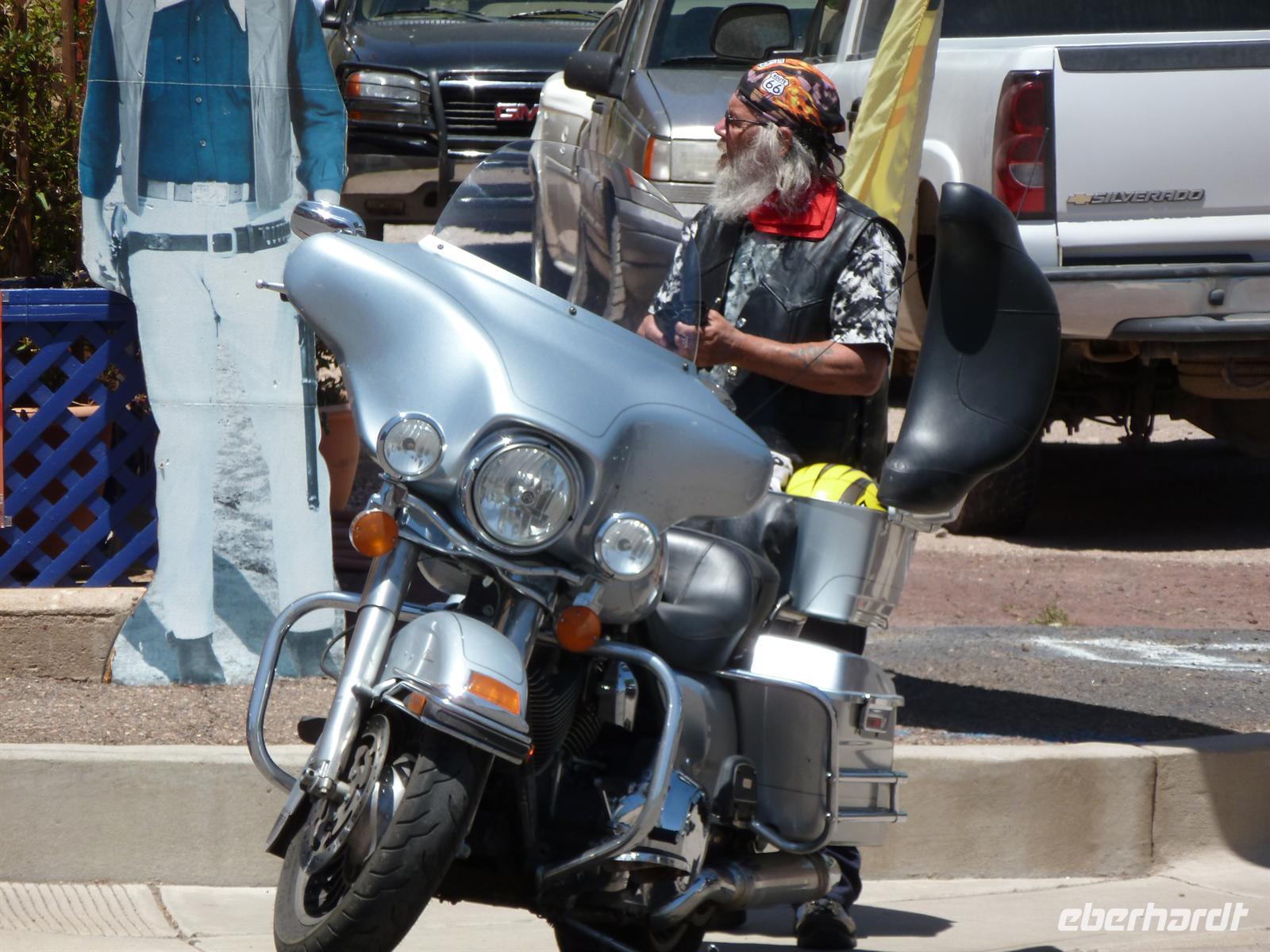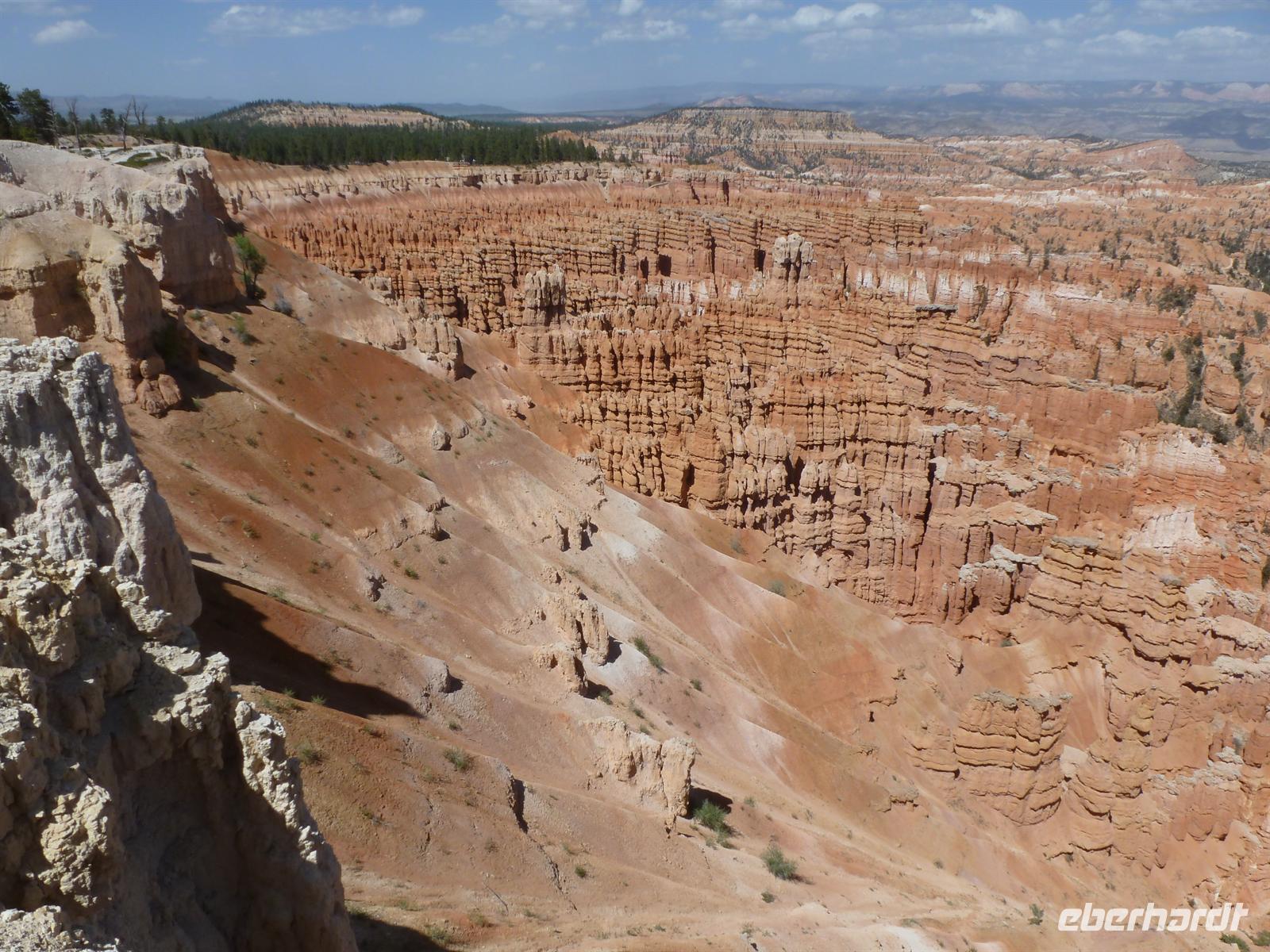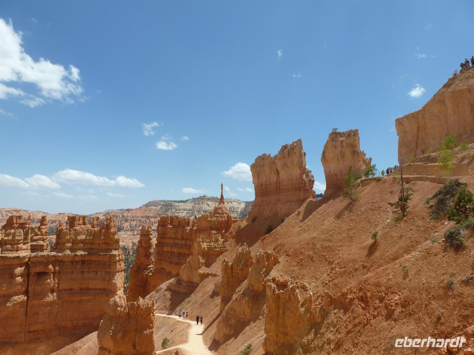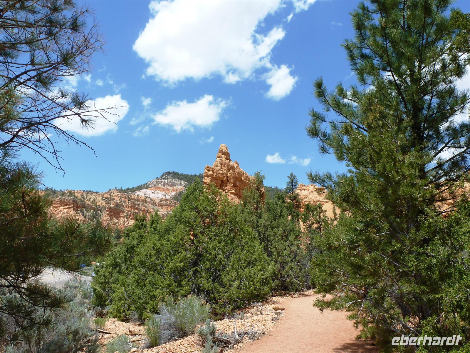 Das Wetter verhieß Stabilität, je weiter südlich wir uns blicken ließen und so dröhnten wir gespannt unserem heutigem Ziel, dem faszinierenden und einzigartigen Bryce Canyon entgegen. Bei schönstem Sonnenschein und strahlend-blauem Himmel hielten wir für tolle Fotos am Red Canyon im Dixie National Forrest, bevor wir dann schlussendlich den Bryce Canyon erreichten. Welch atemberaubende Farben, Formen- und Formationen uns da erwarteten, ist kaum zu beschreiben. Die Landschaft tief zerklüftet, zerfurcht, durchschnitten, erodiert und trotzdem unendlich weitläufig, gewaltig und ehrfurchtgebietend - wir kamen nur langsam und nach und nach aus dem Staunen heraus. Über zwei Stunden wanderten wir fotografierend und ob der sich uns darbietenden Herrlichkeit philosophierend an den Canyonwänden entlang, immer wieder neue Formen, Farben und Schattenspiele ausmachend. Nicht weit vom Canyon entfernt schlugen wir unser heutiges Nachtlager auf, im altehrwürdigen Ruby`s Inn, wo wir das Gesehene beim Abendessen vom leckeren Western-Buffet nochmals Revue passieren lassen konnten.
