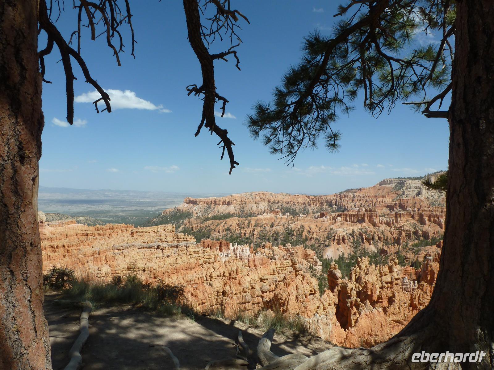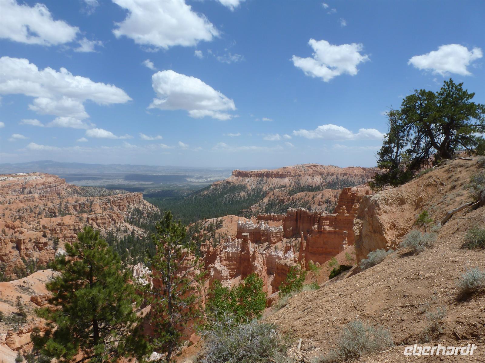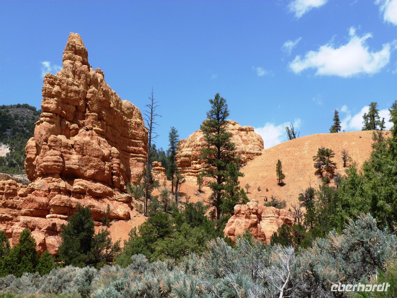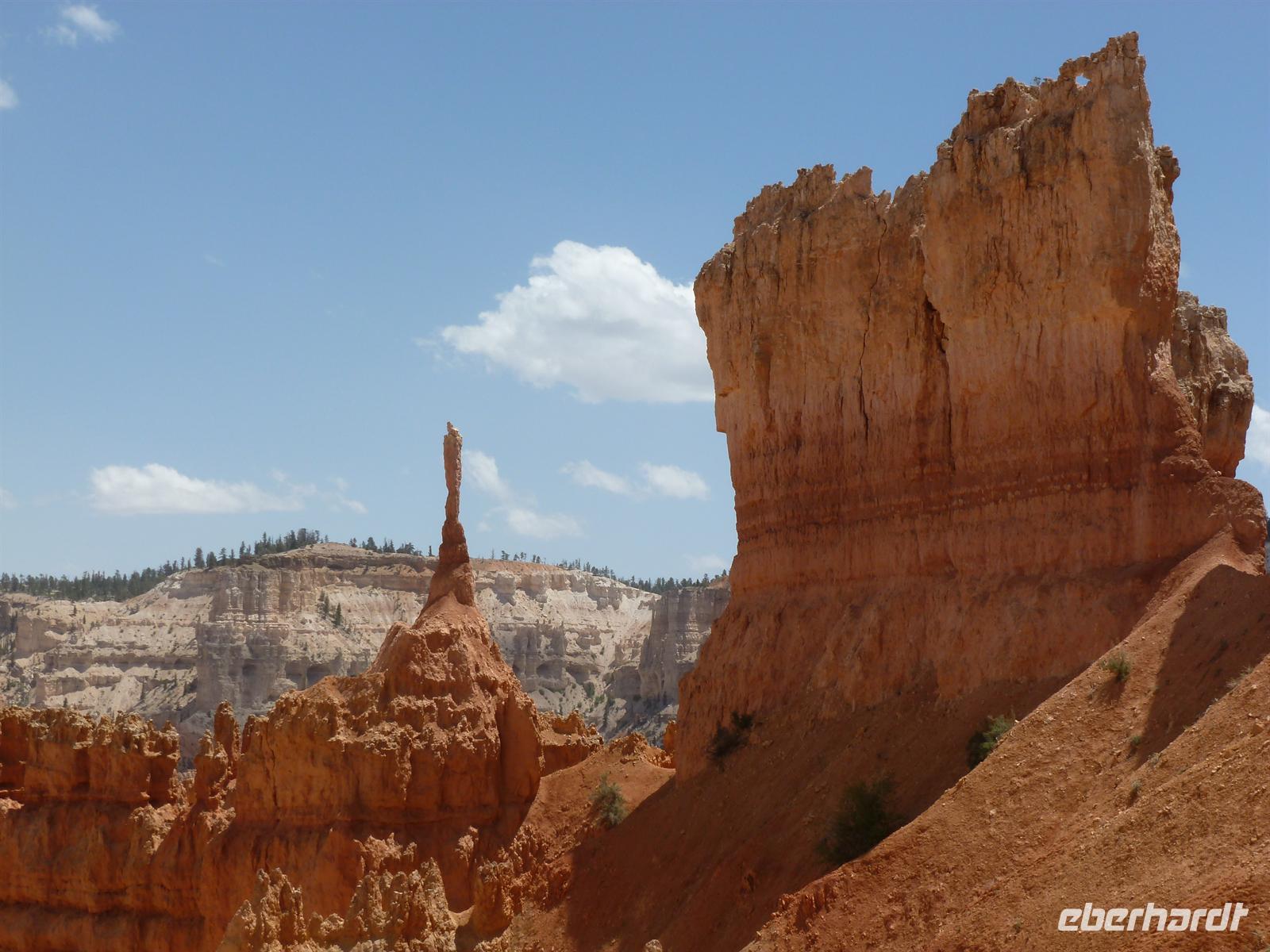 Das Wetter verhieß Stabilität, je weiter südlich wir uns blicken ließen und so dröhnten wir gespannt unserem heutigem Ziel, dem faszinierenden und einzigartigen Bryce Canyon entgegen. Bei schönstem Sonnenschein und strahlend-blauem Himmel hielten wir für tolle Fotos am Red Canyon im Dixie National Forrest, bevor wir dann schlussendlich den Bryce Canyon erreichten. Welch atemberaubende Farben, Formen- und Formationen uns da erwarteten, ist kaum zu beschreiben. Die Landschaft tief zerklüftet, zerfurcht, durchschnitten, erodiert und trotzdem unendlich weitläufig, gewaltig und ehrfurchtgebietend - wir kamen nur langsam und nach und nach aus dem Staunen heraus. Über zwei Stunden wanderten wir fotografierend und ob der sich uns darbietenden Herrlichkeit philosophierend an den Canyonwänden entlang, immer wieder neue Formen, Farben und Schattenspiele ausmachend. Nicht weit vom Canyon entfernt schlugen wir unser heutiges Nachtlager auf, im altehrwürdigen Ruby`s Inn, wo wir das Gesehene beim Abendessen vom leckeren Western-Buffet nochmals Revue passieren lassen konnten.