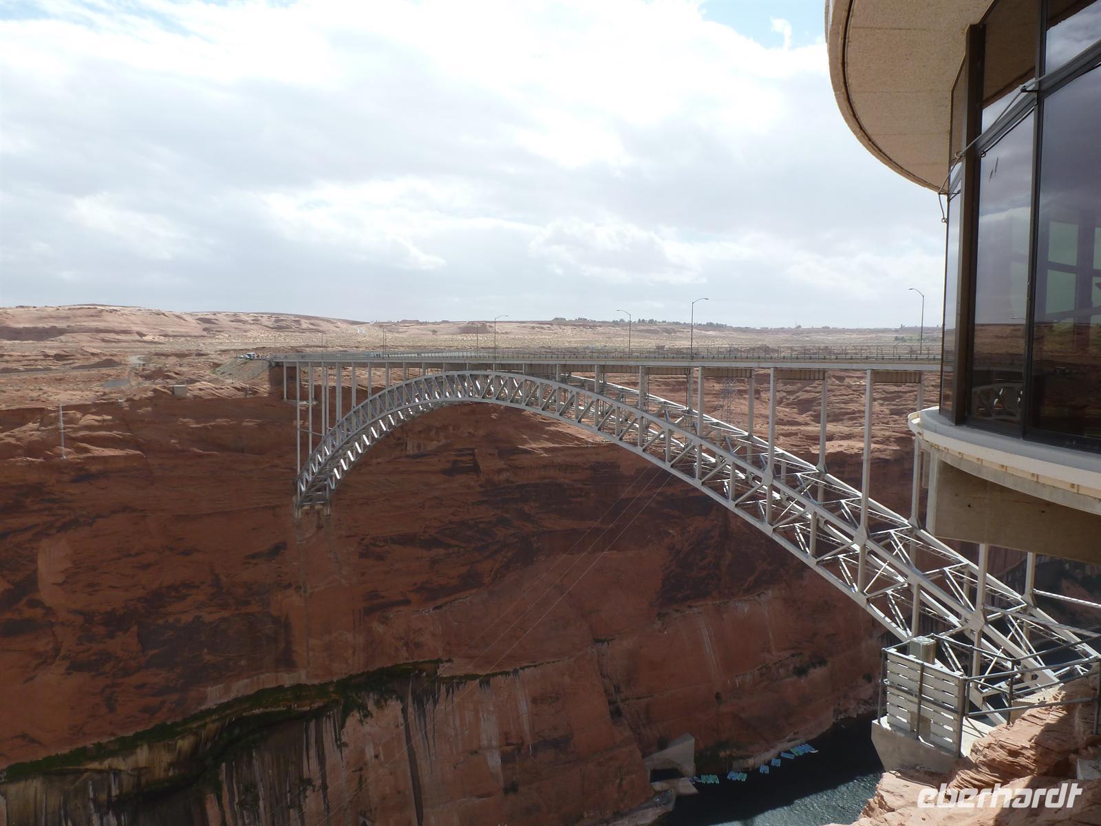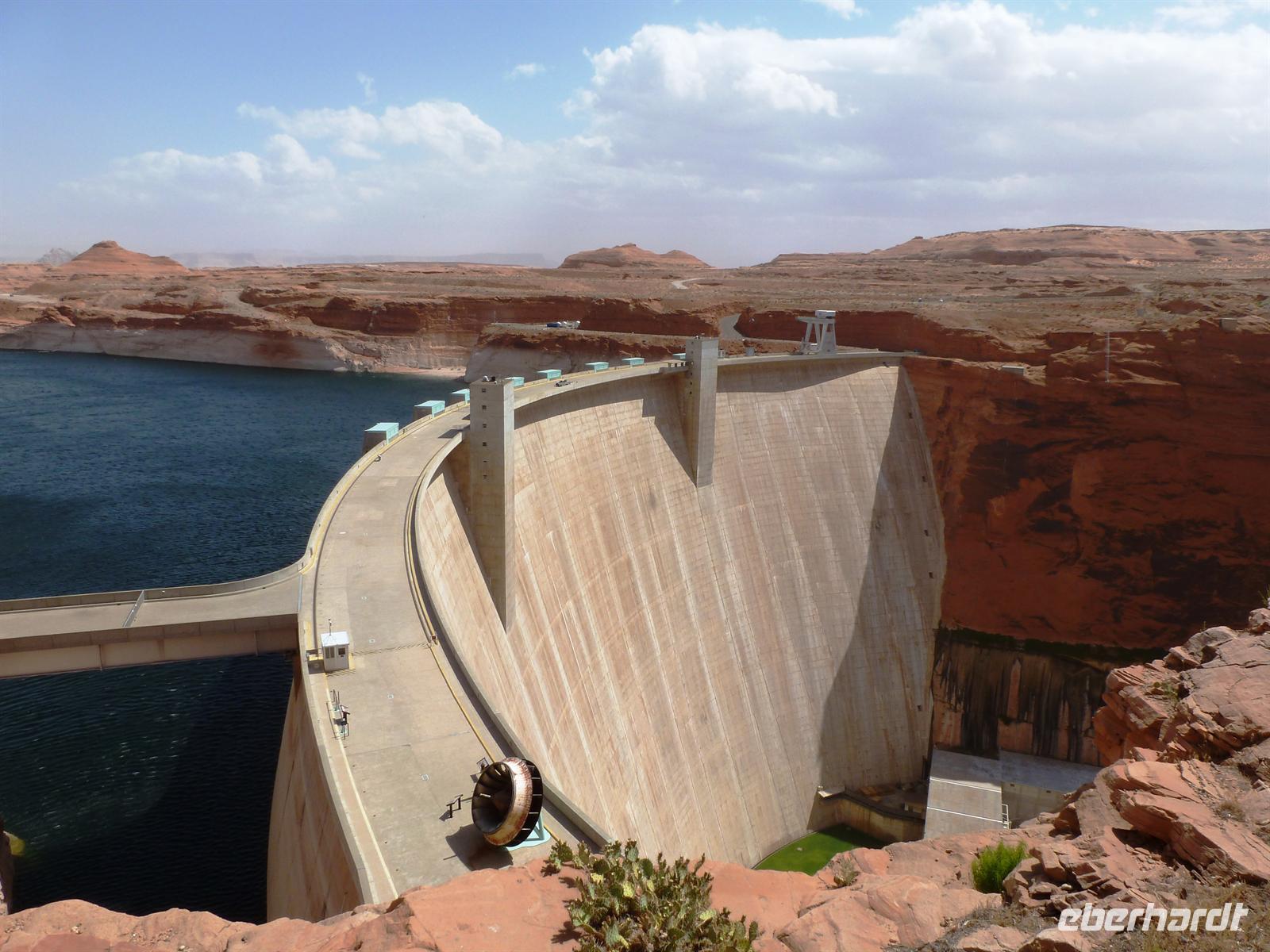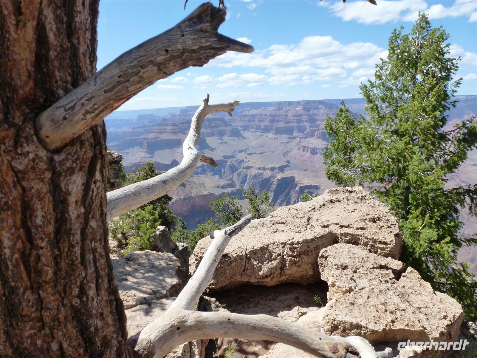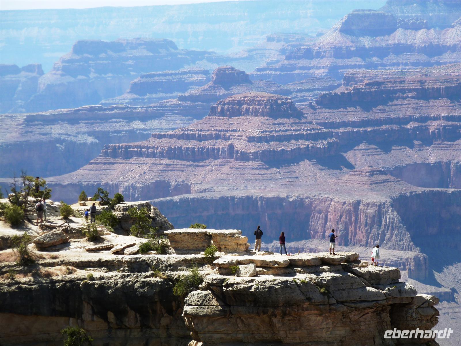 Powell und besichtigten den beeindruckenden Glen Canyon Damm, welcher eine Breite von 387 Metern erreicht und den Colorado River in Arizona anstaut. Nicht weit vom Damm spannt sich die 213 Meter lange Glen Canyon Brücke über den Fluss. Überquert man diese, befindet man sich nicht viel später auf Indianerland, in der Navajo-Reservation. Hin und wieder sieht man mal einen Hogan, die traditionelle Behausung der Navajos. In der Sprache der Navajos bedeutet das Wort Hogan „Zuhause“. In heutiger Zeit ist es meist eine sechseckige Hütte aus Balken, Erde und Lehm mit einem nach Osten gewandten Eingang. Ansonsten bekamen wir eher ärmliche Trailer und heruntergekommene Häuser zu Gesicht. Was leider eher der indianischen Realität entspricht. Durchs Painted Desert, wo uns ein Sandsturm und eine Windhose streifte und unseren Bus kräftig durchschüttelte, ging es weiter in Richtung Grand Canyon Nationalpark, welchen wir gegen Mittag erreichten. Welch überwältigender Ausblick erwartete uns hier! Der Colorado River hat auf einer Länge von mehr als 400 Kilometern im Laufe von Jahrmillionen eine gigantische Schneise in das Hochplateau geschnitten und diesen fantastischen Canyon geschaffen. Nicht nur die schiere Größe beeindruckt, sondern gleichsam das immer wieder wechselnde Spiel von Licht und Schatten. In Zeiten von analogen Filmrollen hätte man wahrscheinlich einen Rucksack voller Filme gebraucht, um alles aufs Bild zu bannen. Heute braucht es nur eine kleine Speicherkarte und man fängt die Großartigkeit des Seins in vielen Facetten ein. Von Mothers Point aus wanderten wir zur vier Kilometer entfernten Bright Angel Lodge, immer entlang der steil abfallenden Canyon-Wände und immer das großartige Panorama vor Augen. Spektakulär, Beispiellos, Unvergesslich. Aber mit Worten lässt sich die Aussicht, die sich dem Besucher bietet, unmöglich beschreiben. Eigentlich war zum Abschluss dieses einzigartigen Tages noch ein Helicopterflug über den Grand Canyon geplant, doch mussten wir diesen wegen zu starken Windes auf den nächsten Morgen verschieben. Auf dem Weg zu unserem Hotel in der Nähe des Canyons sahen wir noch einige Wapitis im Wald stehen, die sich durch unsere Anwesenheit glücklicherweise nicht stören ließen.