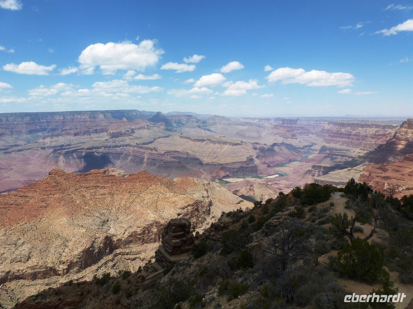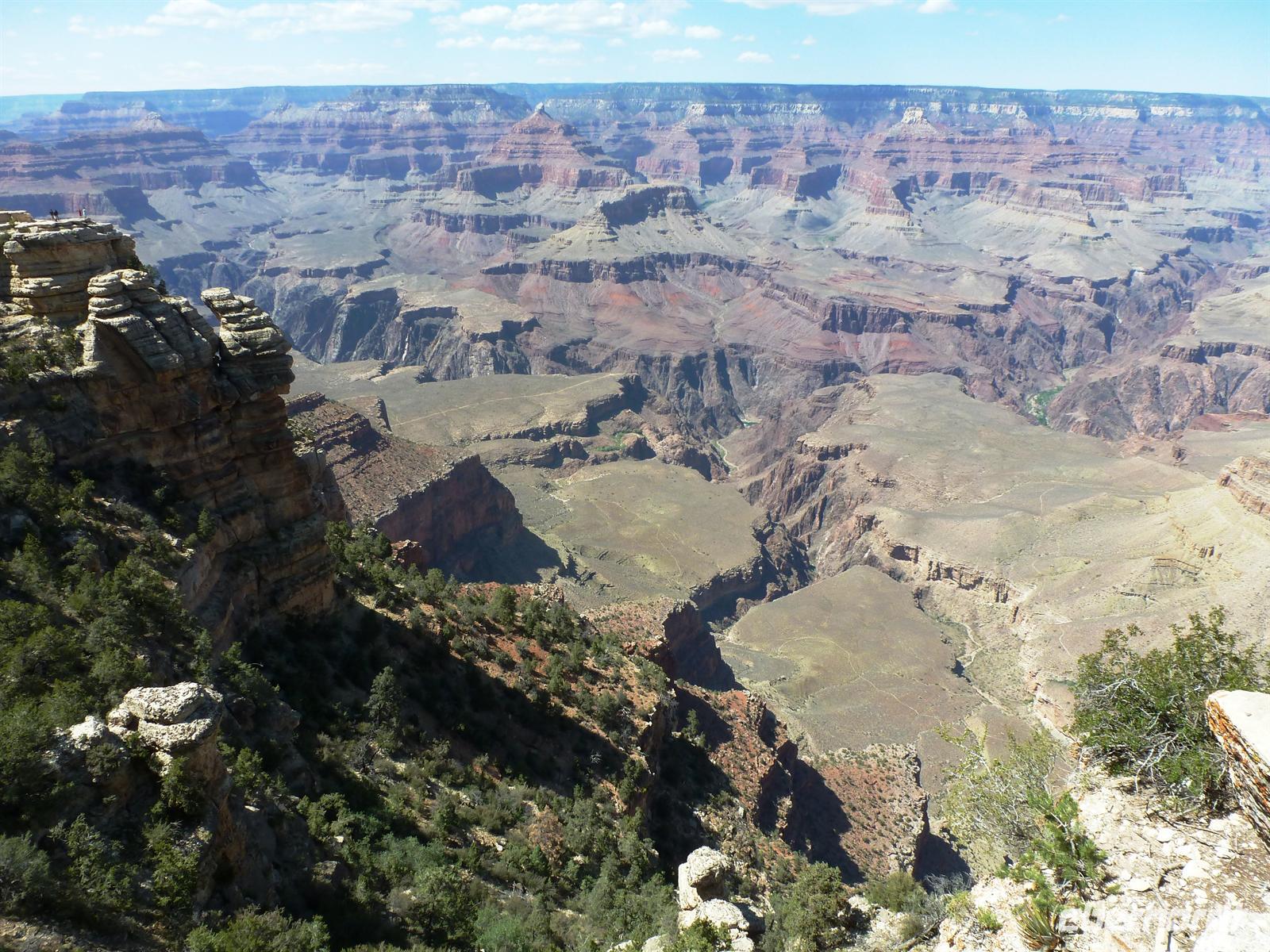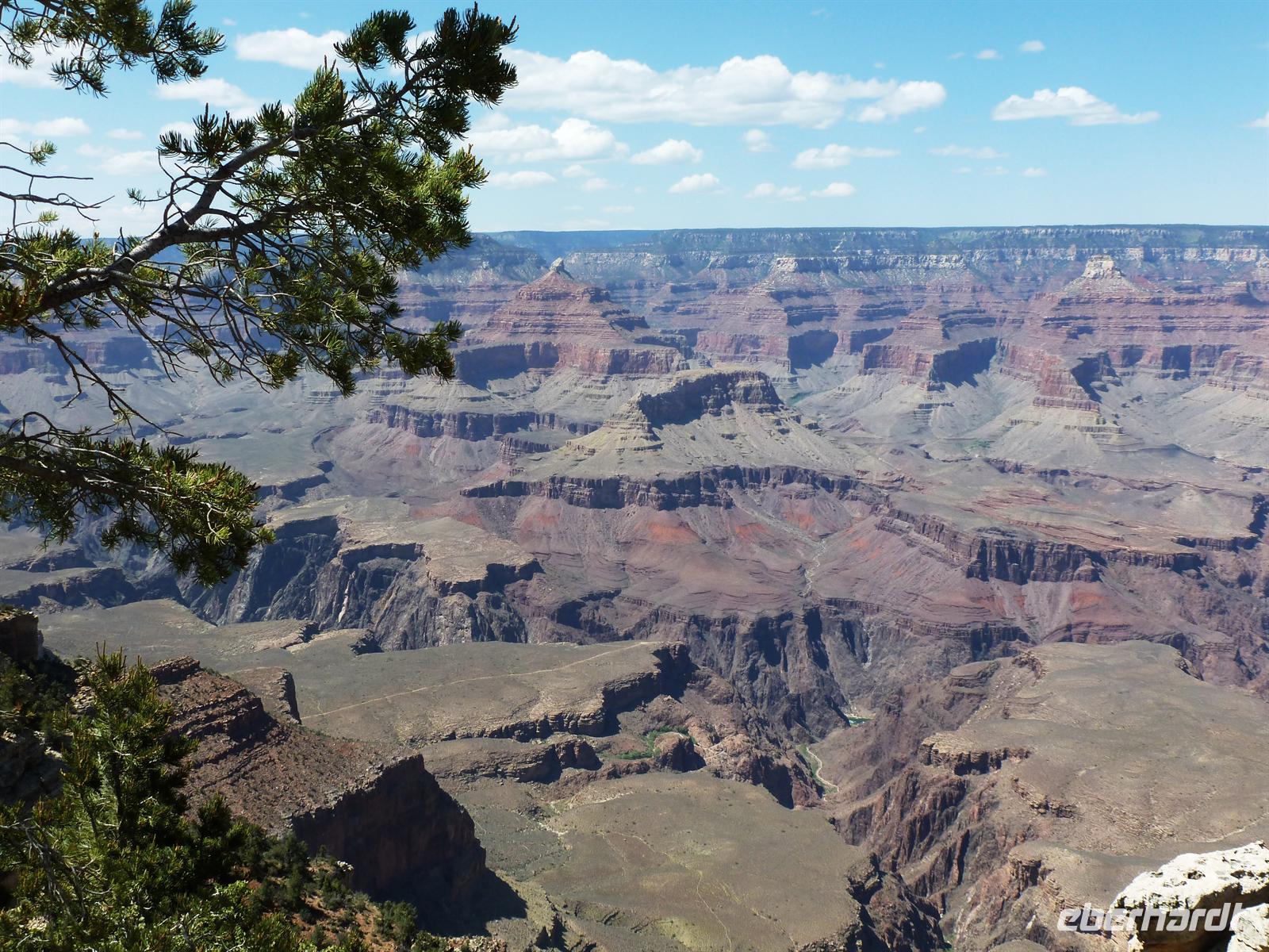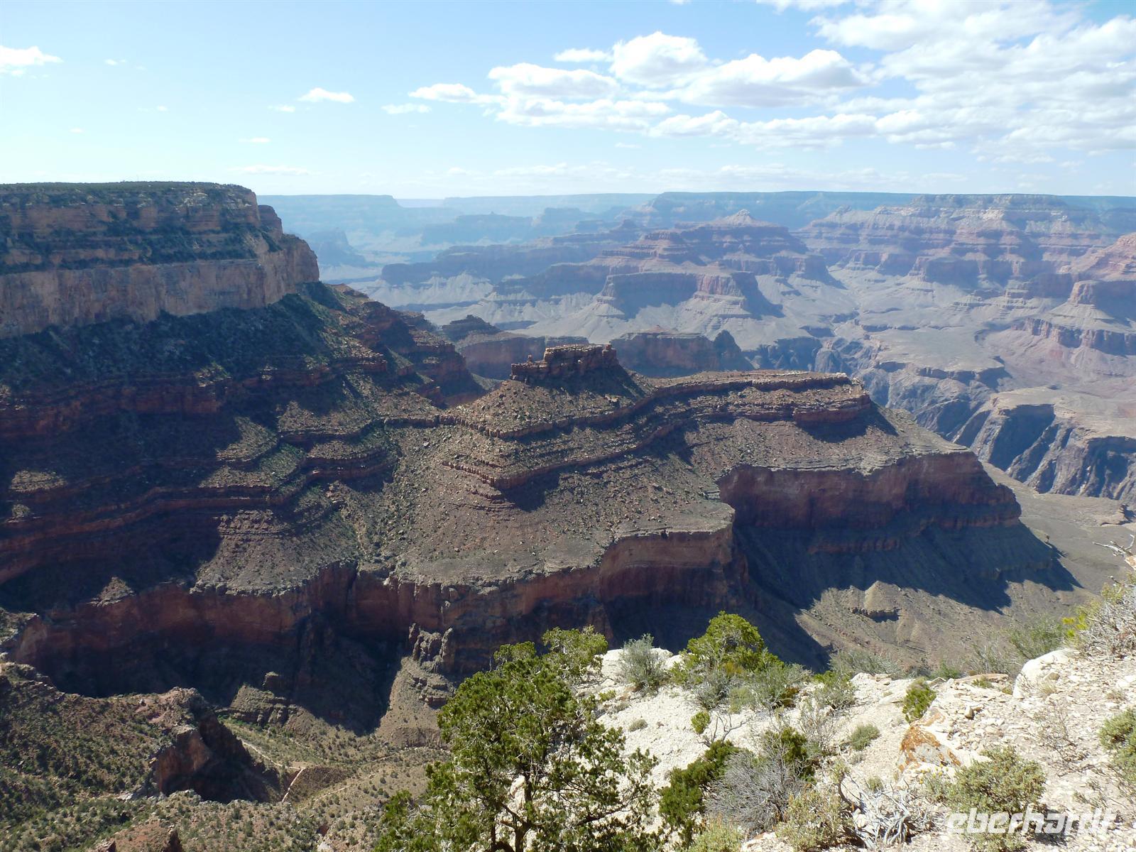 Powell und besichtigten den beeindruckenden Glen Canyon Damm, welcher eine Breite von 387 Metern erreicht und den Colorado River in Arizona anstaut. Nicht weit vom Damm spannt sich die 213 Meter lange Glen Canyon Brücke über den Fluss. Überquert man diese, befindet man sich nicht viel später auf Indianerland, in der Navajo-Reservation. Hin und wieder sieht man mal einen Hogan, die traditionelle Behausung der Navajos. In der Sprache der Navajos bedeutet das Wort Hogan „Zuhause“. In heutiger Zeit ist es meist eine sechseckige Hütte aus Balken, Erde und Lehm mit einem nach Osten gewandten Eingang. Ansonsten bekamen wir eher ärmliche Trailer und heruntergekommene Häuser zu Gesicht. Was leider eher der indianischen Realität entspricht. Durchs Painted Desert, wo uns ein Sandsturm und eine Windhose streifte und unseren Bus kräftig durchschüttelte, ging es weiter in Richtung Grand Canyon Nationalpark, welchen wir gegen Mittag erreichten. Welch überwältigender Ausblick erwartete uns hier! Der Colorado River hat auf einer Länge von mehr als 400 Kilometern im Laufe von Jahrmillionen eine gigantische Schneise in das Hochplateau geschnitten und diesen fantastischen Canyon geschaffen. Nicht nur die schiere Größe beeindruckt, sondern gleichsam das immer wieder wechselnde Spiel von Licht und Schatten. In Zeiten von analogen Filmrollen hätte man wahrscheinlich einen Rucksack voller Filme gebraucht, um alles aufs Bild zu bannen. Heute braucht es nur eine kleine Speicherkarte und man fängt die Großartigkeit des Seins in vielen Facetten ein. Von Mothers Point aus wanderten wir zur vier Kilometer entfernten Bright Angel Lodge, immer entlang der steil abfallenden Canyon-Wände und immer das großartige Panorama vor Augen. Spektakulär, Beispiellos, Unvergesslich. Aber mit Worten lässt sich die Aussicht, die sich dem Besucher bietet, unmöglich beschreiben. Eigentlich war zum Abschluss dieses einzigartigen Tages noch ein Helicopterflug über den Grand Canyon geplant, doch mussten wir diesen wegen zu starken Windes auf den nächsten Morgen verschieben. Auf dem Weg zu unserem Hotel in der Nähe des Canyons sahen wir noch einige Wapitis im Wald stehen, die sich durch unsere Anwesenheit glücklicherweise nicht stören ließen.