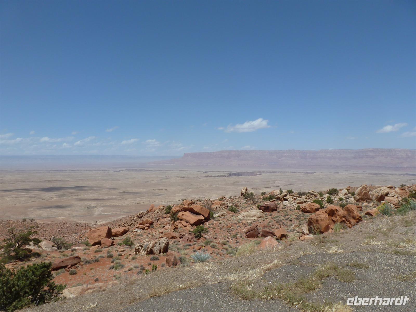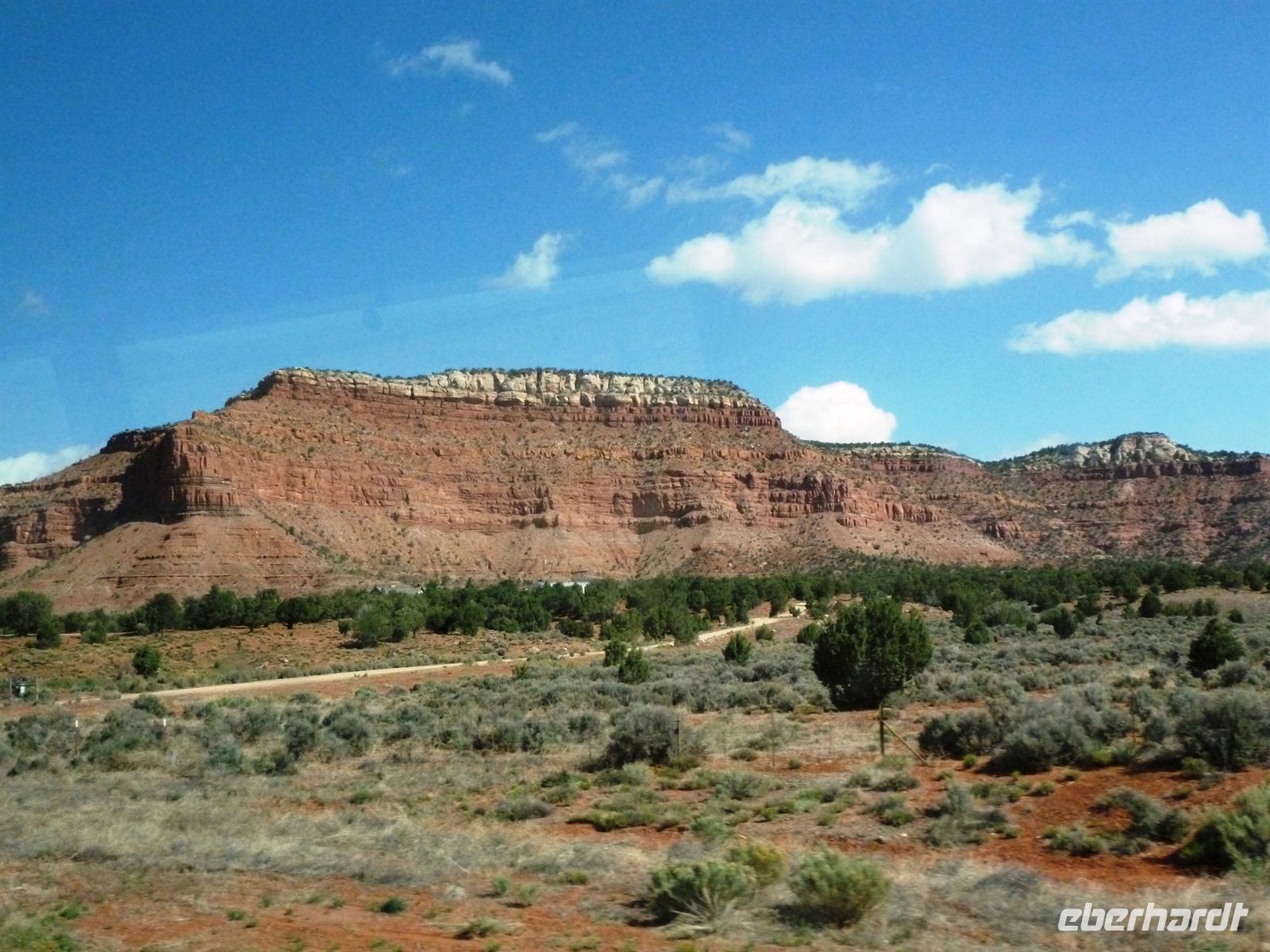 Die fantastischen Bilder vom Bryce Canyon noch im Kopf und vom reichhaltigen Buffet gestärkt, machten wir uns auf den Weg zu einer der bekanntesten geologischen Formation unserer Erde, dem weltberühmten Grand Canyon. Bei trübem Wetter fuhren wir wieder durch den Red Canyon, welcher ohne die farbliche Intensität des Vortages ein wenig beeindruckendes Bild bot. In Mt. Carmel Junction machten wir eine kurze Pause, bevor wir durch „Little Hollywood“, wie das kleine Städtchen Kanab genannt wird, fuhren. In den letzten gut achtzig Jahren wurden hier mehr als 100 Filme gedreht, in der Mehrheit Western. Filmstars wie Marilyn Monroe, Gregory Peck oder John Wayne verbrachten hier viele Drehtage- und Wochen. Wenig später erreichten wir den Lake