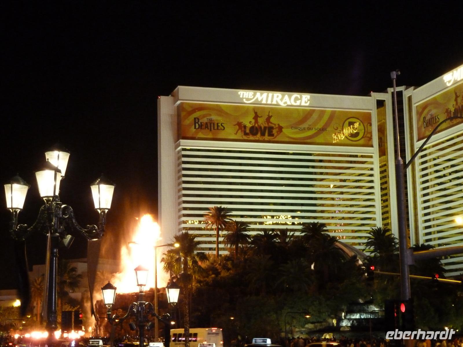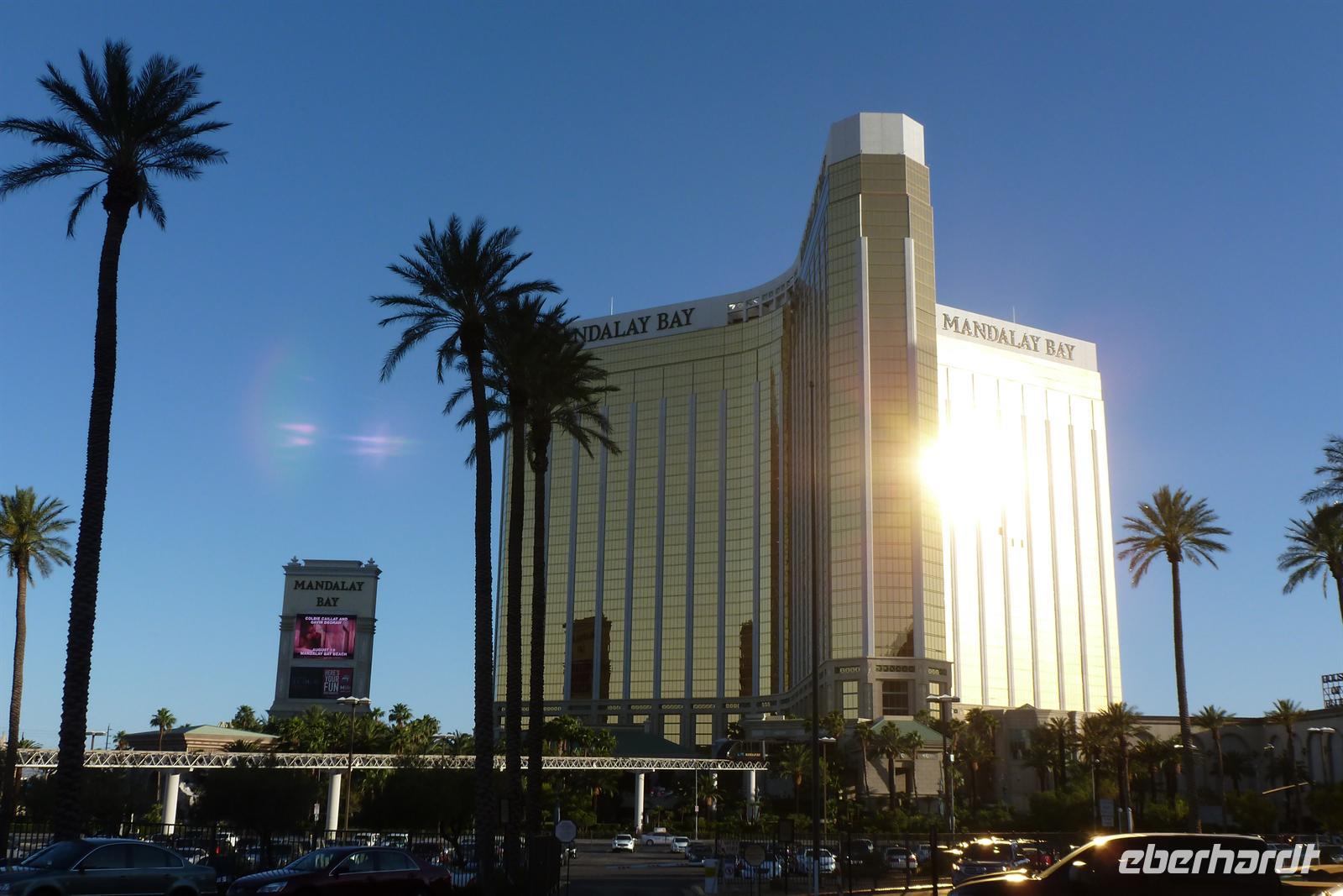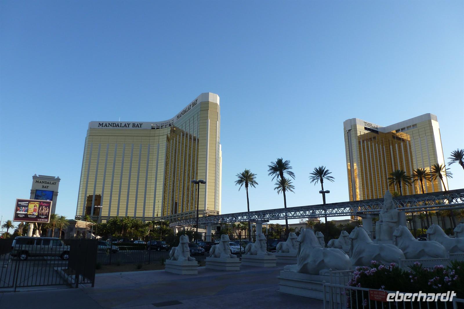 Nächstes größeres Etappenziel sollte Las Vegas, The Gambling Capitol oft the World, sein. Zwei Nächte verbrachten wir in der Stadt der Spieler, Glücksritter und Vergnügungssuchenden. Doch zuvor statteten wir dem kleinen Örtchen Seligman an der legendären Route 66 einen Besuch ab, der von sich selbst behauptet, die Geburtsstätte der historischen Straßenverbindung von Chicago nach Santa Monica zu sein. Im gern besuchten Barbershop kann man mit Angel Delgadillo, dem Besitzer, über längst vergangene Zeiten plaudern und viele Memorabilien besichtigen. Angeblich war Seligmann auch das Vorbild für die Darstellung des Ortes Radiator Springs im weltweit erfolgreichen Animationsfilm „Cars“. Im örtlichen Diner kehren die Easy Rider und Street Biker ein, was sich an der stattlichen Anzahl an schweren Maschinen belegen lässt, die davor parken. Mit dem gewissen „Born to be wild“ Gefühl setzten wir unsere Fahrt nach Las Vegas fort, vorbei am Hoover-Damm, immer tiefer in die Wüste Nevadas hinein. Dann endlich erschien sie vor uns, beinahe wie eine Fata Morgana. Die Stadt der Abermillionen Lichter, der immerwährend geöffneten Casinos, der gigantischen Shows am Las Vegas Boulevard, dem Strip, die mehr Hotelzimmer vereint, als New York, Chicago, Los Angeles und San Francisco zusammen. Und ähnlich wie am Grand Canyon überkommt einen wieder das Gefühl, inmitten der Menschenmassen, Hotelgiganten und des Entertainment-Wahnsinns klein und winzig zu sein. Unser Refugium, dass 4-Sterne Hotel „Luxor“, direkt am Strip gelegen und einer ägyptischen Pyramide nachempfunden, stellt uns vor ganz neue Herausforderungen hinsichtlich Orientierungsinn und der Zuordnung von Zeit, wenn es gilt, vom Zimmer zur Lobby oder zum Ausgang zu kommen. Da sind Wege zurückzulegen, die in einer Kleinstadt auch anfallen würden. Nur das man hier in einem Hotel ist und nicht die Nachbargemeinde besucht. Nach einem ersten Rundgang durchs Hotel und kurzer Akklimatisierungsphase trafen wir uns alle am frühen Abend wieder, um einen Vegas-by-Night-Trip zu machen. Millionen Lichter begleiteten uns auf unserer Tour, die im Bellagio mit den fantastischen Wasserspielen begann, über das Hotel Venetian und das Hotel Mirage mit dem künstlichen Vulkanausbruch weiterführte und in Downtown Las Vegas mit einer Lightshow auf der weltgrößten LED-Wand über der Fremontstreet endete. Alles, was wir an diesem Abend zu Gesicht bekamen, war in den entsprechenden Kategorien einzigartig oder gigantisch. Eine Stadt der Superlative. Für Spieler. Für Touristen. Für die Eigentümer der Casino-Hotels. Für alle anderen ist es einfach nur eine grelle, laute und bizarre Ansammlung von Glas, Stahl, Beton und Egomanie inmitten der Wüste. Mag die Szenerie auch noch so strahlend erleuchtet sein, mögen die aneinandergereihten Wedding-Chapels nur von glücklichen Tagen zeugen, die Dunkelheit im Schatten der Casinos ist trotzdem zu erahnen.