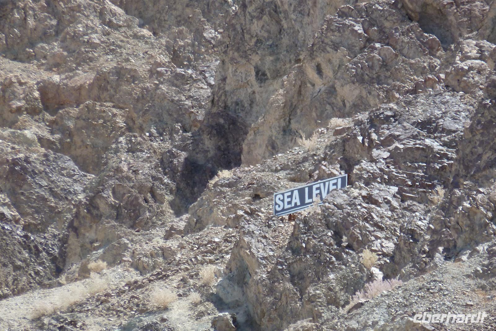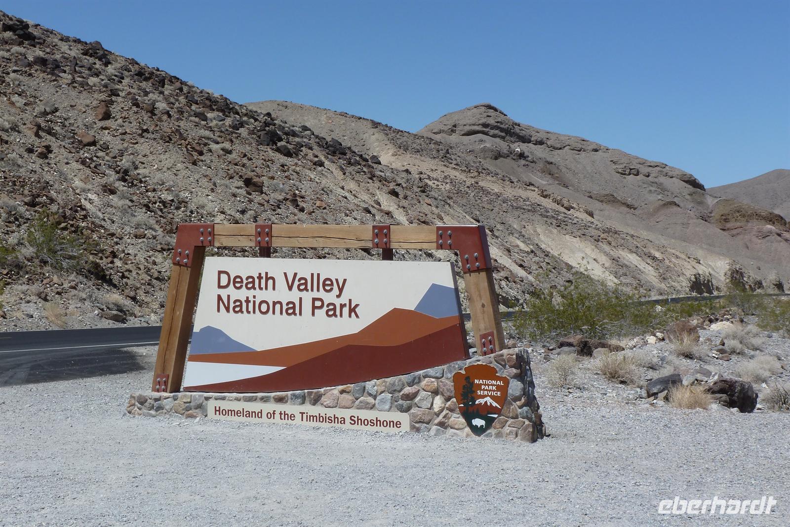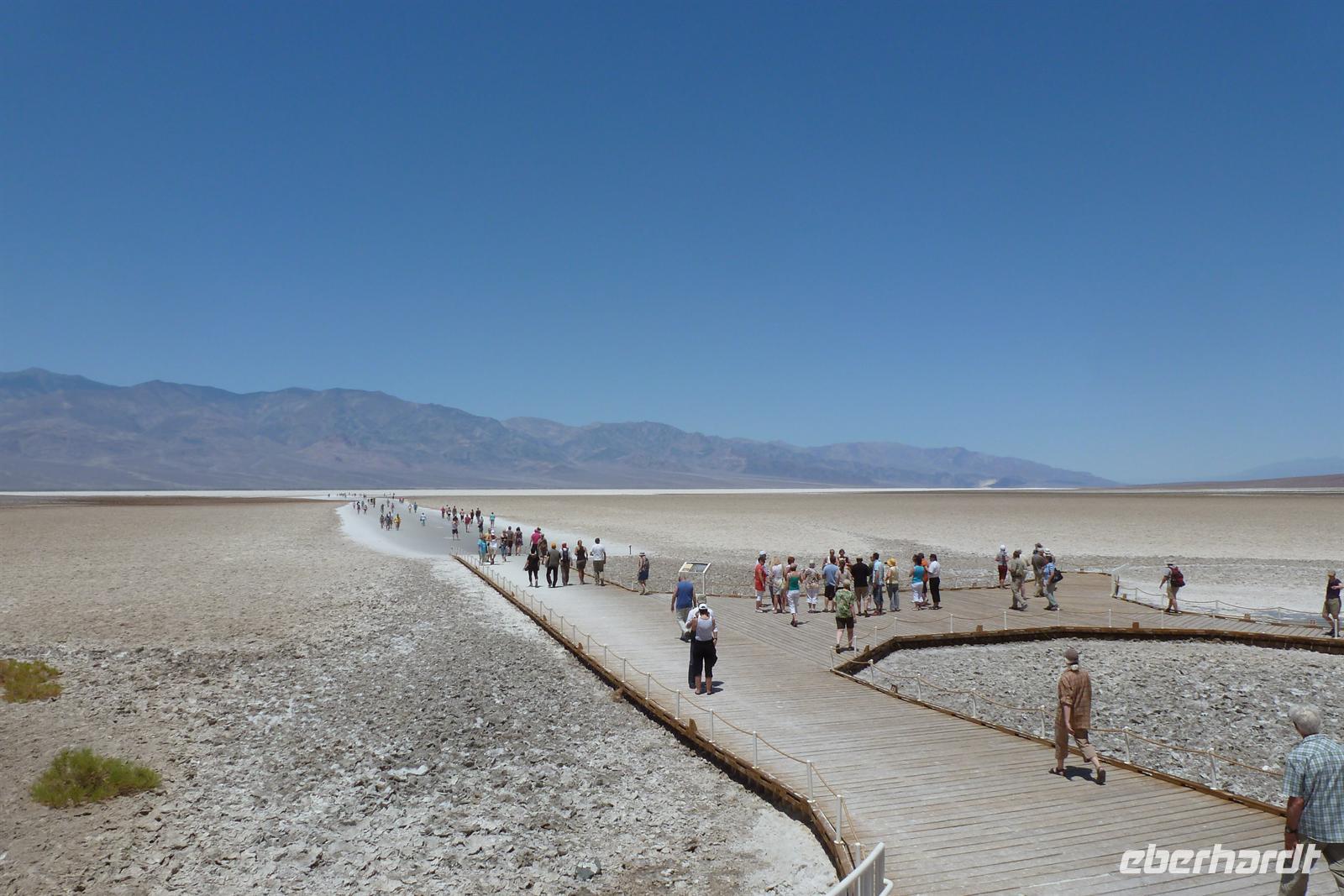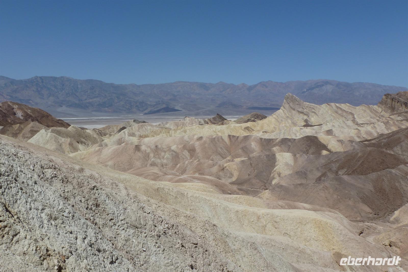Nach einem reichhaltigen und stärkenden Frühstücksbuffet verließen wir für kurze Zeit Las Vegas und machten uns auf, den heißesten Punkt unserer Erde im Death Valley, dem Tal des Todes, zu besichtigen. Von Nevada aus fuhren wir etwa zwei Stunden in Nordwestlicher Richtung, bevor wir den Death Valley Nationalpark erreichten. Unser erster Stopp war am Zabriskie Point, von wo aus man einen guten Blick auf die unwirtliche, leere und baumlose Landschaft werfen konnte. Weiter ging es zum Badwater-Point, 85 Meter unter dem Meeresspiegel gelegen und der heißeste Ort auf