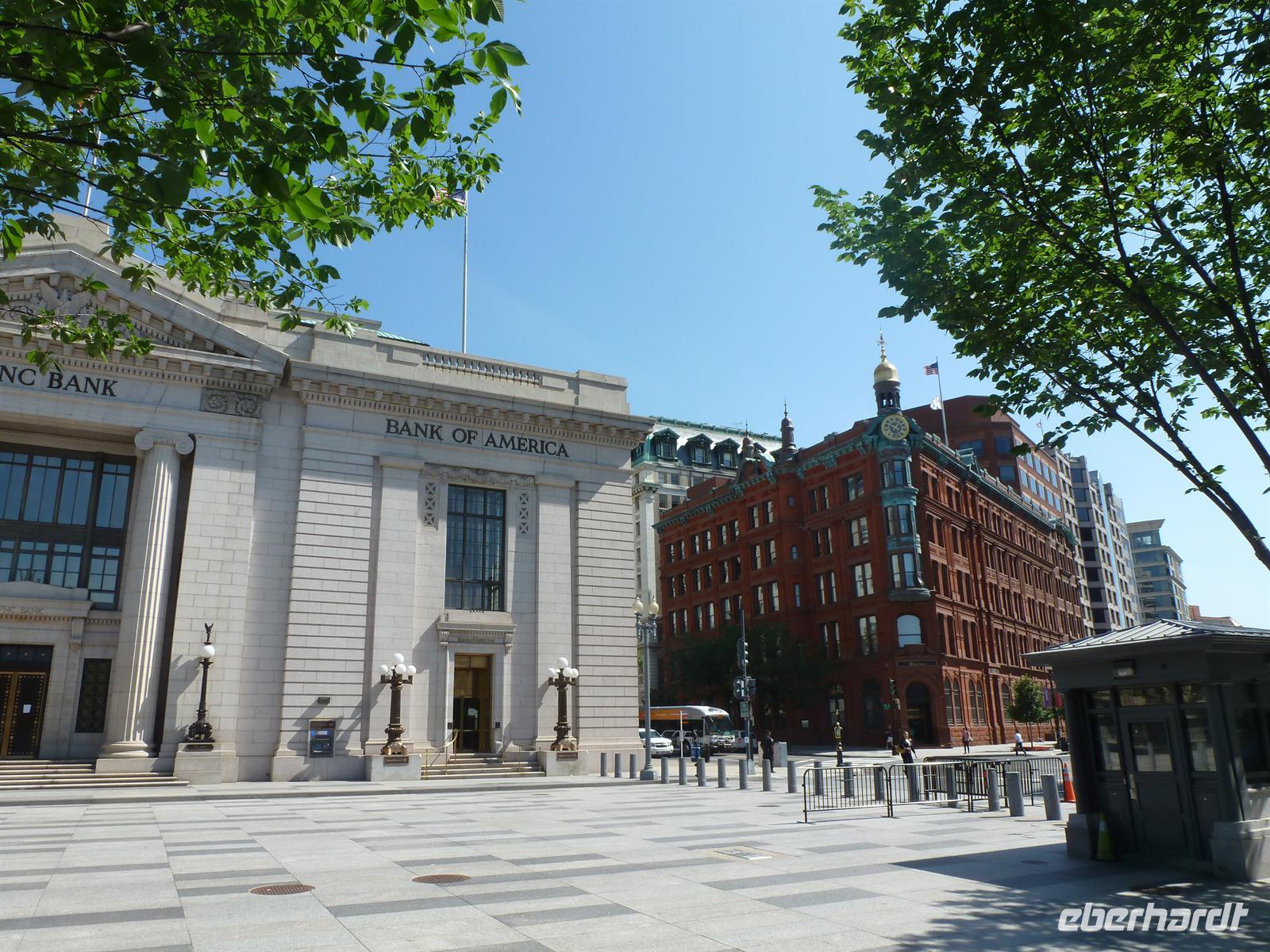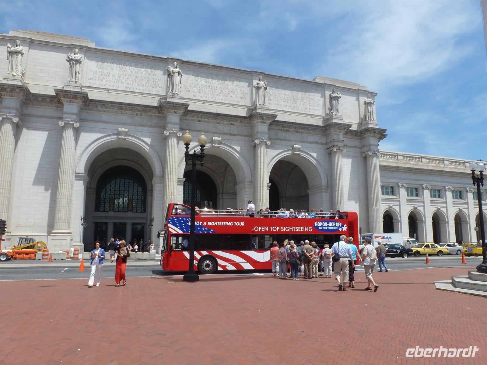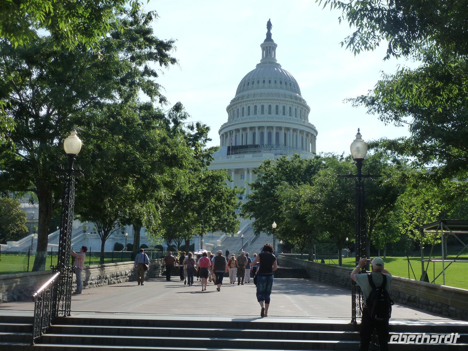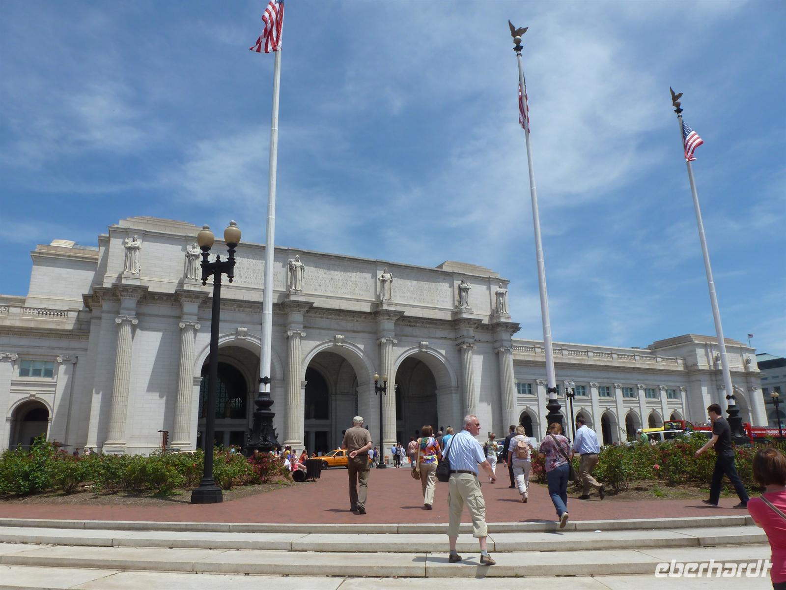 Uns schwebte keine Karriere vom Tellerwäscher zum Millionär vor, stattdessen wollten wir in knapp siebzehn Tagen die Highlights zwischen Atlantik- und Pazifikküste entdecken. Welch großes, vermessenes Unterfangen! Jedes einzelne Reiseziel auf unserer tollen Route ist tage-, nein, wochenlanges Entdecken und Erkunden wert. Aber so viel Zeit hatten wir und die meisten anderen Besucher nicht. Unsere Eberhardt-Reisegruppe traf sich aus Dresden, Berlin und Leipzig kommend das erste Mal vollzählig in Frankfurt. United Airlines brachte uns in knapp neun Stunden nach Washington D.C., wo wir bei strahlendem Sonnenschein und angenehmen 25 Grad am frühen Nachmittag landeten. Nachdem wir die Einreise- und Zollformalitäten ohne größere Probleme hinter uns gebracht hatten (sieht man mal vom einstündigen Schlange stehen an den Immigration-Counters ab), wurden wir am Ausgang des Dulles International Airports von unserer Reiseleiterin Janny, einer seit vielen Jahrzehnten in den Staaten lebenden Holländerin, freundlich begrüßt und empfangen. Mit dem Bus ging es die knapp 50 Kilometer nach Southwest Washington zu unserem Hotel. Nach dem Bezug unserer Zimmer und einem Abendessen im Hotel holte uns die Müdigkeit mit aller Macht ein (in Deutschland war es ja mittlerweile schon zwei Uhr morgens) und wir begaben uns zur ersten wohlverdienten Ruhe.