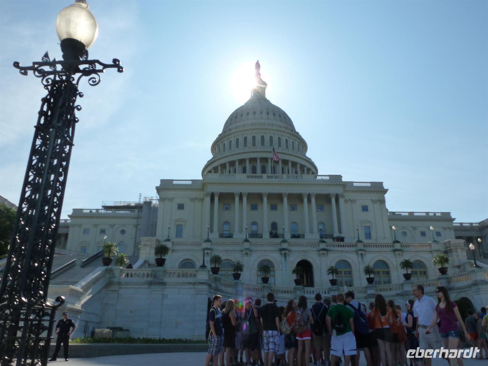 Nach einer kurzen Nacht (wegen der Zeitverschiebung) starteten wir voller Tatendrang in den neuen Tag. Das gute Frühstück und das tolle Wetter taten ihren Teil dazu. Mit unserer örtlichen Reiseleiterin Beate ging es auf Entdeckungstour durch die Metropole am Potomac. Erstes Ziel unserer Stadtrundfahrt war der geografische Mittelpunkt der Stadt, das Capitol, weithin sichtbar und von beeindruckender Größe und Bedeutung. Anschließend ging es über die Pennsylvania Avenue am Justizministerium, am Nationalarchiv und am FBI Building vorbei zum Weißen Haus, wo wir mit hunderten aufgeregten Schülern und Besuchern aus aller Welt den Sitz des Präsidenten aus der Ferne betrachteten.