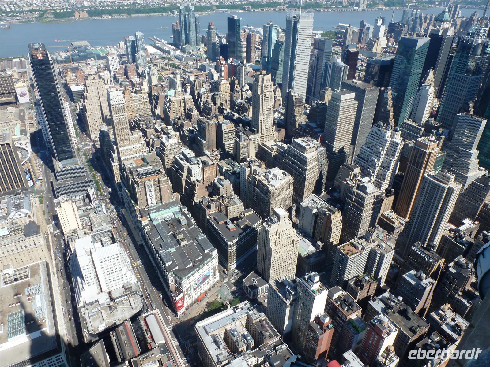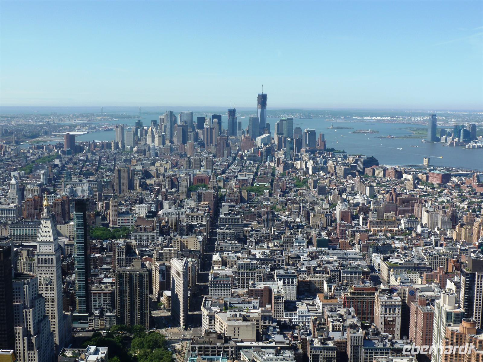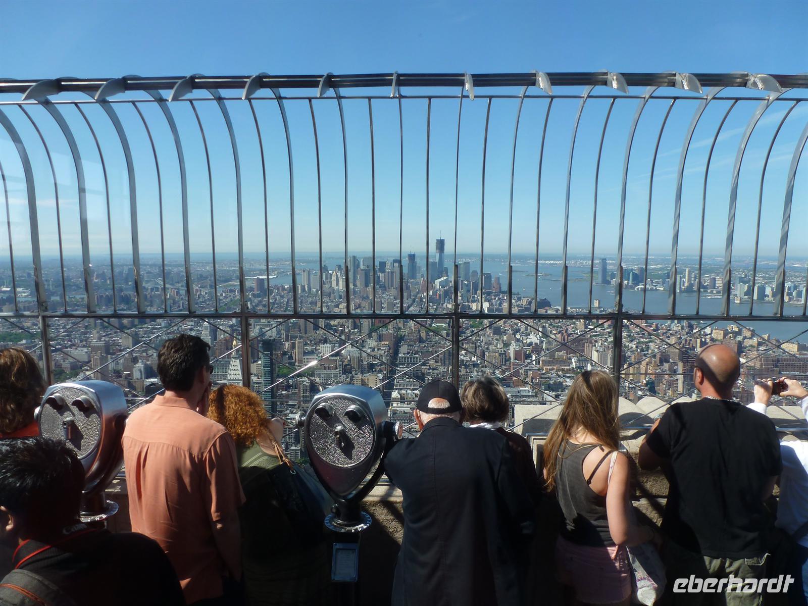 Unser Frühstück nahmen wir nicht in unserem New Yorker Hotel ein, sondern in einer kleinen Trattoria gleich um die Ecke. Ist es für uns Deutsche vielleicht etwas ungewohnt, außerhalb zu frühstücken, gehört es für viele New Yorker zum morgendlichen Ritual. Solchermaßen gestärkt ging es anschließend durch die Straßenschluchten Manhattans direkt zum Empire State Building. Jetzt hieß es, sich einen Überblick zu verschaffen. Und was wäre dazu nicht besser geeignet als der Blick von der 86. Etage eines Wolkenkratzers aus. Nach Sicherheitscheck und Schlange stehen vor den Fahrstühlen wurden wir in kurzer Zeit in 320 Meter Höhe „katapultiert“ (in Wahrheit merkt man davon fast nichts) um dann von der Aussichtsplattform einen atemberaubenden Blick über New York und New Jersey zu genießen. Das Wetter meinte es auch gut mit uns und so konnten wir bei wenig Wind und guter Sicht den Blick lange Zeit rundum schweifen lassen.