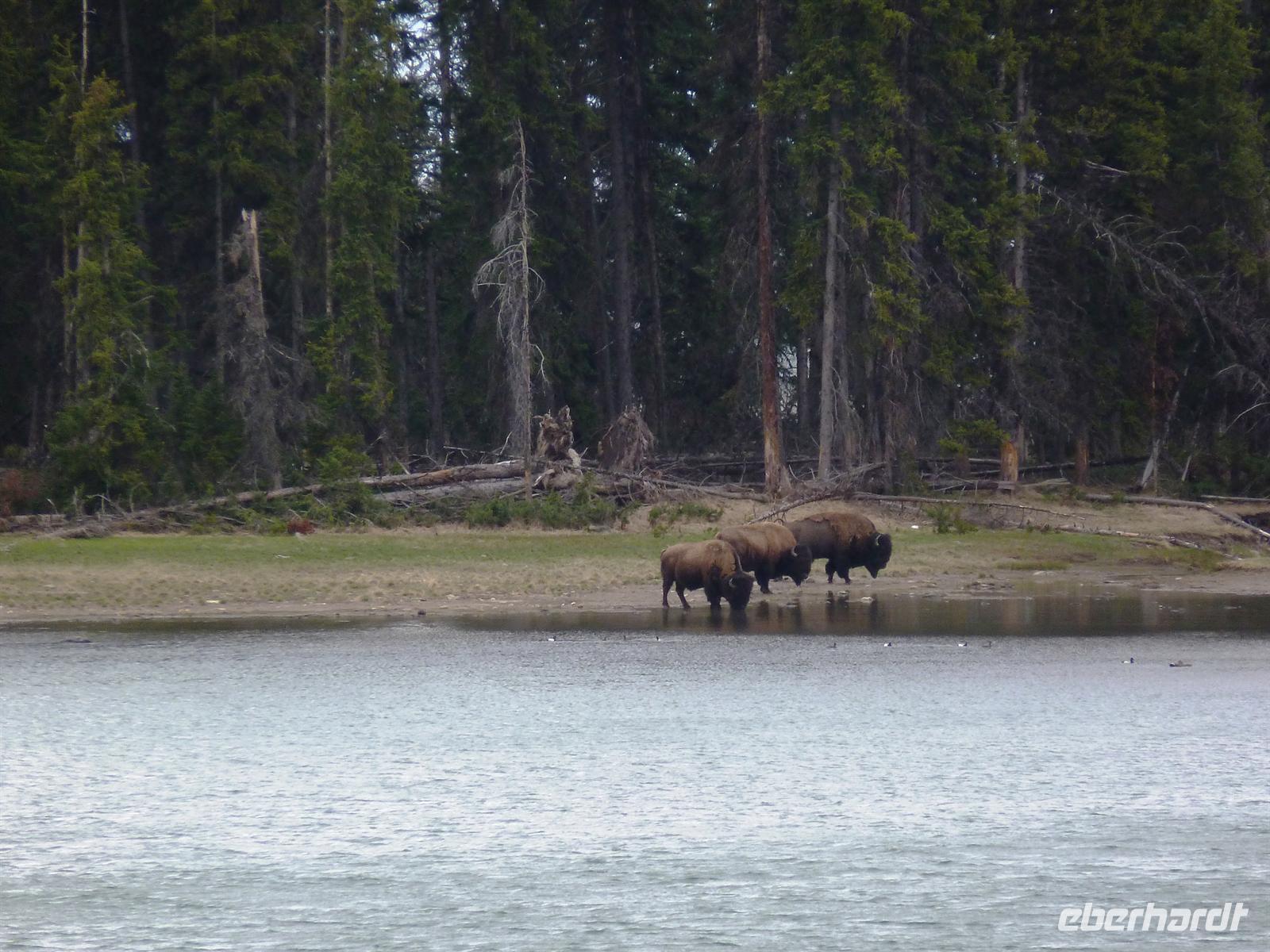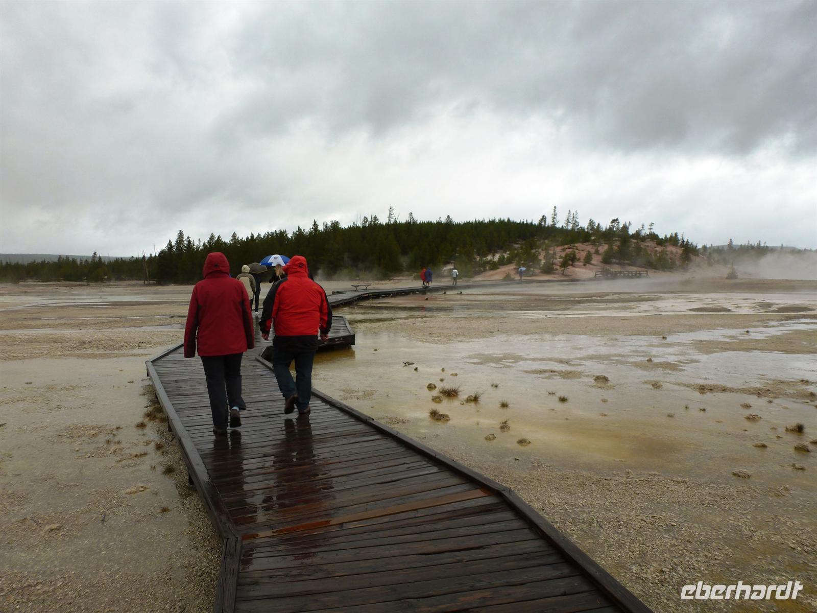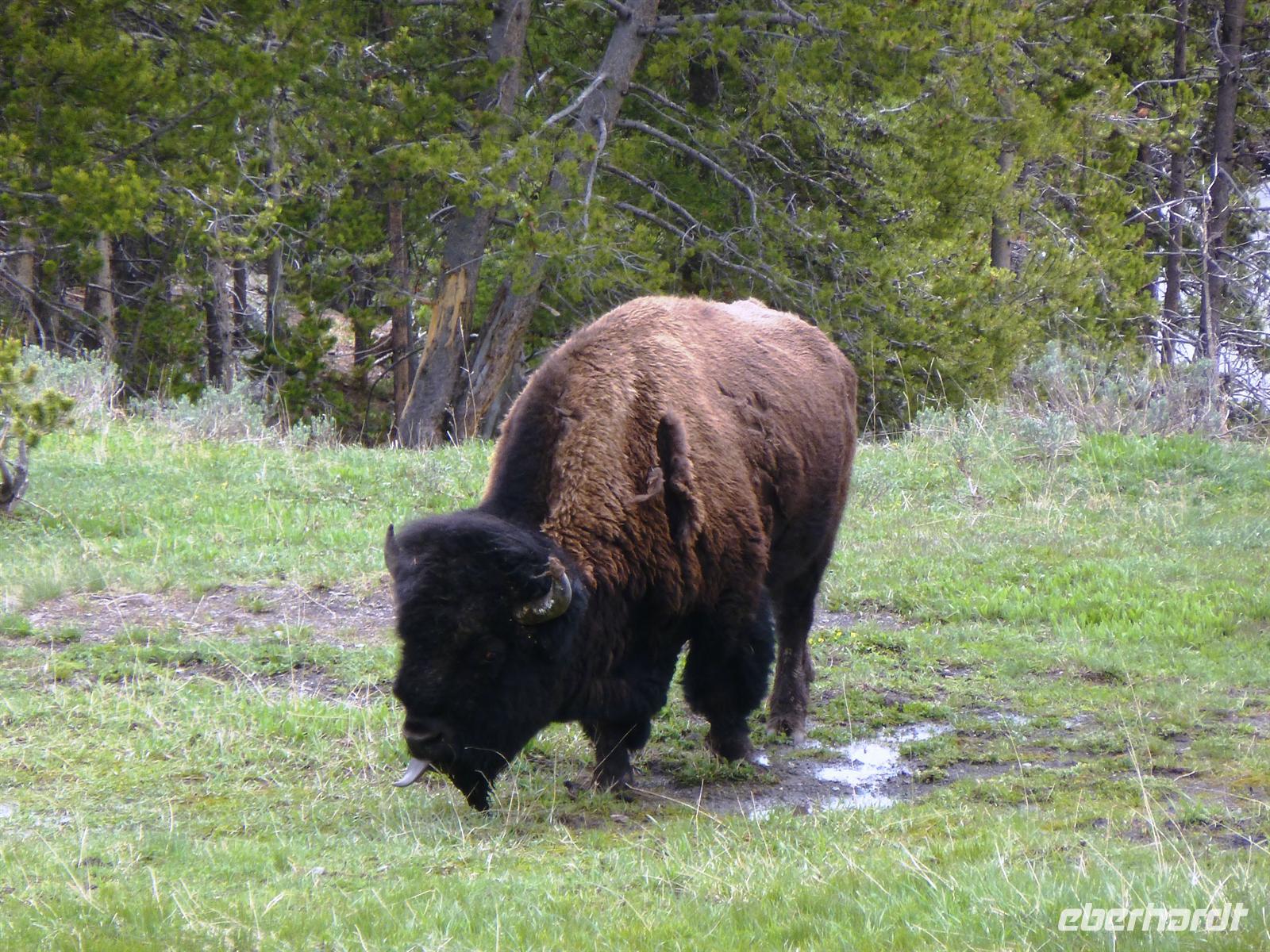 Wir verließen Cody in westliche Richtung und erreichten den Yellowstone-Nationalpark über die östliche Einfahrt. Wir sahen die ersten Bisons, die noch mit großer Freude und Aufregung wahrgenommen und fotografiert wurden, bevor wir am Mud Volcano, einem Schwefel-Schlammloch unseren ersten längeren Stopp einlegten. Die Landschaft war wunderschön und wir erfuhren viel Wissenswertes über die Besonderheiten und die Geschichte des Nationalparks. Leider wurde das Wetter immer schlechter und die Temperatur kühlte sich merklich ab. Regenschauer und maximal sechs Grad Wärme zwangen uns zu winterlichen Verhüllungen. Nach einer Mittagspause in Canyon Village fuhren wir zum Grand Canyon of the Yellowstone und besichtigten die beeindruckenden Wasserfälle, die sich aus dreiundneunzig Metern Höhe in die Schlucht ergießen. Trotz des anhaltend schlechten Wetters ließen wir uns nicht entmutigen und machten einen weiteren Fotostopp am Norris Geyser Basin, wo wir bei strömenden Regen die Schwefelquellen und Geysire besichtigten (hier befindet sich mit dem Steamboat Geysir auch der größte aktive Geysir der Welt!), bevor wir zu unserem heutigen Etappenziel nach West-Yellowstone weiterfuhren. Beim Abendessen in einem kleinen Restaurant unweit unseres Hotels stand Bison auf dem Speisezettel. Dieser wurde in Form eines Hackbratens gereicht und schmeckte wider Erwarten den Meisten ganz gut.