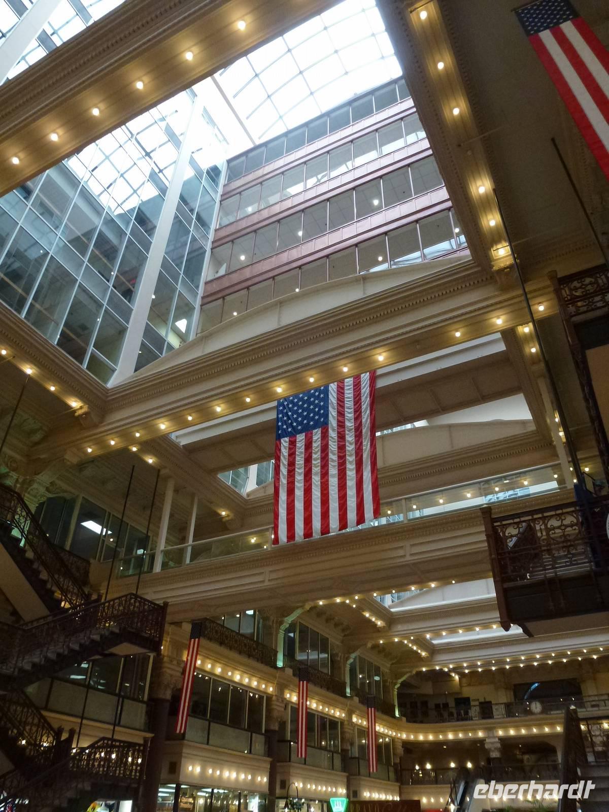 Heute heißt es Abschied nehmen von der Hauptstadt der USA. Nach dem Frühstück starten wir in Richtung Norden. Auch heute werden wir wieder mehrere Bundesstaaten durchqueren und auf dem Weg zu unserem Tagesziel passieren wir so schon mal Maryland und Delaware, wo wir einen kurzen Erfrischungsstopp einlegen. Weiter geht es nach Pennsylvania - dem „Gründungsstaat" der USA. Denn hier liegt auch Philadelphia, dem wir einen Besuch abstatten. Bei der Einfahrt in die geschichtsträchtige Metropole sorgt Janny mit der richtigen Musik für eine passende Untermalung. Zu den Klängen von Bruce Springsteens „Philadelphia" und der unverkennbaren Triumph-Musik von Sylvester Stallones Boxfilm „Rocky" rollen wir ein und nehmen unseren Stadtführer Nick, ein geborener Leipziger, auf. Wir begeben uns auf eine kleine Stadtrundfahrt und legen den ersten Fotostopp an den Treppen ein, die durch Stallones Film Weltberühmtheit erlangten. Da sich niemand anderes freiwillig zur Verfügung stellt, ringe ich mich durch und spiele die Filmszene inklusive Treppenlauf und Jubelszene - dazu sollten Sie sich die passende Bildergalerie zur Reise anschauen - nach. Aber nun soll endlich die Geschichte der von William Penn gegründeten Stadt im Vordergrund stehen und darum fahren wir ins historische Zentrum, wo wir aber erstmal im wunderschönen Gebäude der Bourse eine Mittagspause einlegen. Dann geht's aber los mit einem Blick auf die berühmte Freiheitsglocke und dem Besuch der Independence Hall. Bei einer Führung erfahren wir alles - die Führung findet auf Englisch statt, aber unser Guide gibt uns die wichtigsten Fakten weiter - über den Weg zur und die endgültige Unabhängigkeitserklärung der USA am 04.07.1776. Natürlich fehlen auch keine Ausführungen über das Wirken der berühmtesten Initiatoren dieser Trennung von den europäischen Kolonialherren, George Washington und Thomas Jefferson. Am Nachmittag starten wir dann gut informiert in Richtung New York und bevor wir die Großstadt und den gleichnamigen Bundesstaat erreichen, sammeln wir noch einen Bundesstaaten-Punkt in New Jersey. Ohne größere Verkehrsprobleme erreichen wir die „... city that never sleeps...", wie uns Frank Sinatra bei der Durchquerung des Lincoln-Tunnels passend entgegen schmettert. ALLE sind beeindruckt von der Größe und Lebendigkeit New Yorks vor allem als wir zum ersten Mal Broadway und Times Square überqueren. Ein bleibender Eindruck, obwohl uns Manhattan recht unfreundlich mit einem gewaltigen Wolkenbruch begrüßt. Es bleibt Zeit für erste eigene Erkundungen bevor wir uns zur Abfahrt zum Abendessen treffen. Es geht ins japanische Restaurant Benihana, wo wir in kleineren Gruppen bei der frischen Zubereitung auf einem heißen Stein direkt am Tisch auch durch allerlei Showeinlagen der Köche verwöhnt werden. Ein paar Gäste entscheiden sich direkt vom Restaurant zum Hotel zu laufen, alle anderen brechen vom Hotel aus nochmal zum taghell erleuchteten Times Square auf. Auf die Idee ins Bett zugehen, kommt hier vorerst niemand...