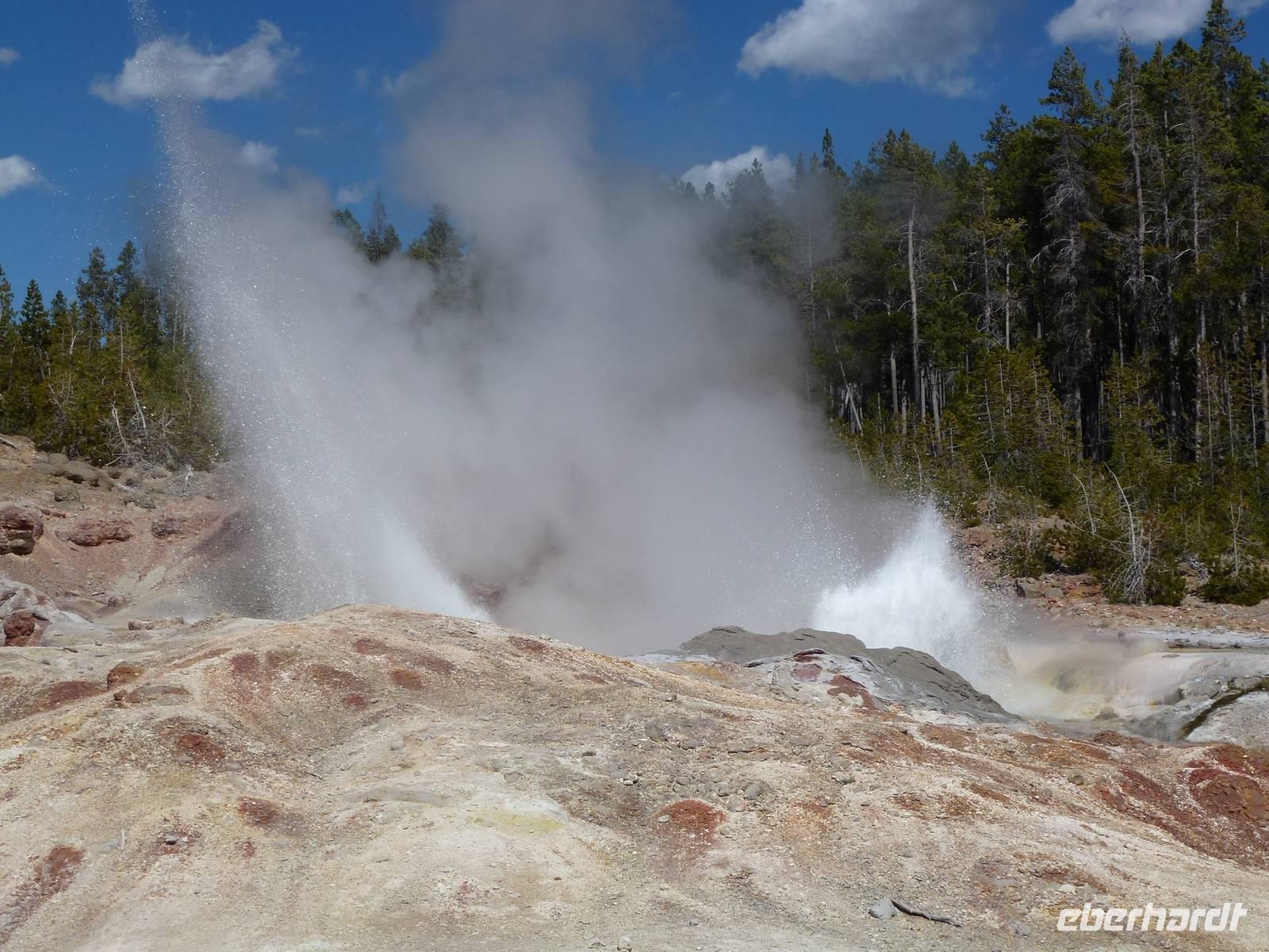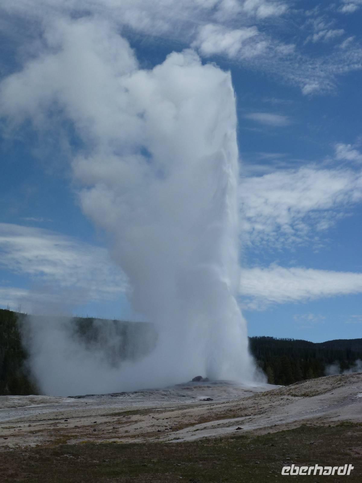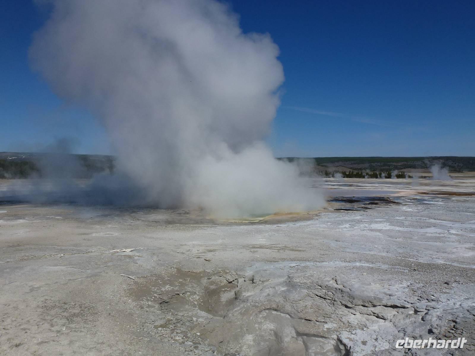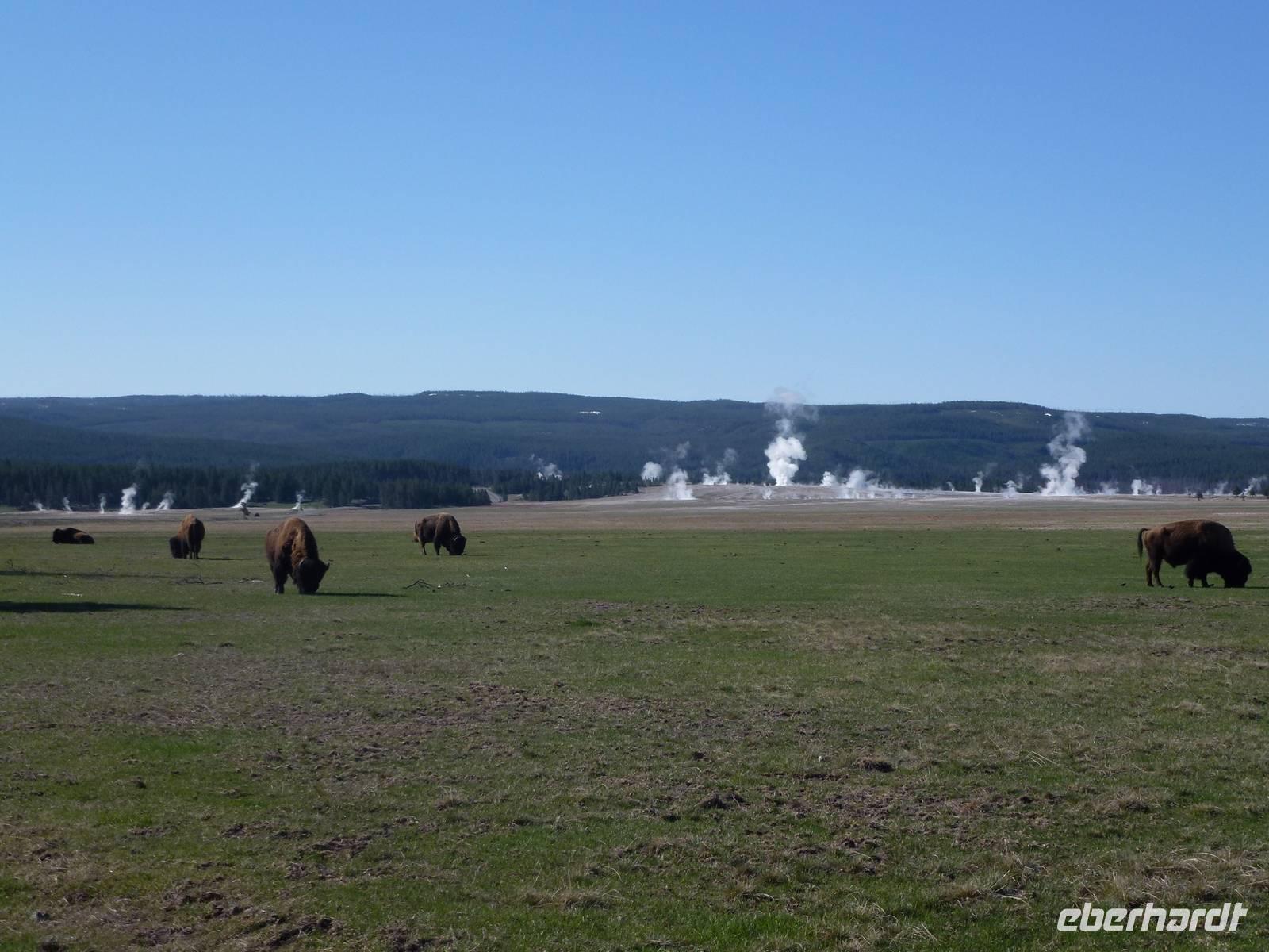 Nach dem Frühstück, welches heute am Tisch serviert wird, laden wir Koffer und kehren zurück in den Yellowstone Nationalpark, um die noch fehlenden Attraktionen zu besuchen. Wie auch gestern gibt uns Don die volle Countrymusik-Dröhnung im Bus, aber noch kommen alle mit Johnny Cash & Co gut klar... Direkt nach Abfahrt begleiten uns erstmal 6 ausgewachsene Büffel einen kleinen Teil des Weges und so beginnen wir auch heute direkt mit den Tieraufnahmen. Den Vormittag widmen wir nochmal der vielfältigen geothermalen Aktivität, die den Yellowstone NP auszeichnet. Wir starten am Lower Geyser Basin, wo uns farbenfrohe Schlammtöpfe und jede Menge Heisswasserbassins erwarten. Die Erde brilliert in allen Farben und dank des wieder hervorragenden Wetters gelingen tolle Aufnahmen. Anschließend fahren wir zum Midway Geyser Basin. Da besuchen wir den bekannten Grand Prismatic Spring, eine in allen Farben schimmernde Heißwasserquelle. Ganz besondere Aufmerksamkeit ziehen zwei Stellen auf sich, wo das heiße Wasser der Quellen zischend in einen kühlen Gebirgsbach fliesst. Apropos Gebirgsbach - aus meiner Sicht eine optimale Stelle für eine auf meinen Reisen traditionelle Wasser-Challenge. Allerdings steige ich diesmal allein ins 10 Grade kalte Wasser und genieße die Erfrischung. Nun heißt es Abfahrt zum Old Faithful, der vielleicht bekanntesten Springquelle der USA. Relativ regelmäßig aller 70-80 Minuten spuckt er eine Wasserfontäne über mehrere Minuten in die Luft. Die wichtigste Information, die man bei Ankunft im Gebiet also benötigt ist die der nächsten Eruption. Die Zeit findet man im wunderschönen Old Faithful Inn angeschlagen und für unsere Gruppe heißt es Ausbruch um 11.56 Uhr... Und so sitzen wir erwartungsfroh wie vor einer Theaterbühne und sind auf das Naturschauspiel gespannt. Der "alte Zuverlässige" lässt uns dann aber ganz schön zappeln und eruptiert mit 20 Minuten Verspätung. Wie bei einem großen Künstler sind ihm natürlich dann noch mehr "Aaahs" und "Ooohs" sicher...