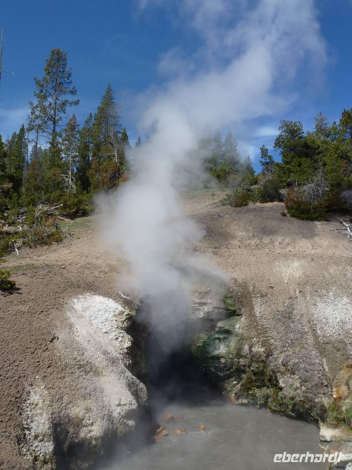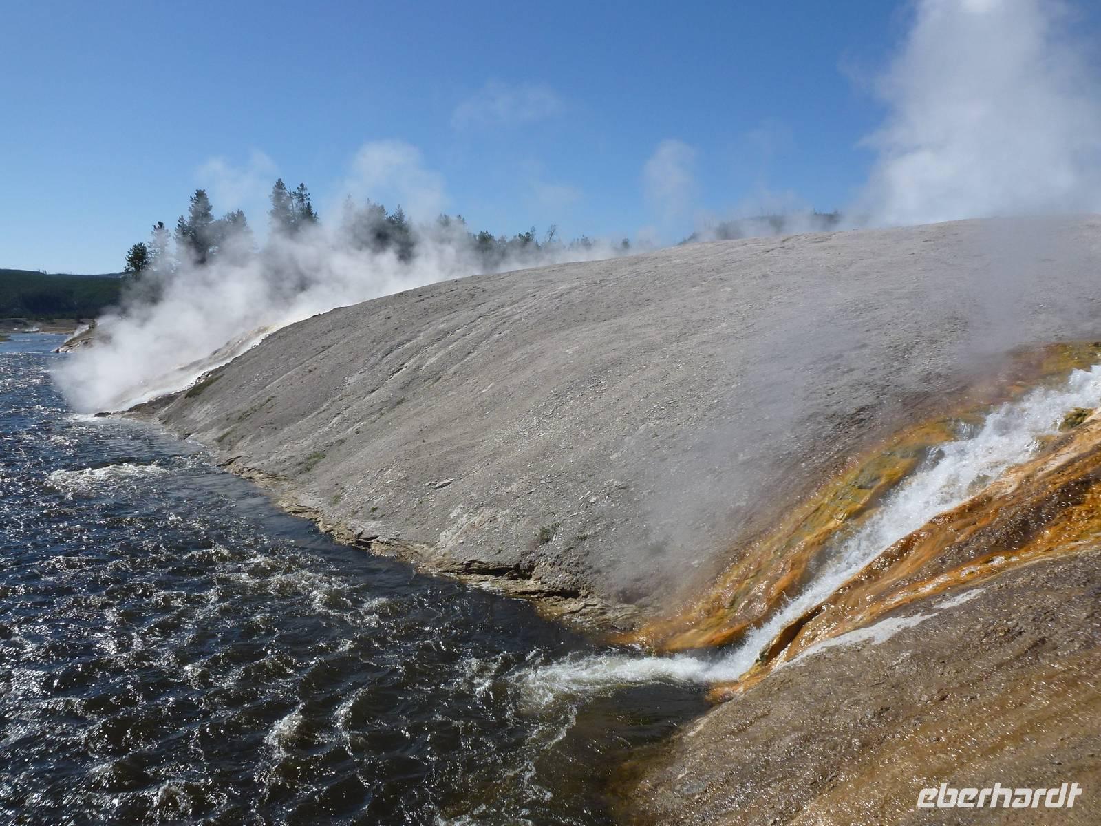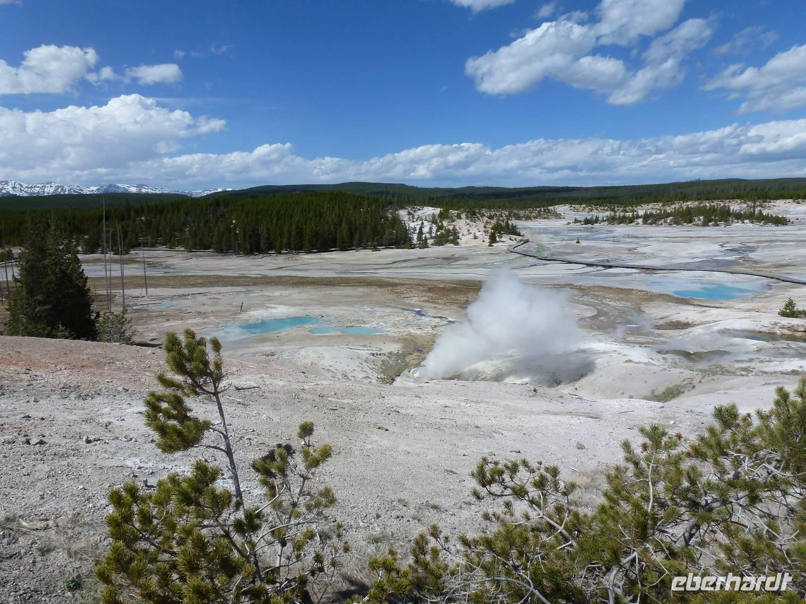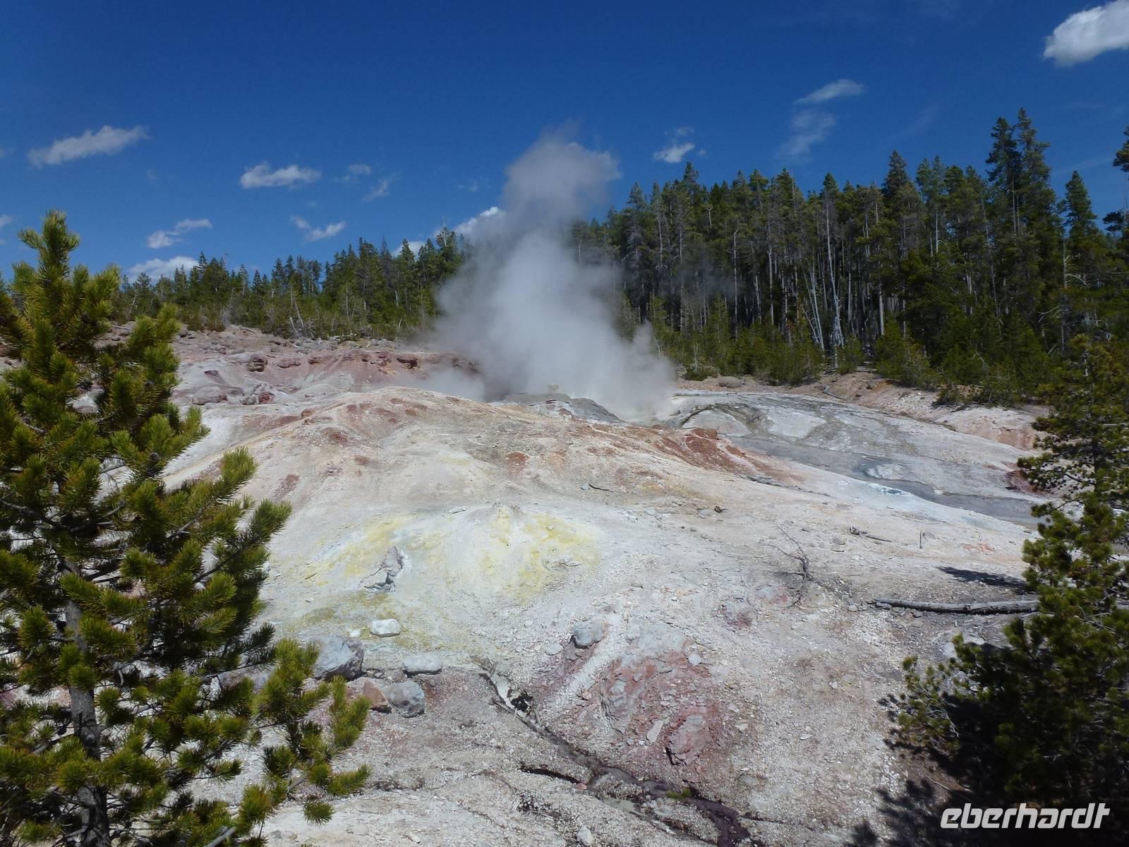Nach dem Frühstück, welches heute am Tisch serviert wird, laden wir Koffer und kehren zurück in den Yellowstone Nationalpark, um die noch fehlenden Attraktionen zu besuchen. Wie auch gestern gibt uns Don die volle Countrymusik-Dröhnung im Bus, aber noch kommen alle mit Johnny Cash & Co gut klar... Direkt nach Abfahrt begleiten uns erstmal 6 ausgewachsene Büffel einen kleinen Teil des Weges und so beginnen wir auch heute direkt mit den Tieraufnahmen. Den Vormittag widmen wir nochmal der vielfältigen geothermalen Aktivität, die den Yellowstone NP auszeichnet. Wir starten am Lower Geyser Basin, wo uns farbenfrohe Schlammtöpfe und jede Menge Heisswasserbassins erwarten. Die Erde brilliert in allen Farben und dank des wieder hervorragenden Wetters gelingen tolle Aufnahmen. Anschließend fahren wir zum Midway Geyser Basin. Da besuchen wir den bekannten Grand Prismatic Spring, eine in allen Farben schimmernde Heißwasserquelle. Ganz besondere Aufmerksamkeit ziehen zwei Stellen auf sich, wo das heiße Wasser der Quellen zischend in einen kühlen Gebirgsbach fliesst. Apropos Gebirgsbach - aus meiner Sicht eine optimale Stelle für eine auf meinen Reisen traditionelle Wasser-Challenge. Allerdings steige ich diesmal allein ins 10 Grade kalte Wasser und genieße die Erfrischung. Nun heißt es Abfahrt zum Old Faithful, der vielleicht bekanntesten Springquelle der USA. Relativ regelmäßig aller 70-80 Minuten spuckt er eine Wasserfontäne über mehrere Minuten in die Luft. Die wichtigste Information, die man bei Ankunft im Gebiet also benötigt ist die der nächsten Eruption. Die Zeit findet man im wunderschönen Old Faithful Inn angeschlagen und für unsere Gruppe heißt es Ausbruch um 11.56 Uhr... Und so sitzen wir erwartungsfroh wie vor einer Theaterbühne und sind auf das Naturschauspiel gespannt. Der "alte Zuverlässige" lässt uns dann aber ganz schön zappeln und eruptiert mit 20 Minuten Verspätung. Wie bei einem großen Künstler sind ihm natürlich dann noch mehr "Aaahs" und "Ooohs" sicher...