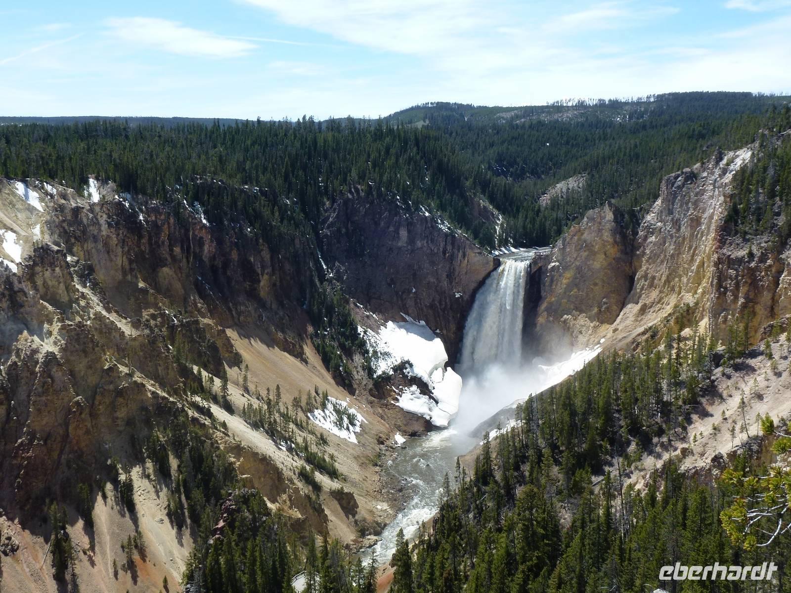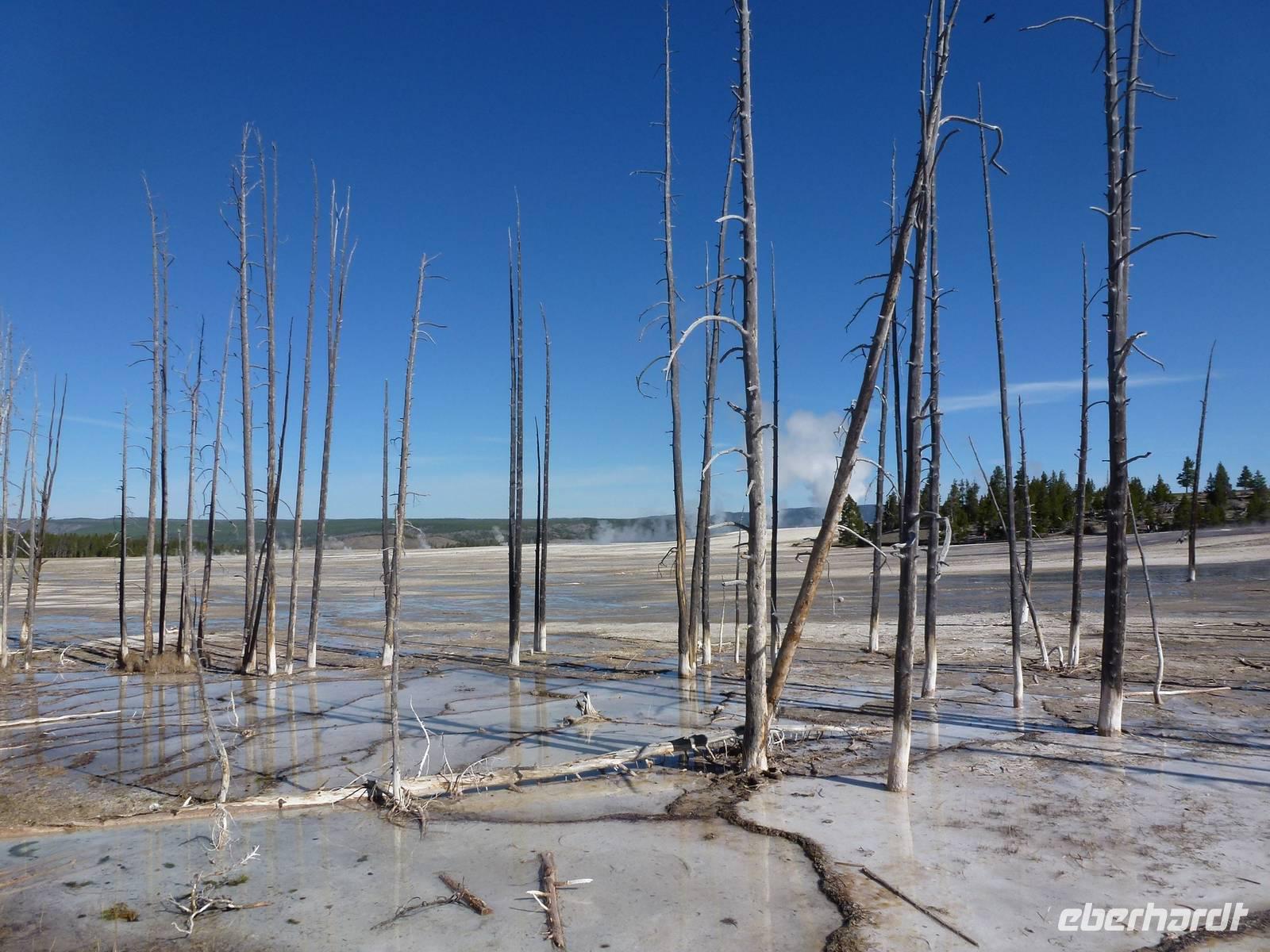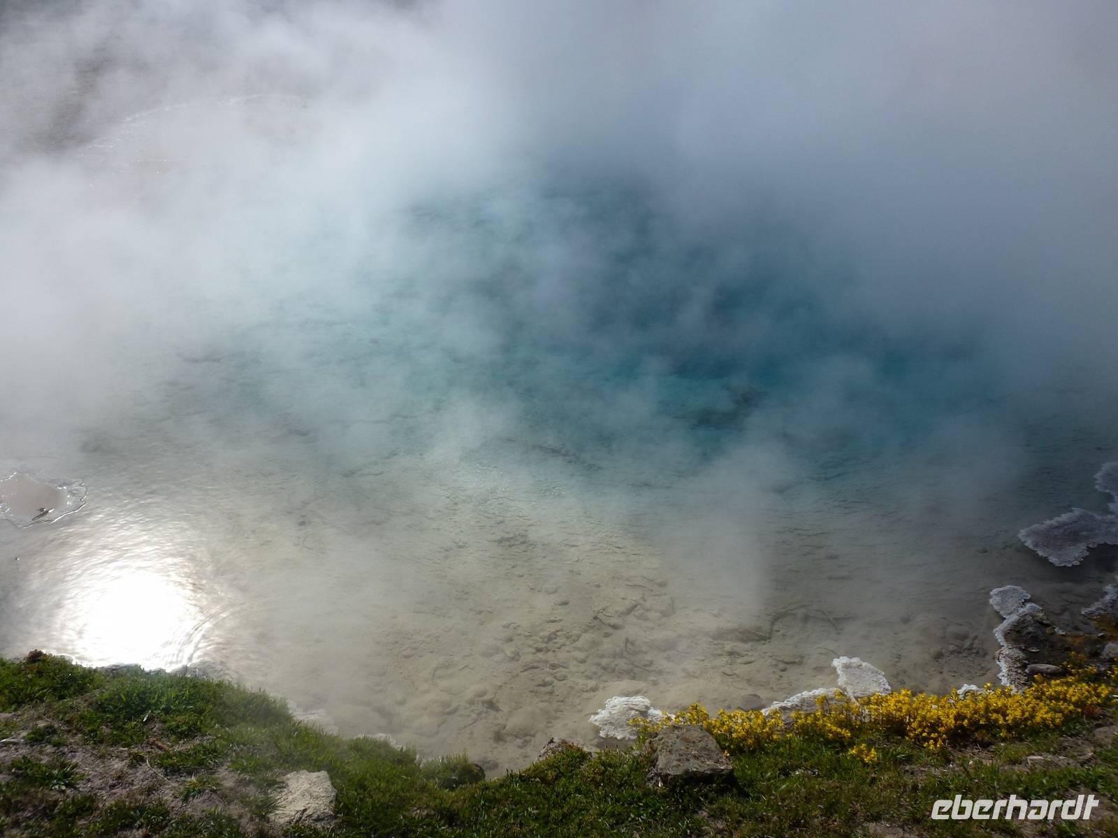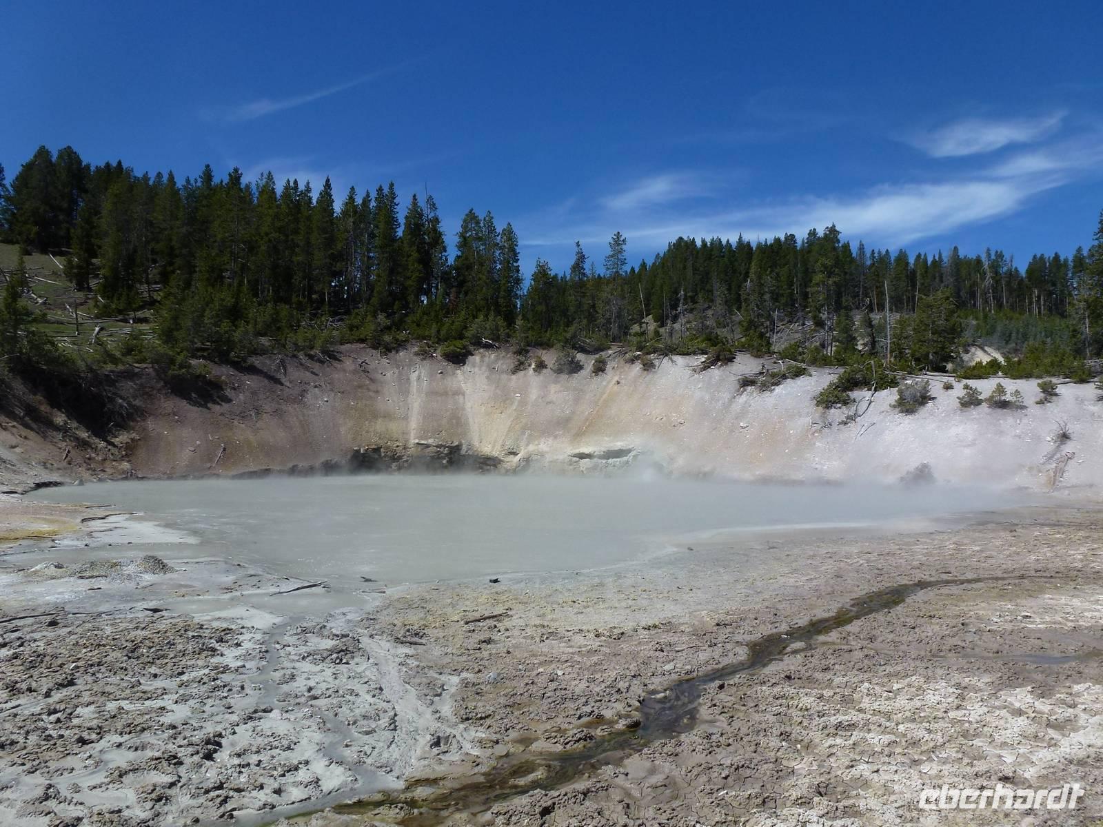 Nach dem Frühstück, welches heute am Tisch serviert wird, laden wir Koffer und kehren zurück in den Yellowstone Nationalpark, um die noch fehlenden Attraktionen zu besuchen. Wie auch gestern gibt uns Don die volle Countrymusik-Dröhnung im Bus, aber noch kommen alle mit Johnny Cash & Co gut klar... Direkt nach Abfahrt begleiten uns erstmal 6 ausgewachsene Büffel einen kleinen Teil des Weges und so beginnen wir auch heute direkt mit den Tieraufnahmen. Den Vormittag widmen wir nochmal der vielfältigen geothermalen Aktivität, die den Yellowstone NP auszeichnet. Wir starten am Lower Geyser Basin, wo uns farbenfrohe Schlammtöpfe und jede Menge Heisswasserbassins erwarten. Die Erde brilliert in allen Farben und dank des wieder hervorragenden Wetters gelingen tolle Aufnahmen. Anschließend fahren wir zum Midway Geyser Basin. Da besuchen wir den bekannten Grand Prismatic Spring, eine in allen Farben schimmernde Heißwasserquelle. Ganz besondere Aufmerksamkeit ziehen zwei Stellen auf sich, wo das heiße Wasser der Quellen zischend in einen kühlen Gebirgsbach fliesst. Apropos Gebirgsbach - aus meiner Sicht eine optimale Stelle für eine auf meinen Reisen traditionelle Wasser-Challenge. Allerdings steige ich diesmal allein ins 10 Grade kalte Wasser und genieße die Erfrischung. Nun heißt es Abfahrt zum Old Faithful, der vielleicht bekanntesten Springquelle der USA. Relativ regelmäßig aller 70-80 Minuten spuckt er eine Wasserfontäne über mehrere Minuten in die Luft. Die wichtigste Information, die man bei Ankunft im Gebiet also benötigt ist die der nächsten Eruption. Die Zeit findet man im wunderschönen Old Faithful Inn angeschlagen und für unsere Gruppe heißt es Ausbruch um 11.56 Uhr... Und so sitzen wir erwartungsfroh wie vor einer Theaterbühne und sind auf das Naturschauspiel gespannt. Der "alte Zuverlässige" lässt uns dann aber ganz schön zappeln und eruptiert mit 20 Minuten Verspätung. Wie bei einem großen Künstler sind ihm natürlich dann noch mehr "Aaahs" und "Ooohs" sicher...