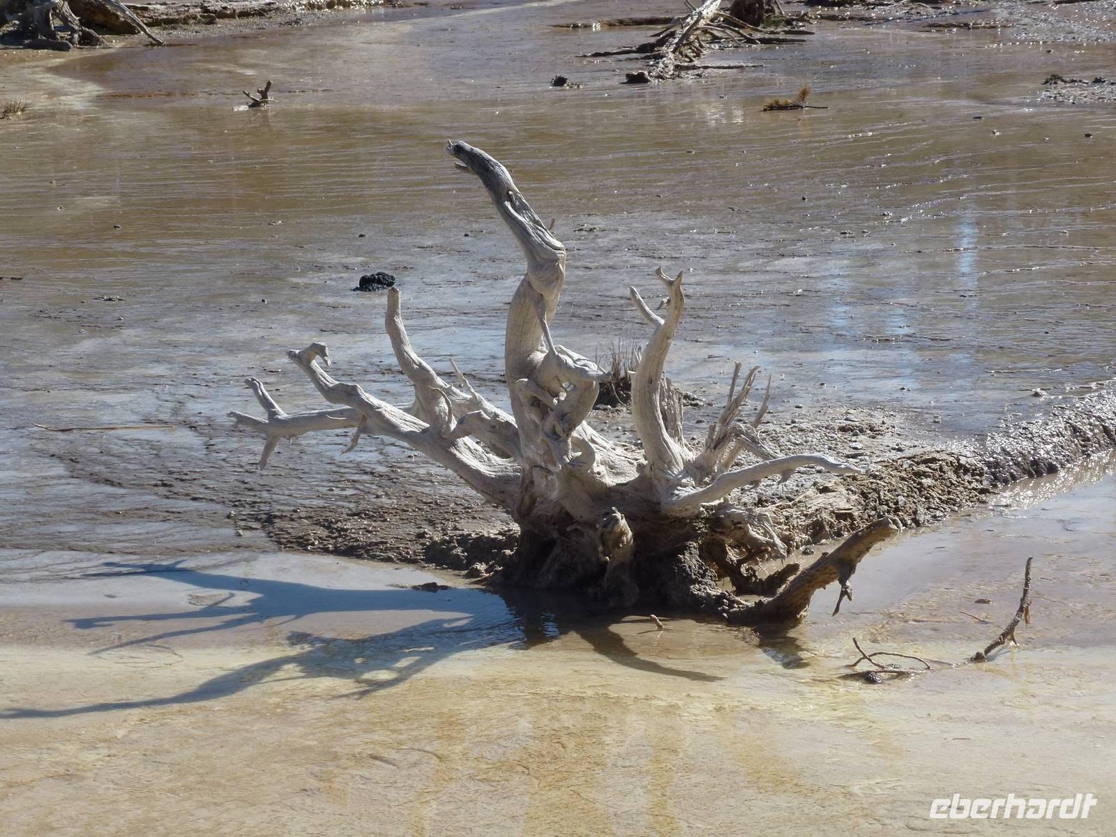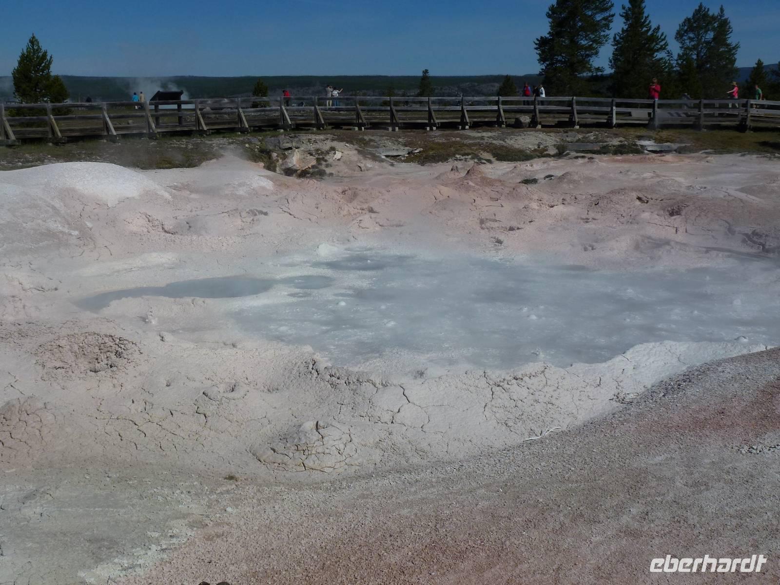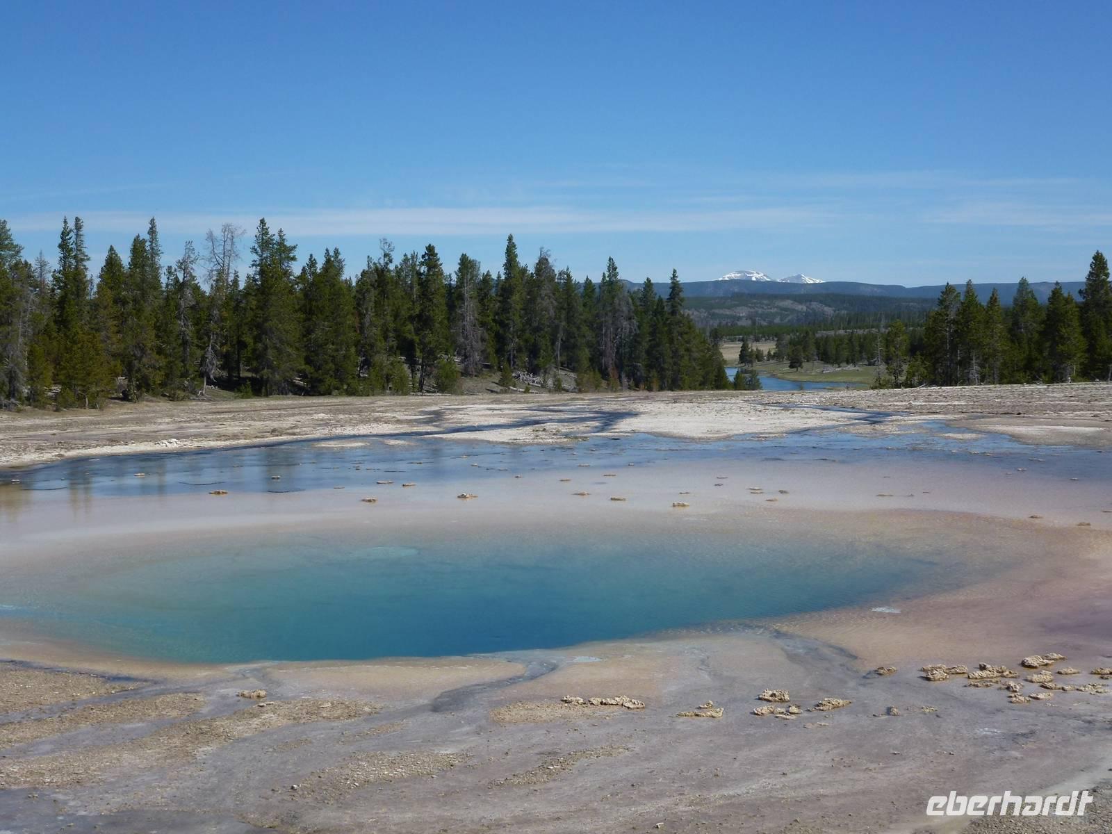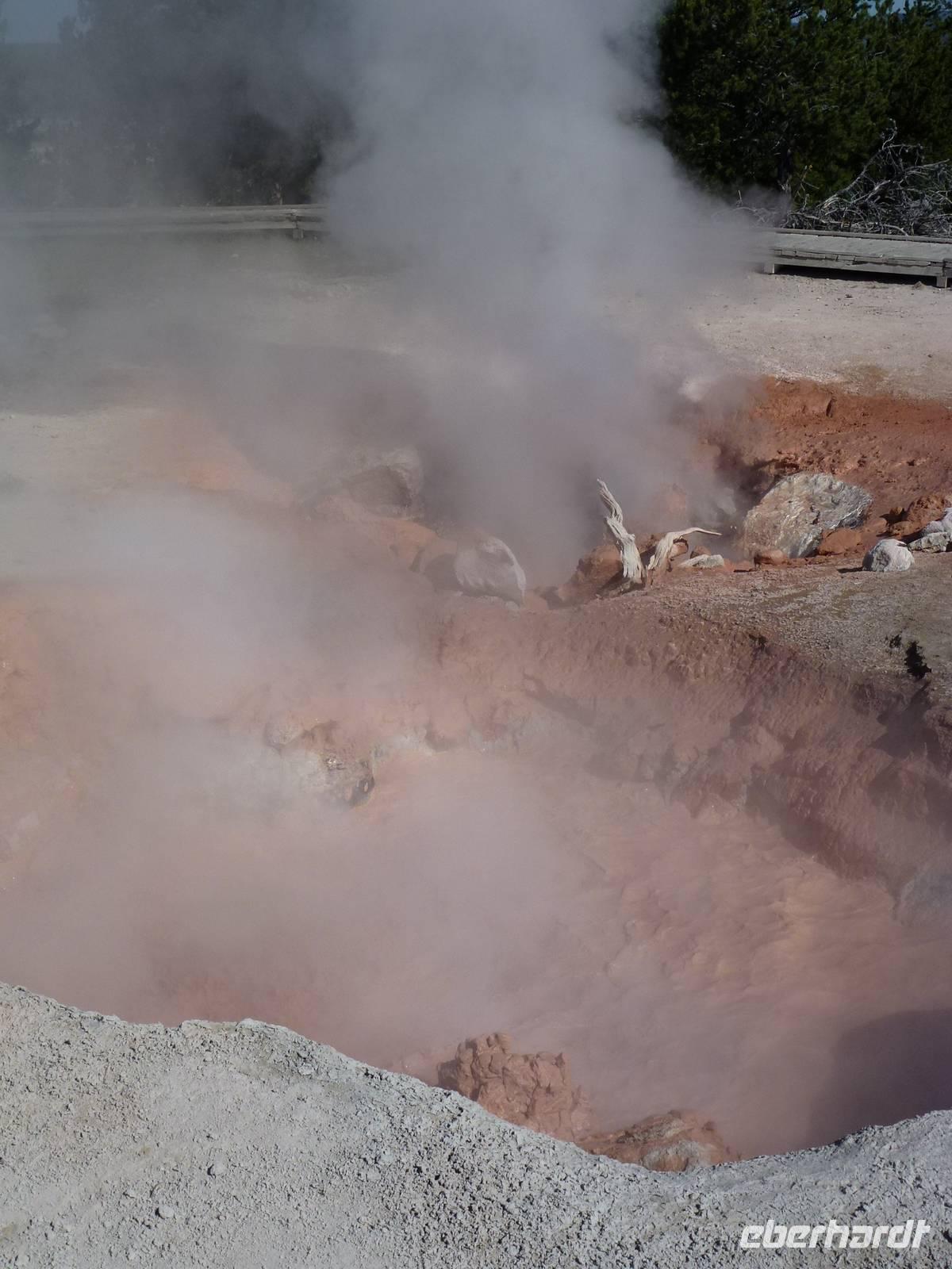 Nach dem Frühstück, welches heute am Tisch serviert wird, laden wir Koffer und kehren zurück in den Yellowstone Nationalpark, um die noch fehlenden Attraktionen zu besuchen. Wie auch gestern gibt uns Don die volle Countrymusik-Dröhnung im Bus, aber noch kommen alle mit Johnny Cash & Co gut klar... Direkt nach Abfahrt begleiten uns erstmal 6 ausgewachsene Büffel einen kleinen Teil des Weges und so beginnen wir auch heute direkt mit den Tieraufnahmen. Den Vormittag widmen wir nochmal der vielfältigen geothermalen Aktivität, die den Yellowstone NP auszeichnet. Wir starten am Lower Geyser Basin, wo uns farbenfrohe Schlammtöpfe und jede Menge Heisswasserbassins erwarten. Die Erde brilliert in allen Farben und dank des wieder hervorragenden Wetters gelingen tolle Aufnahmen. Anschließend fahren wir zum Midway Geyser Basin. Da besuchen wir den bekannten Grand Prismatic Spring, eine in allen Farben schimmernde Heißwasserquelle. Ganz besondere Aufmerksamkeit ziehen zwei Stellen auf sich, wo das heiße Wasser der Quellen zischend in einen kühlen Gebirgsbach fliesst. Apropos Gebirgsbach - aus meiner Sicht eine optimale Stelle für eine auf meinen Reisen traditionelle Wasser-Challenge. Allerdings steige ich diesmal allein ins 10 Grade kalte Wasser und genieße die Erfrischung. Nun heißt es Abfahrt zum Old Faithful, der vielleicht bekanntesten Springquelle der USA. Relativ regelmäßig aller 70-80 Minuten spuckt er eine Wasserfontäne über mehrere Minuten in die Luft. Die wichtigste Information, die man bei Ankunft im Gebiet also benötigt ist die der nächsten Eruption. Die Zeit findet man im wunderschönen Old Faithful Inn angeschlagen und für unsere Gruppe heißt es Ausbruch um 11.56 Uhr... Und so sitzen wir erwartungsfroh wie vor einer Theaterbühne und sind auf das Naturschauspiel gespannt. Der "alte Zuverlässige" lässt uns dann aber ganz schön zappeln und eruptiert mit 20 Minuten Verspätung. Wie bei einem großen Künstler sind ihm natürlich dann noch mehr "Aaahs" und "Ooohs" sicher...