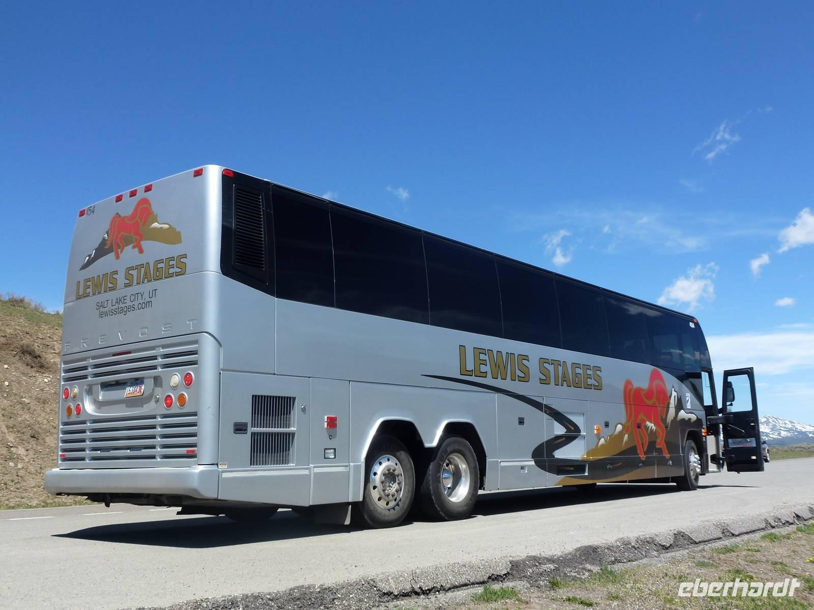 Nach einer kurzen Nacht starten wir früh zeitig mit leerem Magen zum Flughafen La Guardia, um die insgesamt geschäftige Ostküste mit dem Höhepunkt in New York zu verlassen. Wir verabschieden uns von unserem Busfahrer John und einem top modernen Bus. Eine Anmerkung noch zum Bus: Manch einem mag es schon außerirdisch vorkommen, dass an Bord des Busses Internet zur Verfügung steht, aber ein wenig seltsam kam es mir vor, dass wir einen ET auf der Einstiegstreppe sitzen hatten, am Spiegel ein indianischer Traumfänger wehte und unser Chauffeur beim Kofferladen seltsame Handschuhe im Skelett-Design trug... Ob John wirklich von dieser Welt stammte ? Wir frühstücken diesmal auf dem Flughafen - das Geld dafür bekommen wir direkt von Janny ausgezahlt - und via Denver (Colorado) fliegen wir nach Billings in Montana. Und plötzlich ist keine Spur mehr von Hektik, Hochhäusern und Haute Coiture... es wird landschaftlich schön und beschaulich... Nach der Ankunft am Flughafen erwartet uns unser neuer Fahrer für die Westküste. Don scheint ein echter Cowboy zu sein zumindest ist er von Scheitel (Hut) bis zur Sohle (Stiefel) der Gegend entsprechend gekleidet. Der Bus ist wieder so groß, dass eigentlich jeder Gast eine Doppelbank einnehmen kann. Bevor wir richtig starten, halten wir noch schnell an einem Supermarkt für die Mittagsverpflegung und eines ist sofort spürbar: Die Menschen hier im Mittelwesten sind irgendwie viel freundlicher. Jeder mit dem wir ins Gespräch kommen, erkundigt sich wo wir herkommen und was wir noch vor uns haben. Nun heißt es aber erstmal Kilometer - oder hier besser Meilen - hinter uns bringen, denn von Montana müssen wir noch nach Wyoming. Nun bietet sich uns ein abwechslungsreiches Landschaftsbild und bald werden die Landwirtschaftsgebiete in Montana von dem Blick auf die Rocky Mountains abgelöst. Im Vordergrund haben wir Prärie, was übersetzt soviel heißt wie "... wo schon immer Gras war..." und im Hintergrund erhebt sich das Bergmassiv. Wir halten Ausschau nach Antilopen, Bisons und Bären, noch sehen wir aber nur die Rinderherden. Am Nachmittag erreichen wir die 10.000-Einwohner-Gemeinde Cody in Wyoming, wo wir für die kommende Nacht Quartier beziehen. Bei 30 Grad und strahlendem Sonnenschein nutzen die ersten den hoteleigenen Pool und auch so verbringen fast alle die Freizeit bis zum Abendessen mit einem Bummel durch die Kleinstadt. Gegessen wird heute im altehrwürdigen Saloon des Irma Grill, der wie das gleichnamige Hotel einst einem der ersten Schausteller der Welt gehörte - Buffalo Bill. Bei Salat, deftigen Rippchen und endlich preiswertem Bier lässt jeder individuell den Abend ausklingen. Den Bus, der uns normalerweise immer zum und vom Abendessen bringt, haben wir bei diesem Wetter abgesagt und kehren alle per pedes zum Hotel zurück. Für einige geht der Abend an der Bar weiter, für die meisten heißt es jedoch neue Kräfte für morgen sammeln.