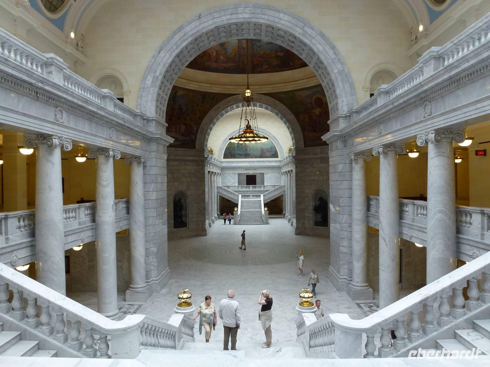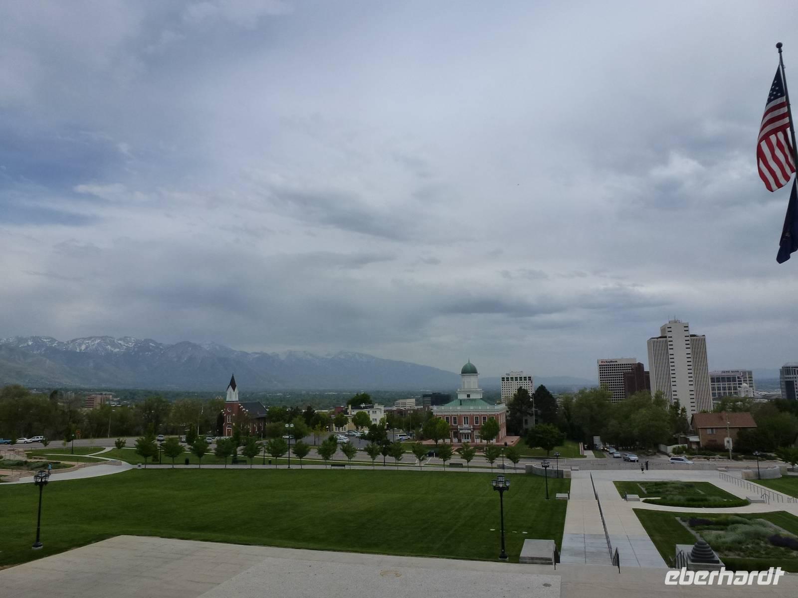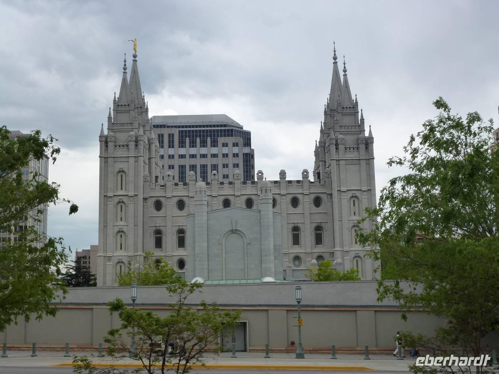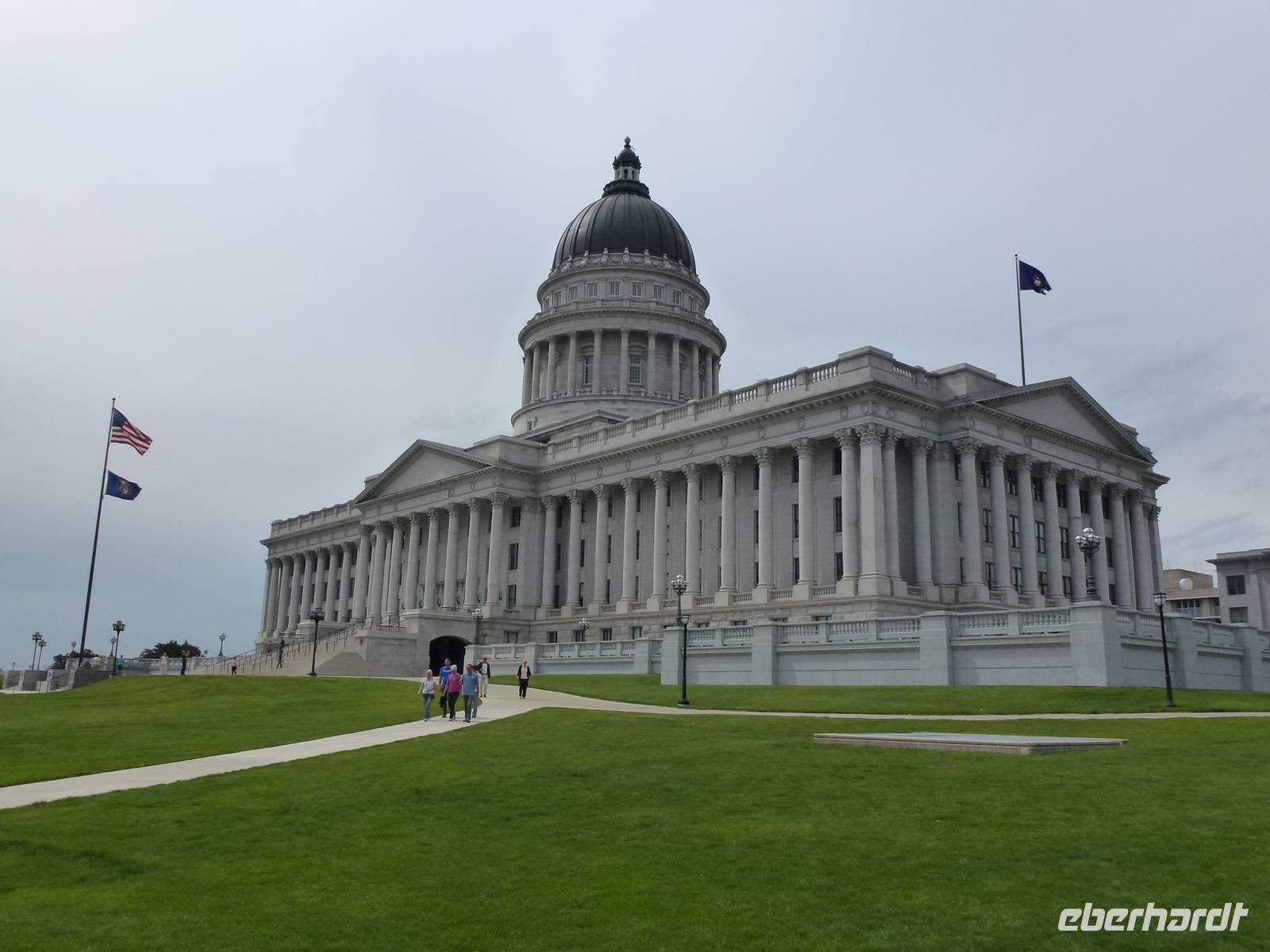 Heute Morgen brechen wir alle gemeinsam auf, d.h. erst verladen wir Koffer, bevor wir gemeinsam in unser Frühstückslokal E.LEAVEN fahren. Es erwarten uns einige Kilometer und wieder mehrere Bundesstaaten auf dem Weg in die Mormonen-Hauptstadt. Nach dem Frühstück stoppen wir erst noch einmal kurz, um am Supermarkt die Tagesversorgung zu sichern. Anschließend starten wir auf die heutige Fahrtstrecke, wobei wir auf den ersten Meilen scheinbar zwischen den Bundesstaaten Wyoming und Idaho pendeln. Die Zeit während der Fahrt entlang des Snake Rivers zwischen endlos groß scheinenden Ranches überbrückt Janny mit vielen Informationen zu Krankenversicherung, Einkommens- und Steuersituation und Immigration, so dass keine Langeweile aufkommt. Und jetzt die schlechteste aller Nachrichten: Wir verlassen "Bear-Country" ohne wirklich einen Bären gesehen zu haben... Traurig, aber man kann nicht alles haben... Unterwegs stoppen wir "zum Beine vertreten" und beim zweiten Stopp empfängt uns ein Schild "Welcome to Utah" - den heutigen Zielbundesstaat haben wir also schon erreicht. Unsere kurze Mittagspause verbringen wir mit zahlreichen Erdhörnchen auf dem Rastplatz, bevor wir in Richtung Hauptstadt Utahs, nach Salt Lake City, weiterfahren. Die Olympiastadt der Winterspiele von 2002 lassen wir zuerst aber noch kurz hinter uns und fahren an den riesigen Salzsee, den Great Salt Lake, der auch der Stadt ihren Namen gegeben hat. Wenn der See vollkommen ausgetrocknet ist erreicht er eine Größe von 6.000 km². Momentan hat er noch Wasser und wir schießen Fotos von der Salzkruste. Anschließend bringt uns Don in die Innenstadt, ins Zentrum der Mormonen-Religion. 1847 gründete Brigham Young hier eine Niederlassung für die verfolgten Anhänger der Kirche Jesu Christi der Heiligen der Letzten Tage. Heute gilt Salt Lake City als das spirituelle Zentrum der Glaubensgemeinschaft und zieht Anhänger aus der ganzen Welt an. Am Temple Square, dem Hauptplatz der Stadt, findet sich dann auch ein erstaunliches Ensemble sehenswerter Mormonen-Gebäude, die wir bei einer Führung - soweit es Nicht-Mormonen gestattet ist - kennenlernen. Schwester Klemm und Schwester Roffler erklären uns die Grundsätze ihrer Relegion und nebenbei die Bauwerke. Den Tempel der Mormonen - das Zentrum der Religion - dürfen wir nicht betreten, dafür werfen wir einen Blick in das Tabernakel - einen großen Versammlungssaal, dessen hervorragende Akustik wir bei Orgelklängen bewundern. Anschließend zeigen uns die beiden Missionare, die einen freiwilligen, ehrenamtlichen Dienst im Moment absolvieren, unter starker Kontrolle das neue Versammlungsgebäude der Glaubensgemeinschaft. Hier haben in einem fantastischen Saal 21.000 (!!!) Hörer Platz. Nach dieser sehr interessanten Führung übernimmt wieder Janny das Ruder und führt uns zum Capitol des Bundesstaates Utah. Vollkommen ohne Sicherheitskontrollen können wir das imposante Gebäude betreten und uns umschauen. Wir werfen einen Blick in das Repräsentanten-Haus und werden Zeuge bei der Stipendiats-Vergabe für die besten Highschool-Schüler in Mathematik durch den Gouverneur Utahs. Vom Capitol-Hügel liegt einem die Stadt Salt Lake City praktisch zu Füßen und mit ein paar Schnappschüssen im Gepäck, fahren wir zurück in die Innenstadt und checken im Hotel ein. Am Abend erwartet uns ein gemeinsames Abendessen im Restaurant Christopher's. Gediegenes Ambiente, aufmerksamer Service und ein köstliches Essen überzeugen uns wieder einmal von der sehr guten Restaurantauswahl seitens Eberhardt.