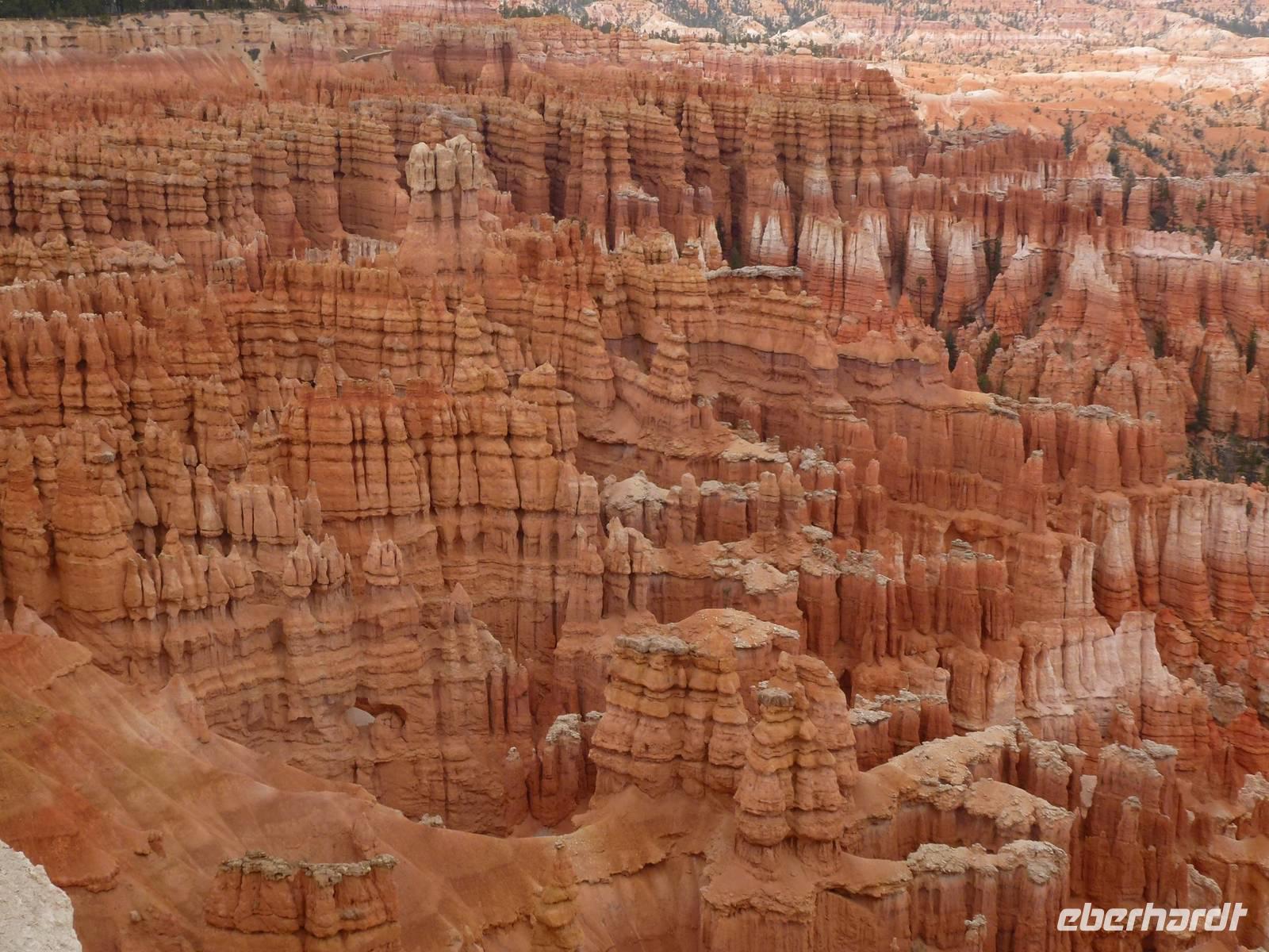Gefrühstückt werden kann im Sheraton Hotel ab 06.00 Uhr, wir fahren wie immer 08.00 Uhr ab und bewegen uns in Richtung der Nationalparks des Bundesstaates Utah. Zuerst stoppen wir wieder an einem Supermarkt, wo auch unser Fahrer Don die Wasservorräte für die Gruppe auffüllt. Dann beginnen wir unsere lange Fahrt in Richtung Bryce Canyon Nationalpark, die uns Janny wieder mit allerlei Wissenswertem zu Rente und Schulsystem verkürzt. Eine wahre Comedy-Vorstellung erleben wir bei ihren Erzählungen wie sie als Hippie-Mädchen vor vielen Jahren aus den Niederlanden in die USA kam Auf unserer Fahrt, wo wir für Pausen natürlich zwischenstoppen, meist an Raststätten, erreicht Janny auch noch ein ganz verwirrender Anruf. Das Restaurant in Monterey - da sind wir aber erst in 5 Tagen - möchte gern schon unsere Essenwünsche aufnehmen... Kurz nach dem Mittag erreichen wir dann den Dixie National Forrest und den Red Canyon. Ein unvorstellbares Rot schlägt uns entgegen und die Felsformationen geben einen Vorgeschmack auf alles was uns gleich noch erwartet. Das Gebiet des Red Canyon war im Übrigen einst die Heimat des berüchtigten Wild-West-Schurken Butch Cassidy, der die Gegend vor allem darum so mochte, weil man sich hier prima verstecken konnte. Nun erreichen wir den Bryce Canyon Nationalpark, der mit 14.000 km² zu den kleineren zählt. Benannt wurde er nach dem ersten Pionier und Landwirt der Gegend, Ebenezer Bryce. Die atemberaubende Schönheit des Canyons erkennen wir bei unserem ersten Stopp am Bryce Point. WOW!!! Atemberaubend schön!!! ALLE sind schwer beeindruckt von der "Leistung" der Natur. Es bietet sich uns ein unbeschreibliches Bild: ein breiter Canyon mit unzähligen, bizarren Felsformationen in leuchtendem Rot (auch wenn die Sonnen gerade eine kleine Pause einlegt... Hundertausende Steintürme, sogenannte hoodoos, schimmern und bilden durchzogen von Schluchten ein einzigartiges Bild. Niemand aus unserer Gruppe hat bisher Ähnliches gesehen. Darum müssen Sie unbedingt in die FOTOGALERIE zur Reise schauen. Vollkommen verblüfft unternehmen wir eine kleine Wanderung vom Inspiration zum Sunset Point und selbst die eifrigsten Filmer und Fotografen genießen diesen Spaziergang fast vollständig ohne Geräte, nur mit den Augen... Noch ein "Hopp. hopp, hopp - Fairytale-Fotostopp" und dann checken wir im Rubys Inn ein. Es handelt sich dabei um eine hübsche, aber unheimlich große Hotelanlage mit Einkaufsmöglichkeiten, kleiner Westernstadt, ... Hier genießen wir heute ein vorzügliches Buffet und lassen den Abend nicht so spät ausklingen, weil wir morgen zeitig starten müssen.