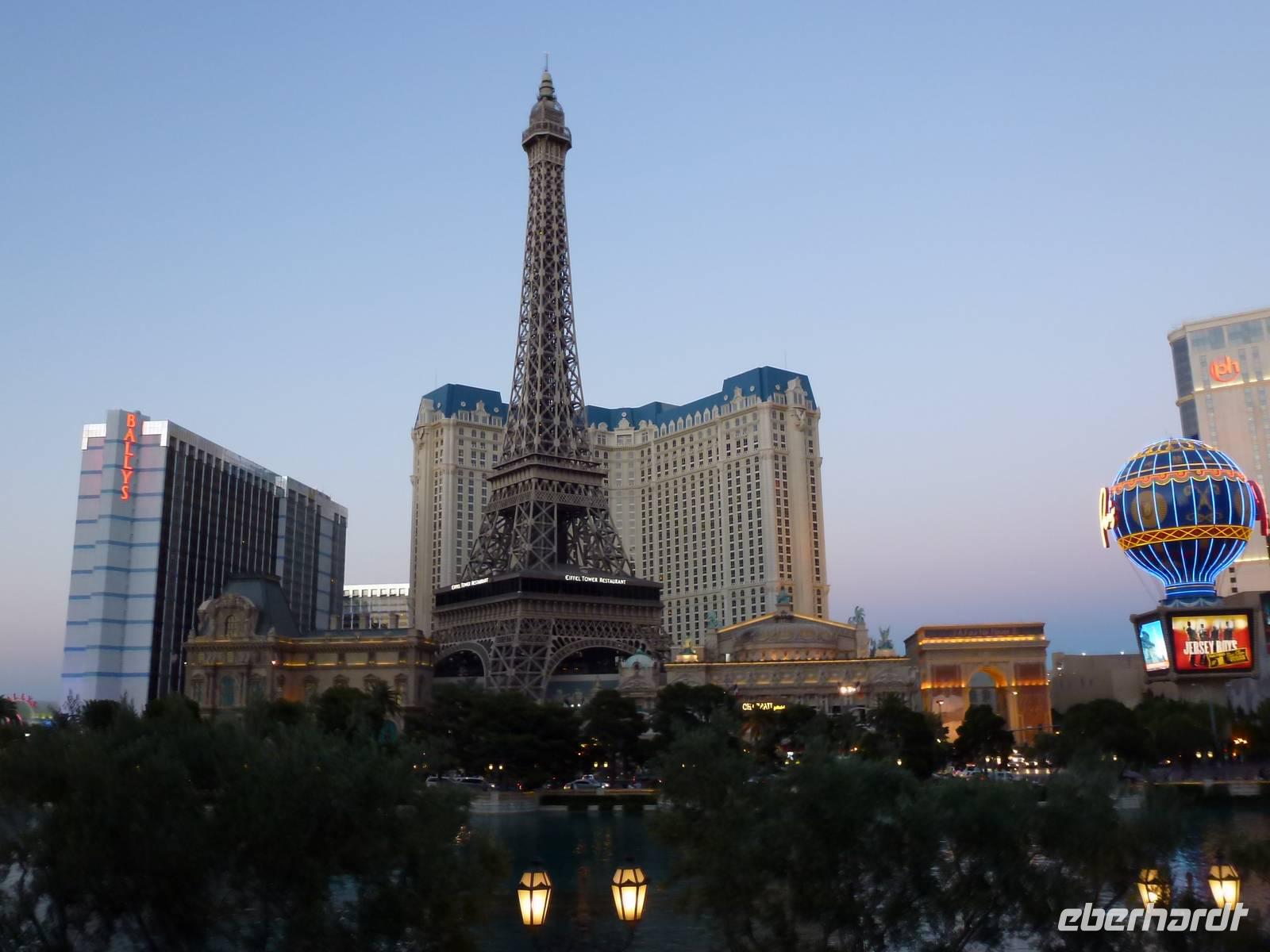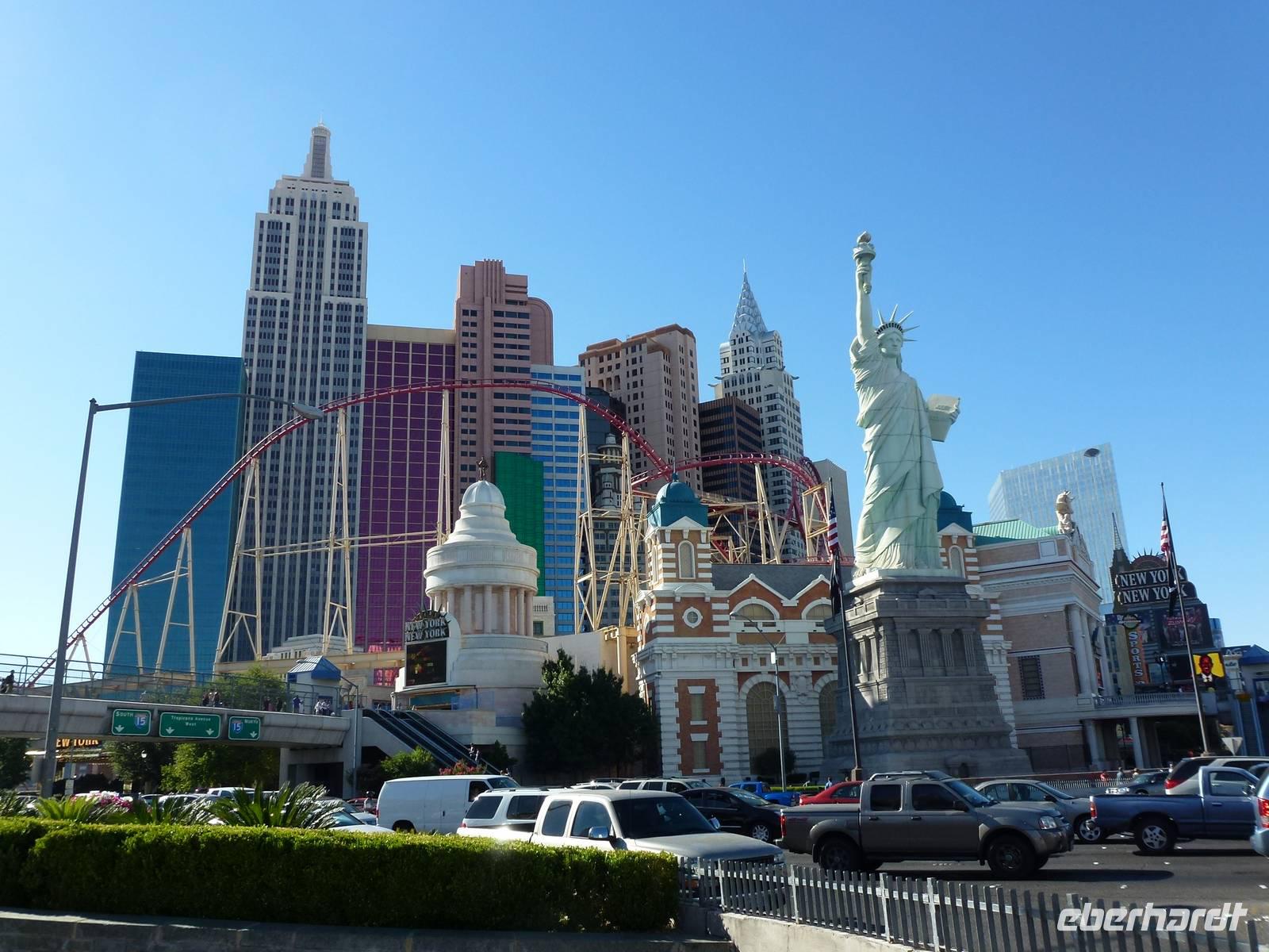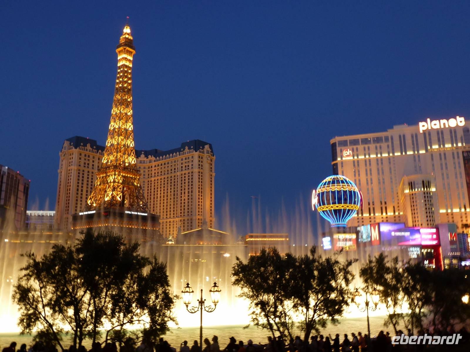 Nach dem Frühstücksbuffet - reichhaltige Auswahl aber bei der Vielzahl an Touristen nicht optimal organisiert - verlassen wir die Region des Grand Canyon und starten zu unserem Trip nach Las Vegas. Also nur noch schnell zum Bankautomat gehen Ein Kulturschock wahrscheinlich nach unseren letzten Tagen in der wunderbaren Natur... Unser erster Stopp für heute lässt das Herz der heimlichen Rocker unter uns höher schlagen. Wie einst Dennis Hopper als Easy Rider fühlen wir uns auf einem kleinen Stück der Route 66, die wir im Gebiet von Seligman - einer von deutschen Auswanderern gegründeten Siedlung - befahren. Die Route 66 wurde 1926 eröffnet und war damals die einzige richtige Ost-West-Verbindung in den USA. Heute hat sie leider kaum noch Bedeutung und wurde von großen Interstate-Highways abgelöst. Unsere Route führt uns über Kingman weiter in Richtung Nevada. Durch Wüstengebiete und begleitet von der einen oder anderen kleinen Windhose - gar kein Vergleich zu den aktuell in Texas, Kansas und Oklahoma wütenden Tornados - erreichen wir den größten Staudamm der USA, den Hoover-Dam. Von erreichen kann man vielleicht nicht sprechen, wir können aus der Entfernung einen Blick darauf werfen, für einen echten Besuch muss man sich anmelden. Unsere Reiseleiterin Janny will es trotzdem probieren, aber wegen unserer Koffer im Bus lässt man uns an der Sicherheitskontrolle nicht durch. So bleibt uns nur ein Abstecher zum Aussichtspunkt mit wunderbarem Blick auf den Lake Mead. Wir fahren weiter und dann ist es soweit: die Silhouette von Las Vegas taucht am Horizont auf und zu Led Zeppelins Klängen „Viva Las Vegas" rollen wir ins Spielerparadies ein. Jährlich 38 (!) Millionen Besucher füllen die gut 130.000 Zimmer der Wüstenstadt, hauptsächlich natürlich in den Themenhotels, die den Glauben an sinnvollen Einsatz von Geldern manchmal zweifeln lassen. Wir sind überwältigt und zwischen der Skyline von New York, am Eiffelturm vorbei, entlang des Canale Grande mit echten Gondolieri und am Ritterschloss Excalibur vorbei, fahren wir auf unser Hotel Luxor zu, eine ägyptische Pyramide mit einer Riesen-Sphinx und einem Obelisken als Wahrzeichen. Die ersten 20 Minuten im Hotel sind von Staunen, Kopfschütteln und der Angst, sich nicht zurecht zu finden, geprägt. Wir beziehen unsere Zimmer in der Spitze der Pyramide und nutzen die Freizeit zur Erkundung unseres Hotels und zum Abendessen am ebenso überdimensionierten Buffet. Um 19 Uhr treffen wir noch einmal auf Janny - alle haben es geschafft - um auf eine abendliche Erkundungsfahrt in der Glitzerwelt zu gehen. Wir bestaunen die riesigen Hotel- und Casinoanlagen und stoppen als erstes am Bellagio, einigen sicherlich bekannt aus dem Film „Ocean's 11", der hier gedreht wurde. Wir bestaunen die Wasserspiel-Symphonie vor der Kulisse des Eiffelturms des Hotels Paris und fahren dann weiter zum Hotel Venetian, wo es neben Deckenmalereien von Raffael auch echte Kanäle im Hotelgelände gibt. Von der Rialtobrücke aus beobachten wir einen Vulkanausbruch vorm Hotel Mirage. Anschließend fahren wir weiter die Hauptstraße - den Strip - entlang und vorbei an unzähligen Hochzeits-Kapellen, teilweise auch als Drive-In-Kapelle, erreichen wir die Altstadt, das ursprüngliche Las Vegas, rund um Fremont-Street. Hier ist eine Fußgängerzone komplett mit einer LED-Wand überspannt und abends ist hier jede Menge los. Unzählige Lichter und Live-Musik, verrückte Typen und die Besucher der Stadt verleihen der Fremont Street am Abend einen eigenen Charme. Nun geht es zurück ins Hotel und einige trauen sich an eine der zahllosen Slot-Maschinen... einige verlieren, aber wir haben auch Gewinner!!! Spät - oder je nach Sichtweise früh - legen wir uns dann schlafen und freuen uns auf einen weiteren Tag Las Vegas!
