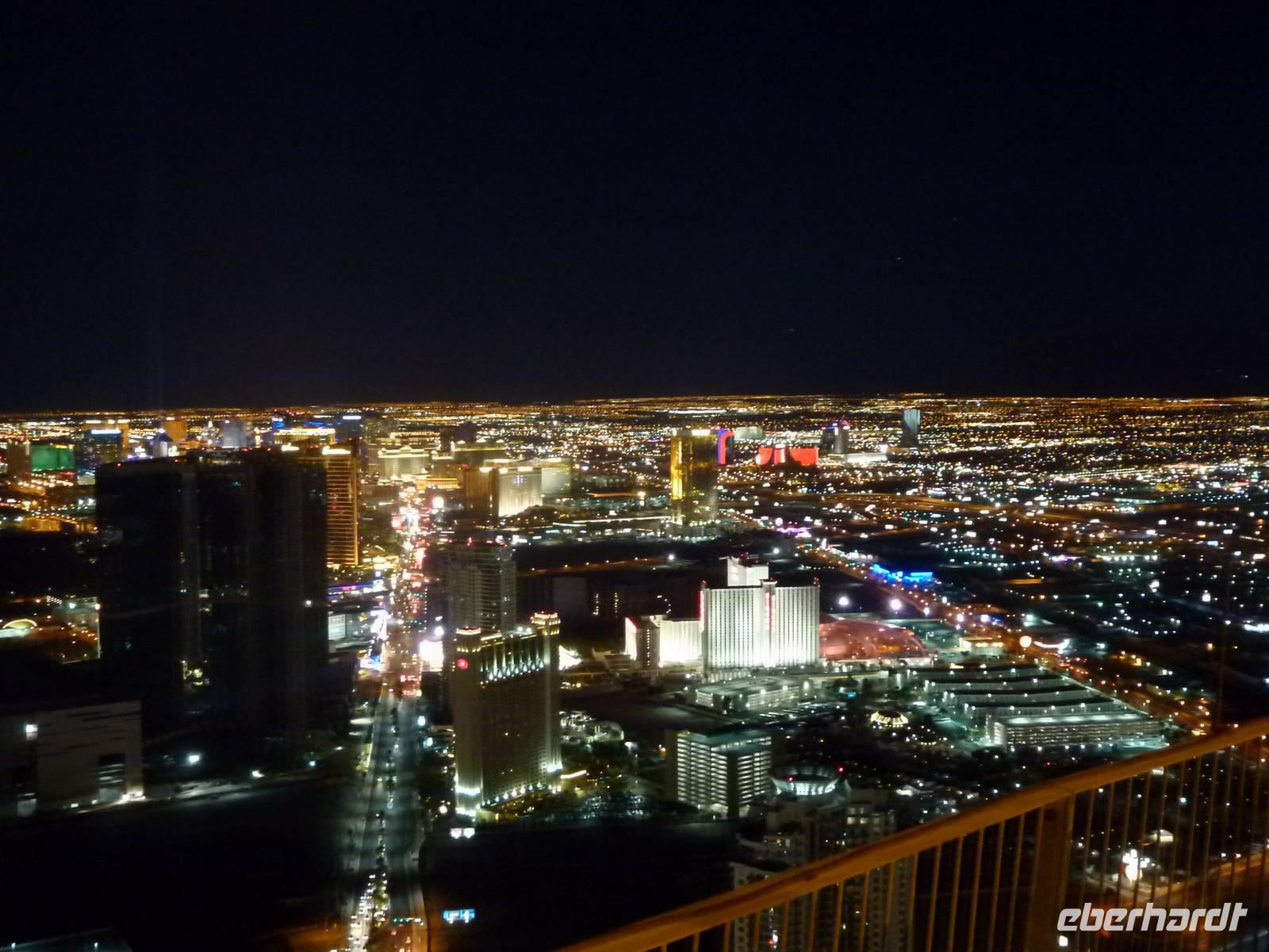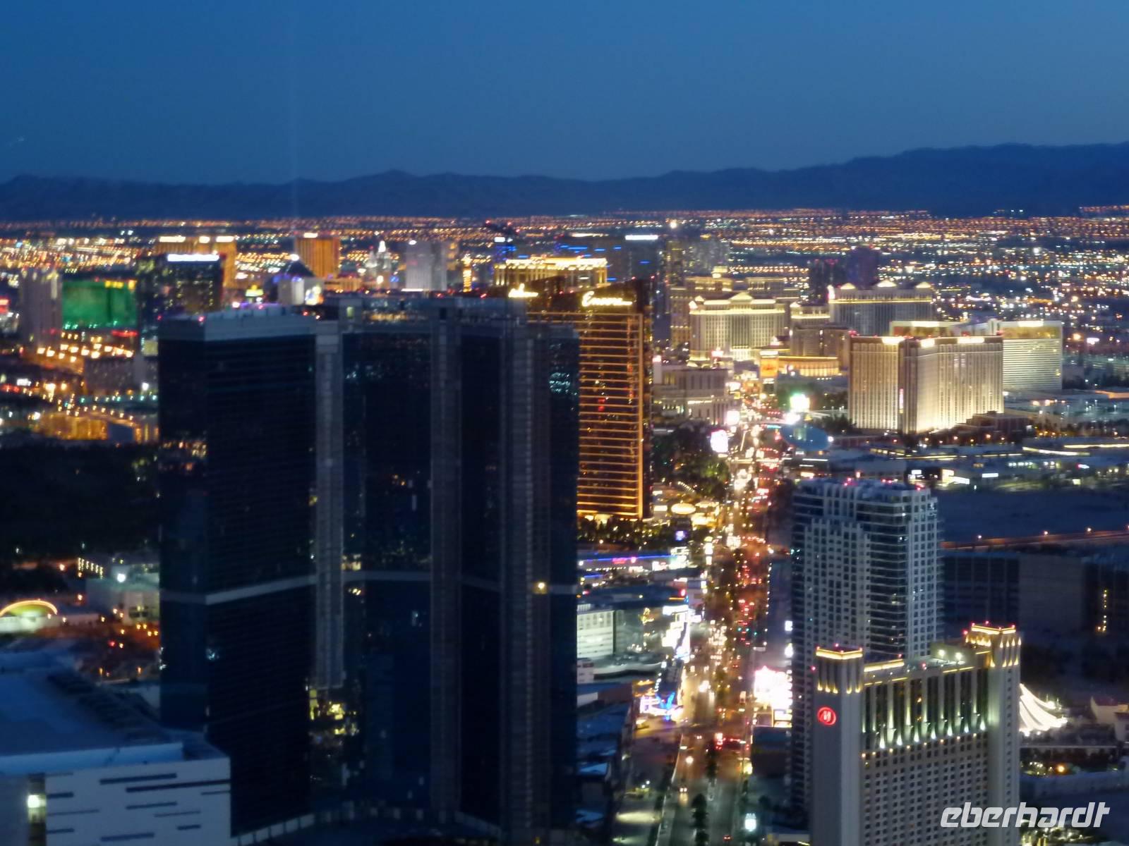Relativ müde stärken wir uns am Buffet und bei wolkenfreiem Himmel starten wir in Richtung Tal des Todes. Zuerst stoppen wir wieder am Supermarkt, damit wir Essen und vor allem Trinken holen können. In Death Valley erlebt man Extremwerte der Temperaturmessung. Für uns sind heute „nur" 38 Grad angesagt. Den ersten Fotostopp gibt es am Eingangsschild zum Nationalpark und hier merken wir schon „... dass einige das genau so vor haben wie wir...", um mal mit Jannys Worten zu sprechen. Soll heißen beim heutigen Ausflug fahren ca. 10 Busse nahezu parallel von Aussichtspunkt zu Aussichtspunkt. Apropos unser erster Stopp im Nationalpark findet dann am Zabriskie Point statt und wir genießen die ersten eindrucksvollen Blicke in das Tal des Todes. Unendliche Farbtöne sind an den umliegenden Felsen auszumachen und im Hintergrund können wir schon den Salzsee sehen. Wieder ein neuer Nationalpark, wieder neue unfassbare Eindrücke. Weiter geht es zum Badwater Point, den tiefsten Punkt der USA mit 85,5 Metern unter dem Meeresspiegel. Hier befindet sich auch eine bekannte Mini-Wetterstation, die wegen extremer Hitzemessung gelegentlich weltweit für Aufsehen sorgt. Für uns werden heute freundlicherweise nur 40.3 Grad Celsius vermessen, aber die Hitze treibt uns meist vor Ende der freien Zeit zurück in unseren klimatisierten Bus. Jetzt ist Zeit für eine Mittagspause und alle suchen sich auf der Furnace Creek Ranch ein schattiges Plätzchen. Am frühen Nachmittag brechen wir zum Rückweg auf, da alle ein wenig vom Las Vegas-Fieber gepackt sind und die bevorstehende Freizeit optimal ausnutzen wollen. Dazu bietet sich ein Spaziergang entlang der bekanntesten Hotels an. Oder man schaut sich in einer der zahlreichen Shopping Malls um, vielleicht ist ja ein Mitbringsel dabei... Auch für das heute ausnahmsweise nicht inkludierte Abendessen bieten sich entlang des Strips zahlreiche Möglichkeiten und selbst in unserem Hotel gibt es schon 7 Restaurants zur Auswahl. Unser Hotel ist übrigens mit 108 Meter Höhe und nur 2.200 Zimmern eines der kleineren... Wer möchte schließt sich mir am Abend an und gemeinsam fahren wir per Taxi zum Stratosphere Tower, um nochmal einen Blick auf die Lichter der Metropole zu werfen. Die Auffahrt kostet 18 US-Dollar, dafür werden wir mit einem tollen Rundumblick belohnt. Von uns traut sich allerdings niemand in eines der im Freien befindlichen Fahrgeschäfte auf der Spitze des Turmes... Anschließend geht es mit dem Taxi wieder zurück und wir packen die Koffer, denn morgen früh verlassen wir Las Vegas.