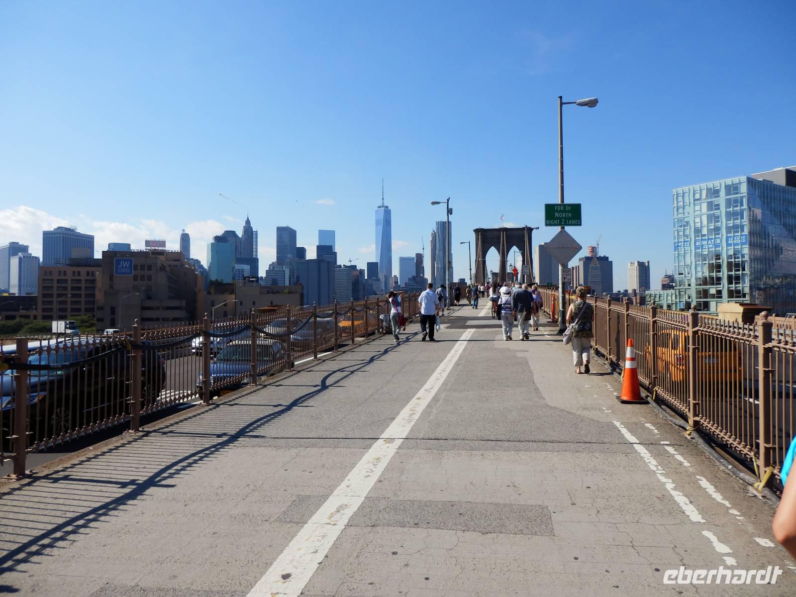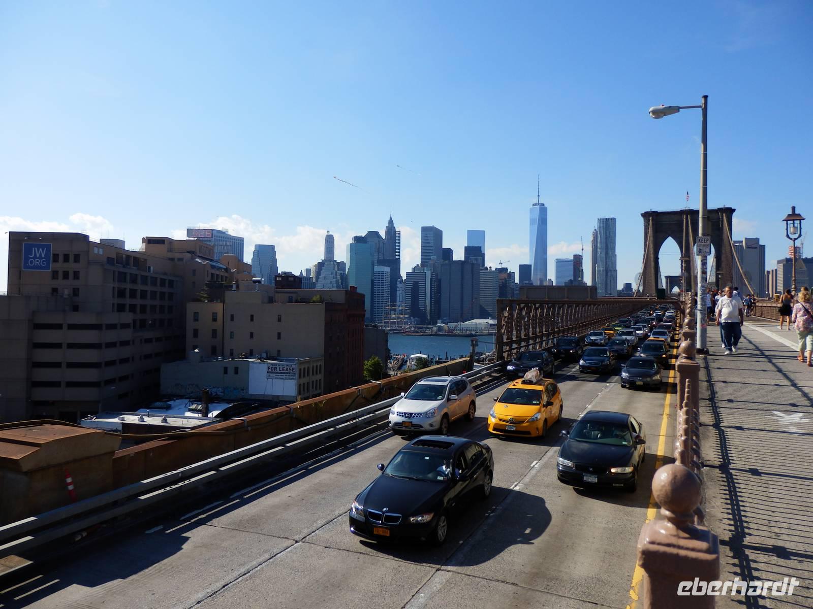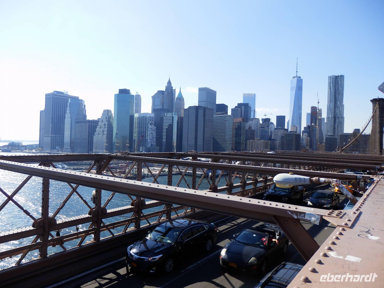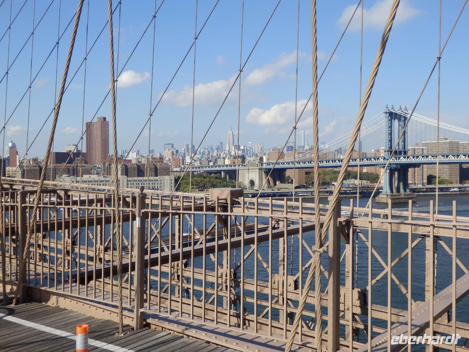 Wer in New York ist, muss über die Brooklyn Bridge laufen. Die fast zwei Kilometer lange Brücke verbindet Manhattan und Brooklyn. Der Spaziergang in Richtung Manhattan ist atemberaubend schön und wird mit wundervollen Fotomotiven der immer größer werdenden Skyline belohnt. In Manhattan angekommen sahen wir das Rathaus von New York sowie den